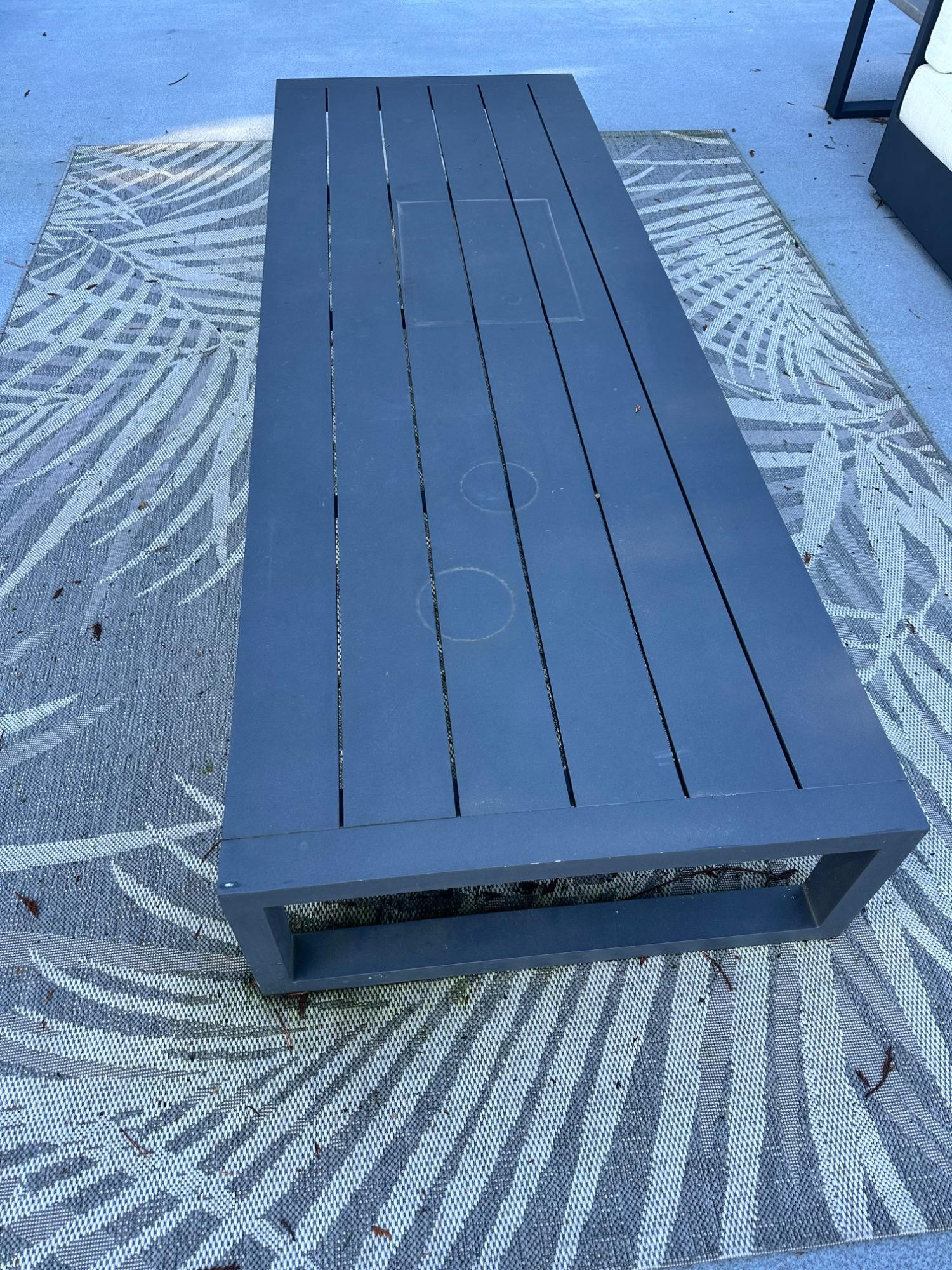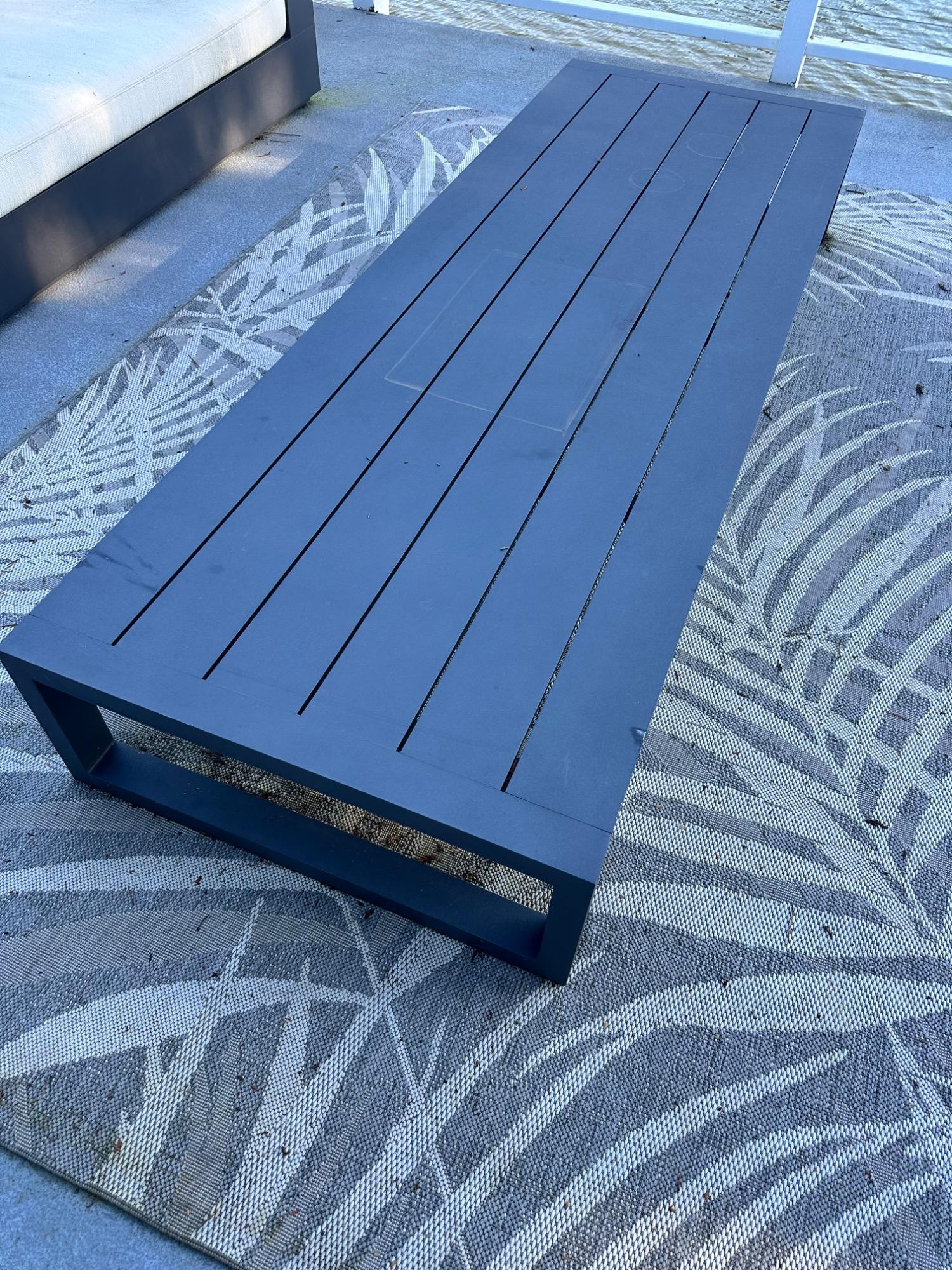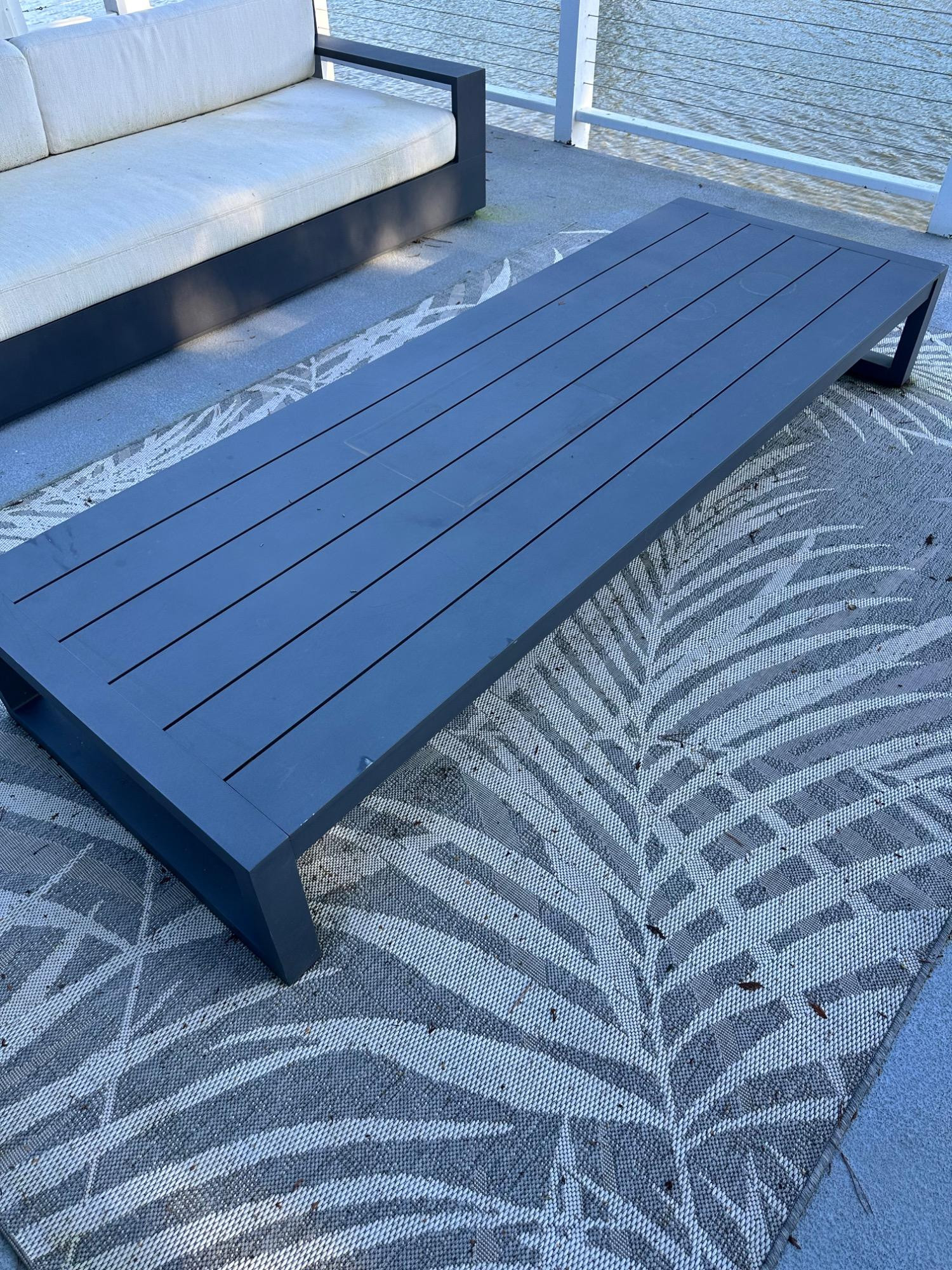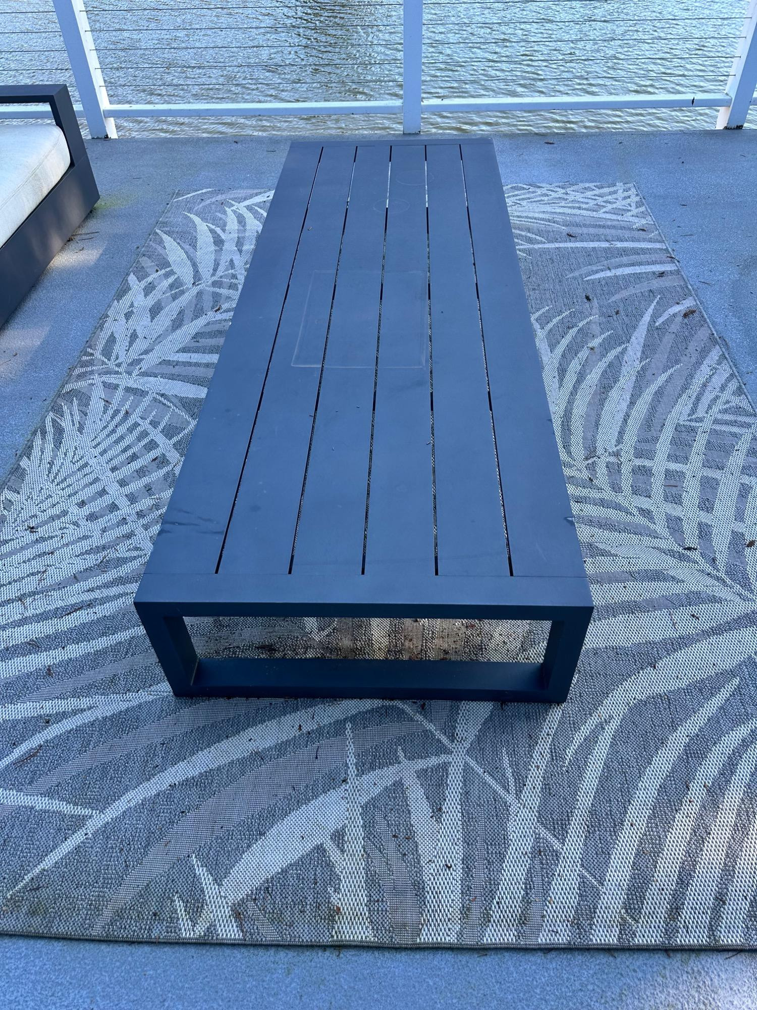 Enhance your outdoor living area with this sleek Restoration Hardware outdoor coffee table paired with a stylish outdoor area rug. Coffee Table Dimensions: 84.5" L x 29.5" W x 12" H Condition: Excellent condition, durable design perfect for outdoor use. The combination of modern design and functionality makes this a great addition to any patio or garden. The accompanying rug adds a complementary touch of elegance. Bidding on this lot is an agreement that: (1.) You will have 2 capable, able-bodied persons to lift and load at a minimum. (2.) You will bring a hand truck and/or any other tools needed to remove this item. If these steps are not followed your item will be forfeited and no refund given.