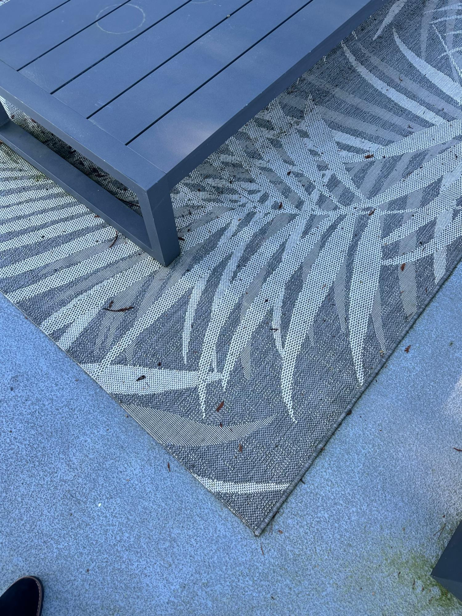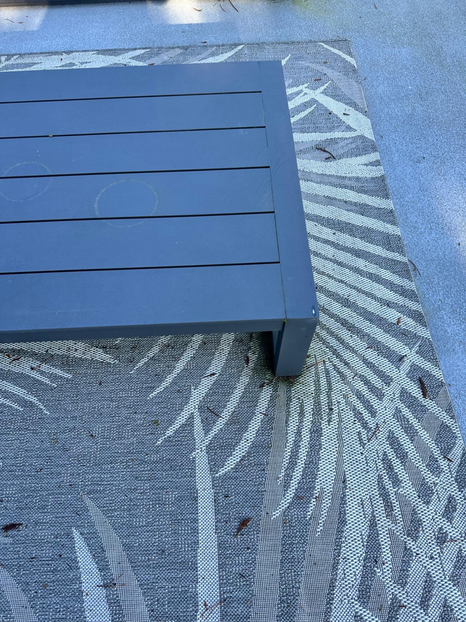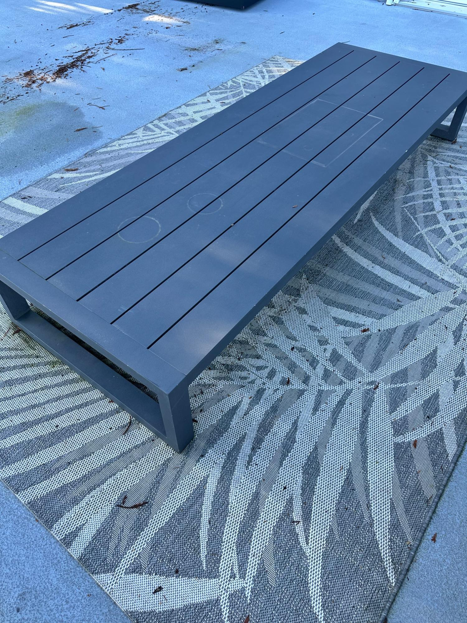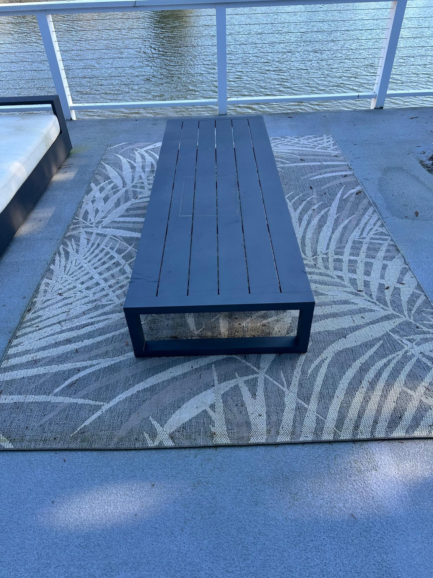 Enhance your outdoor living area with this sleek Restoration Hardware outdoor coffee table paired with a stylish outdoor area rug. Coffee Table Dimensions: 84.5" L x 29.5" W x 12" H Condition: Excellent condition, durable design perfect for outdoor use. The combination of modern design and functionality makes this a great addition to any patio or garden. The accompanying rug adds a complementary touch of elegance. Bidding on this lot is an agreement that: (1.) You will have 2 capable, able-bodied persons to lift and load at a minimum. (2.) You will bring a hand truck and/or any other tools needed to remove this item. If these steps are not followed your item will be forfeited and no refund given.