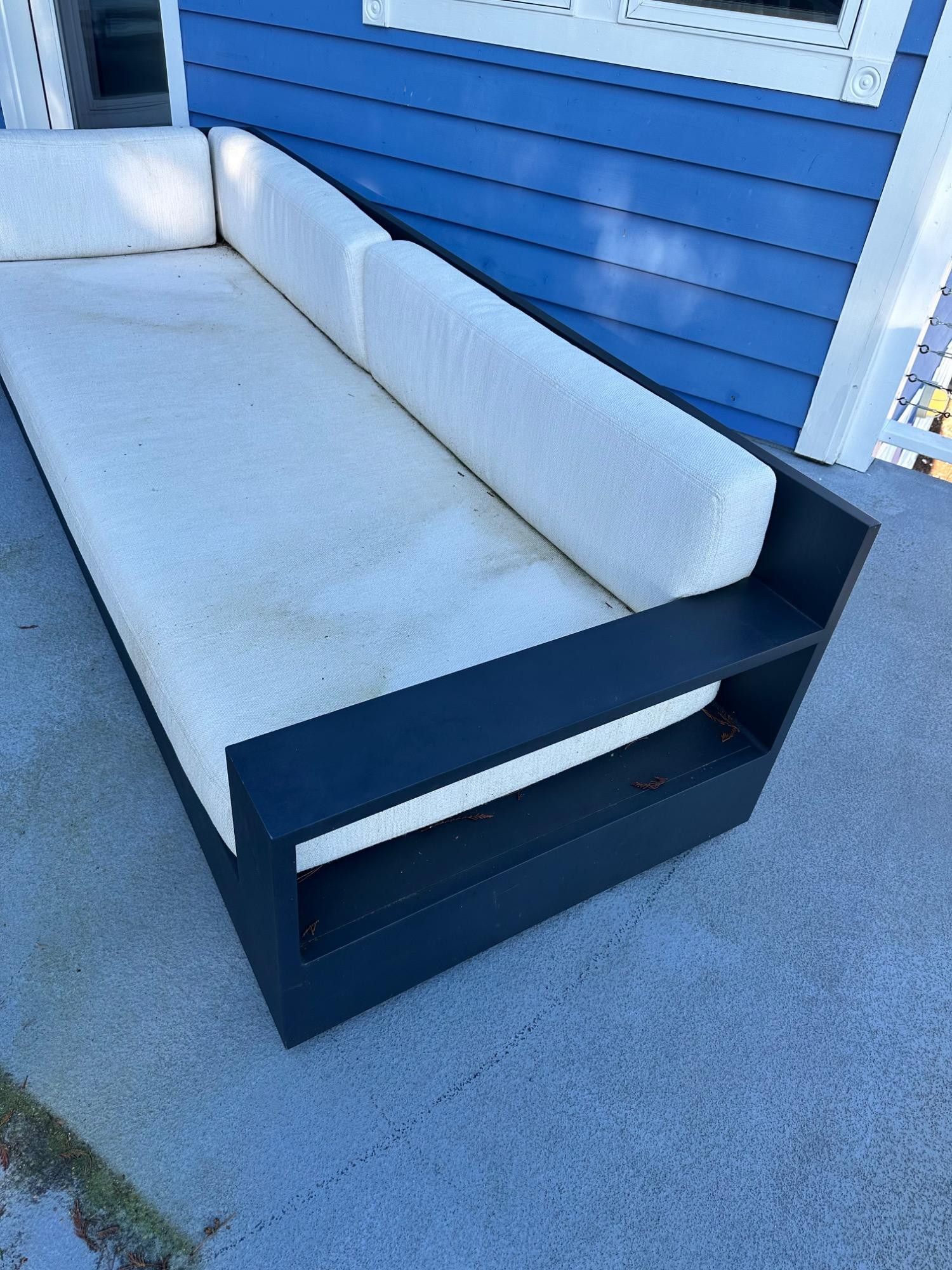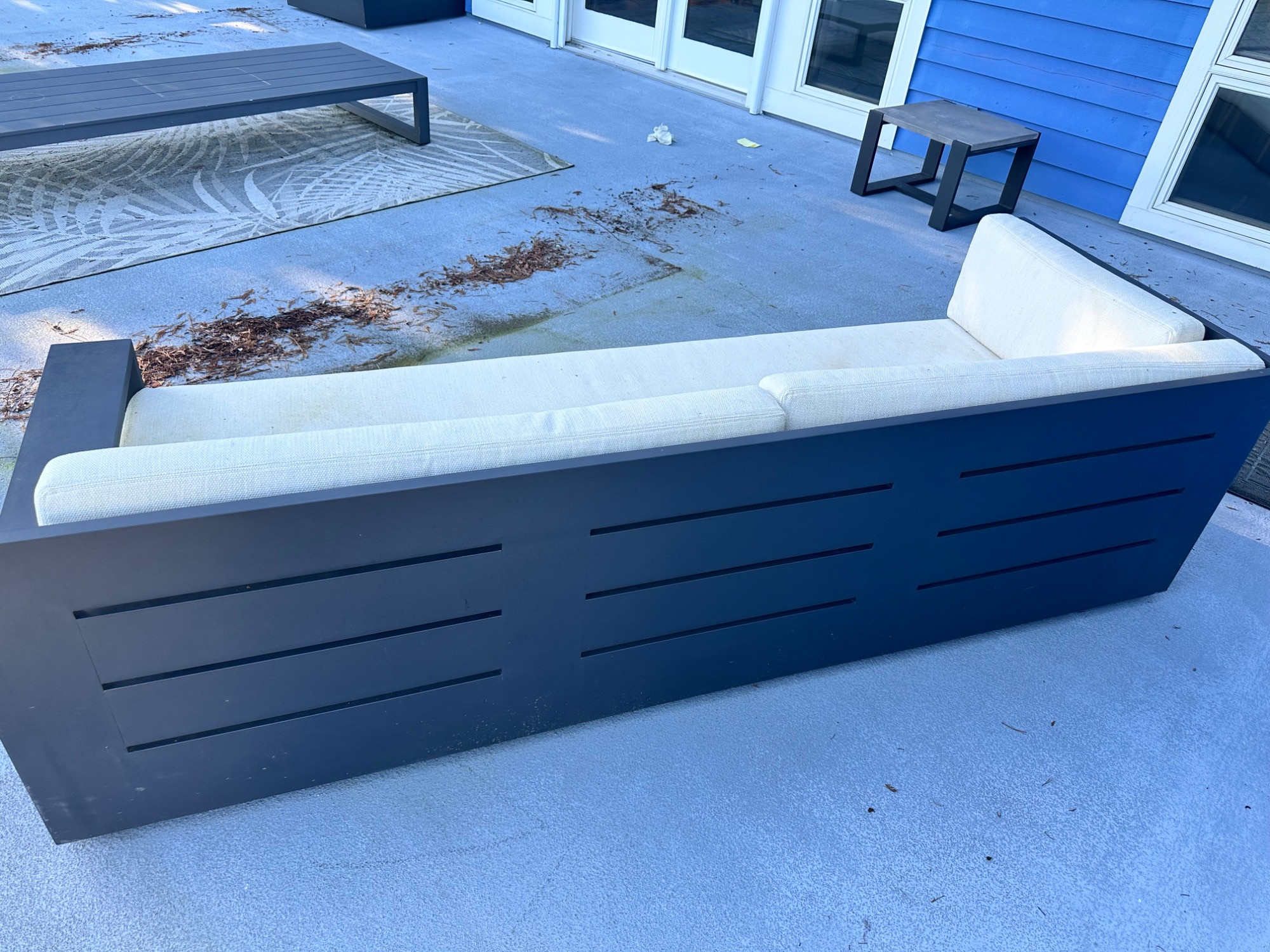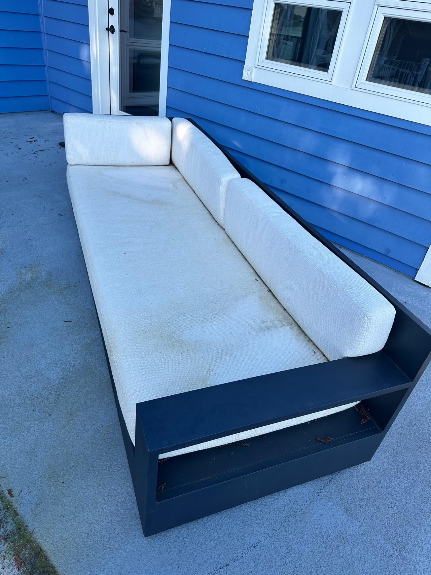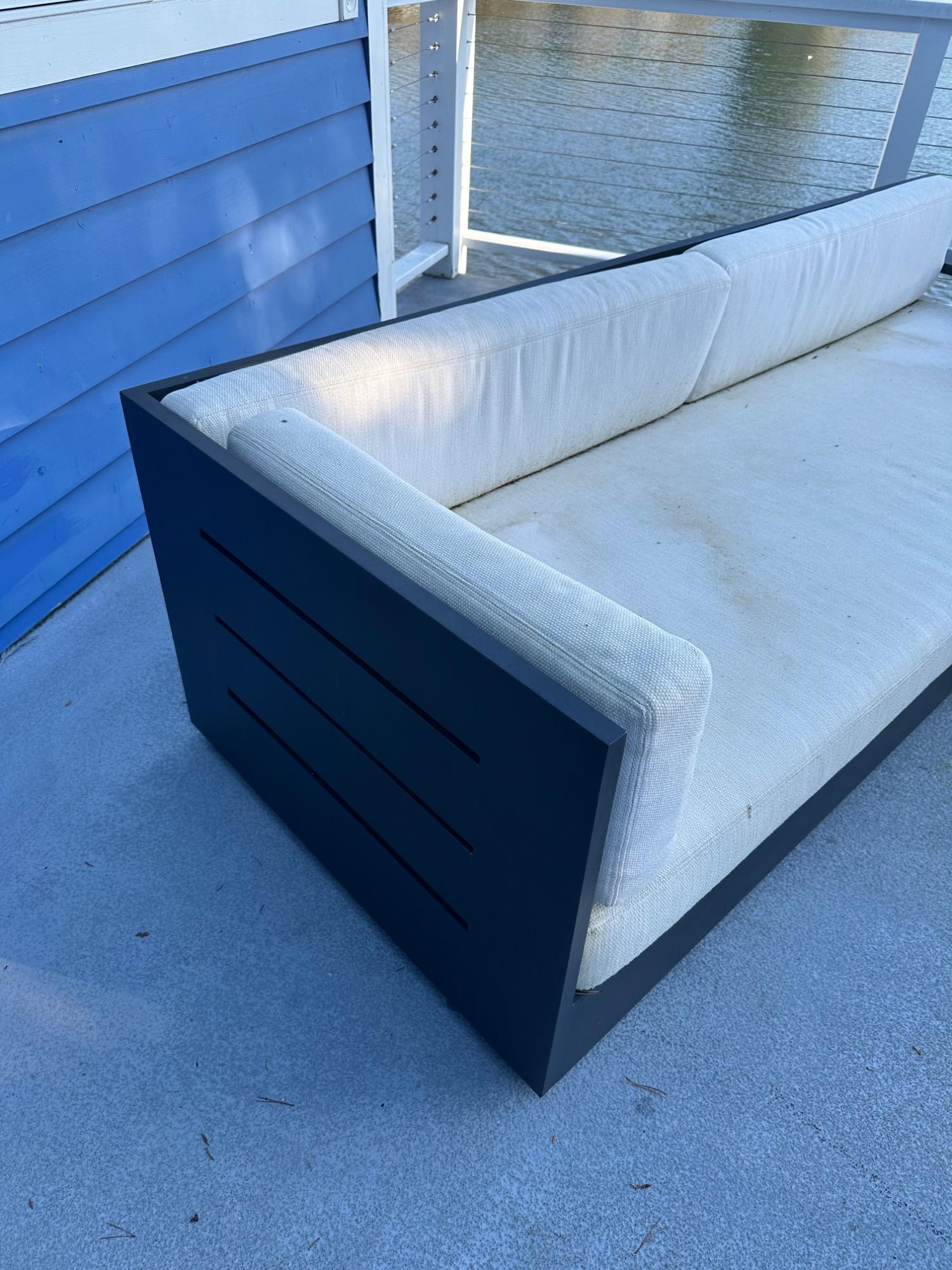 This Restoration Hardware outdoor patio long sofa combines style and comfort. Cover included! Dimensions: 90" L x 32.5" W x 25" T x 27" D Condition: Very good condition. Cushions just need cleaning. A perfect choice for your outdoor seating area! Bidding on this lot is an agreement that: (1.) You will have 2 capable, able-bodied persons to lift and load at a minimum. (2.) You will bring a hand truck and/or any other tools needed to remove this item. If these steps are not followed your item will be forfeited and no refund given.