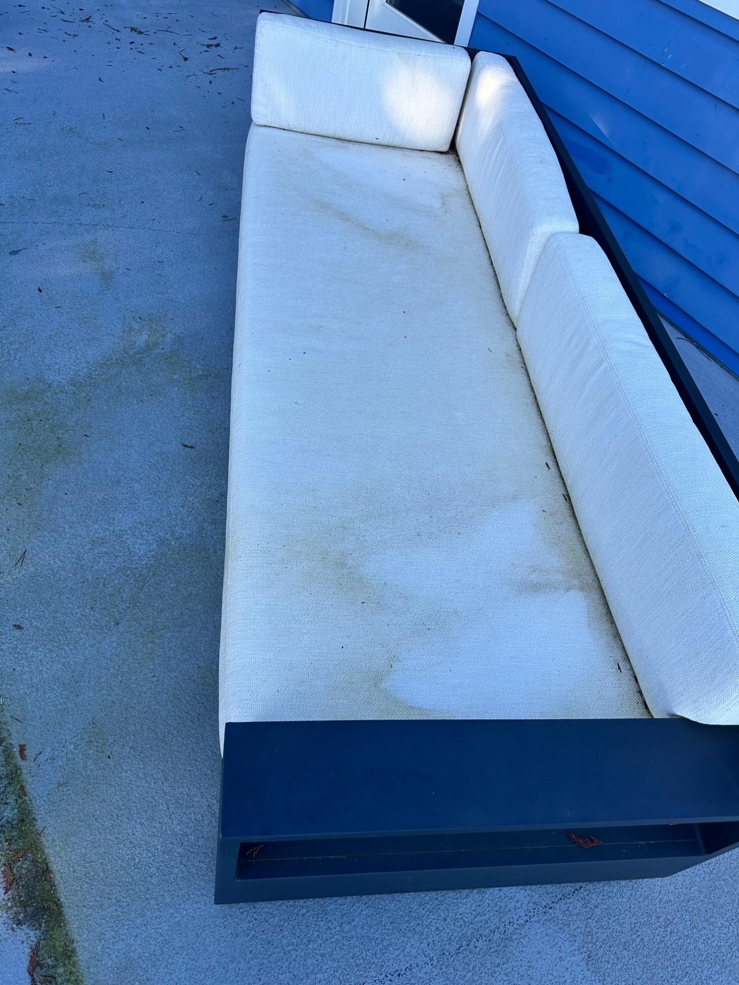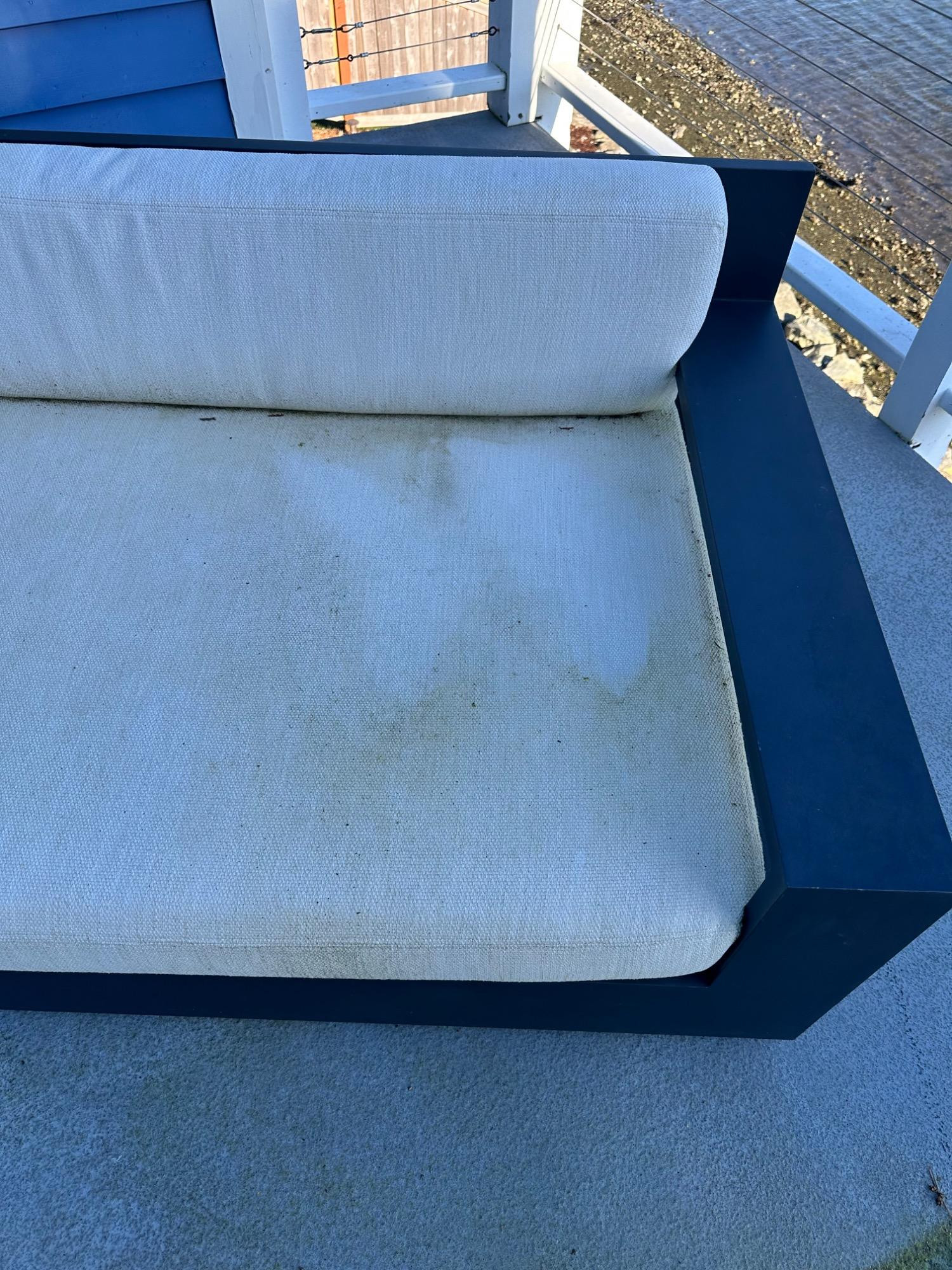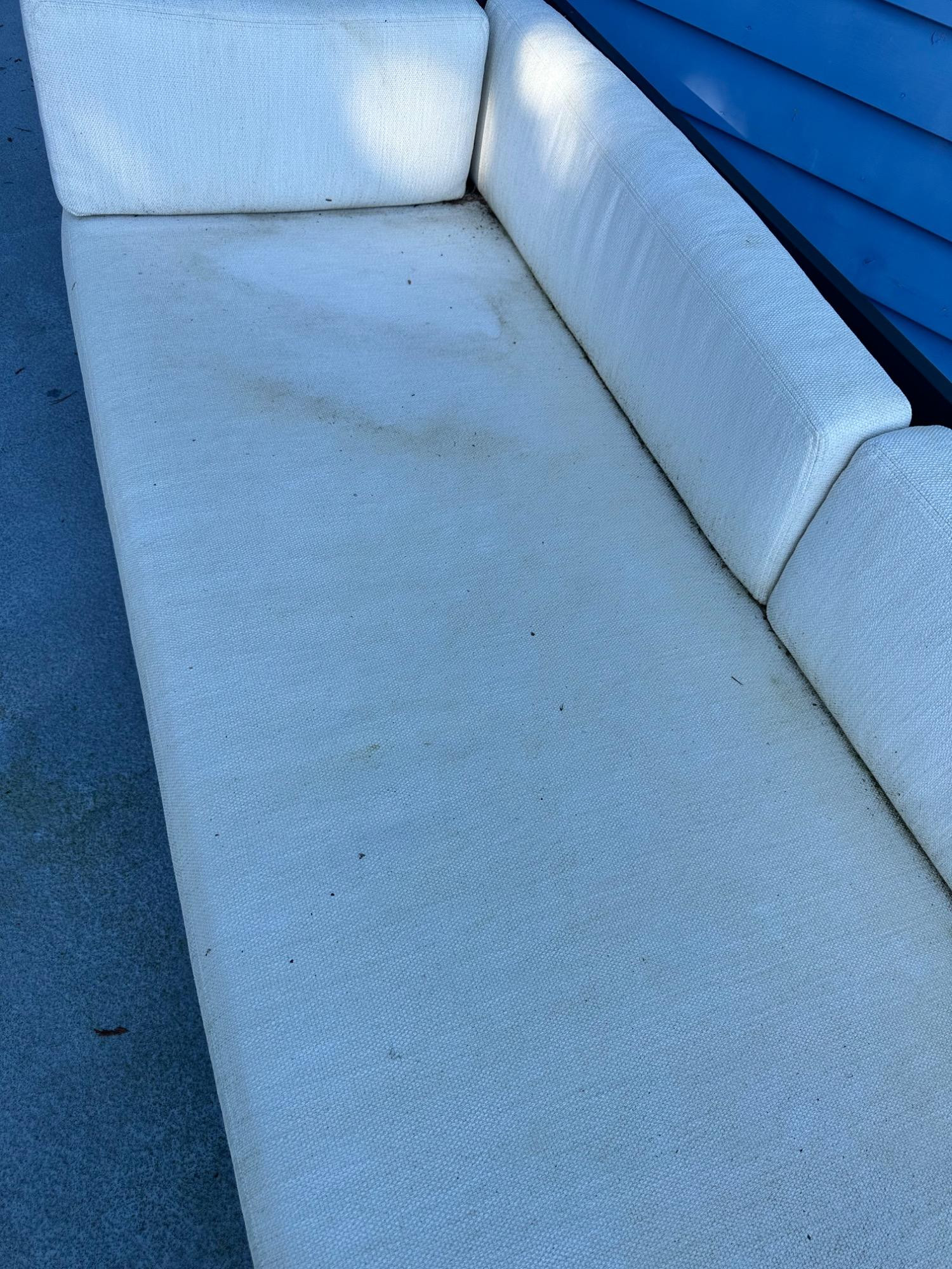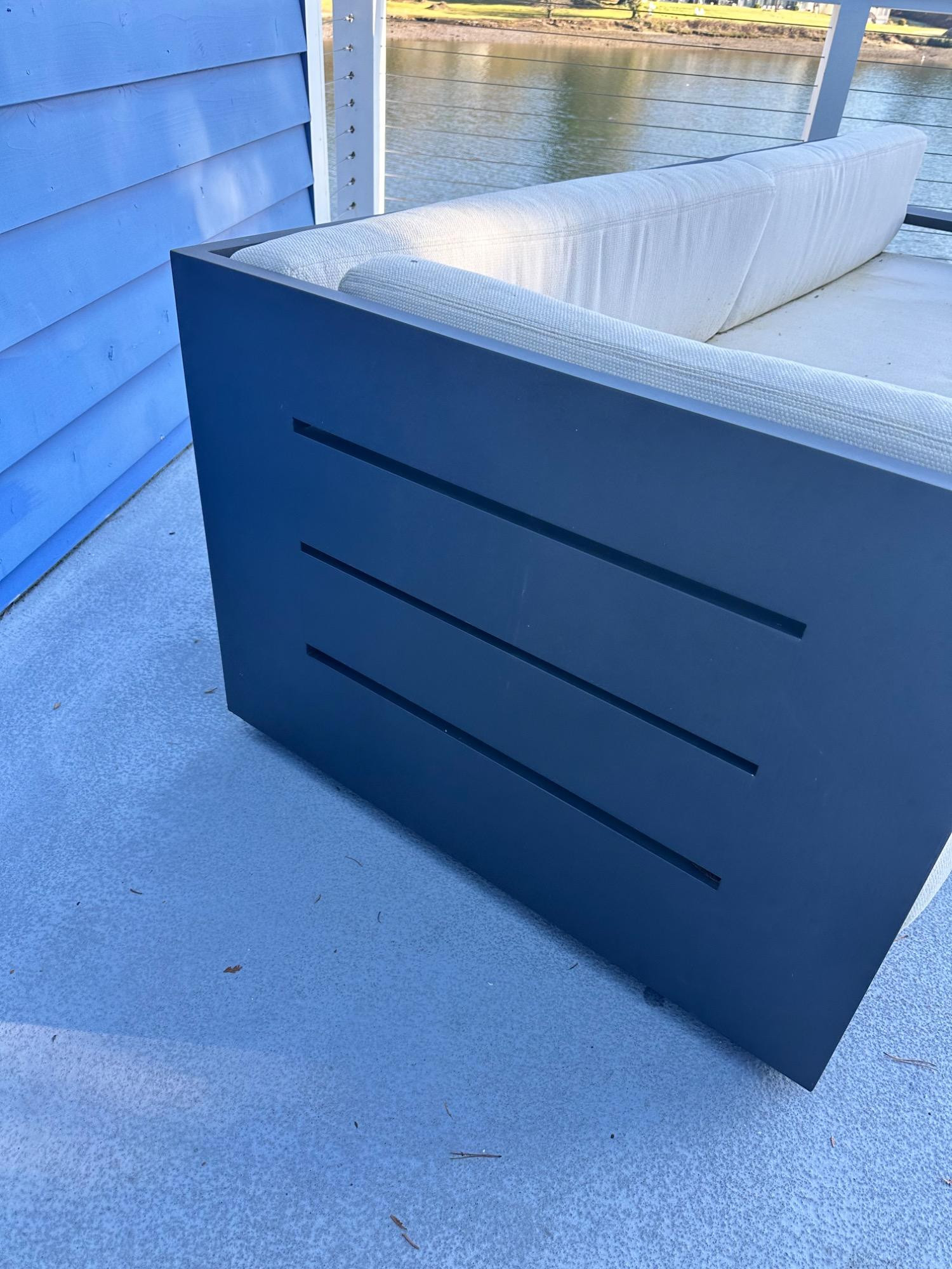 This Restoration Hardware outdoor patio long sofa combines style and comfort. Cover included! Dimensions: 90" L x 32.5" W x 25" T x 27" D Condition: Very good condition. Cushions just need cleaning. A perfect choice for your outdoor seating area! Bidding on this lot is an agreement that: (1.) You will have 2 capable, able-bodied persons to lift and load at a minimum. (2.) You will bring a hand truck and/or any other tools needed to remove this item. If these steps are not followed your item will be forfeited and no refund given.
