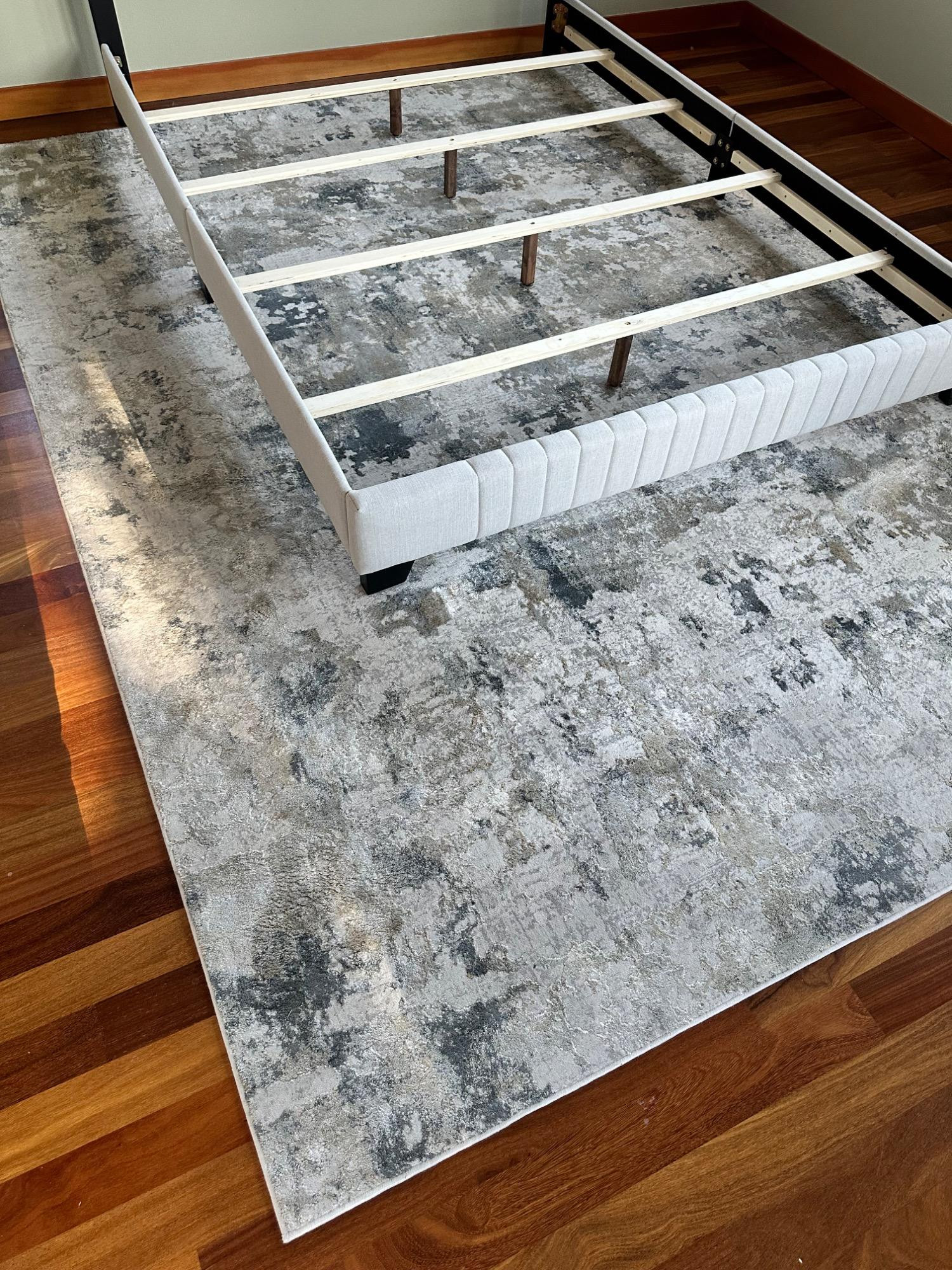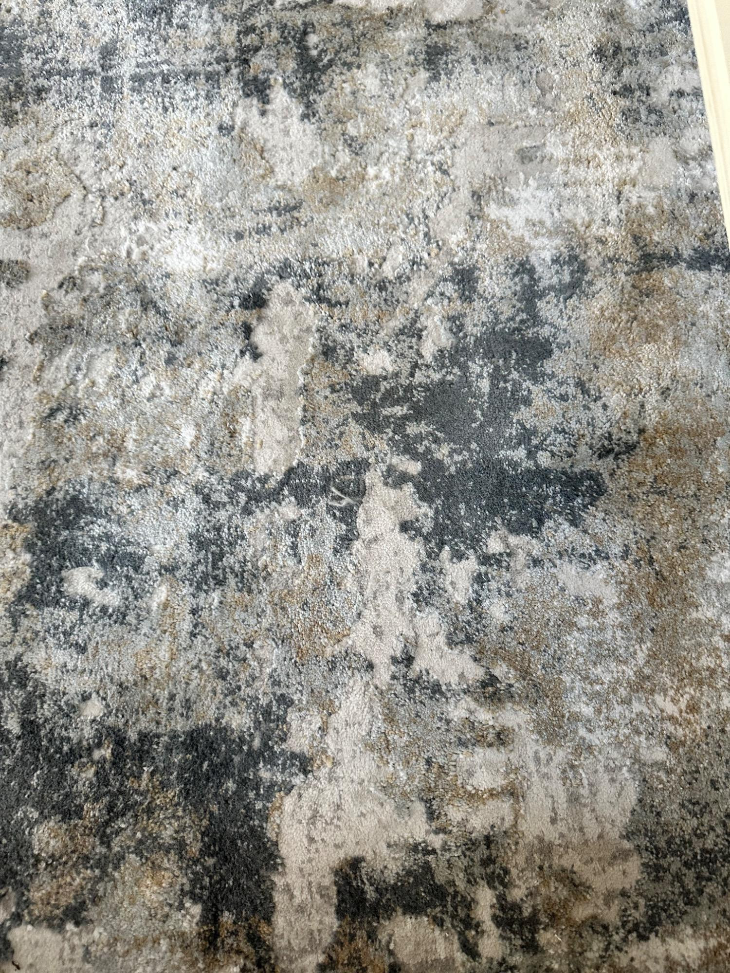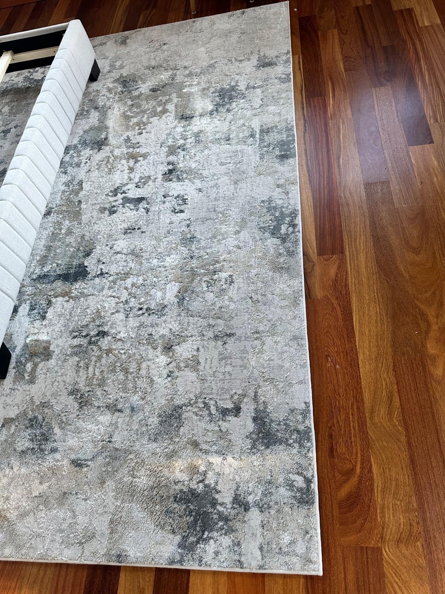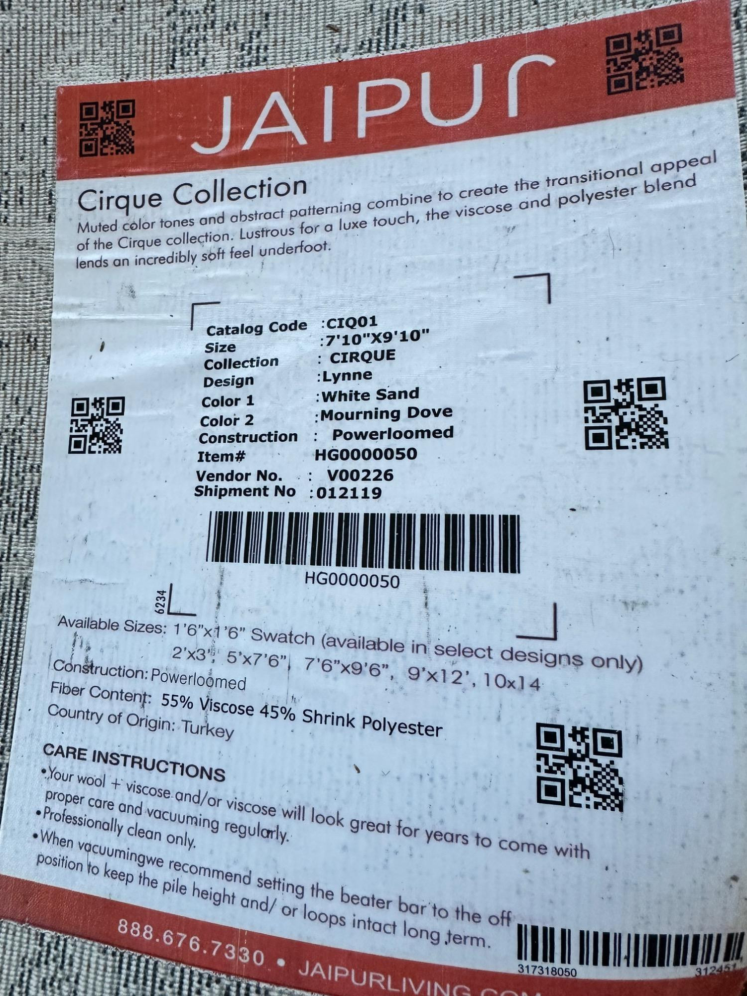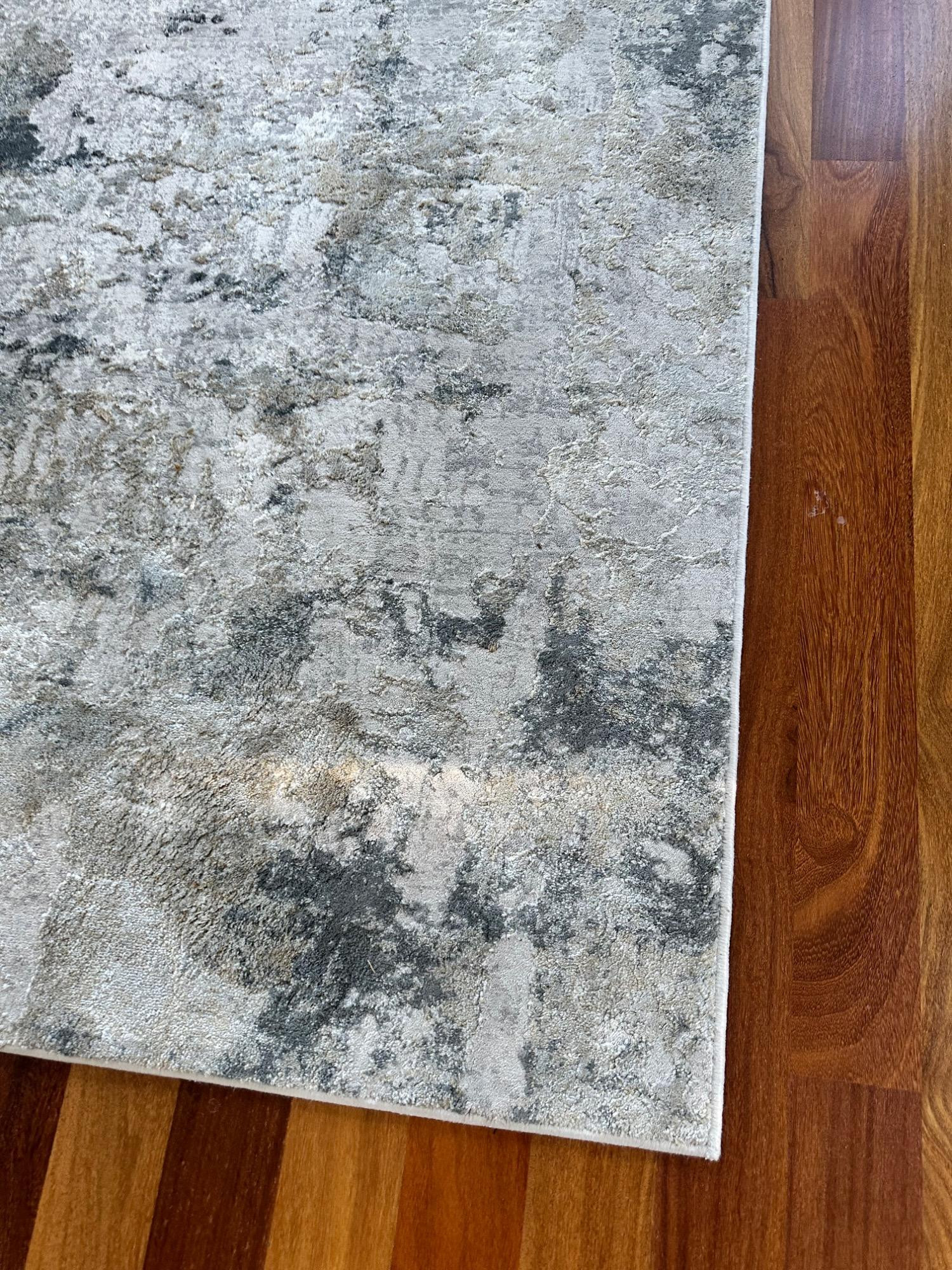 This Jaipur Cirque Collection area rug showcases a beautiful abstract pattern in muted color tones, including gray, beige, and blue. Its contemporary design makes it a perfect addition to any modern or transitional space. Size: 7' x 9' Condition: Excellent. No Stains Bring elegance and subtle sophistication to your home with this luxurious rug! Note: Headboard pictured is not included and is part of Lot #77.