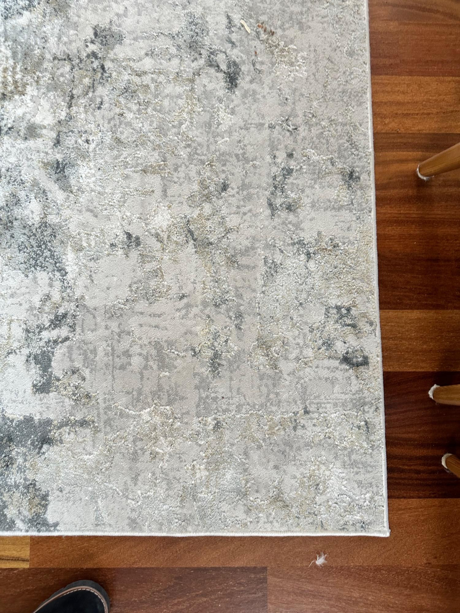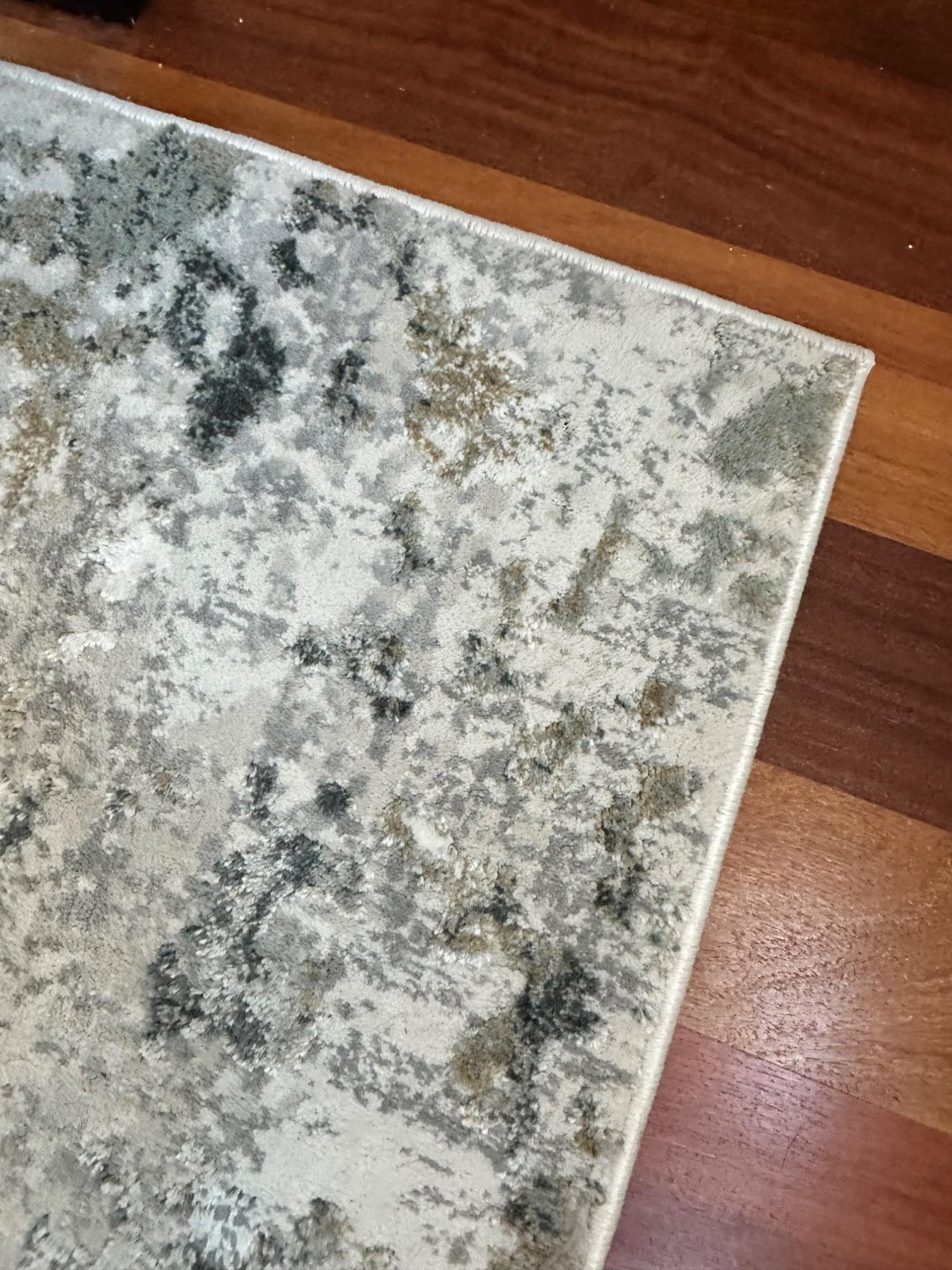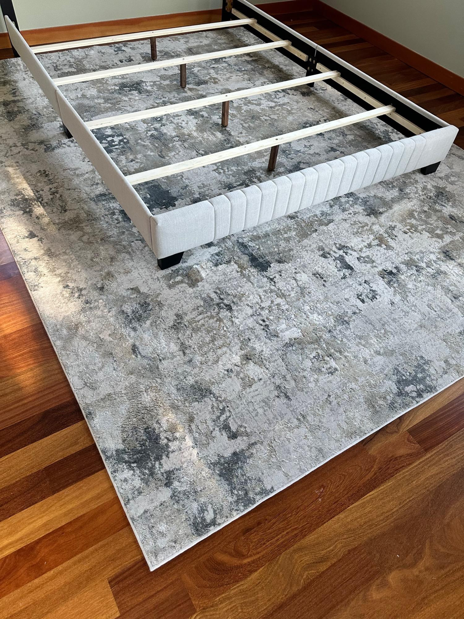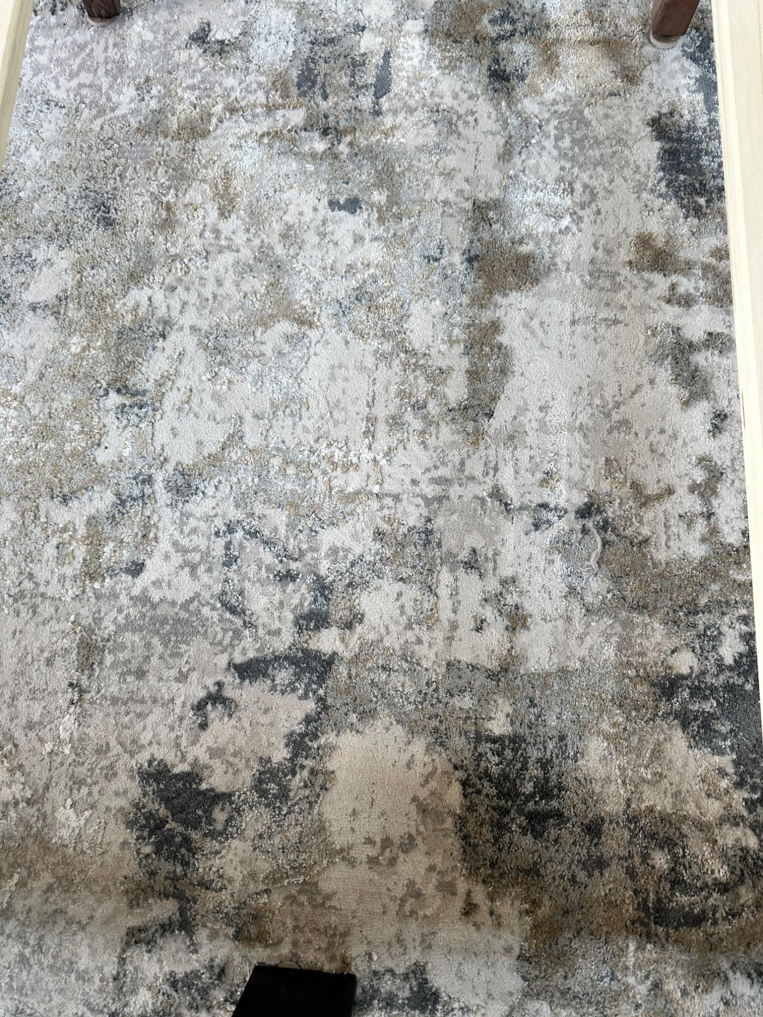 This Jaipur Cirque Collection area rug showcases a beautiful abstract pattern in muted color tones, including gray, beige, and blue. Its contemporary design makes it a perfect addition to any modern or transitional space. Size: 7' x 9' Condition: Excellent. No Stains Bring elegance and subtle sophistication to your home with this luxurious rug! Note: Headboard pictured is not included and is part of Lot #77.