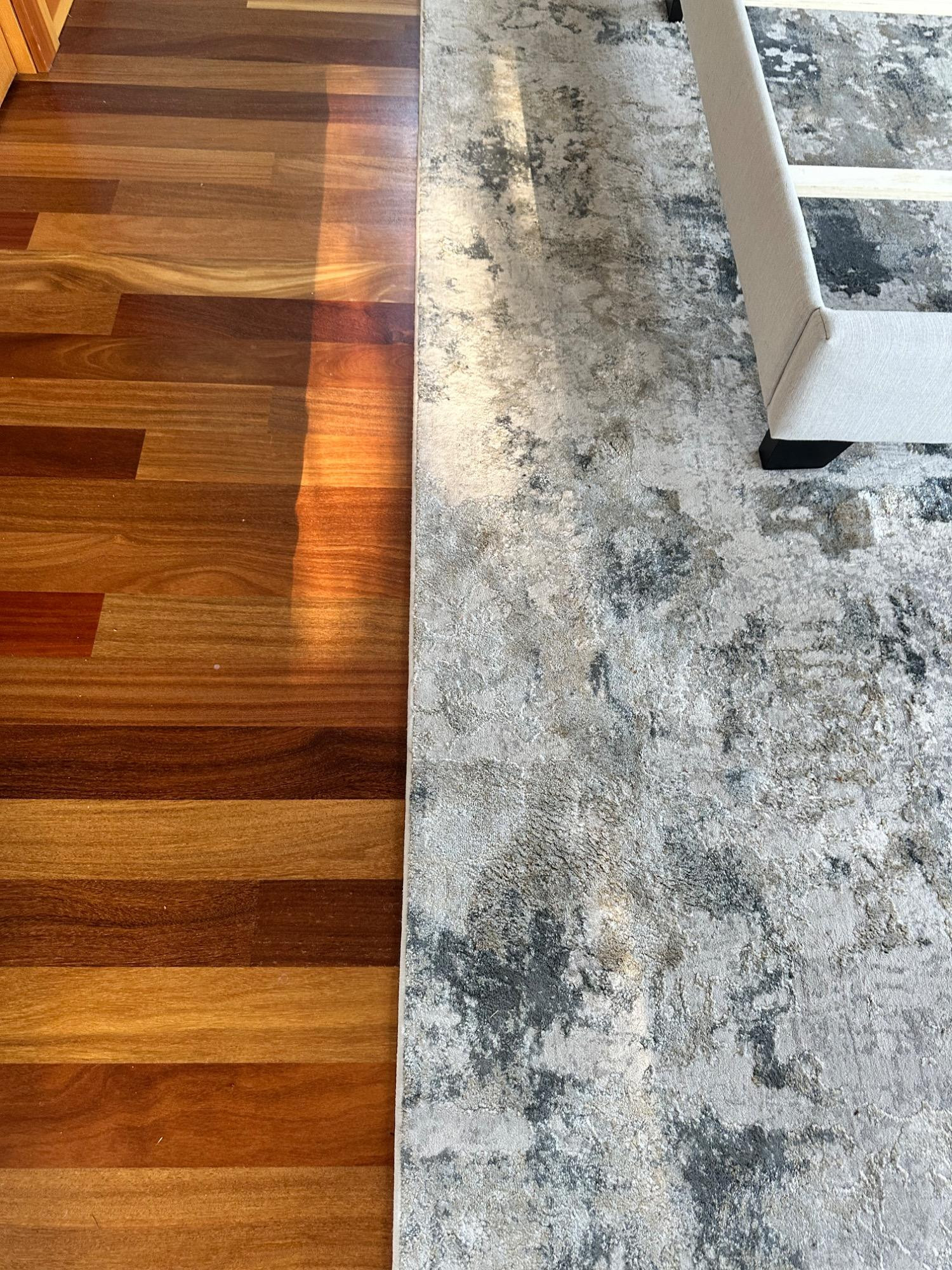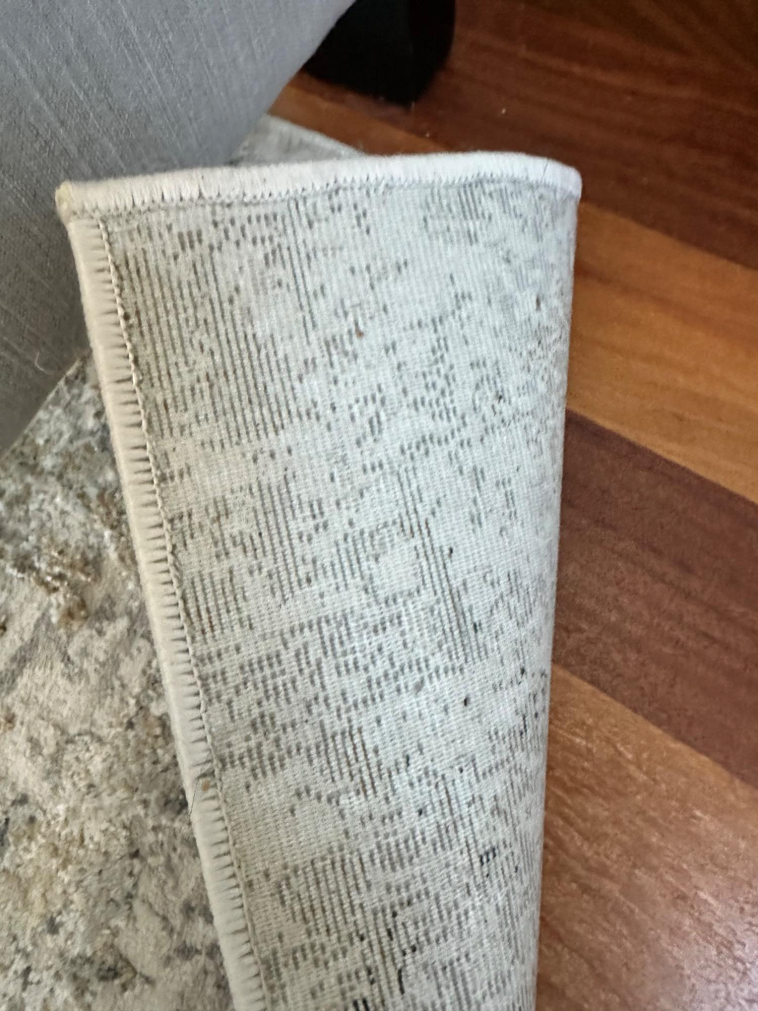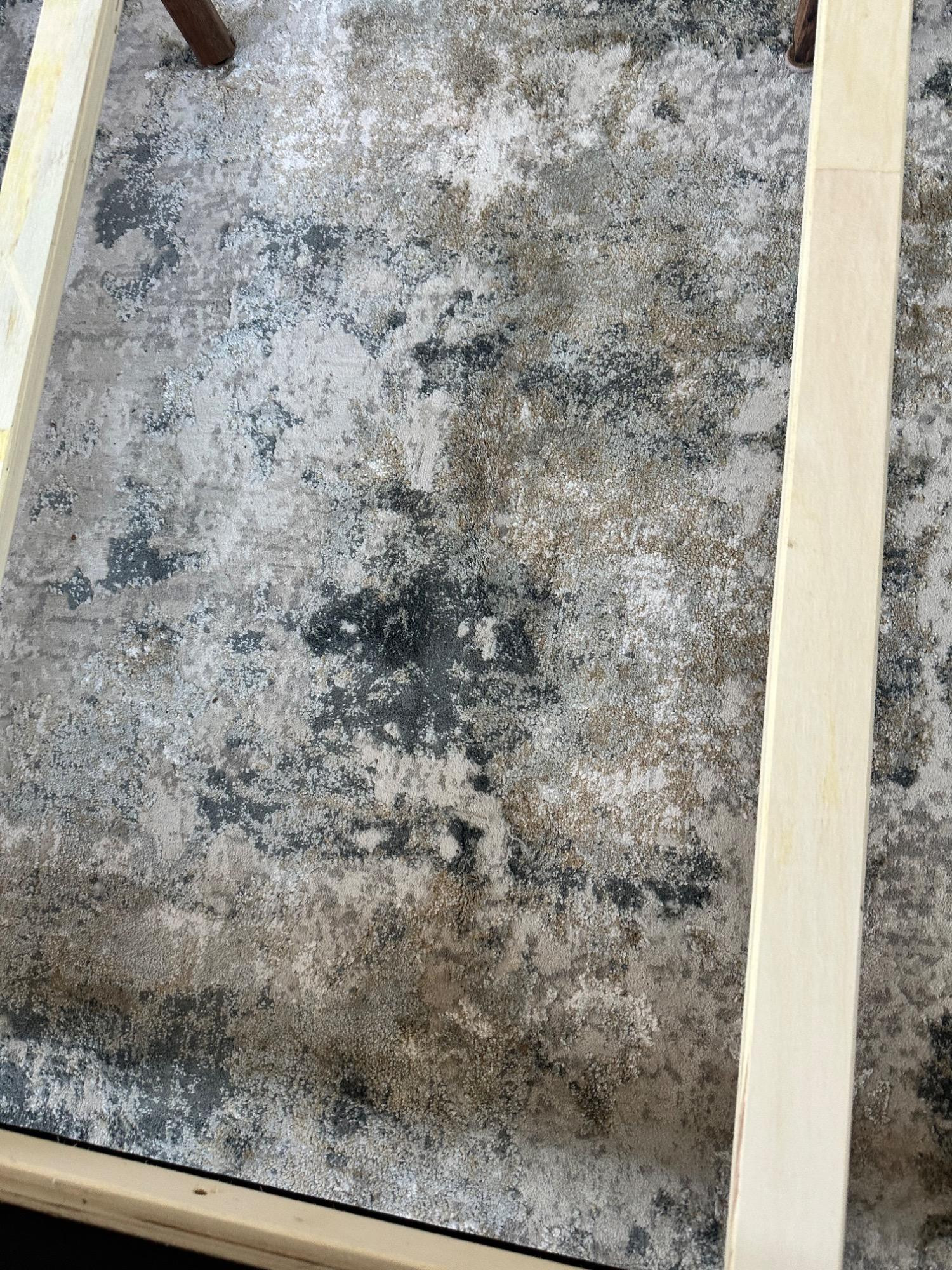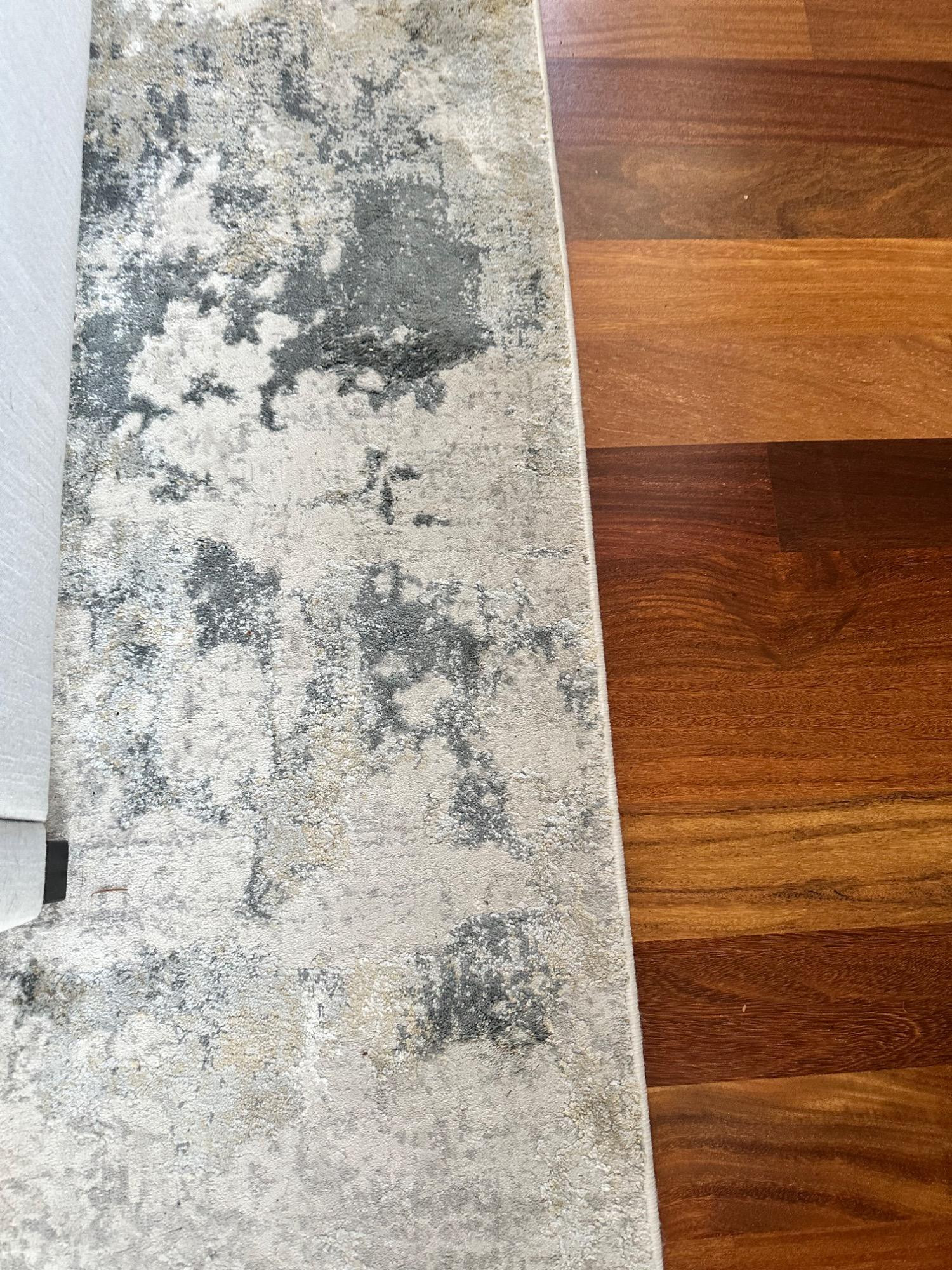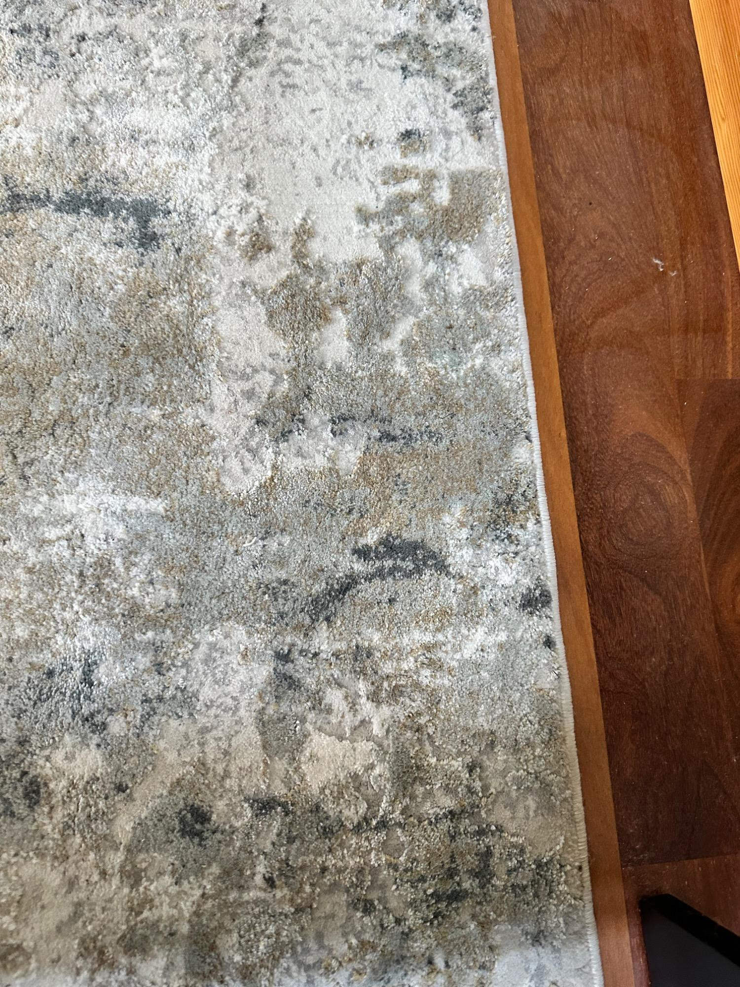 This Jaipur Cirque Collection area rug showcases a beautiful abstract pattern in muted color tones, including gray, beige, and blue. Its contemporary design makes it a perfect addition to any modern or transitional space. Size: 7' x 9' Condition: Excellent. No Stains Bring elegance and subtle sophistication to your home with this luxurious rug! Note: Headboard pictured is not included and is part of Lot #77.