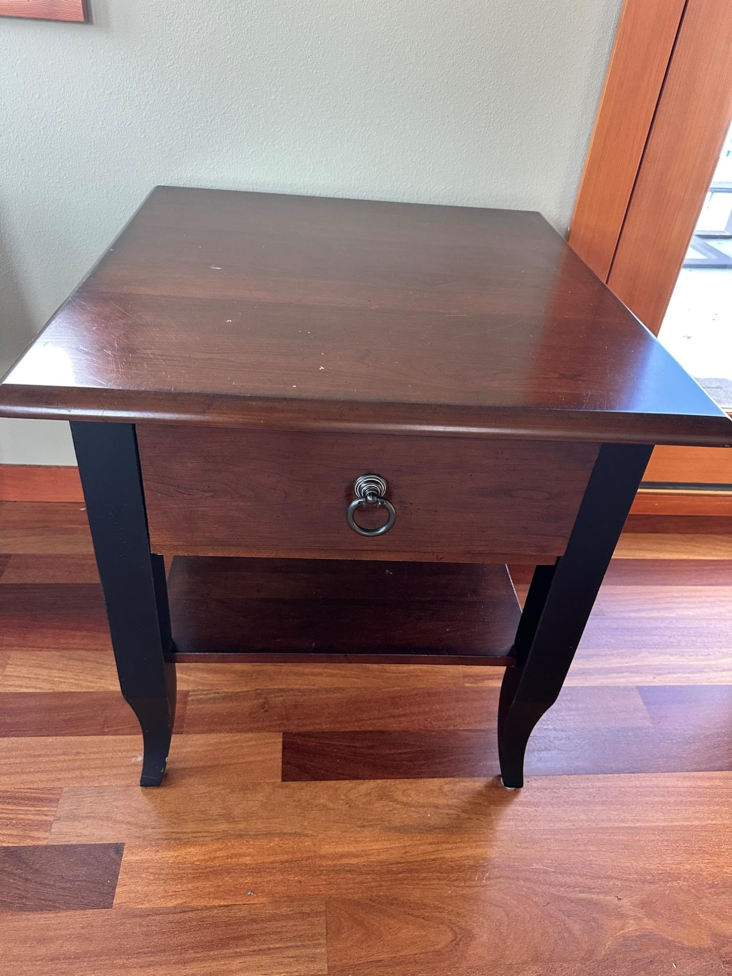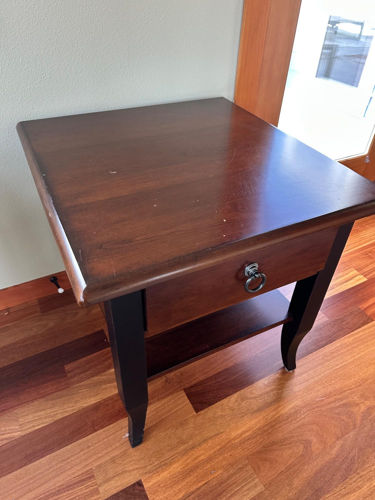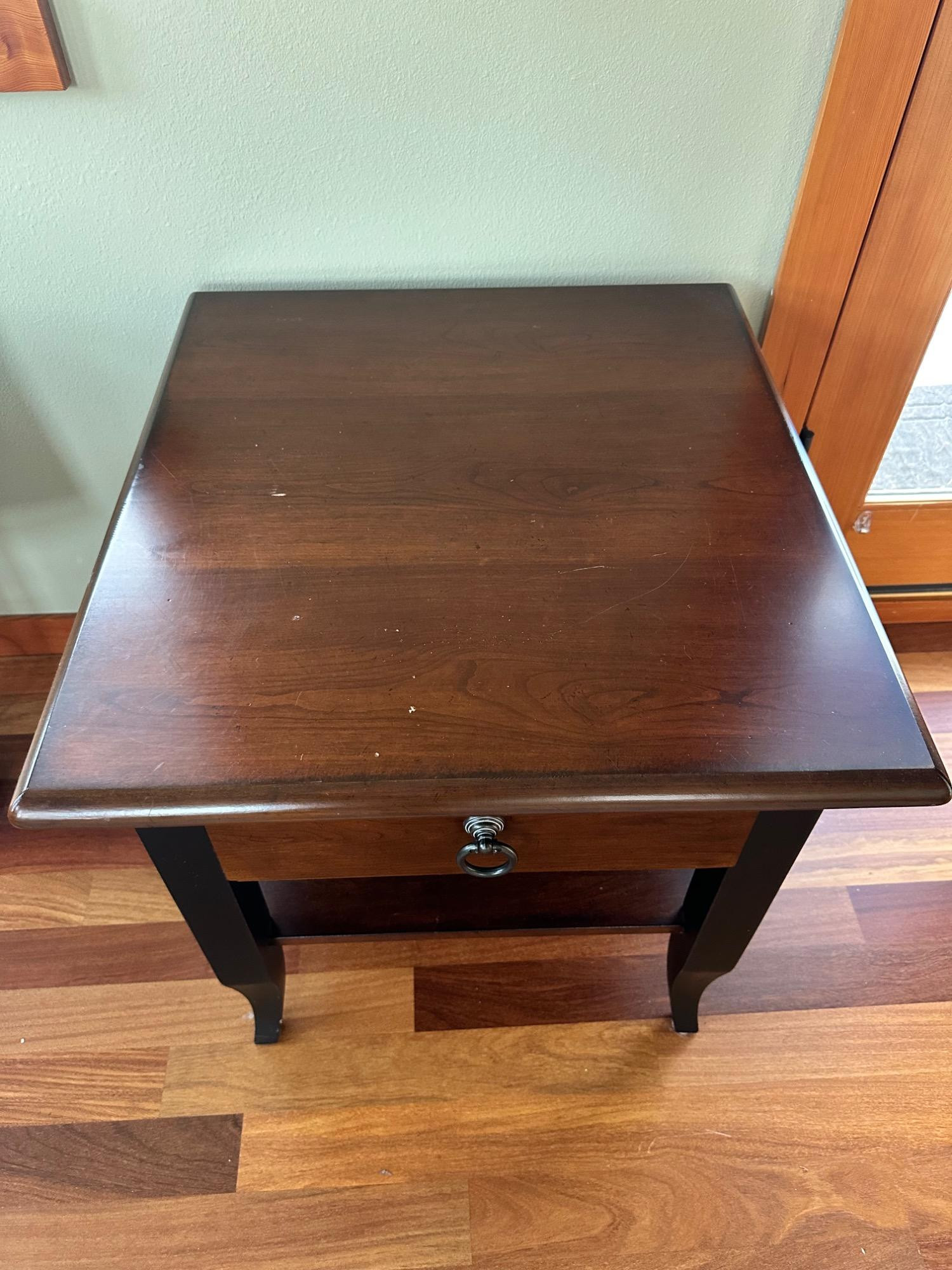 This traditional wood side table adds a touch of classic elegance to any space. Measurements: 27.5" D x 26" W x 26.5" Tall Features: Includes a single drawer with a stylish ring pull and a lower shelf for added storage or display. Condition: Excellent A timeless piece for your living room, bedroom, or office! Bidding on this lot is an agreement that: (1.) You will have 2 capable, able-bodied persons to lift and load at a minimum. (2.) You will bring a hand truck and/or any other tools needed to remove this item. If these steps are not followed your item will be forfeited and no refund given.