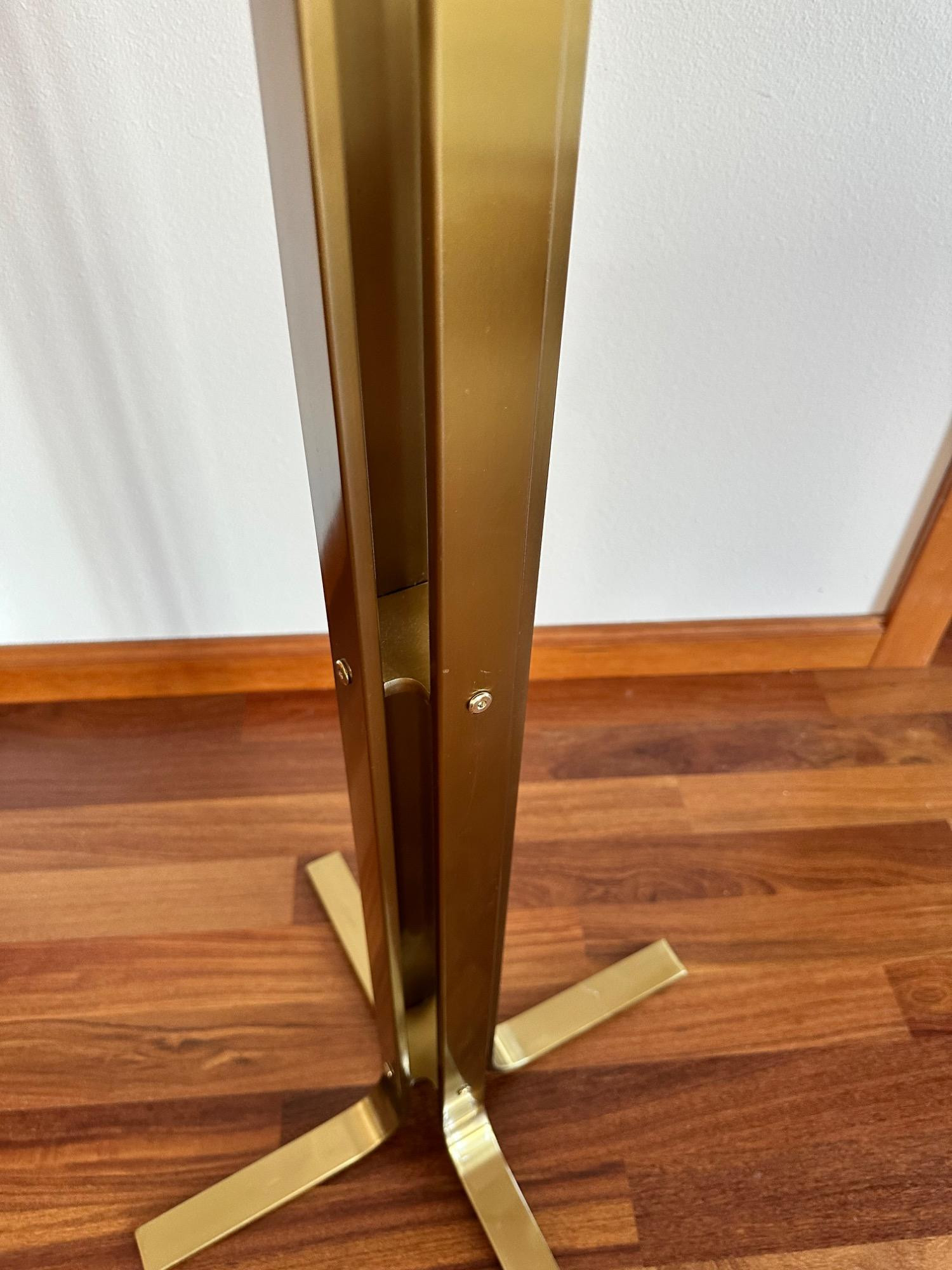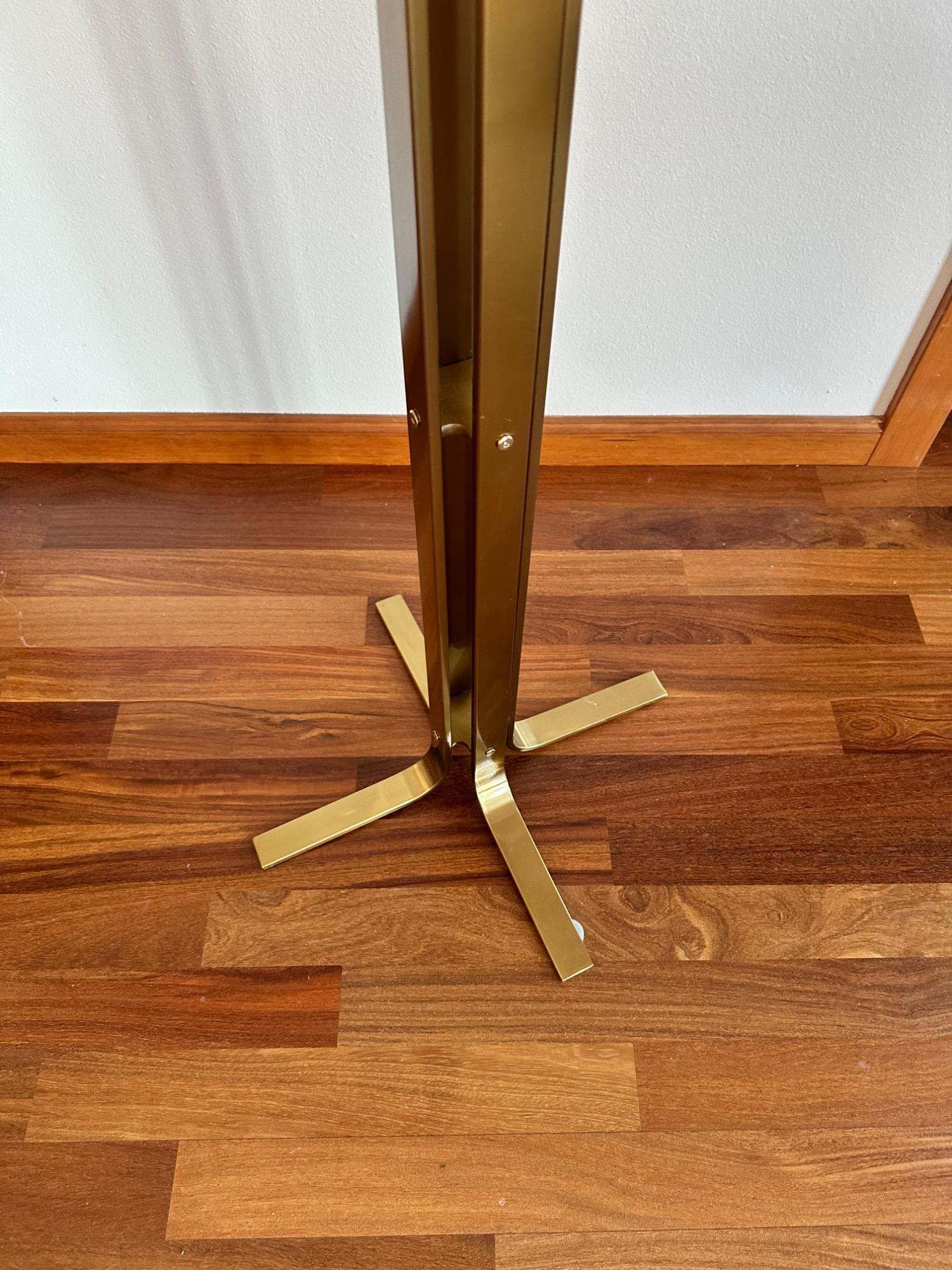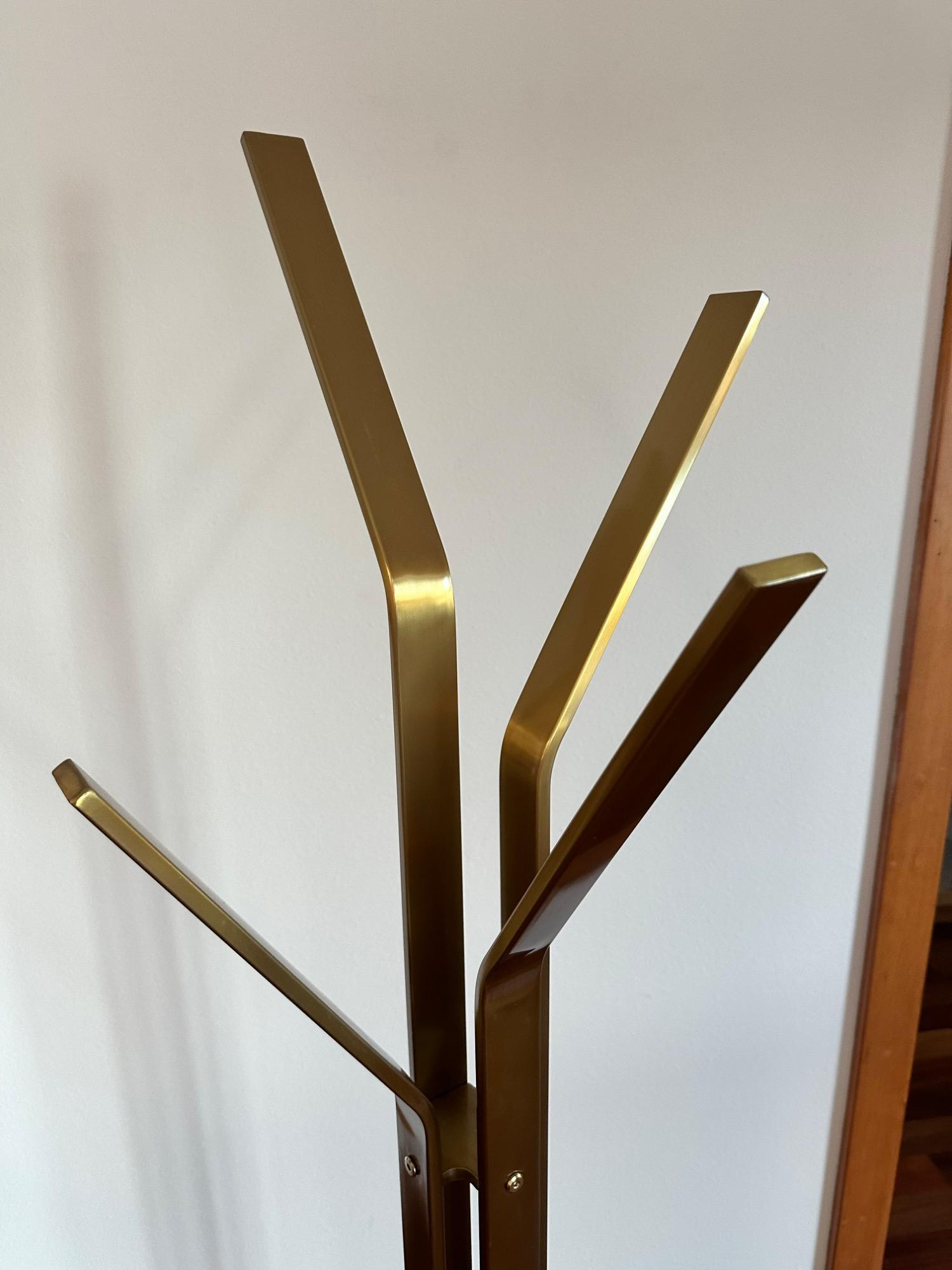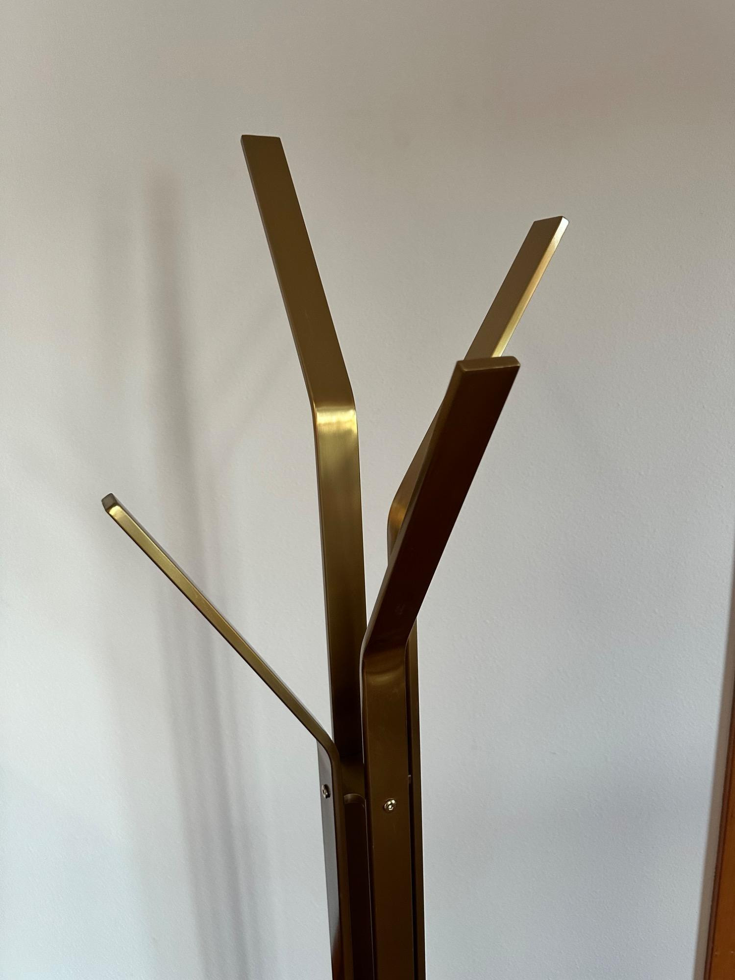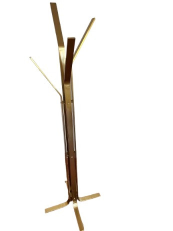 Modern Gold-Toned Metal Coat Rack Add a touch of sophistication to your entryway or office with this stylish gold-toned metal coat rack. Measuring 65" tall with a 22" base, this sleek design combines functionality with contemporary elegance, making it a perfect fit for any modern decor.