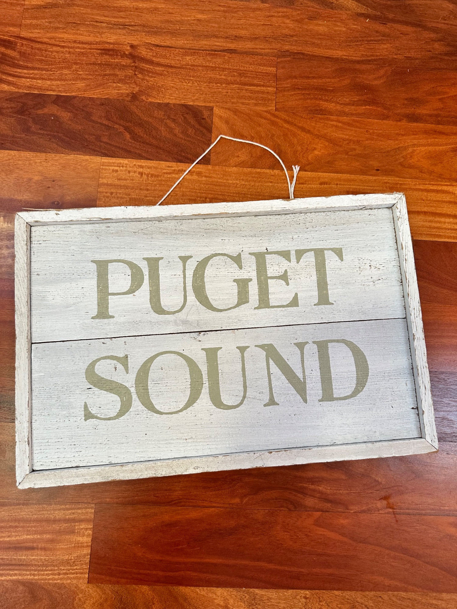 Wall Decor-Large Clock & Puget Sound Sign Set This set includes a sleek wall clock with a 20.5" diameter and a charming "Puget Sound" sign measuring 18" x 12". The clock offers a clean, modern design, while the rustic-style wooden sign adds a coastal touch, perfect for complementing any home or office decor.