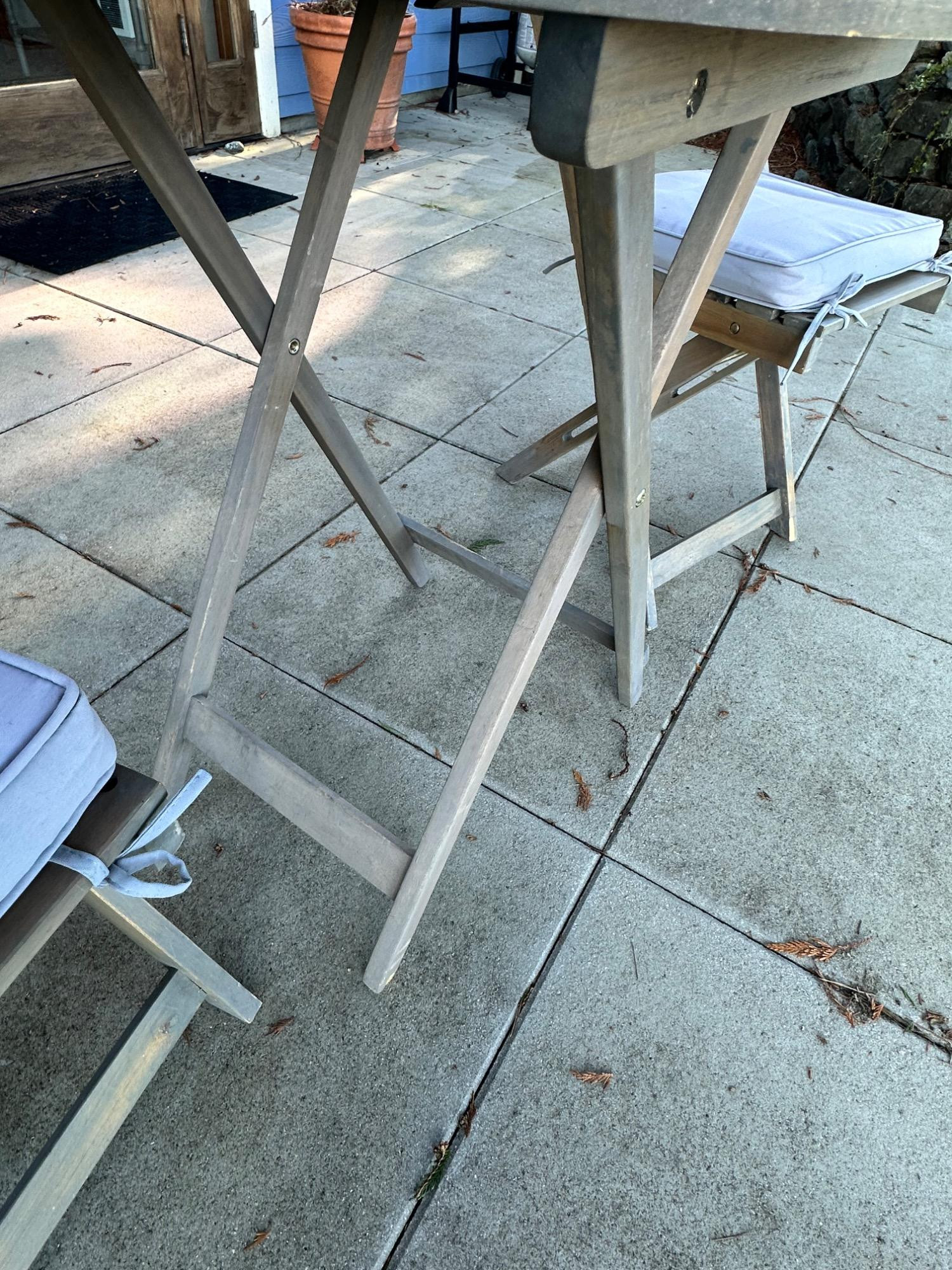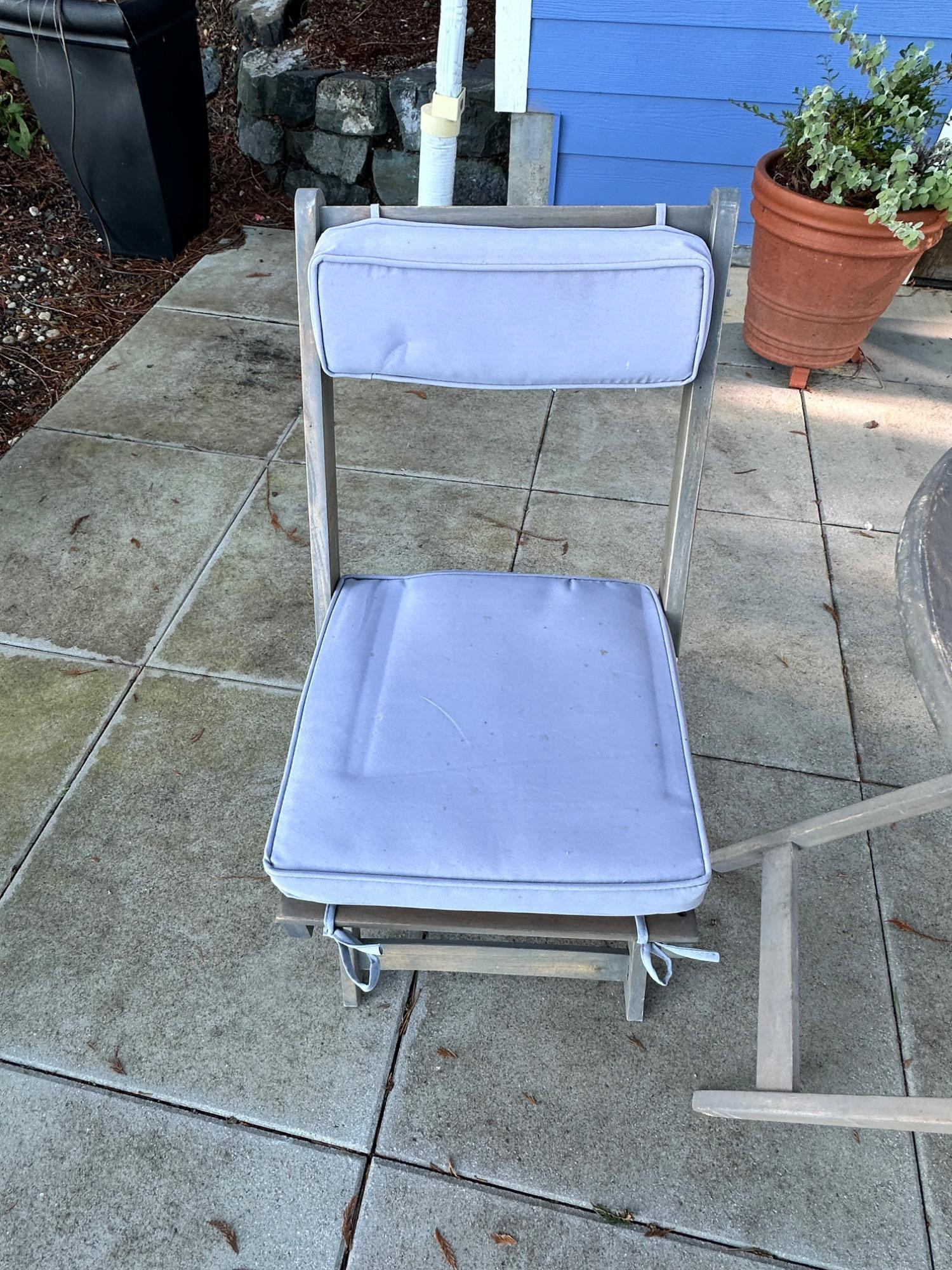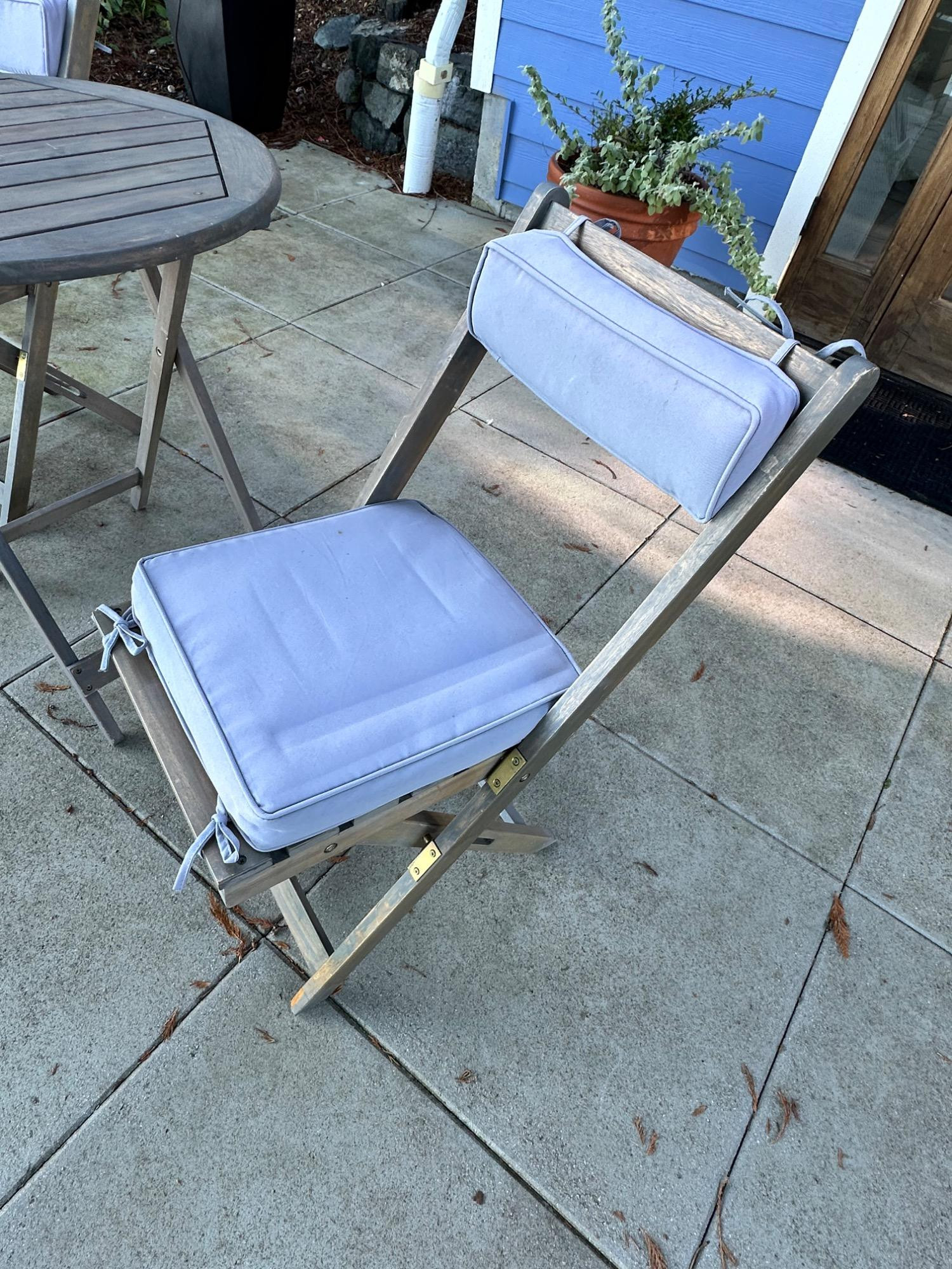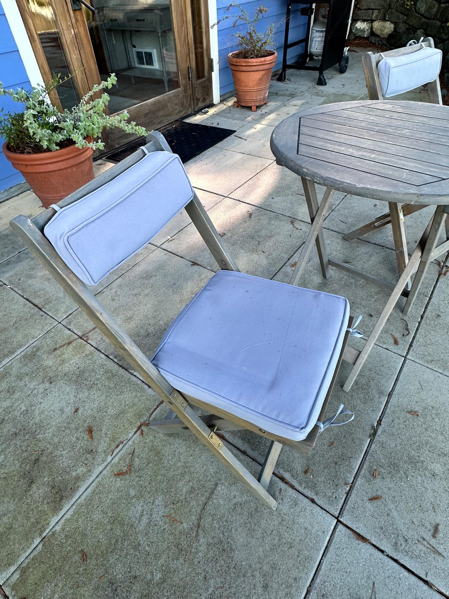 Lot # 83 - Charming Weathered Bistro Set w/ Folding Chairs & Cushions