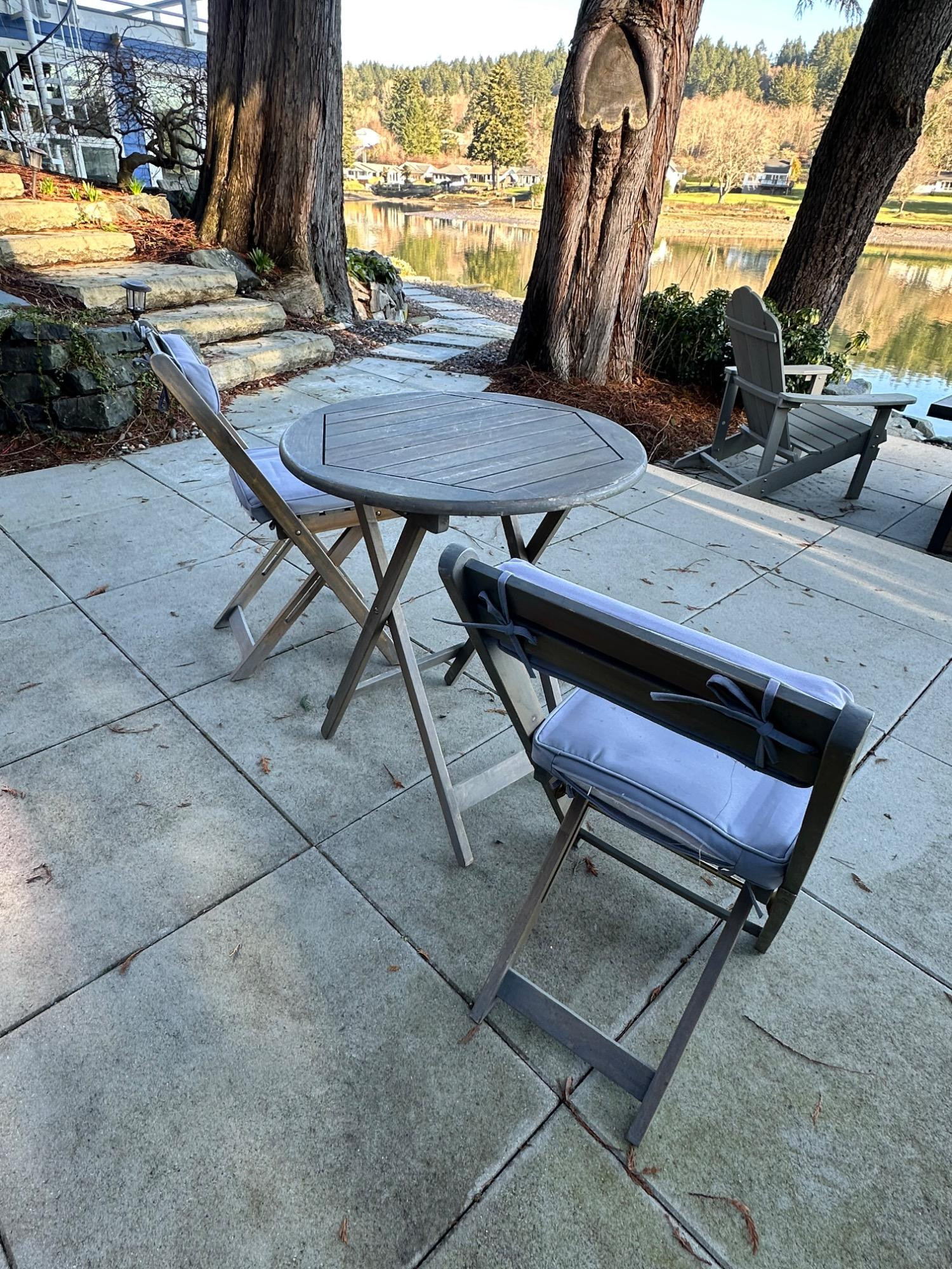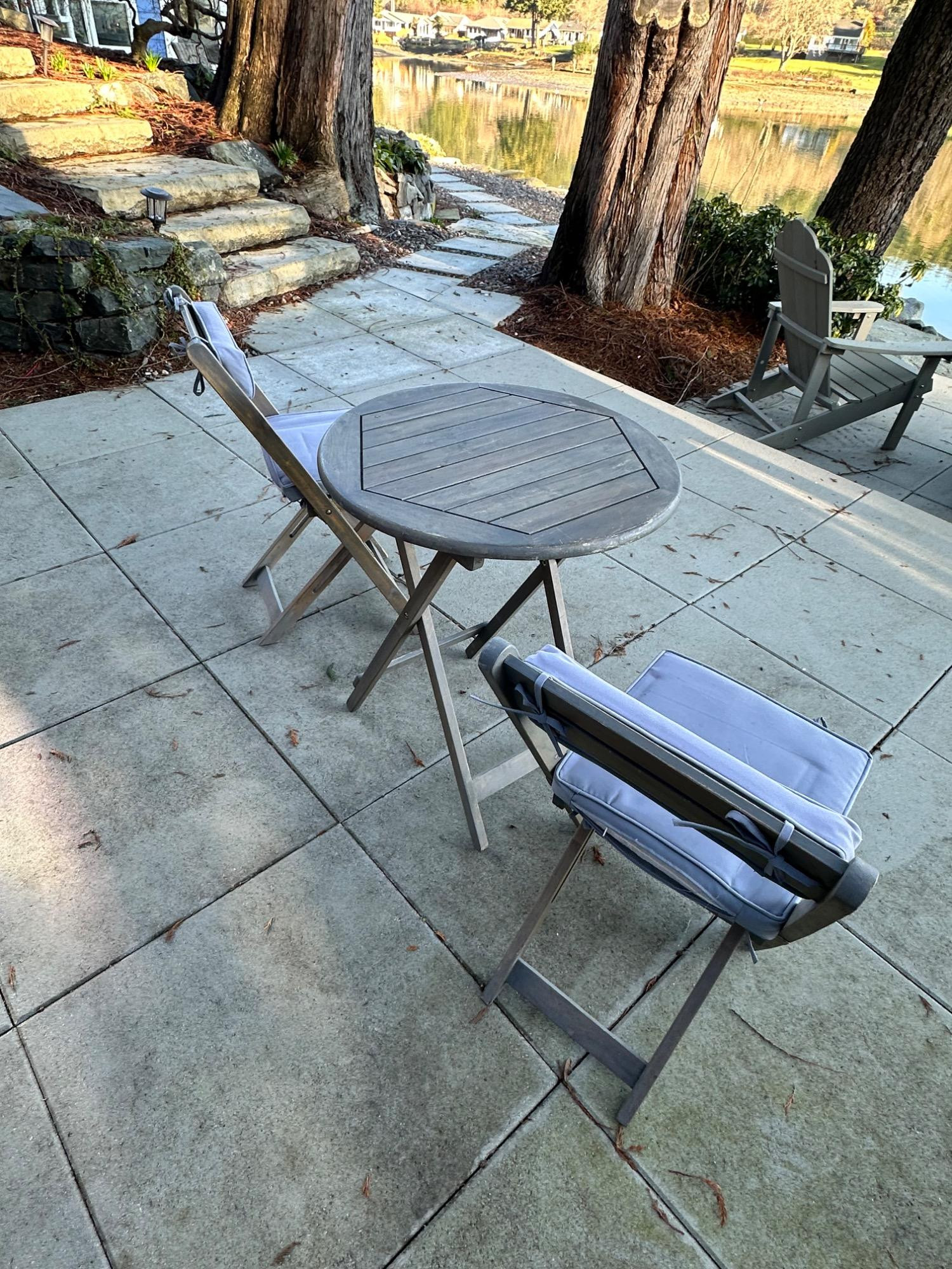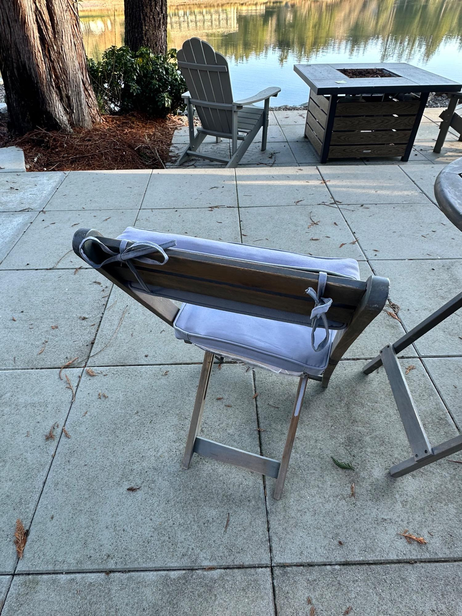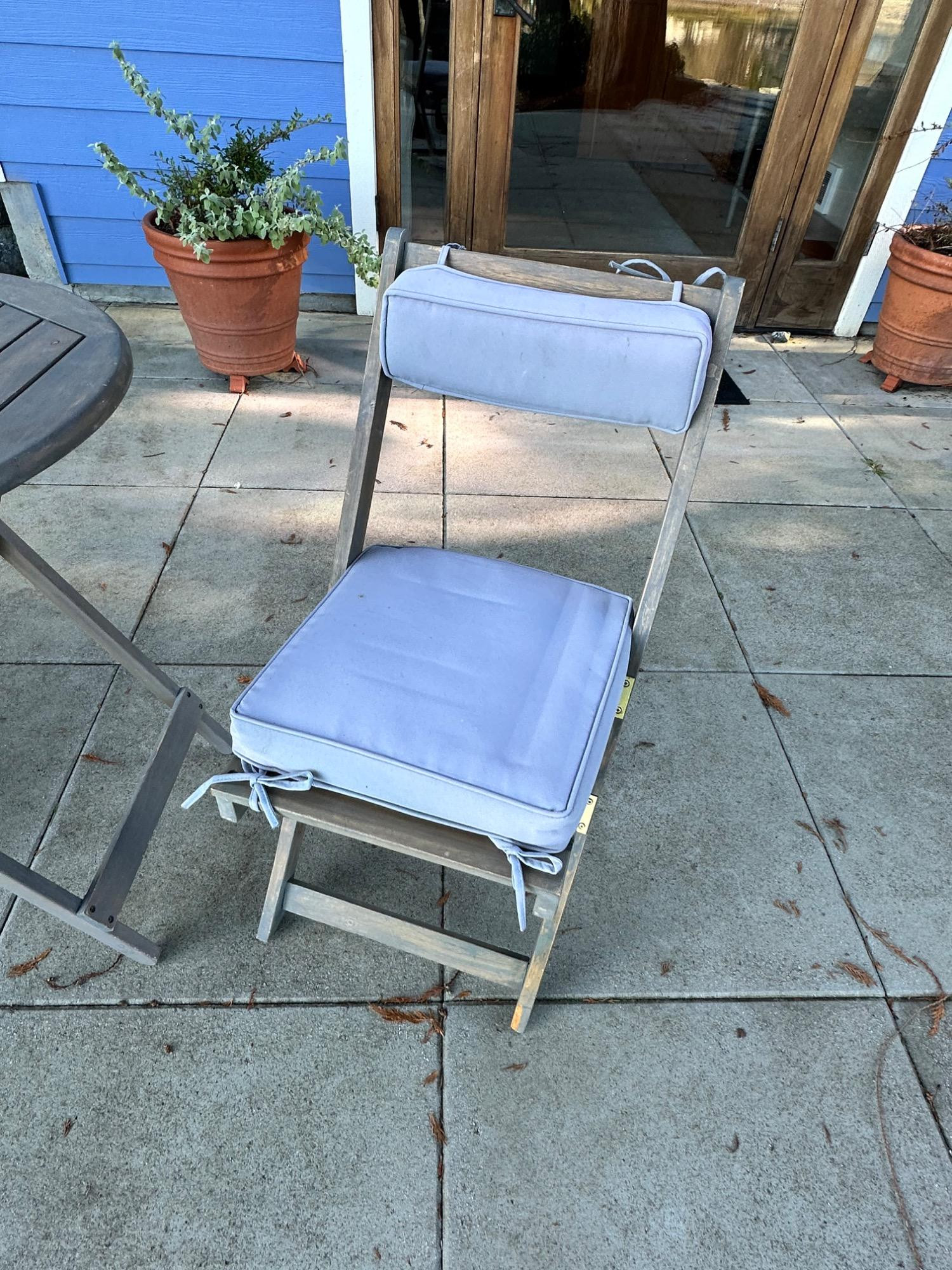Lot # 83 - Charming Weathered Bistro Set w/ Folding Chairs & Cushions