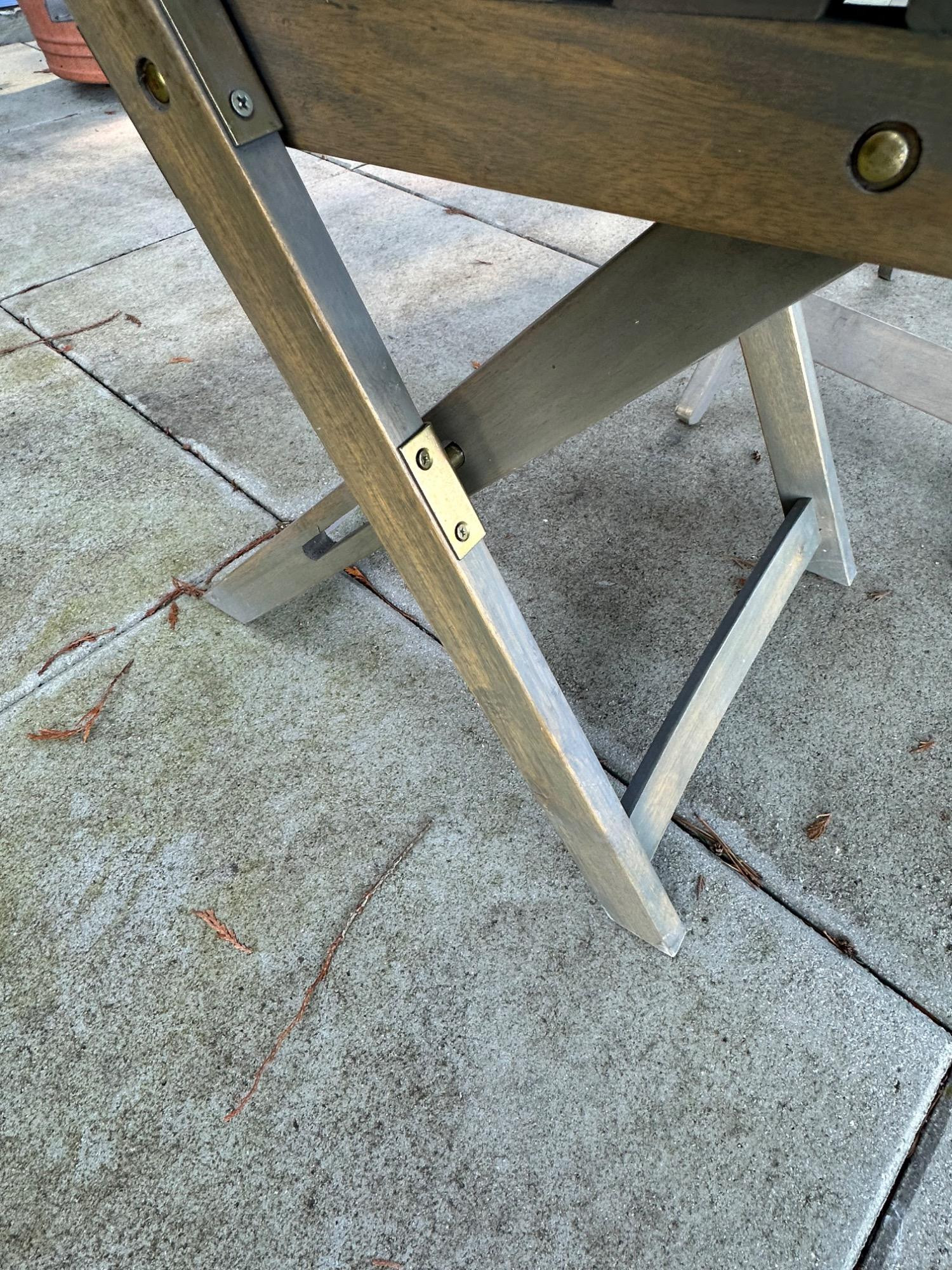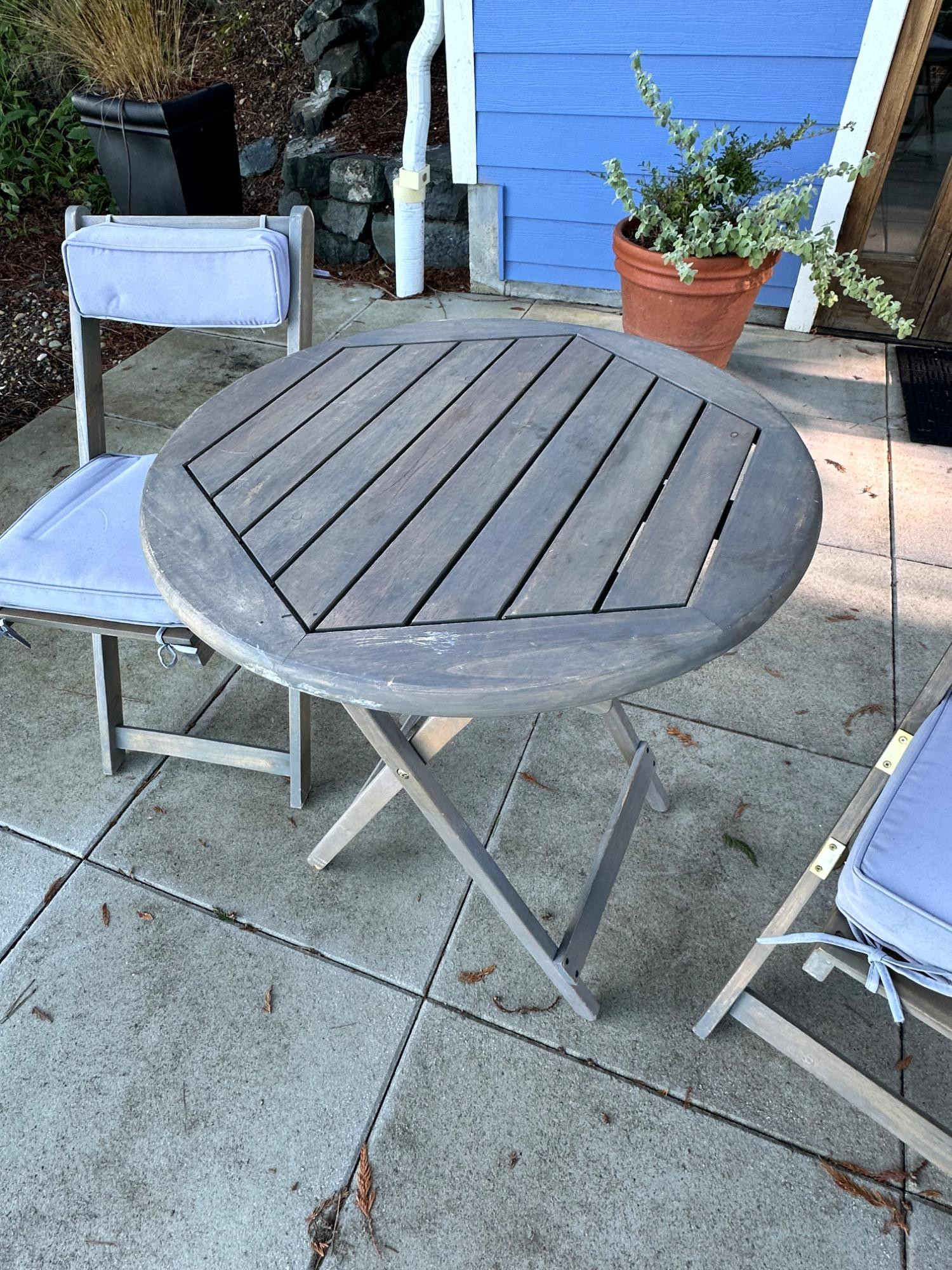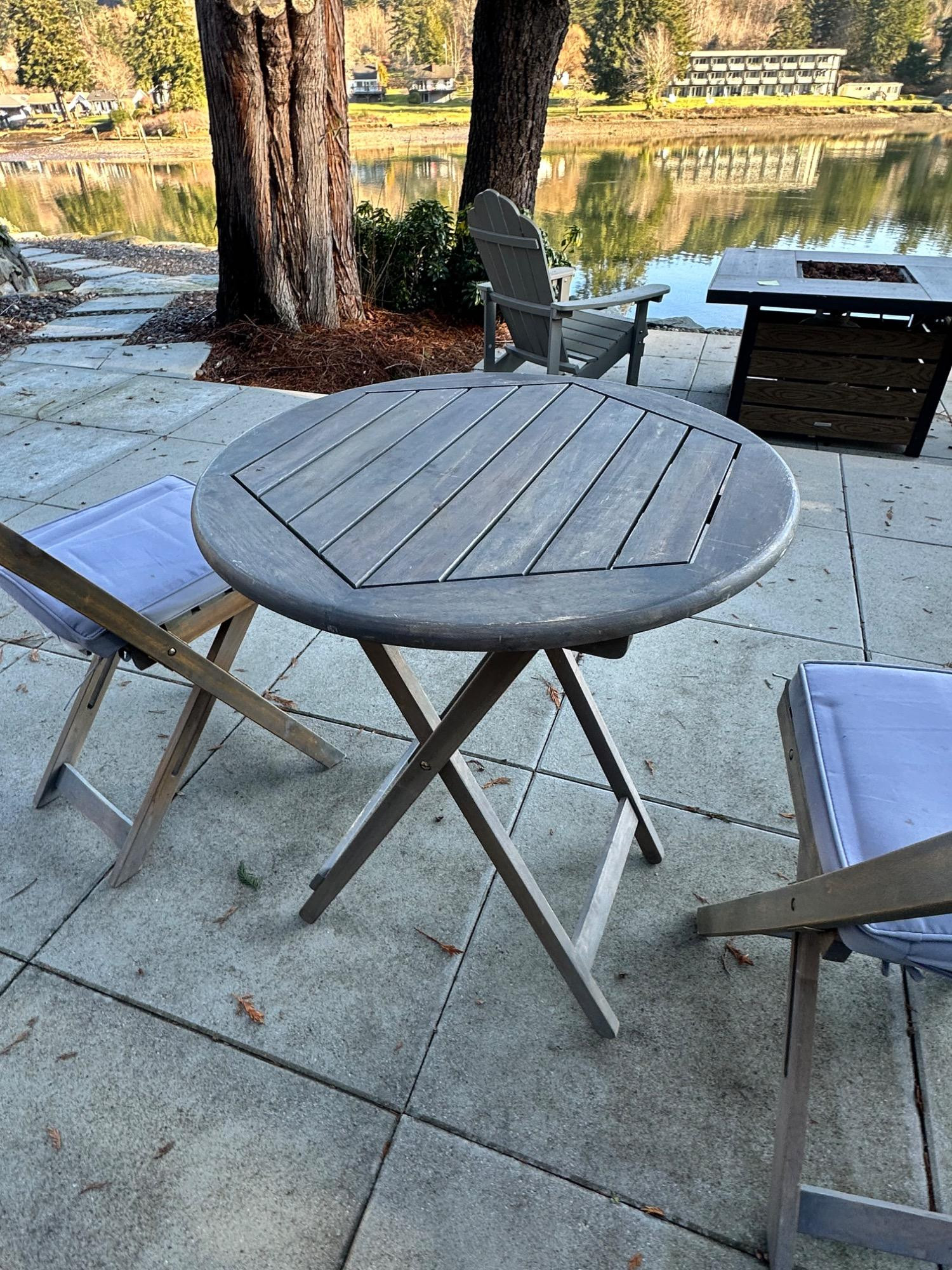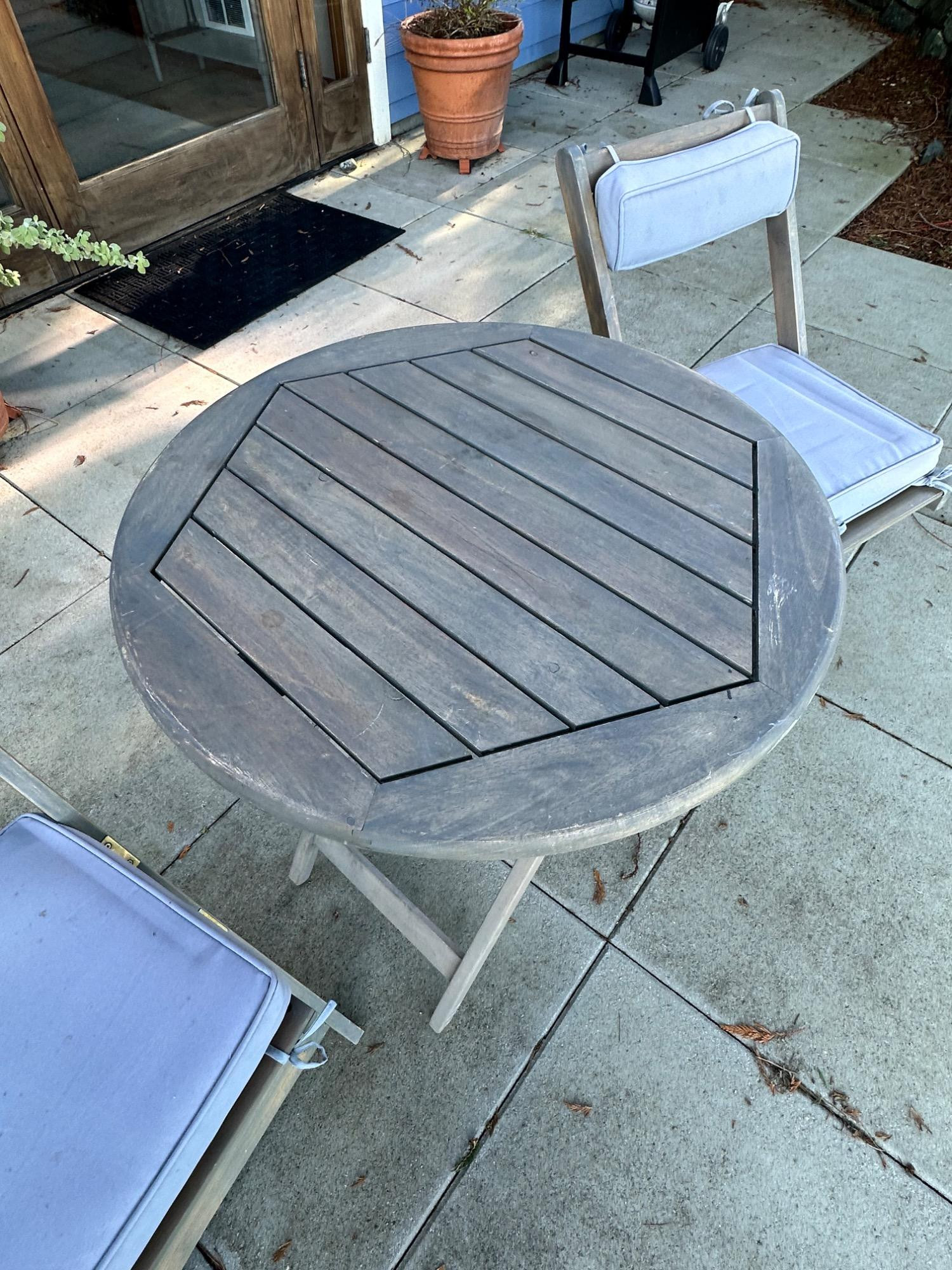 Lot # 83 - Charming Weathered Bistro Set w/ Folding Chairs & Cushions
