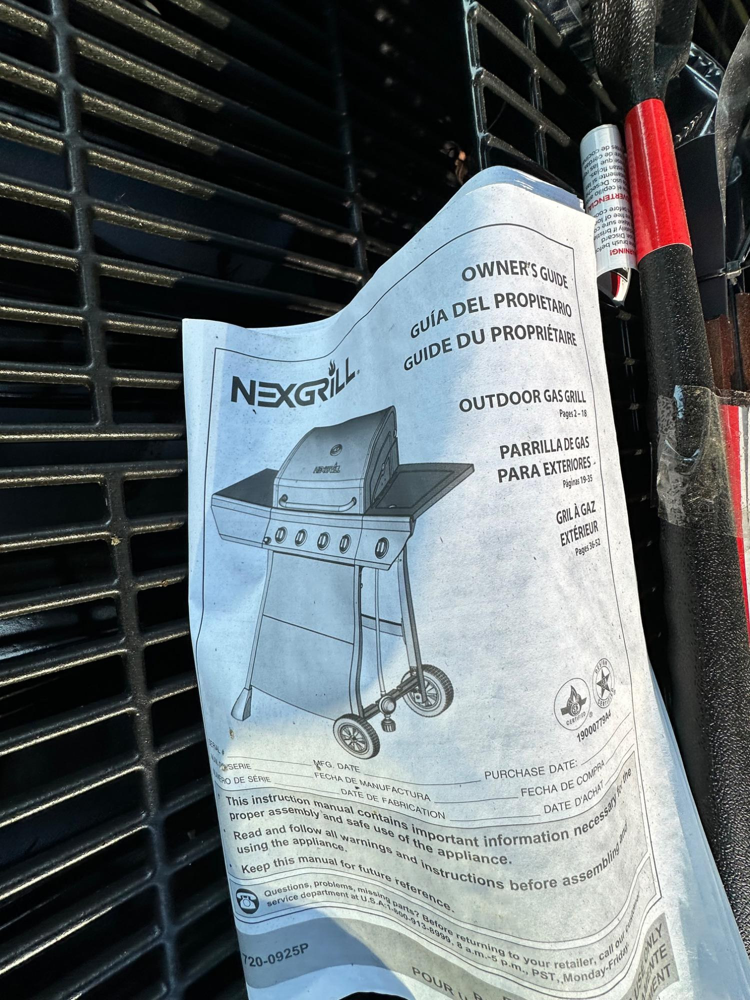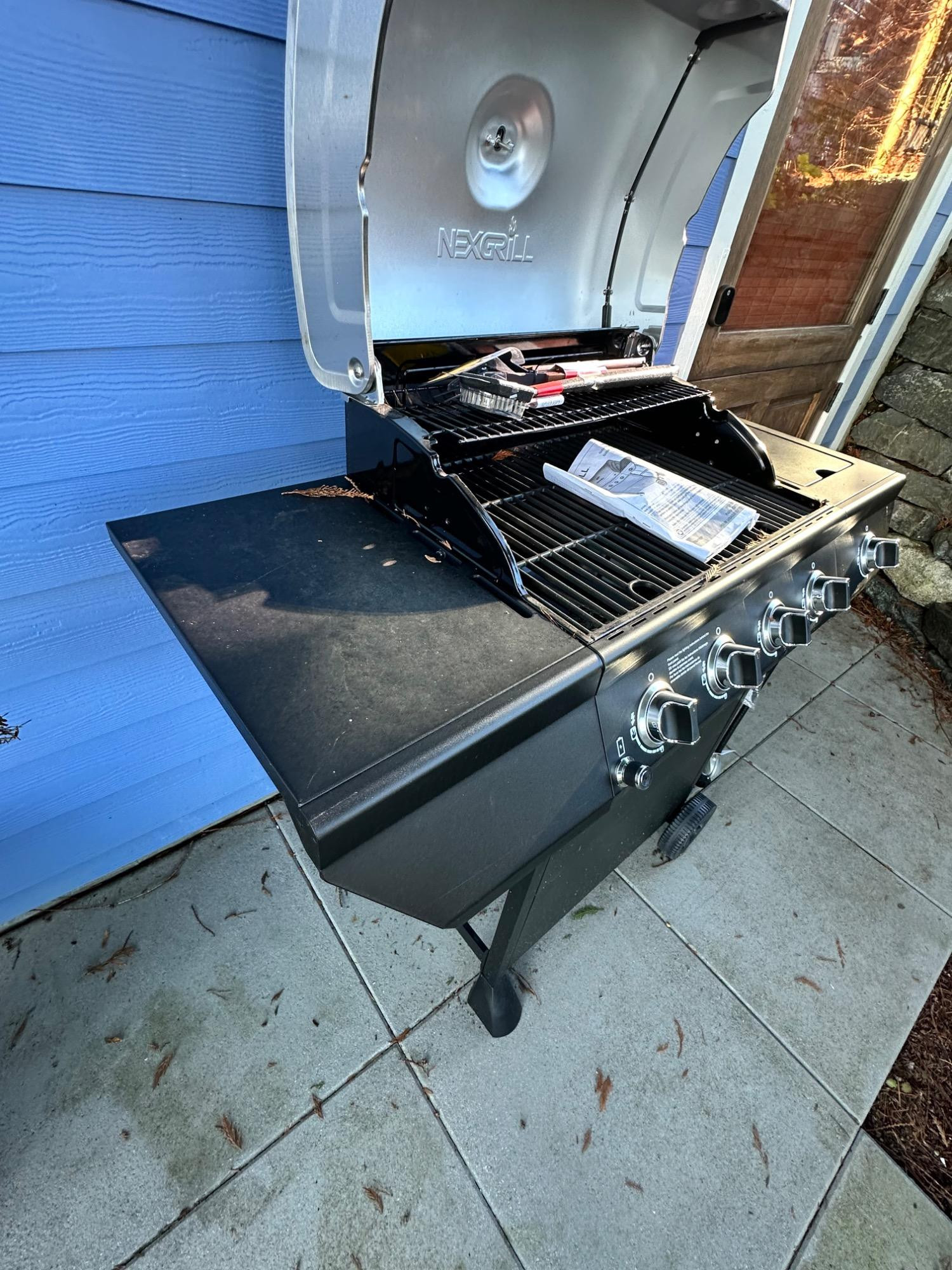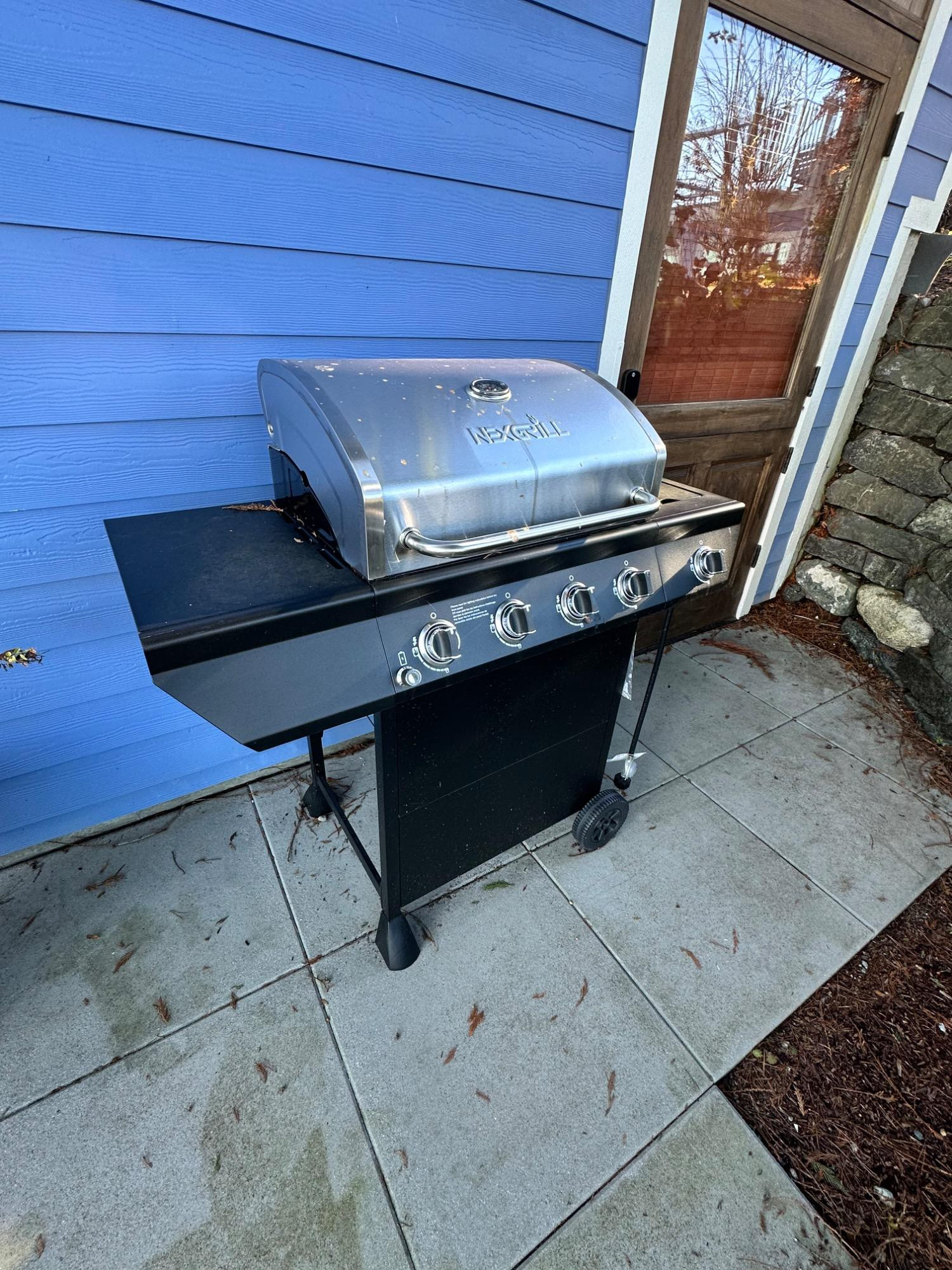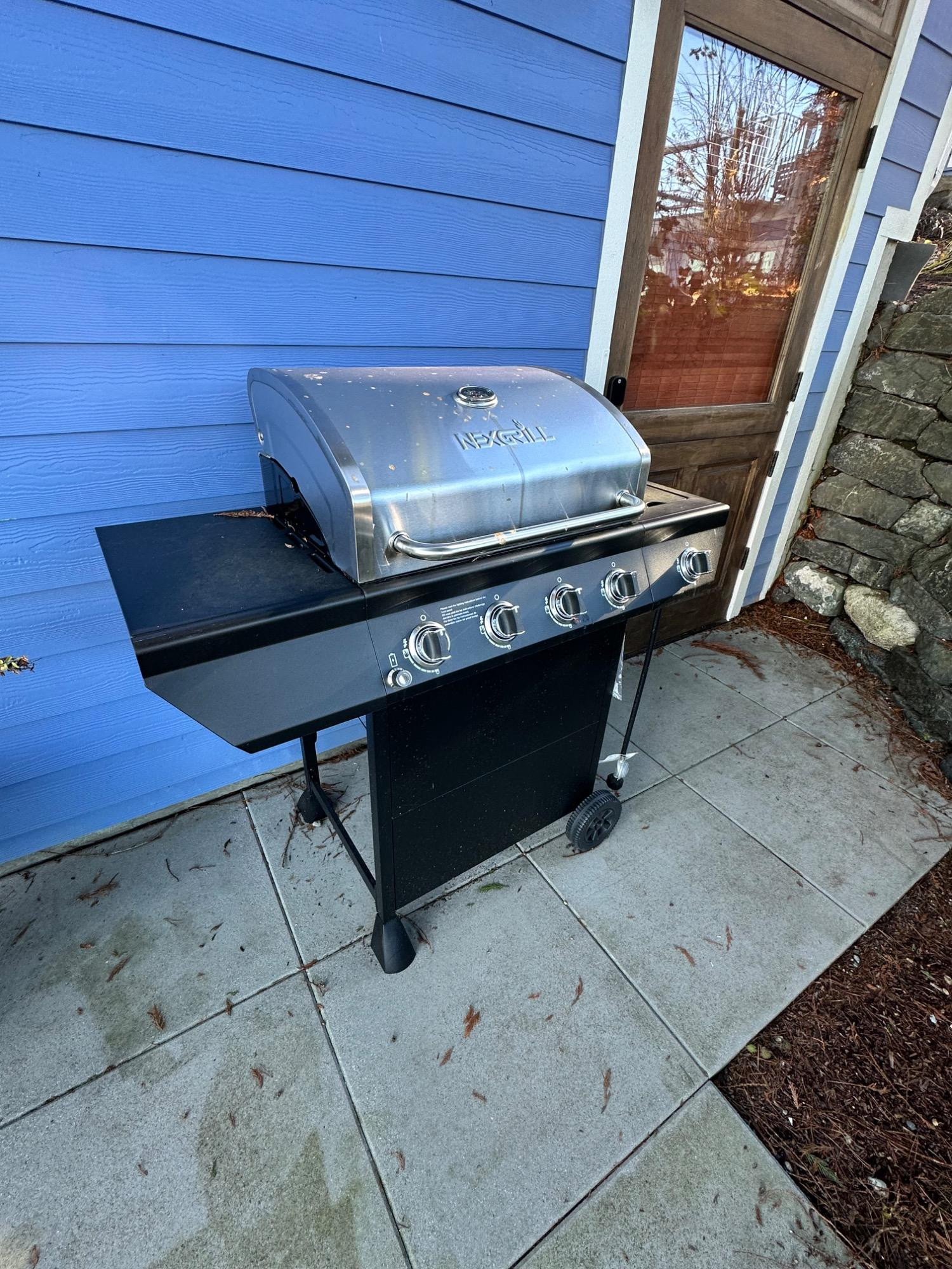 Brand-new Nexgrill 4-burner propane gas grill with a stainless steel lid for enhanced heat circulation. Features a stainless steel side burner for sauces, angled flame tamers to prevent flare-ups, and porcelain cast-iron grids for excellent heat retention and sear marks. Comes with barbecue tools and propane gas. Bidding on this lot is an agreement that: (1.) You will have 2 capable, able-bodied persons to lift and load at a minimum. (2.) You will bring a hand truck and/or any other tools needed to remove this item. If these steps are not followed your item will be forfeited and no refund given.