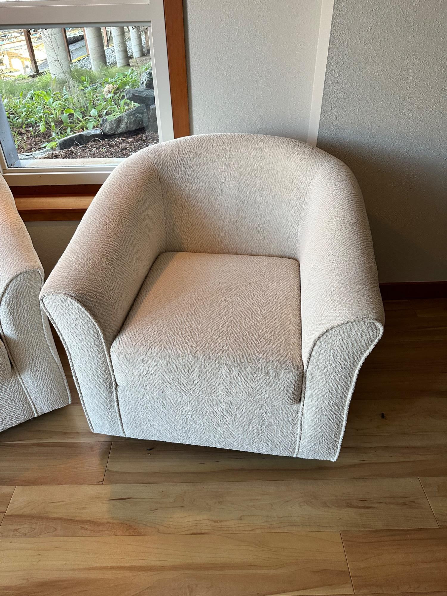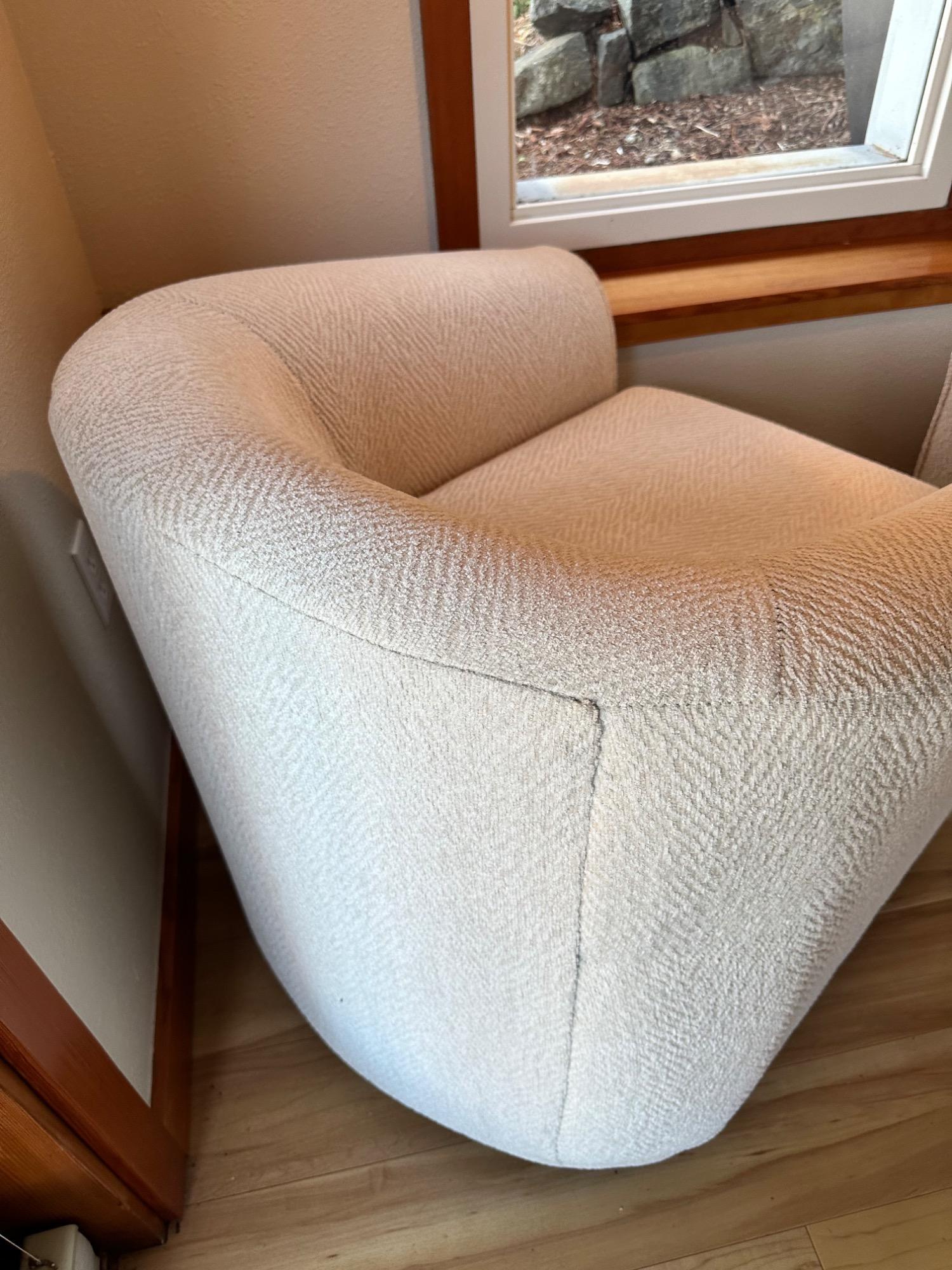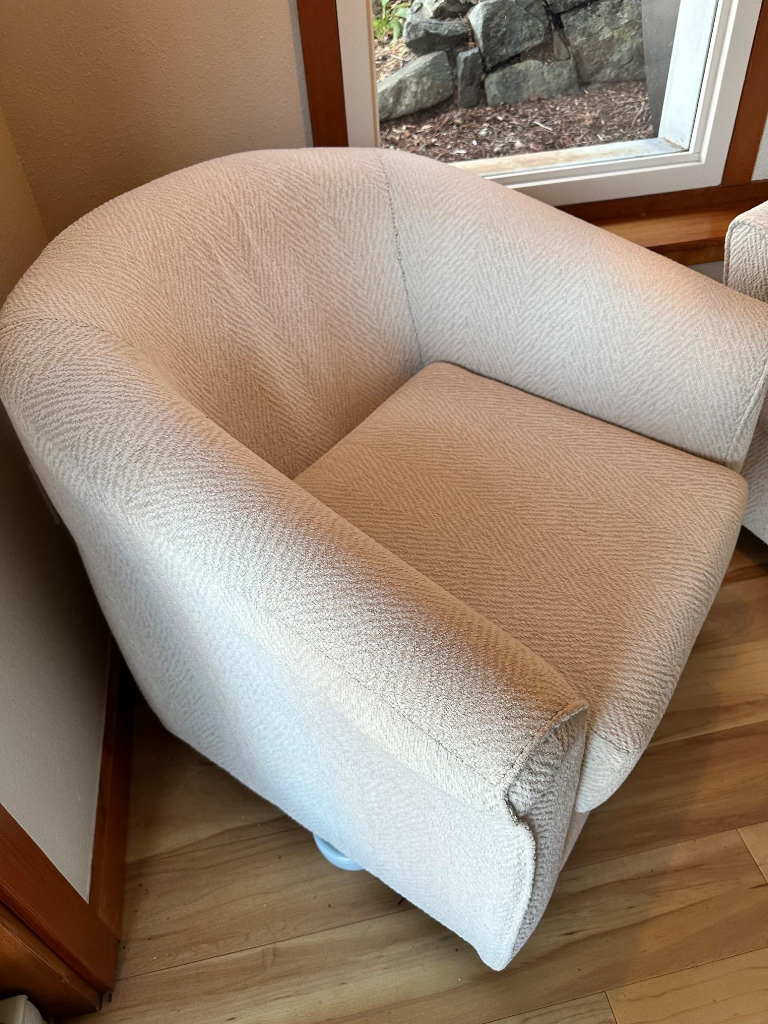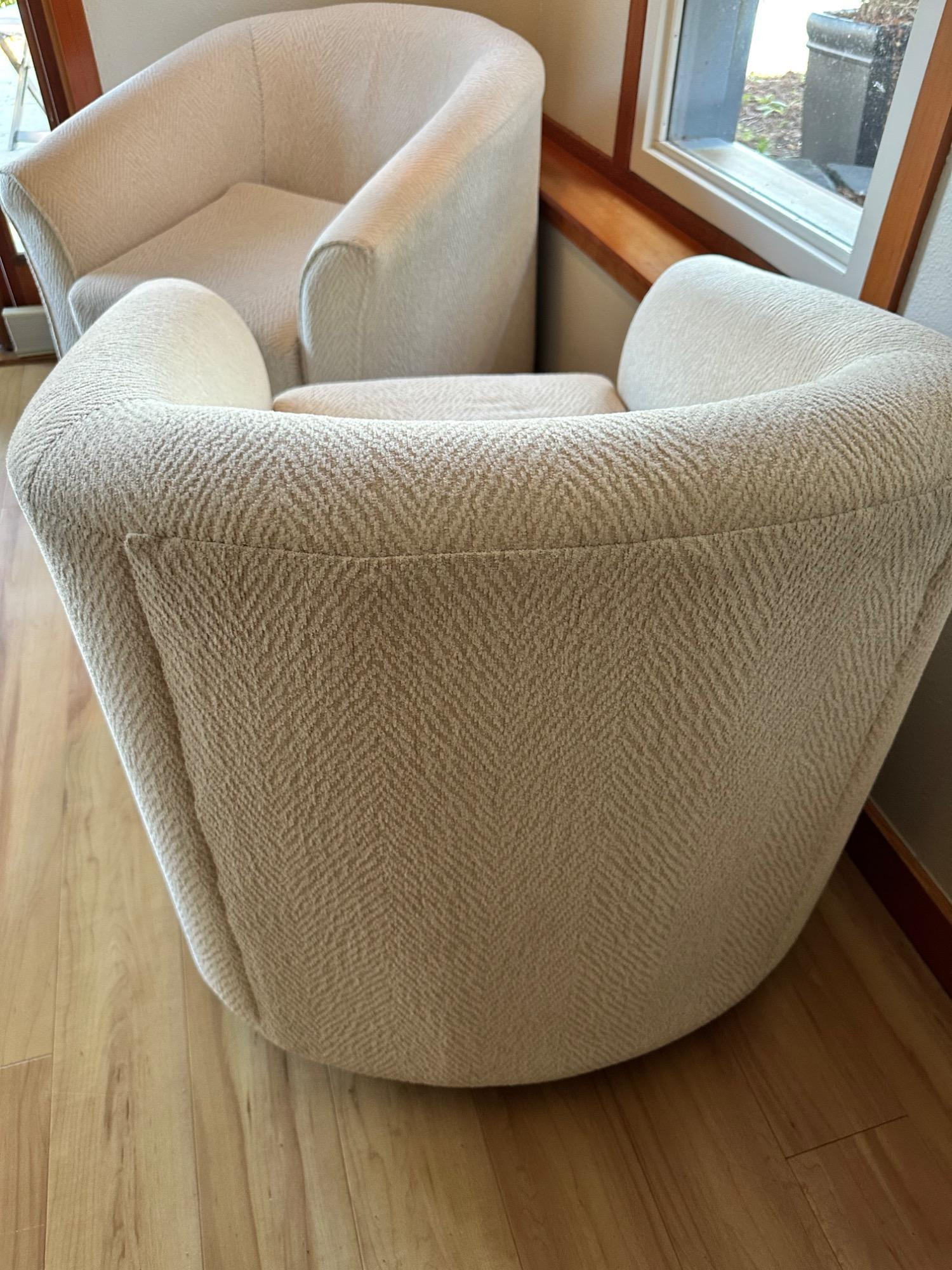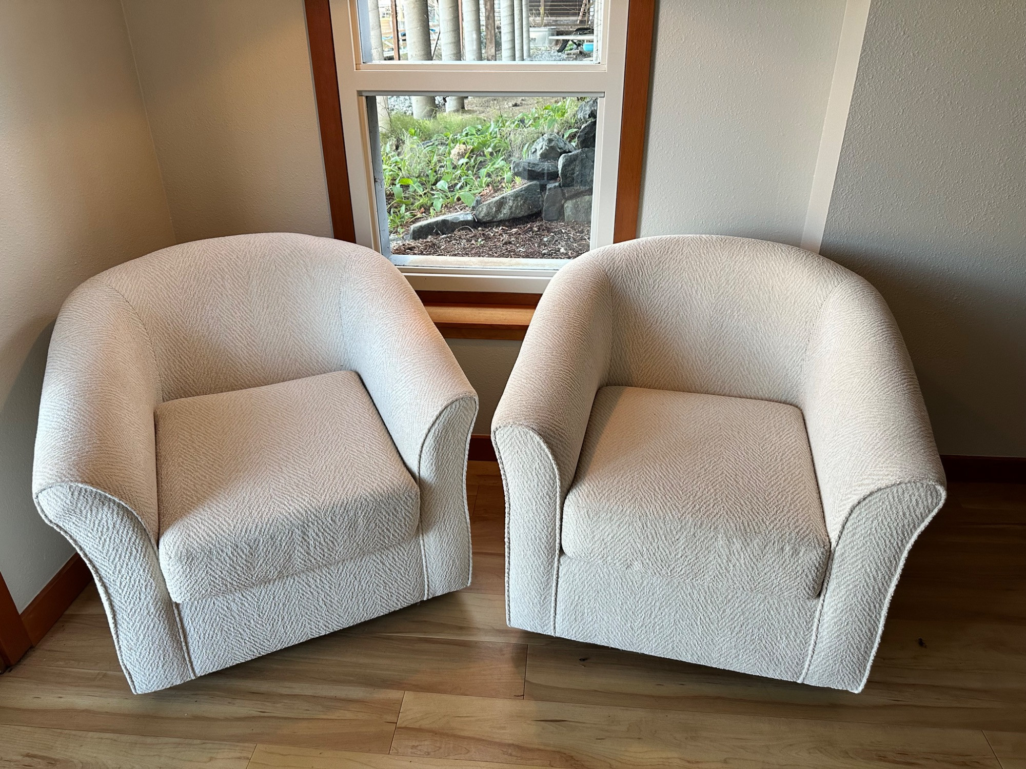 This pair of modern swivel barrel chairs by Nautica Co. features a stylish off-white/beige textured fabric. Both chairs are in excellent condition and measure 31" tall, 34" deep, and 53" wide (arm to arm), with a seat depth of 21" and seat height of 19". Perfect for adding elegance and comfort to any room. Bidding on this lot is an agreement that: (1.) You will have 2 capable, able-bodied persons to lift and load at a minimum. (2.) You will bring a hand truck and/or any other tools needed to remove this item. If these steps are not followed your item will be forfeited and no refund given.
