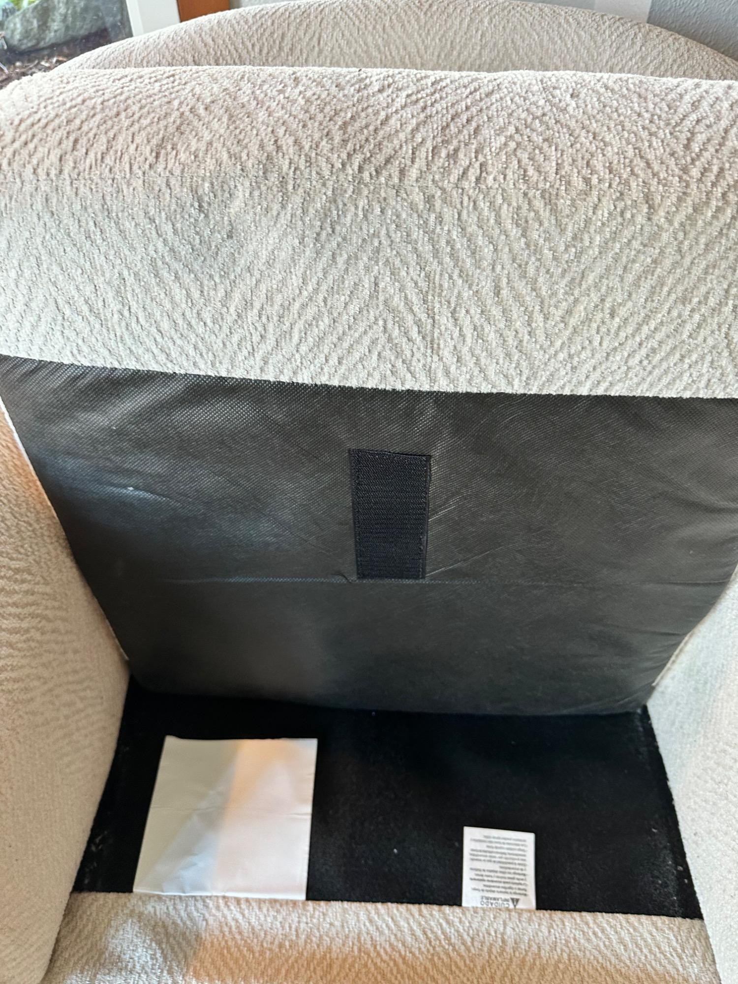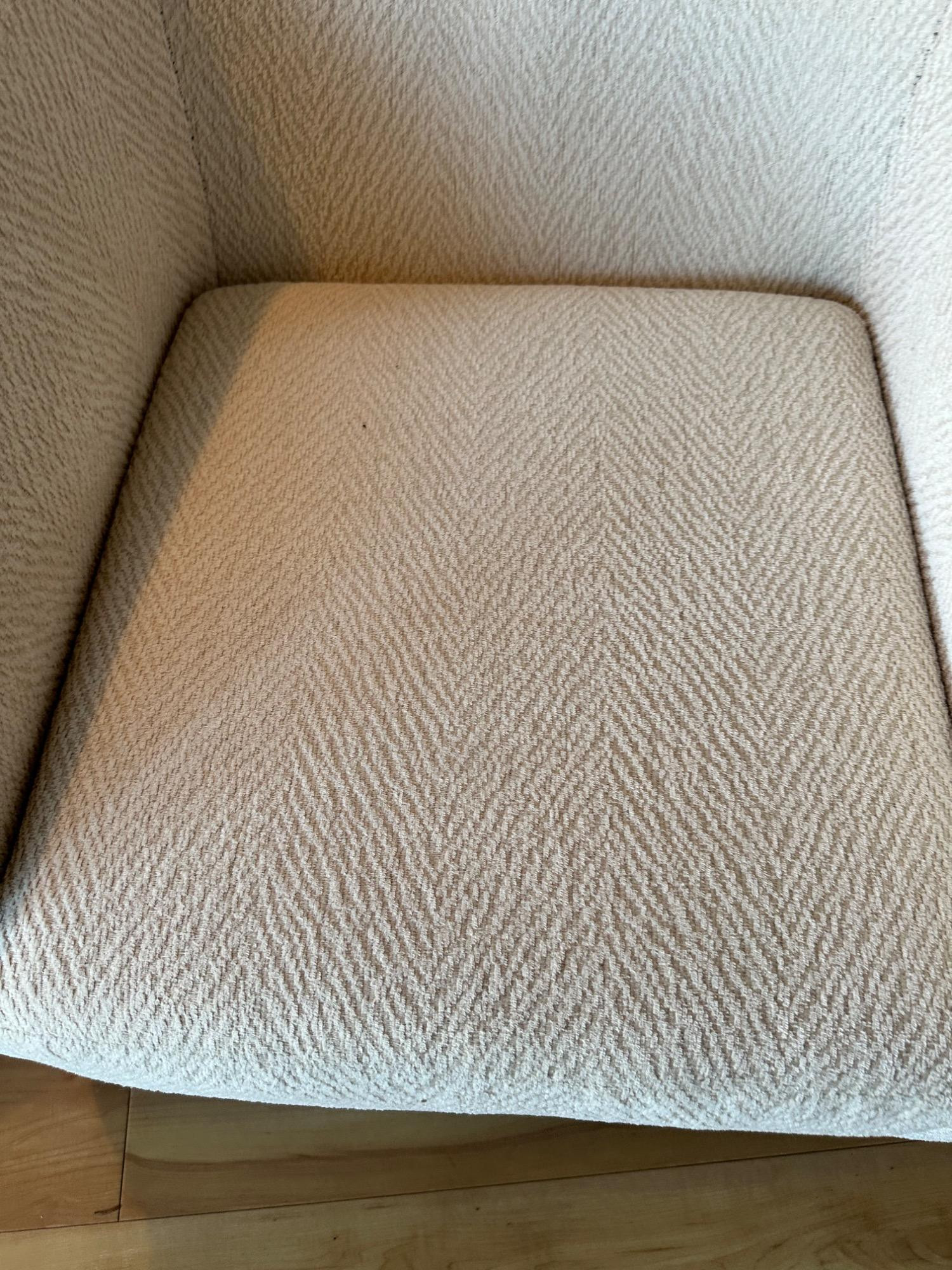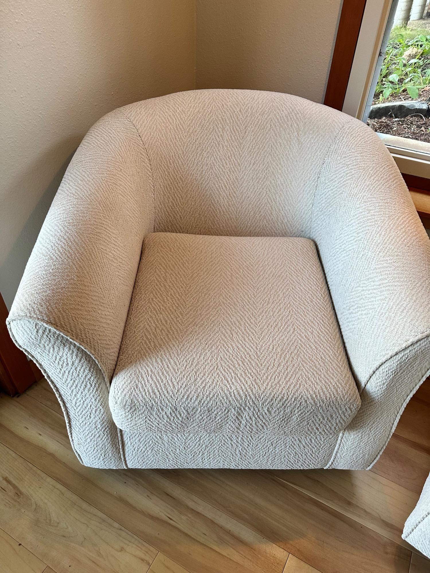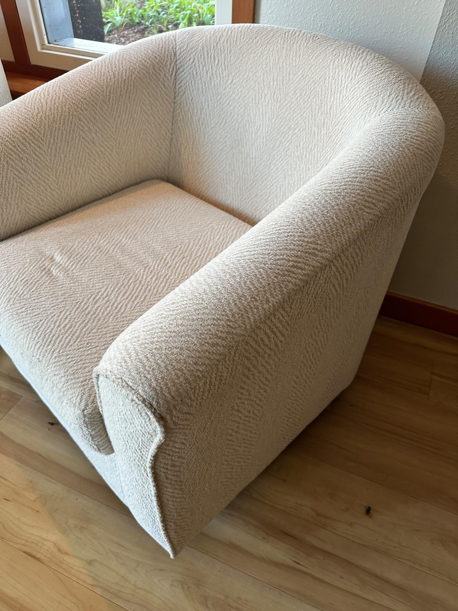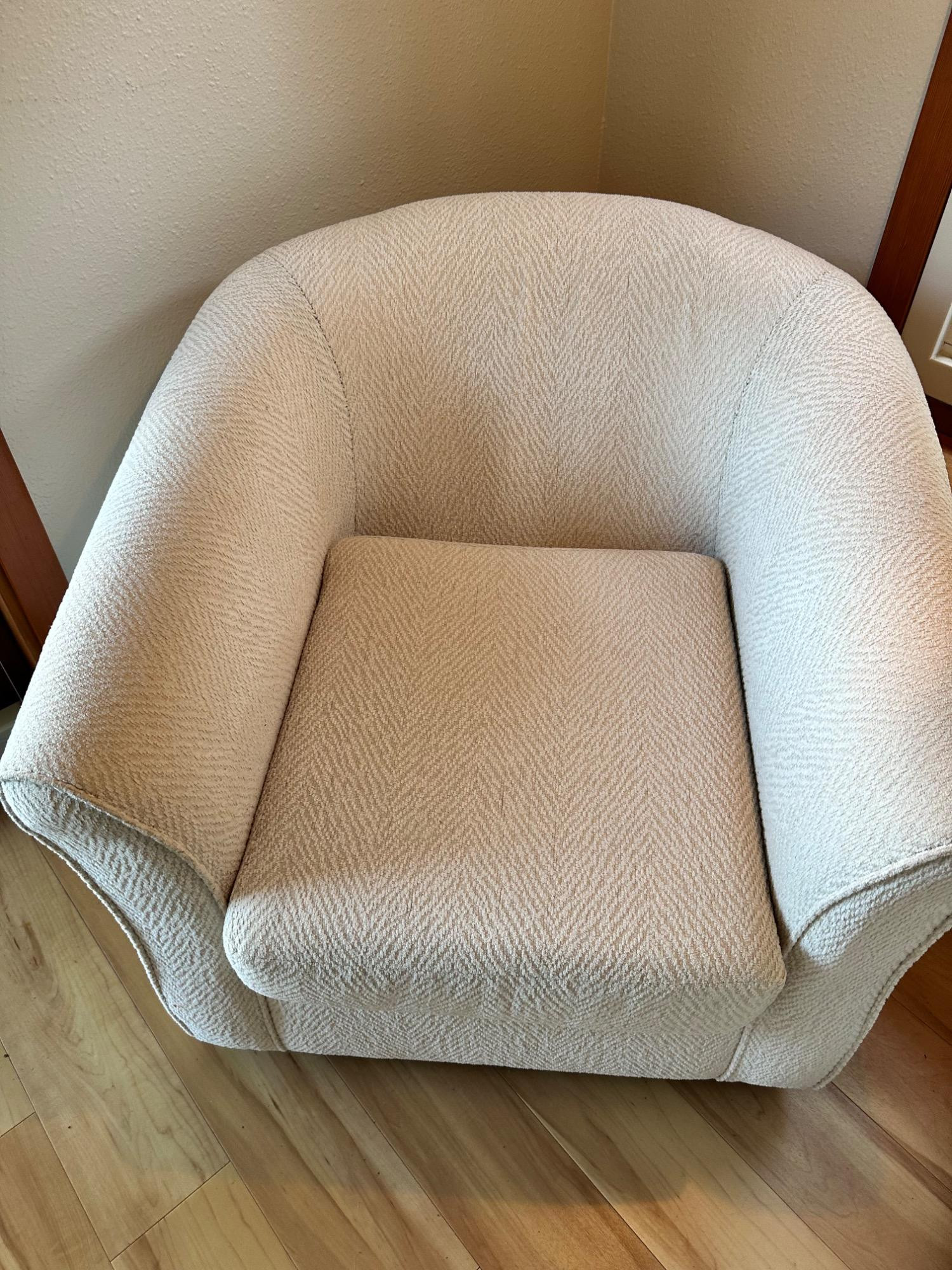 This pair of modern swivel barrel chairs by Nautica Co. features a stylish off-white/beige textured fabric. Both chairs are in excellent condition and measure 31" tall, 34" deep, and 53" wide (arm to arm), with a seat depth of 21" and seat height of 19". Perfect for adding elegance and comfort to any room. Bidding on this lot is an agreement that: (1.) You will have 2 capable, able-bodied persons to lift and load at a minimum. (2.) You will bring a hand truck and/or any other tools needed to remove this item. If these steps are not followed your item will be forfeited and no refund given.