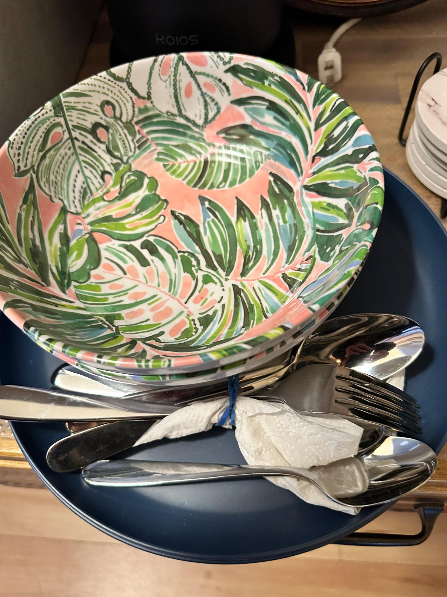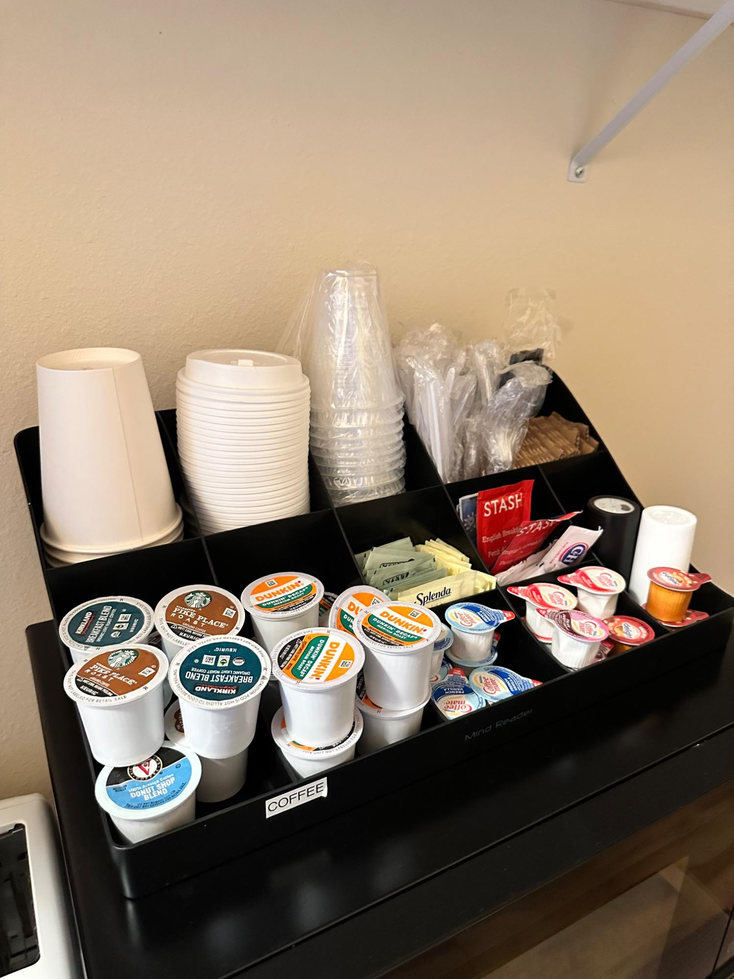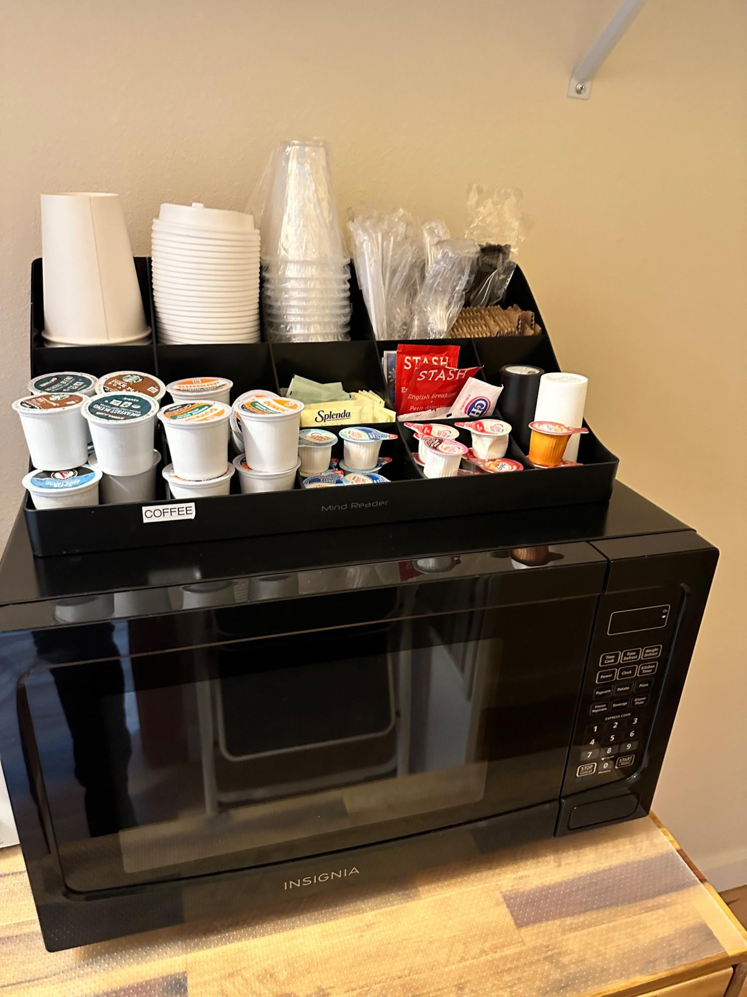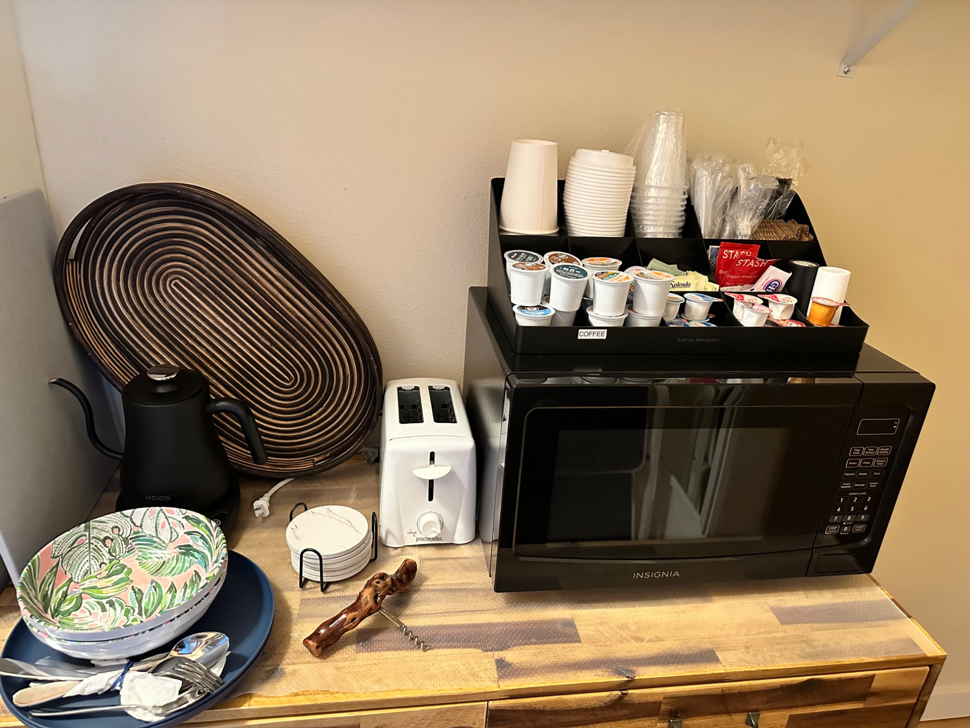 This convenient kitchen essentials lot includes an INSIGNIA Countertop Microwave (12" H x 20" W x 14" D), a KOIOS Electric Gooseneck Kettle, and a PROCTOR SILEX 2-Slice Cool-Wall Toaster, along with a coffee caddy organizer, a decorative wooden tray, a wine opener, and vibrant dishware. A perfect package for your home, apartment, or VRBO setup!