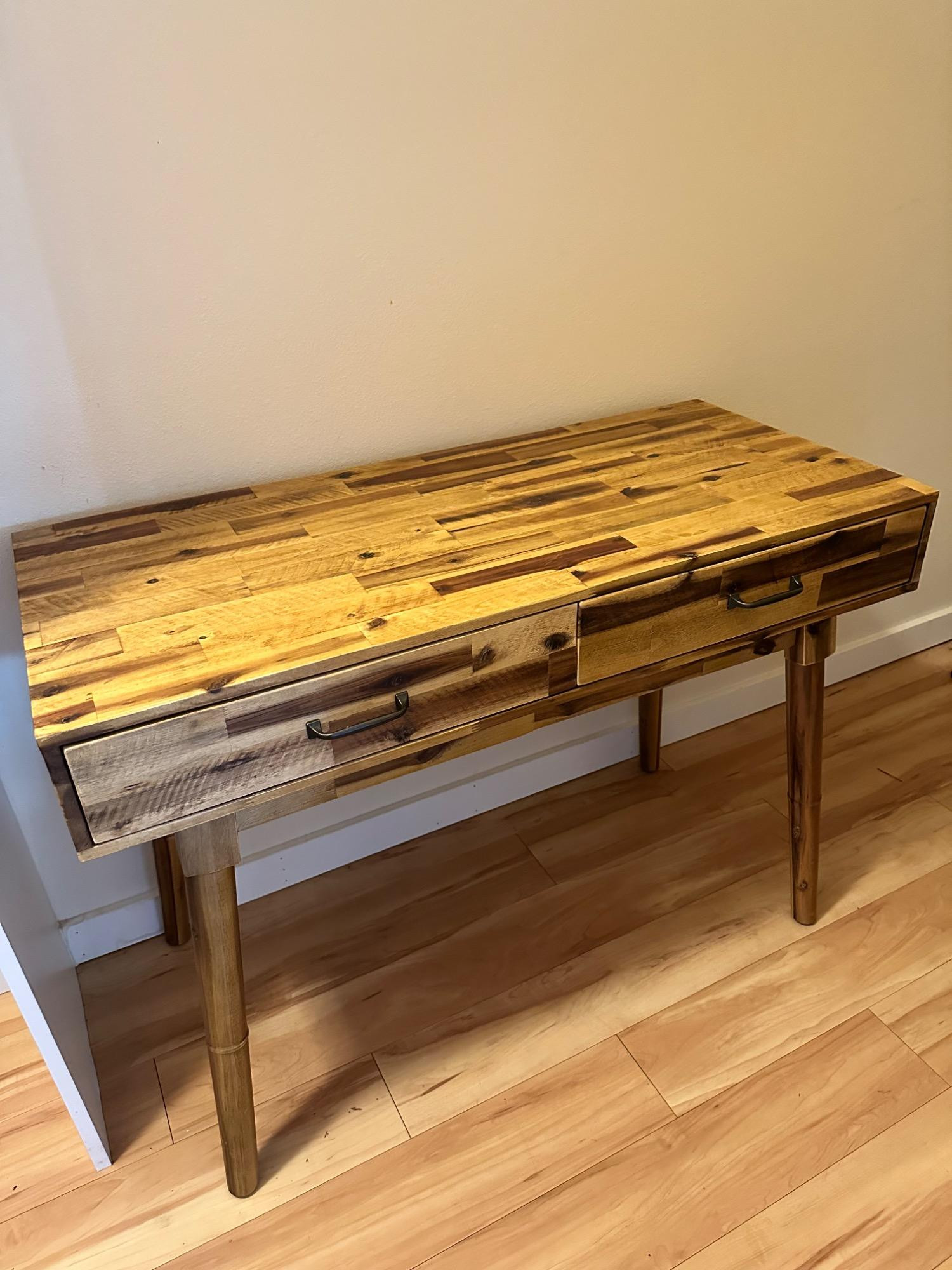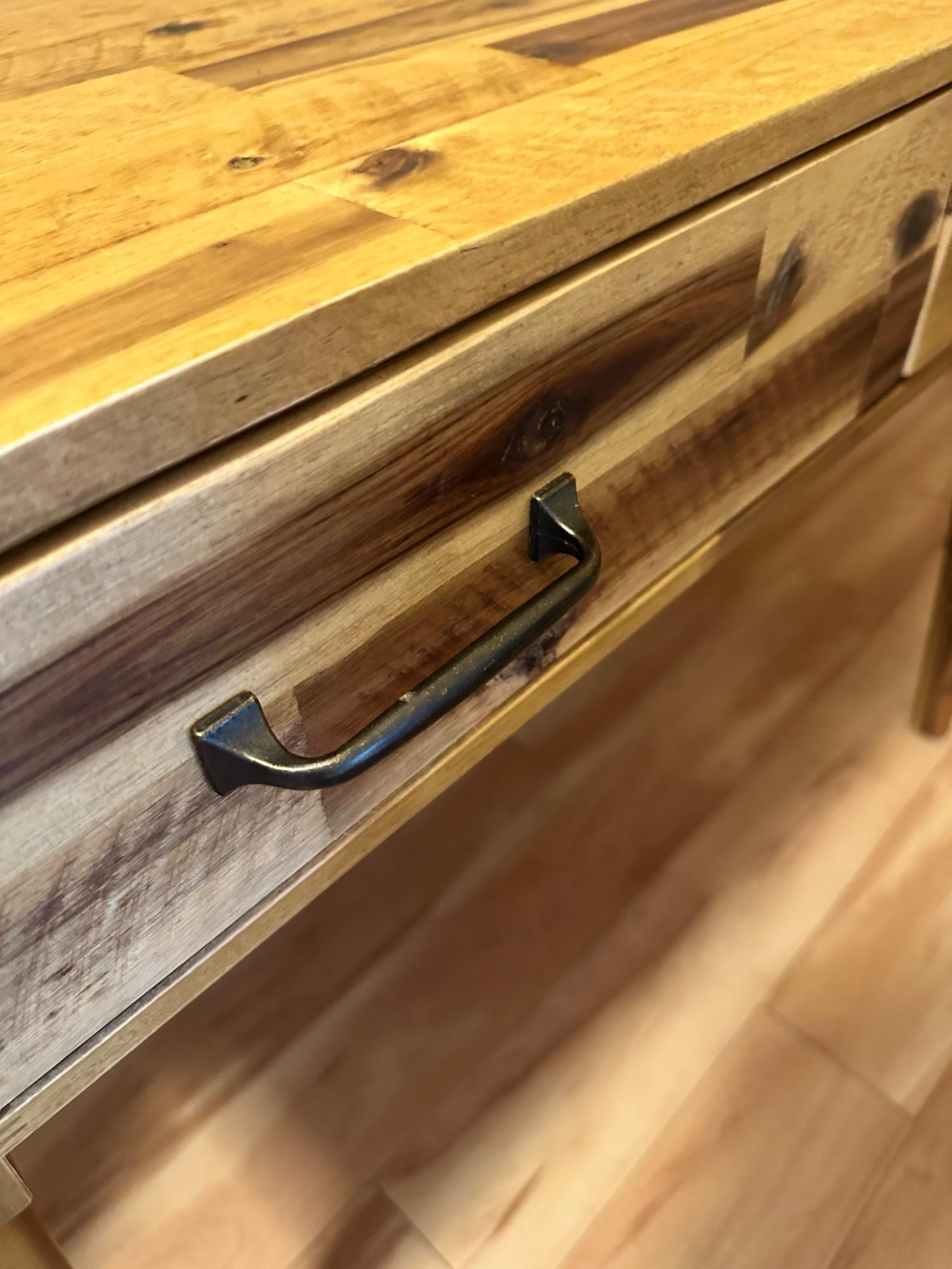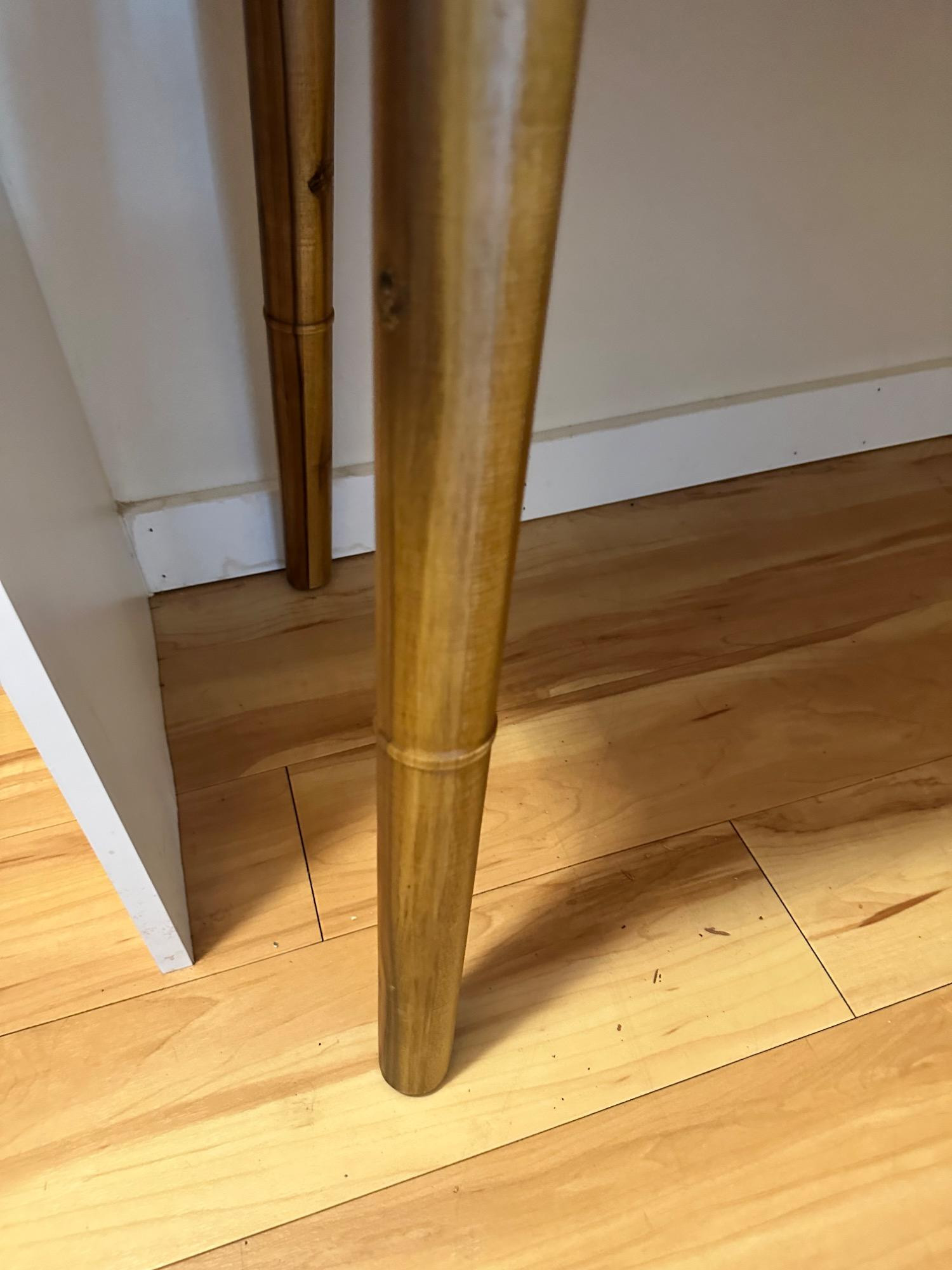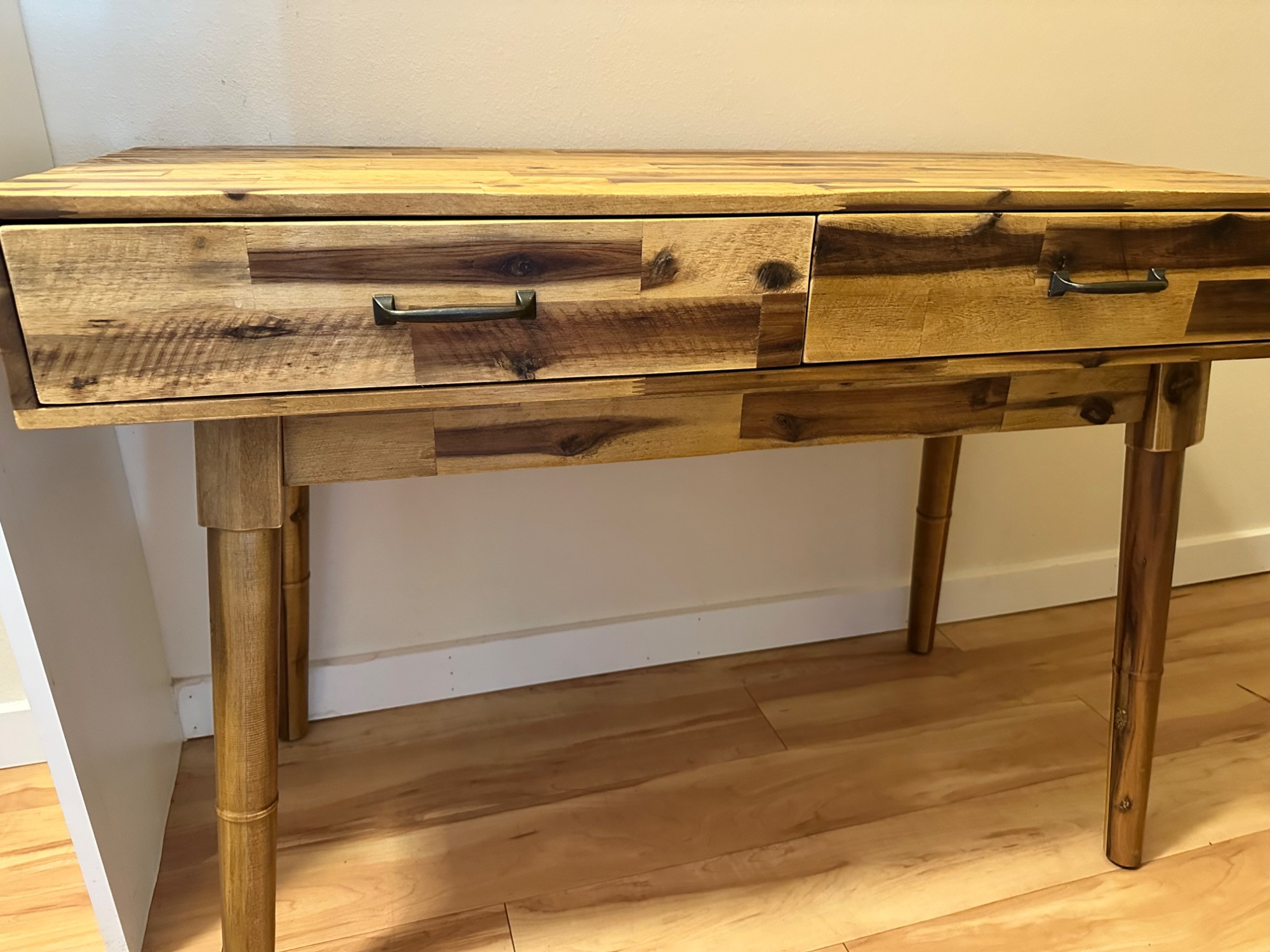 This beautiful mid-century style table features a natural wood plank look and legs with a bamboo-like aesthetic. Ideal as an entry table or desk, it complements a variety of interiors. Appears to be a newer piece with no visible manufacturer details. Measures 31" Tall x 44" W x 20" D. Perfect for adding a touch of style to any space. Bidding on this lot is an agreement that: (1.) You will have 2 capable, able-bodied persons to lift and load at a minimum. (2.) You will bring a hand truck and/or any other tools needed to remove this item. If these steps are not followed your item will be forfeited and no refund given.