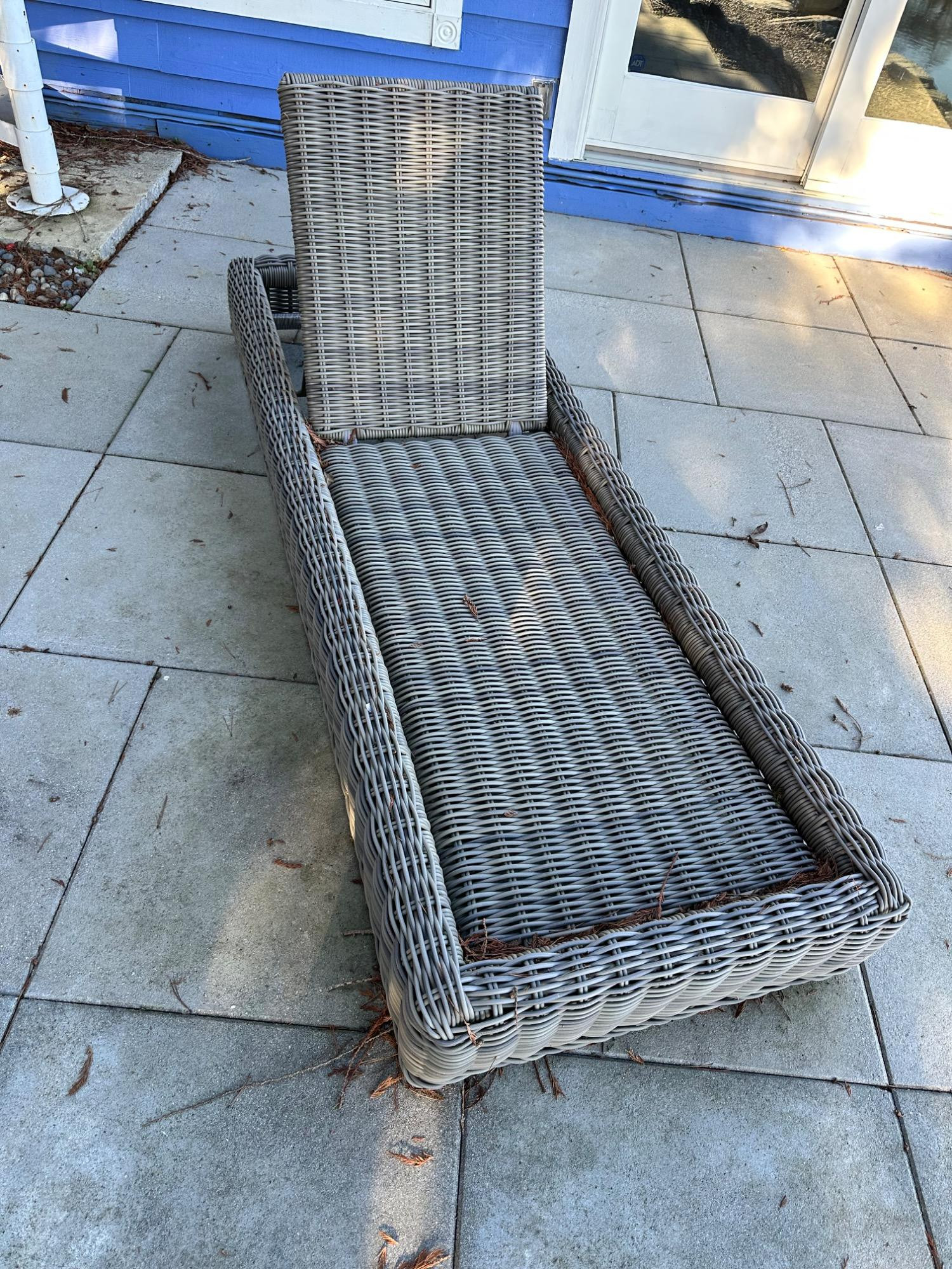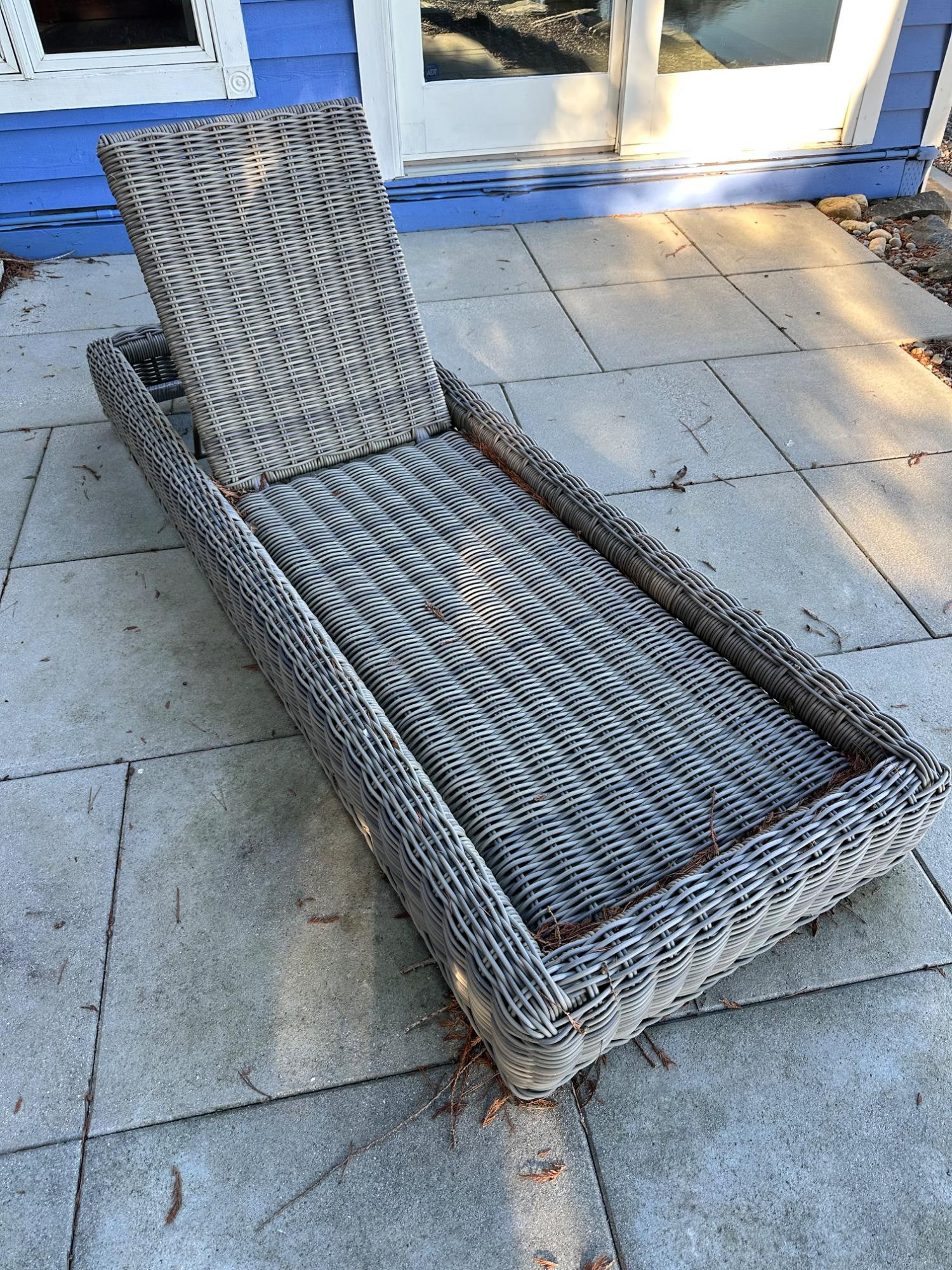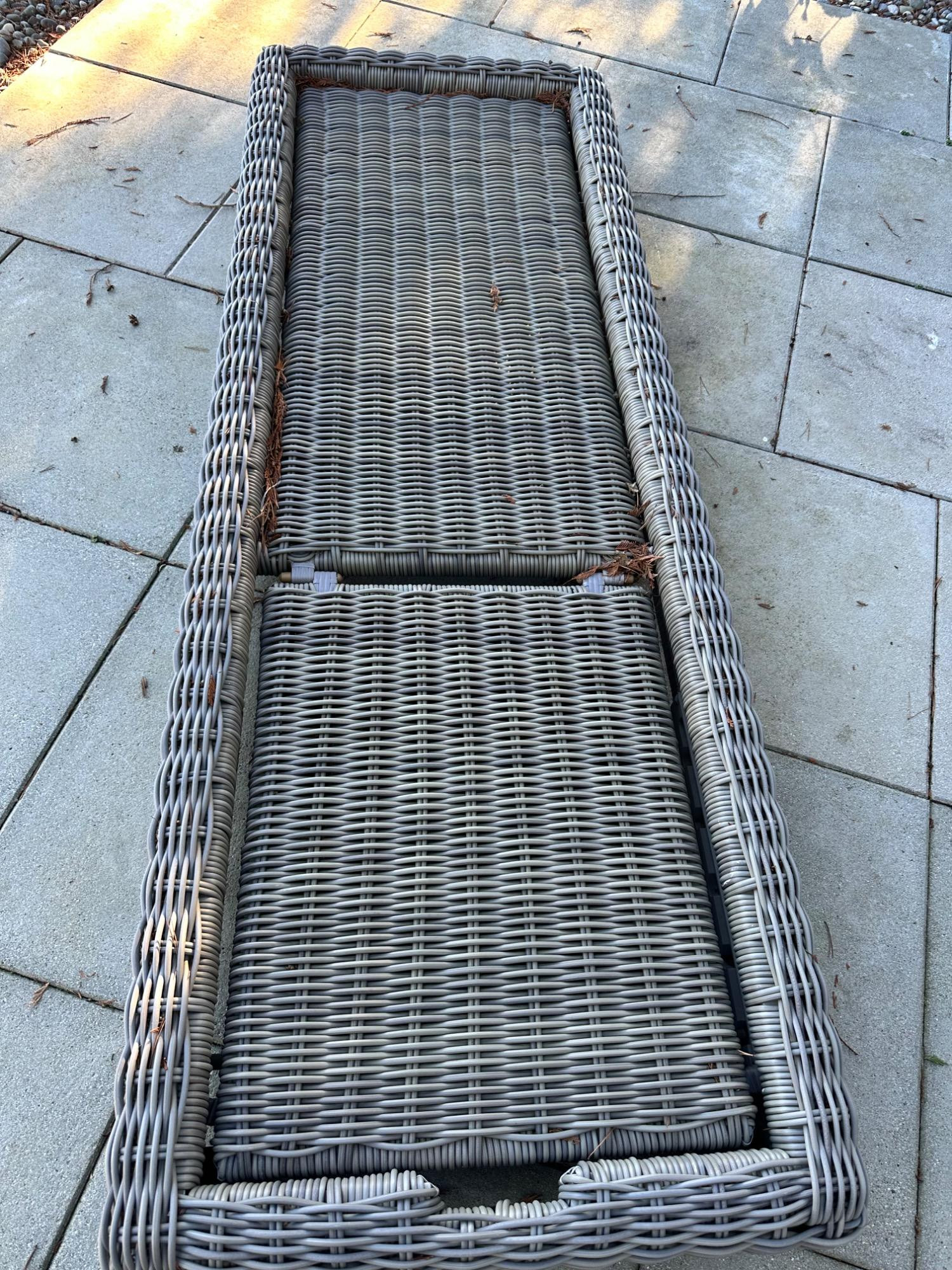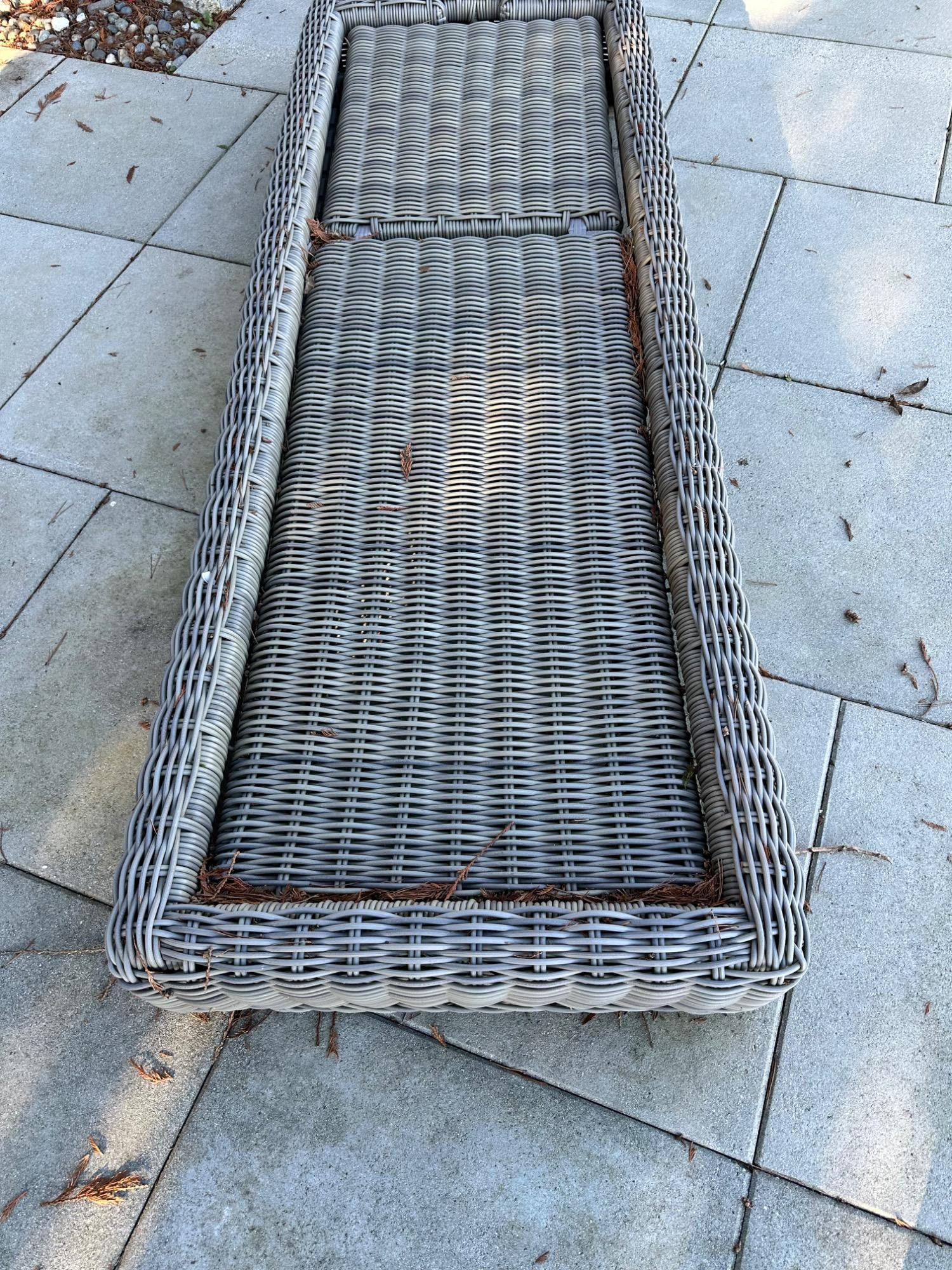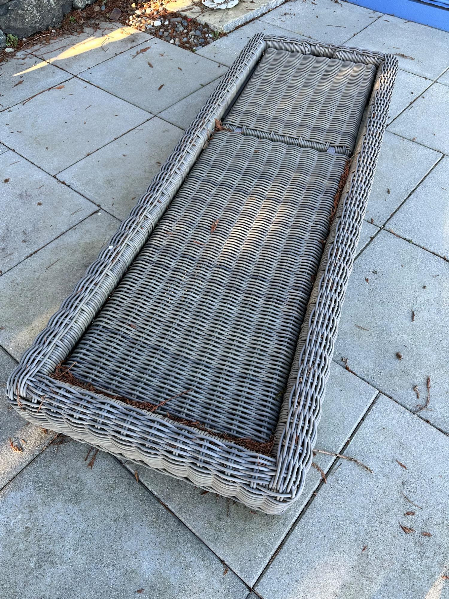 This stunning chaise from Restoration Hardware's Provence Luxe collection features durable wicker resin construction. Comes with a cushion (requires cleaning) for added comfort. Perfect for outdoor relaxation, it combines style and functionality. Measures 79" L x 27" W x 9" T. Bidding on this lot is an agreement that: (1.) You will have 2 capable, able-bodied persons to lift and load at a minimum. (2.) You will bring a hand truck and/or any other tools needed to remove this item. If these steps are not followed your item will be forfeited and no refund given.