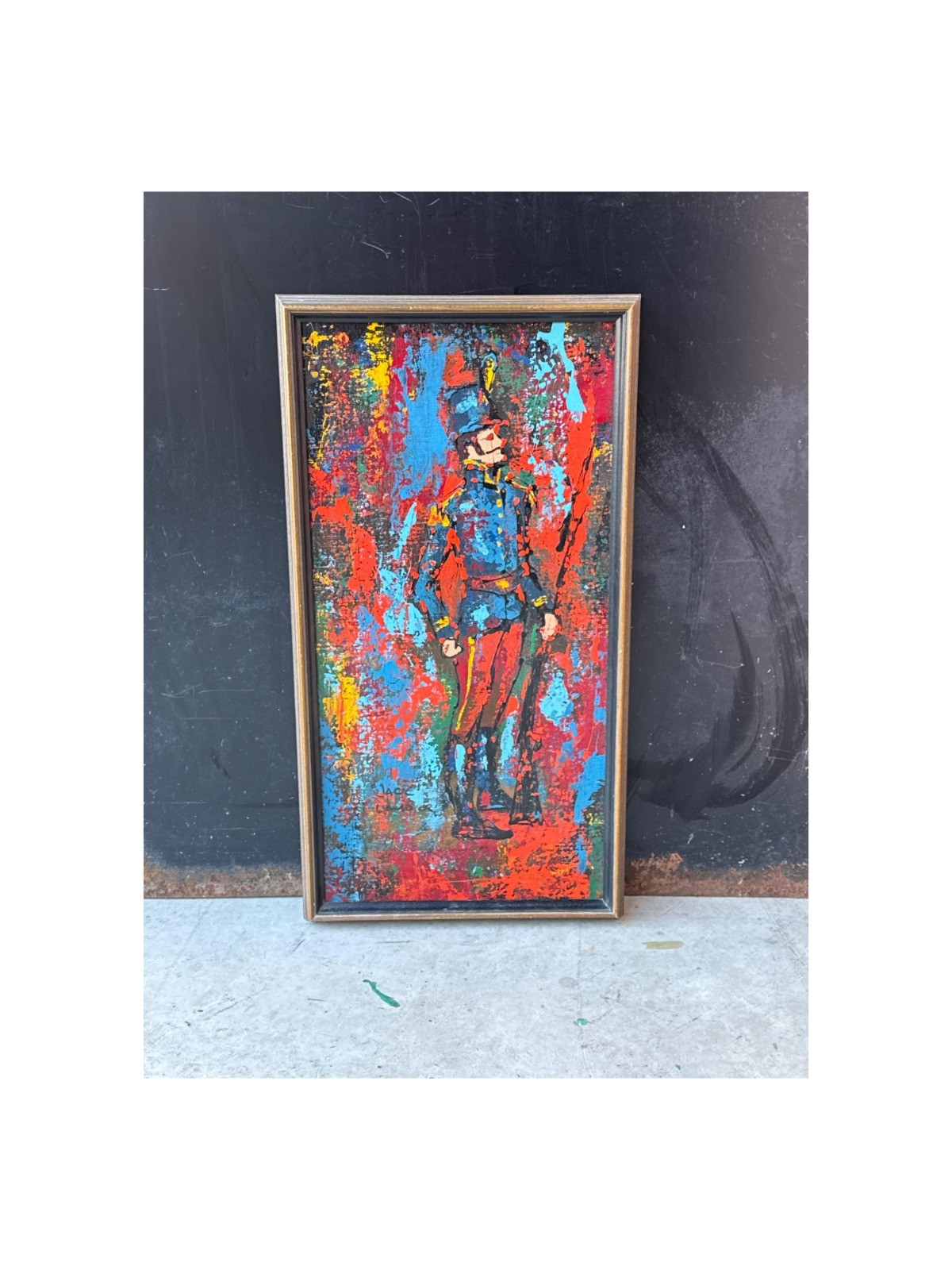 1960’s Abstract Oil Painting- Jack Lauder Bright and full of color! Painted canvas in vintage wood frame. Subject- Soldier with rifle -Signed Jack Lauder