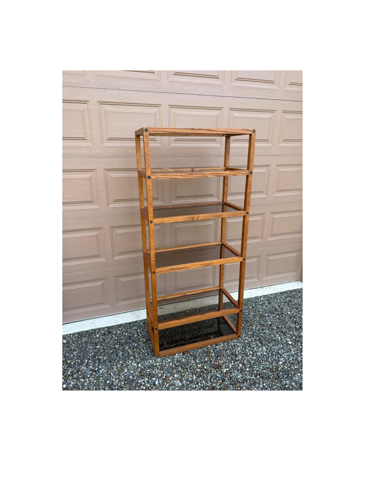 Mid Century Oak Etagere/Bookshelf with Smoked Glass Shelves Possibly from the 1960's. Wooden dowels to hold each glass shelf into place. Great vintage condition *glass shelves are removable- care when packing! Bidding on this lot is an agreement that: (1.) You will have at least 2 capable, able bodied persons to lift and load at a minimum. (2.) You will bring a hand truck and/or any other tools needed to remove this item. If these steps are not followed your item will be forfeit and no refund given.