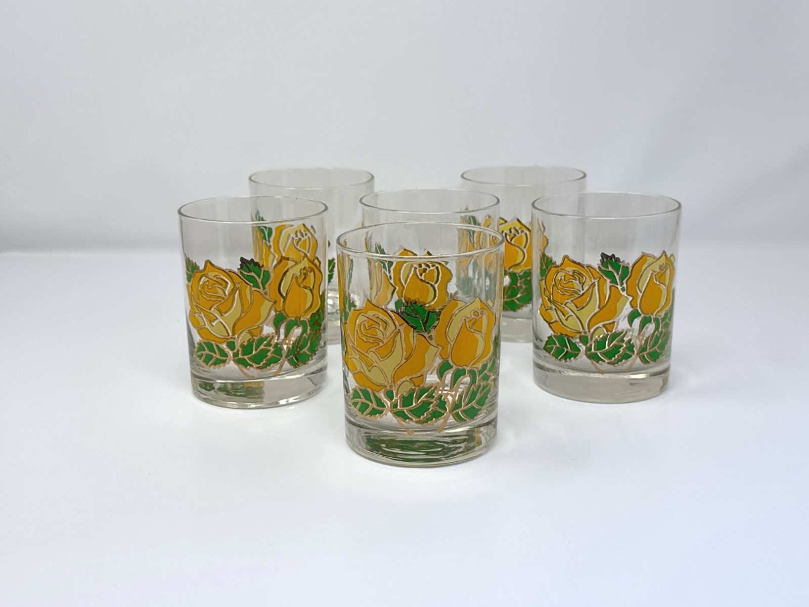 MCM Yellow Rose Couroc Lowball Glasses- set 6. Yellow floral with 22K highlights. slight wear typical with age