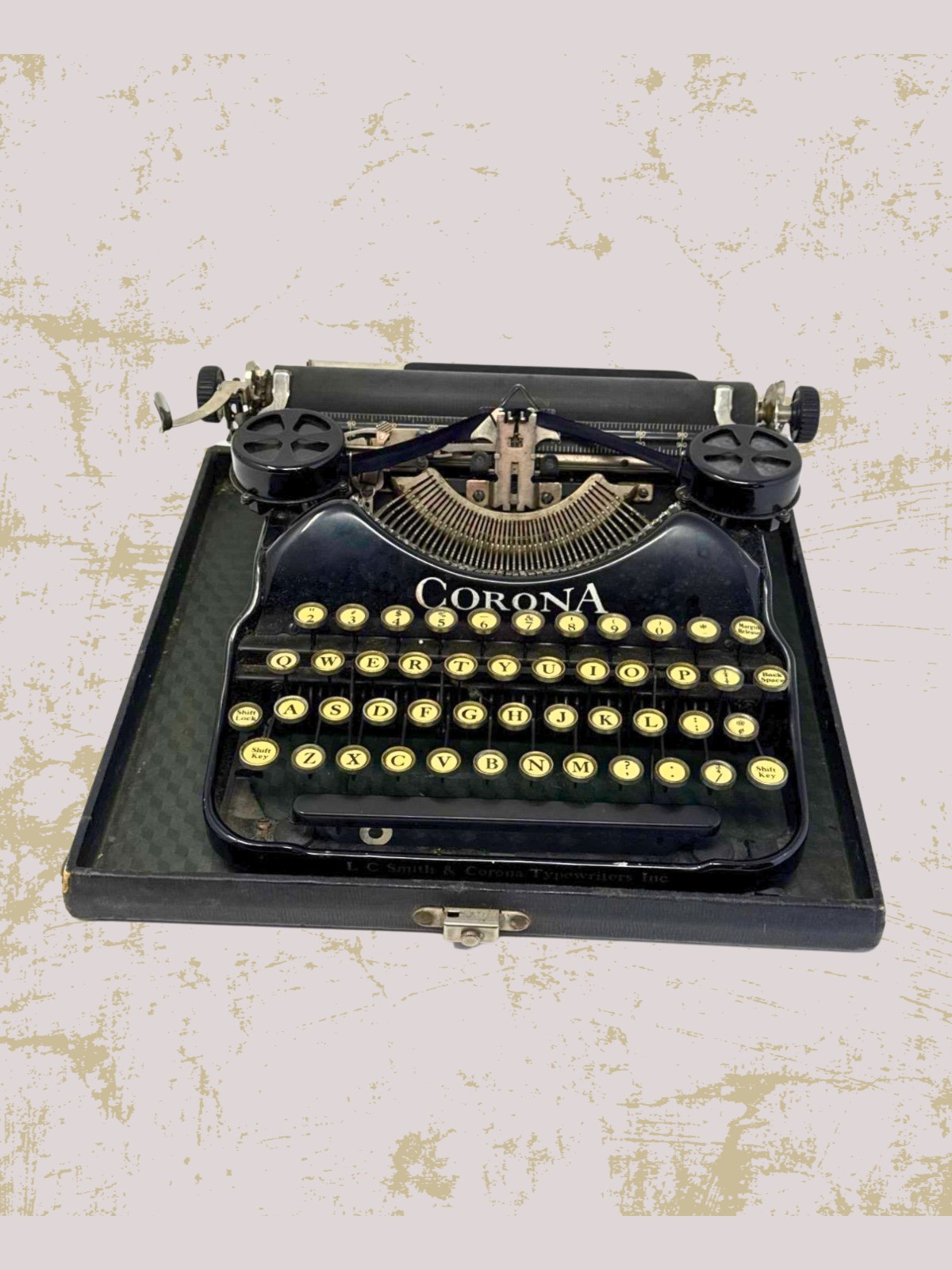 This Corona Four model typewriter was manufactured by the Corona Typewriter Company Incorporated of Groton, New York around 1924. The Corona Four had a smaller frame to allow portability. The Corona Four had 42 full size keys, a 10-inch carriage, a 2-color ribbon, and an accelerating type bar action.