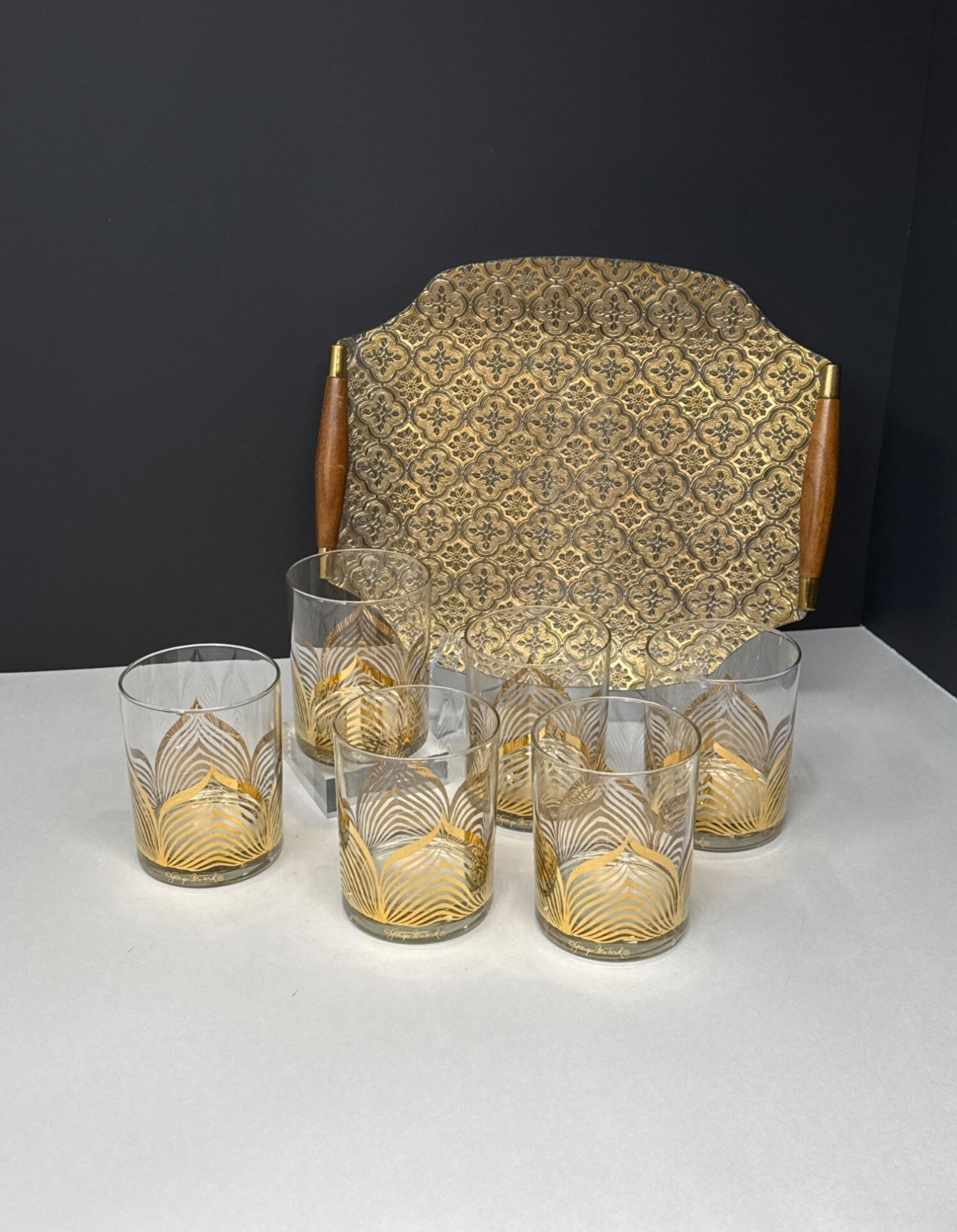 Lot # 107 - Retro Georges Briard Tray & 22K Gold "Feather" Glasses- set 6