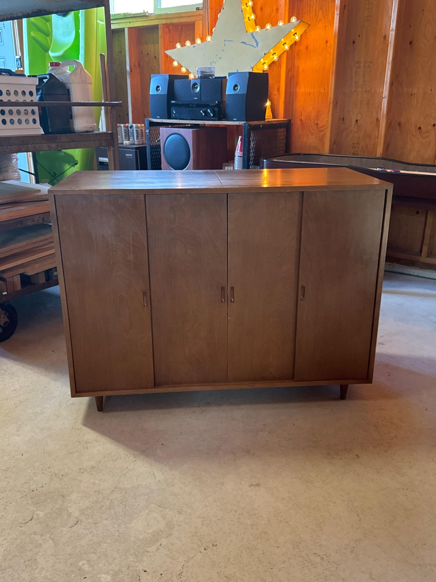 MCM Vintage Record Cabinet *came out of a former theater! Bidding on this lot is an agreement that: (1.) You will have at least 2 capable, able bodied persons to lift and load at a minimum. (2.) You will bring a hand truck and/or any other tools needed to remove this item. If these steps are not followed your item will be forfeit and no refund given.