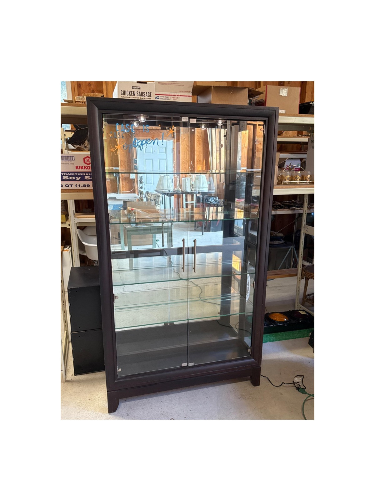 Lighted Glass Display Case w/Glass Shelves *Shelves have indent for plates Glass shelves are removable- Bidding on this lot is an agreement that: (1.) You will have at least 2 capable, able bodied persons to lift and load at a minimum. (2.) You will bring a hand truck and/or any other tools needed to remove this item. If these steps are not followed your item will be forfeit and no refund given.