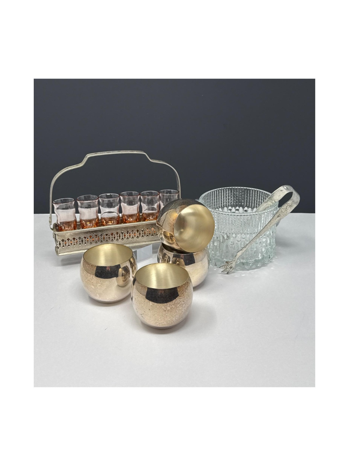 Vintage Barware- Pink Depression Shot Glasses & Silverplated Cups