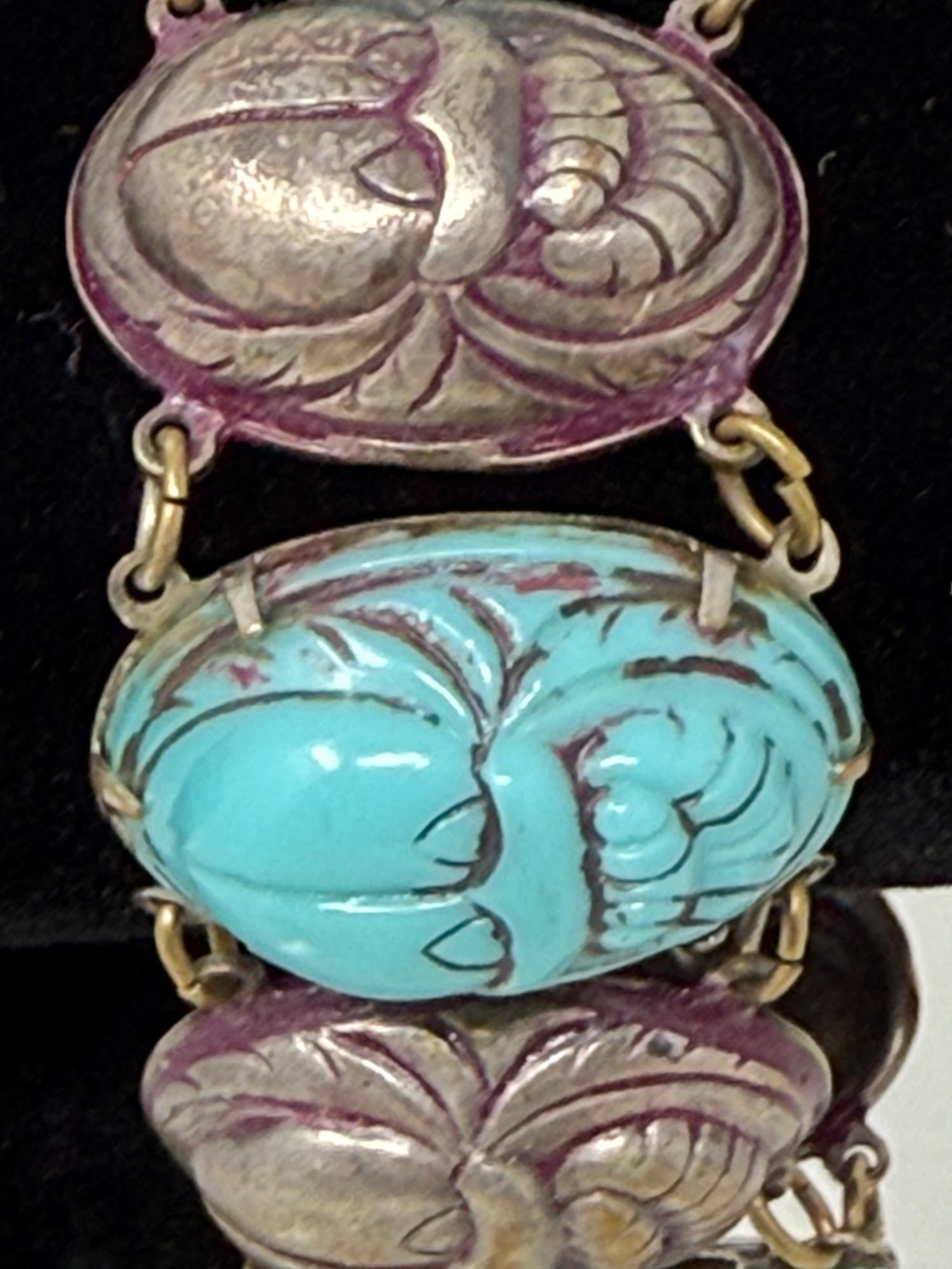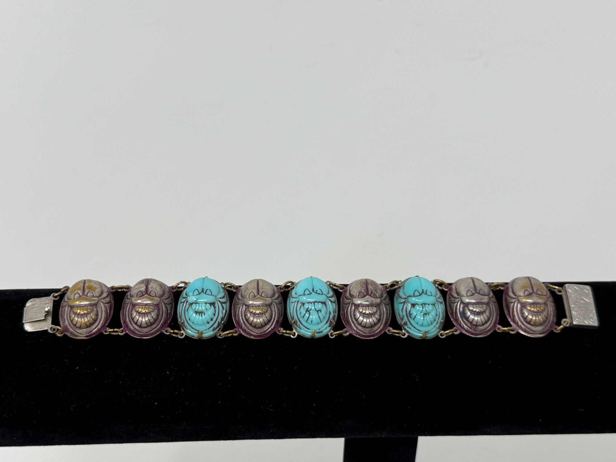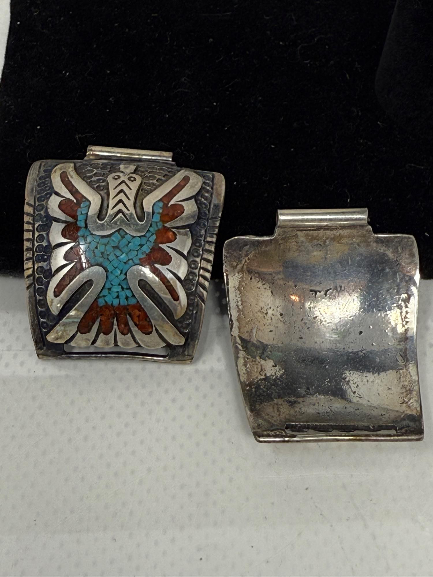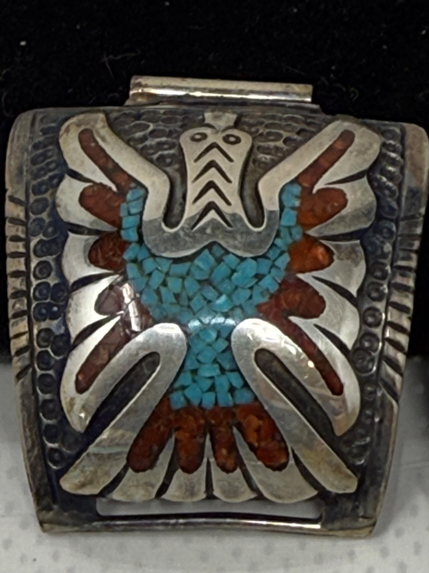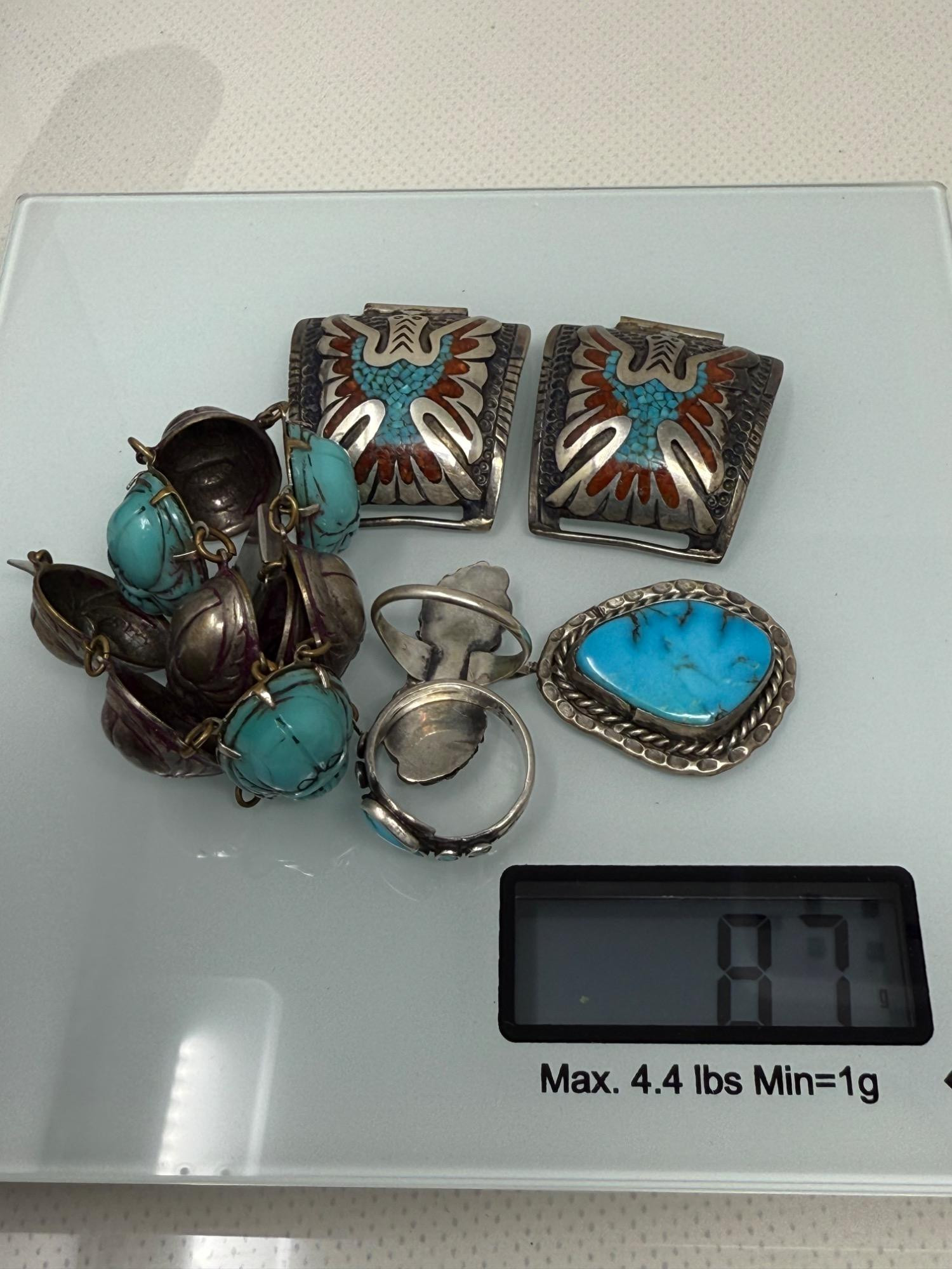 Vintage sterling silver and turquoise jewelry. Necklace is 17in long. Rings are size 8 and 7.5 Eagle watch bands and scarab/spider bracelet. Weight is 87ounces