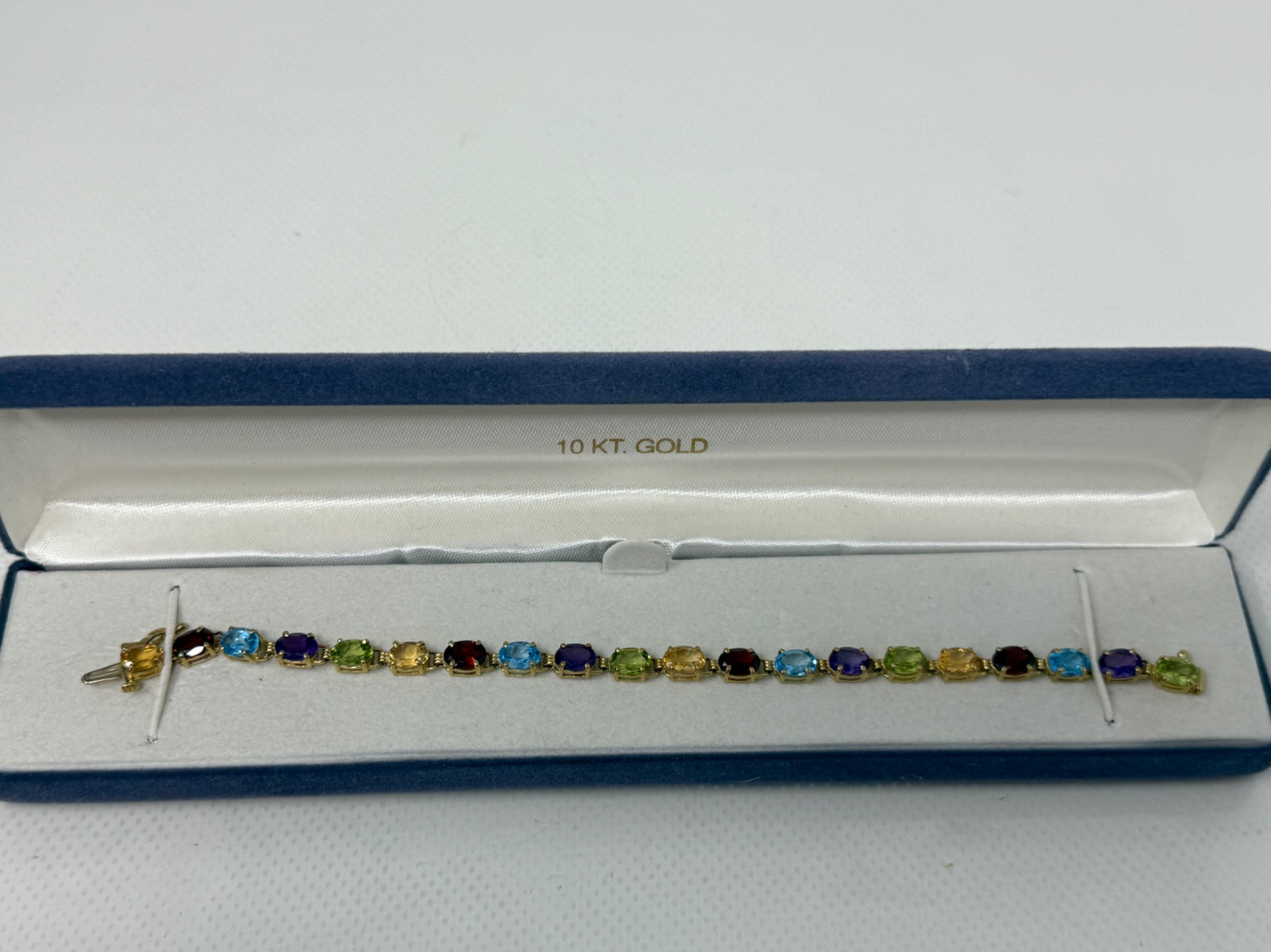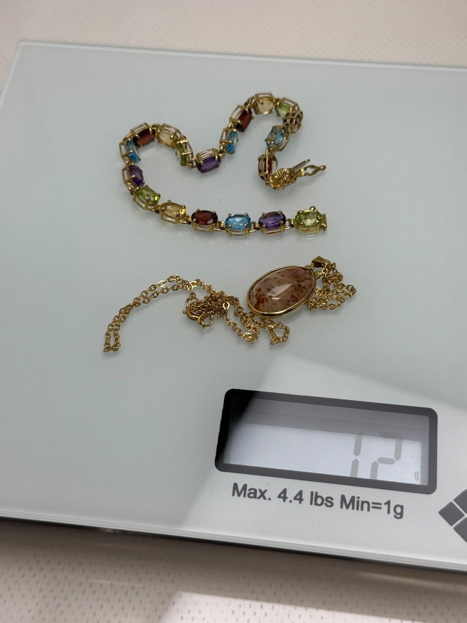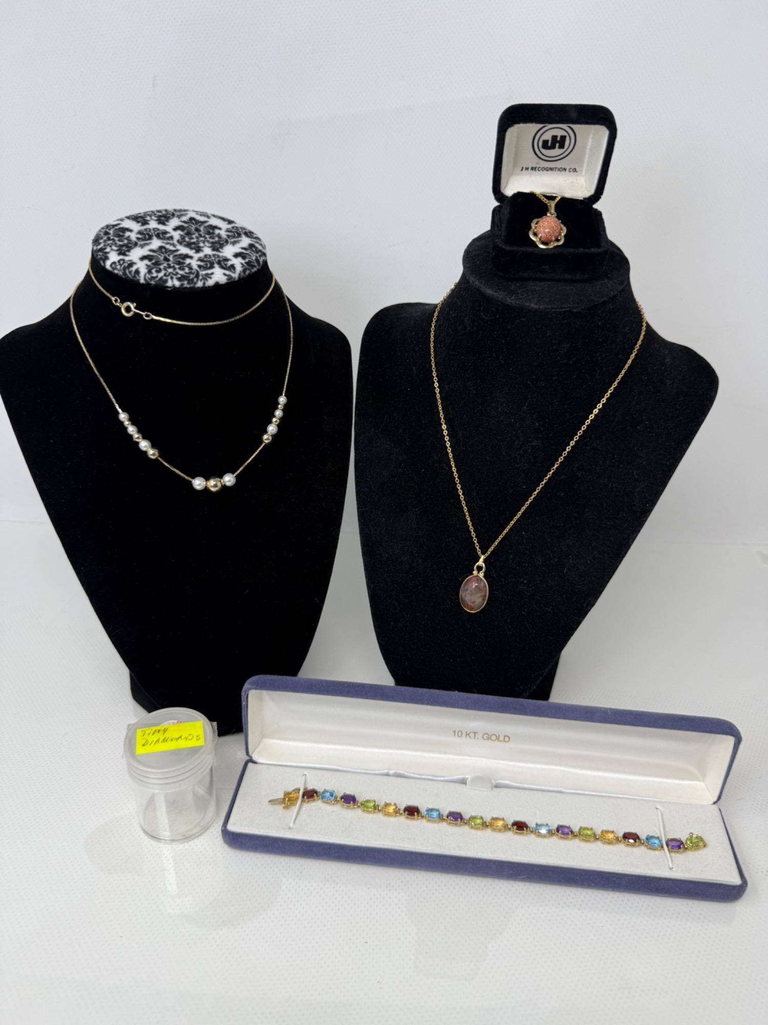 Mix of Jewelry that is 10k/12k. Two loose diamonds Multicolored bracelet has 10K gold clasp. 7.5in long Sunstone Necklace has 12K gold chain. Sandstone Necklace and pearl bead necklaces are not marked.