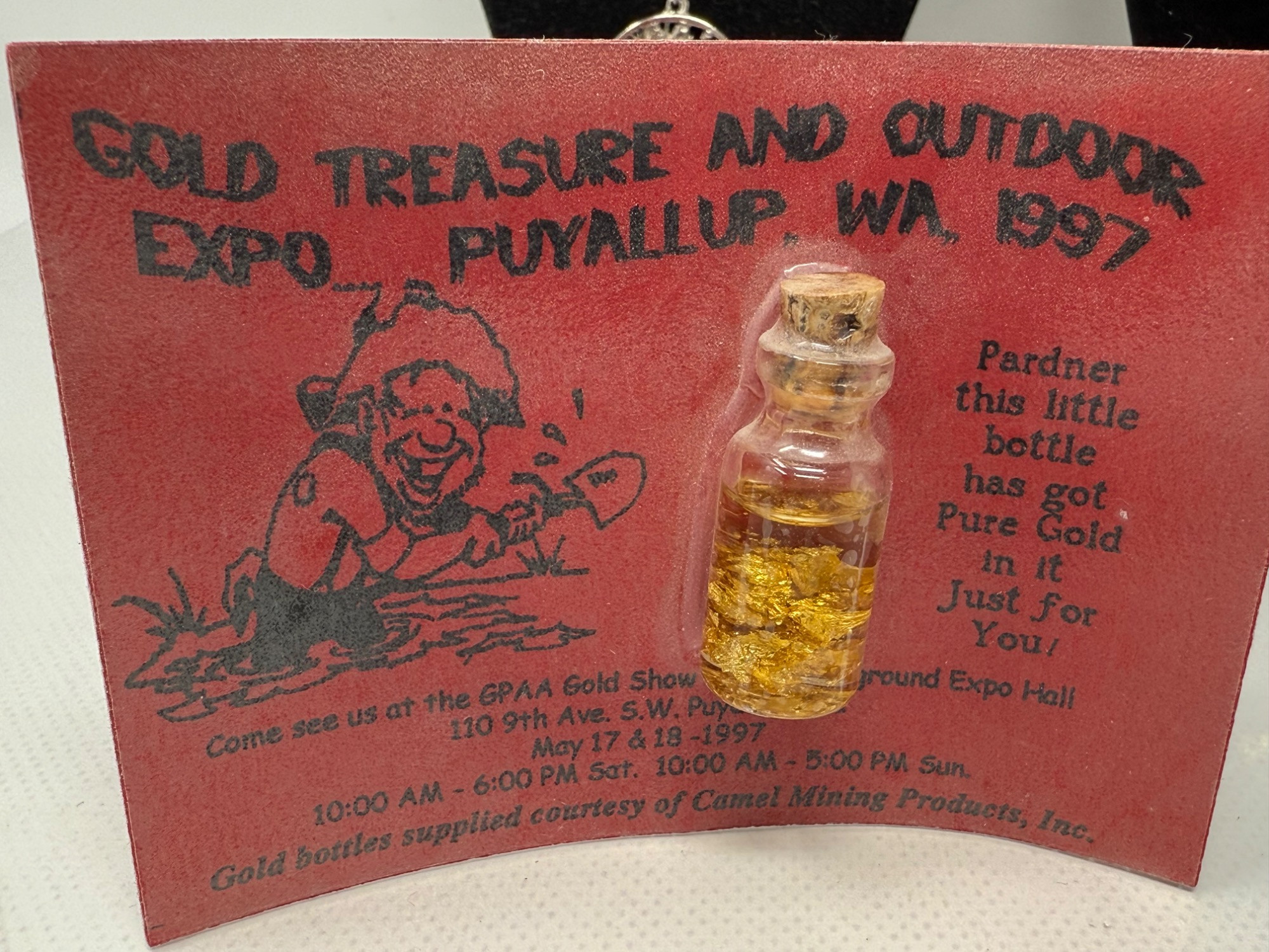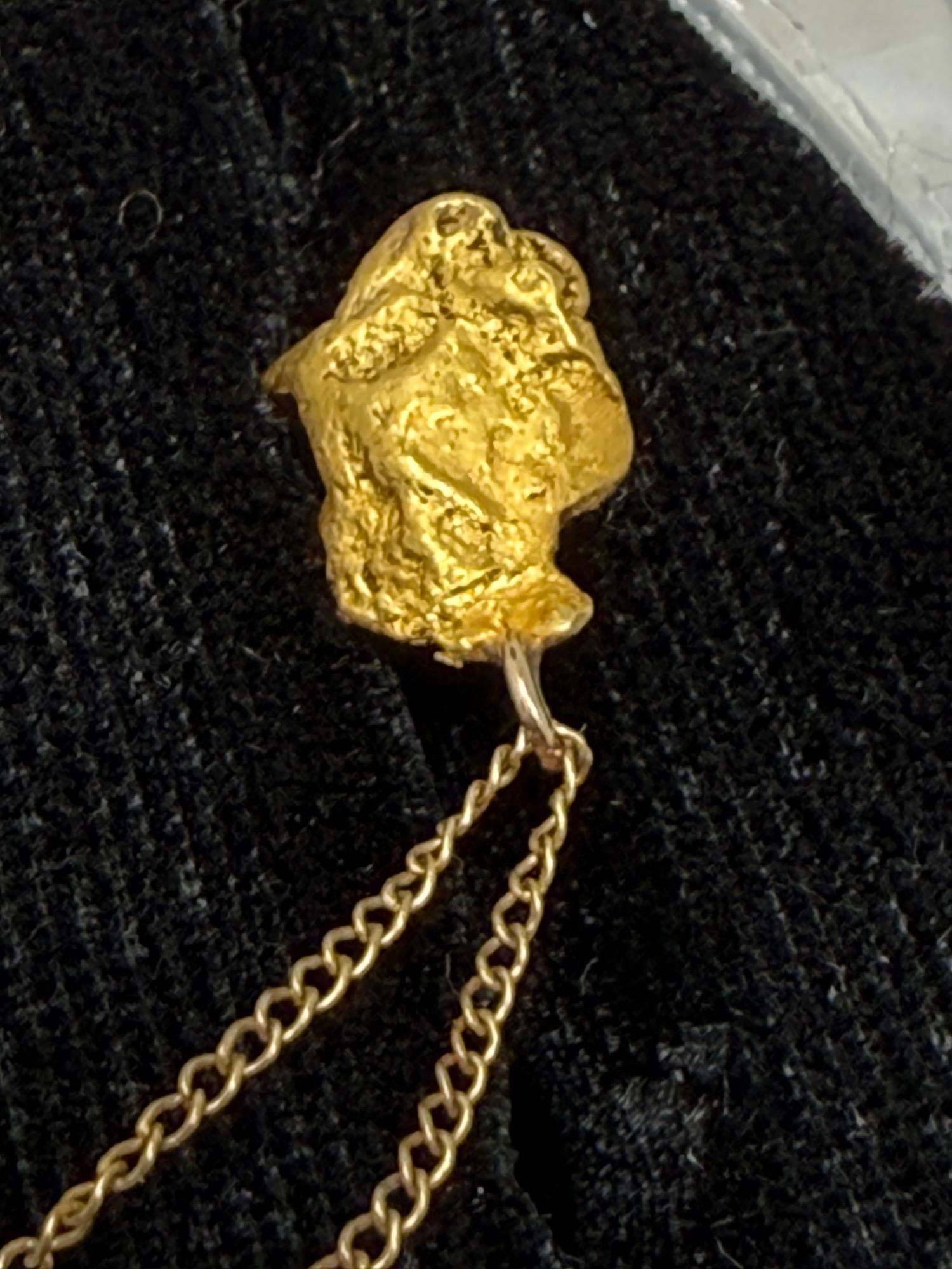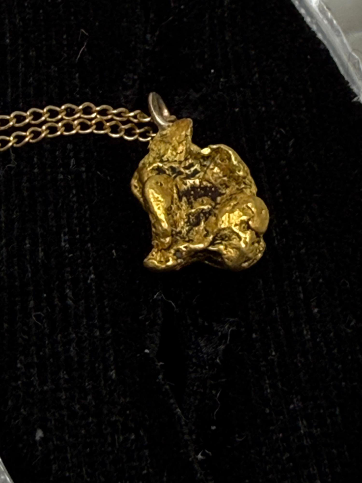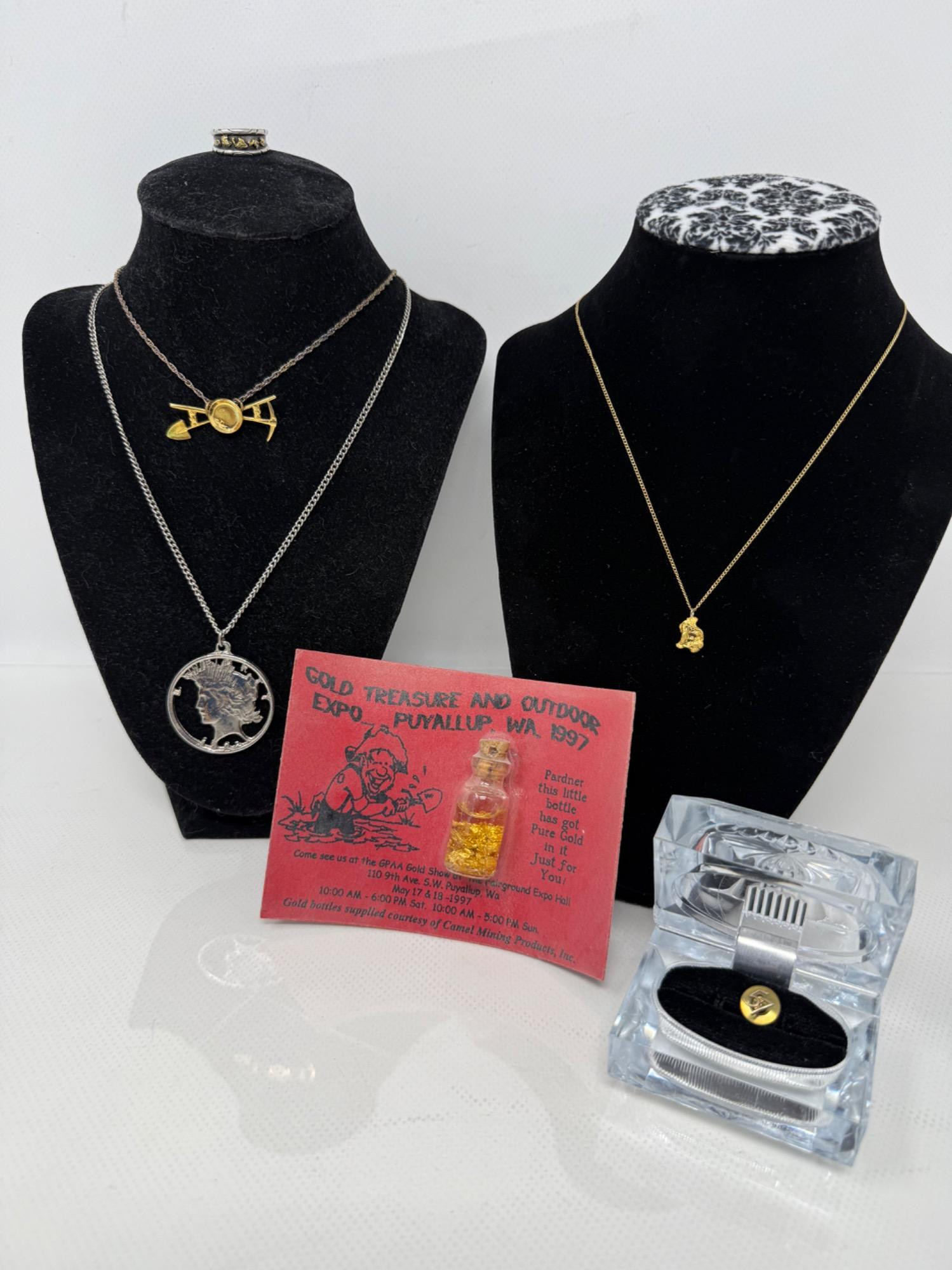 Mix of nugget and vintage styled jewelry. Vial of gold flakes, Small bead with floating flakes. Necklace with nugget pendant is 7ounces. Miners necklace and coin pendant necklace. "57" tie tack/pin Gold nugget on silver ring. Size 7