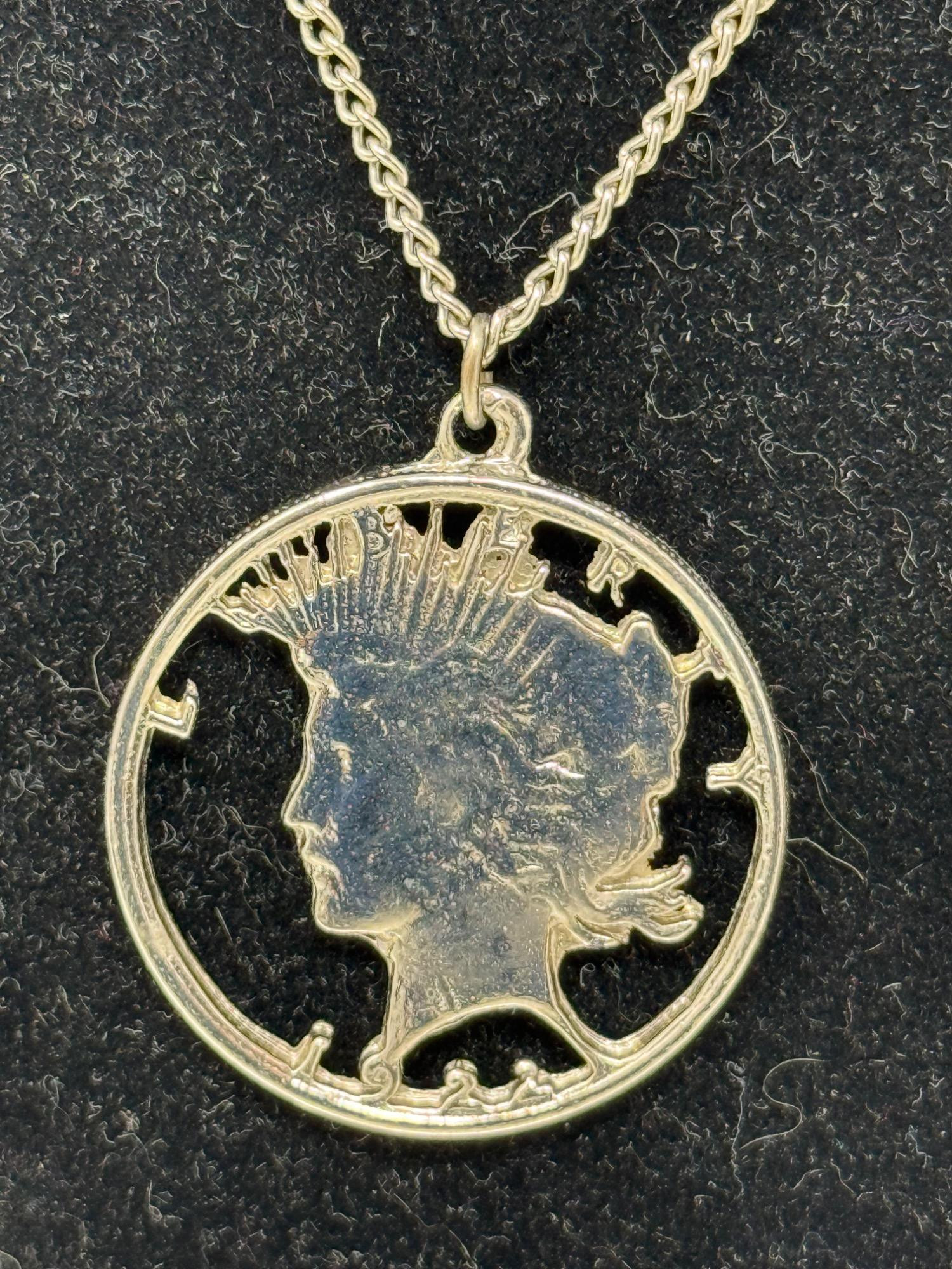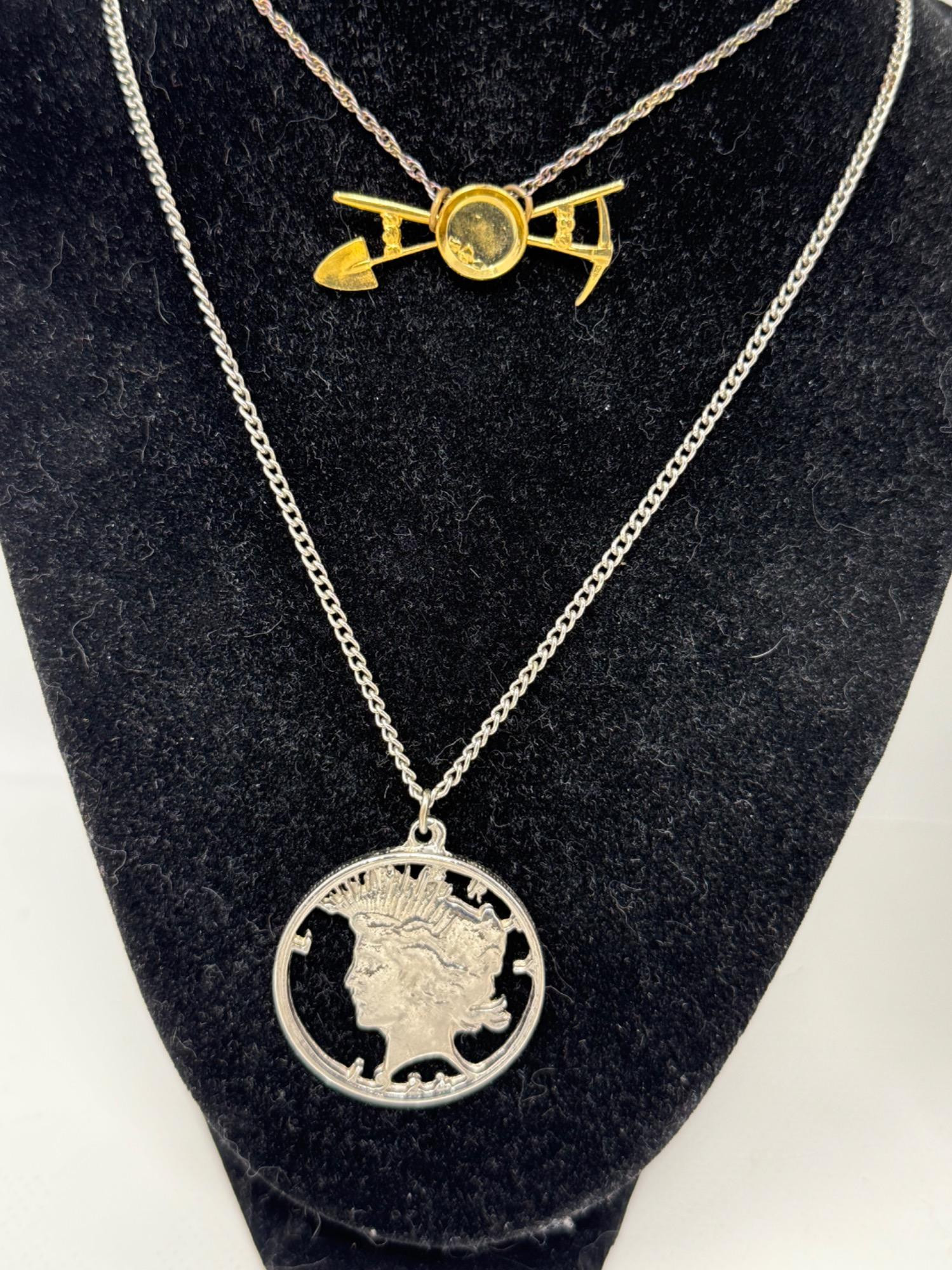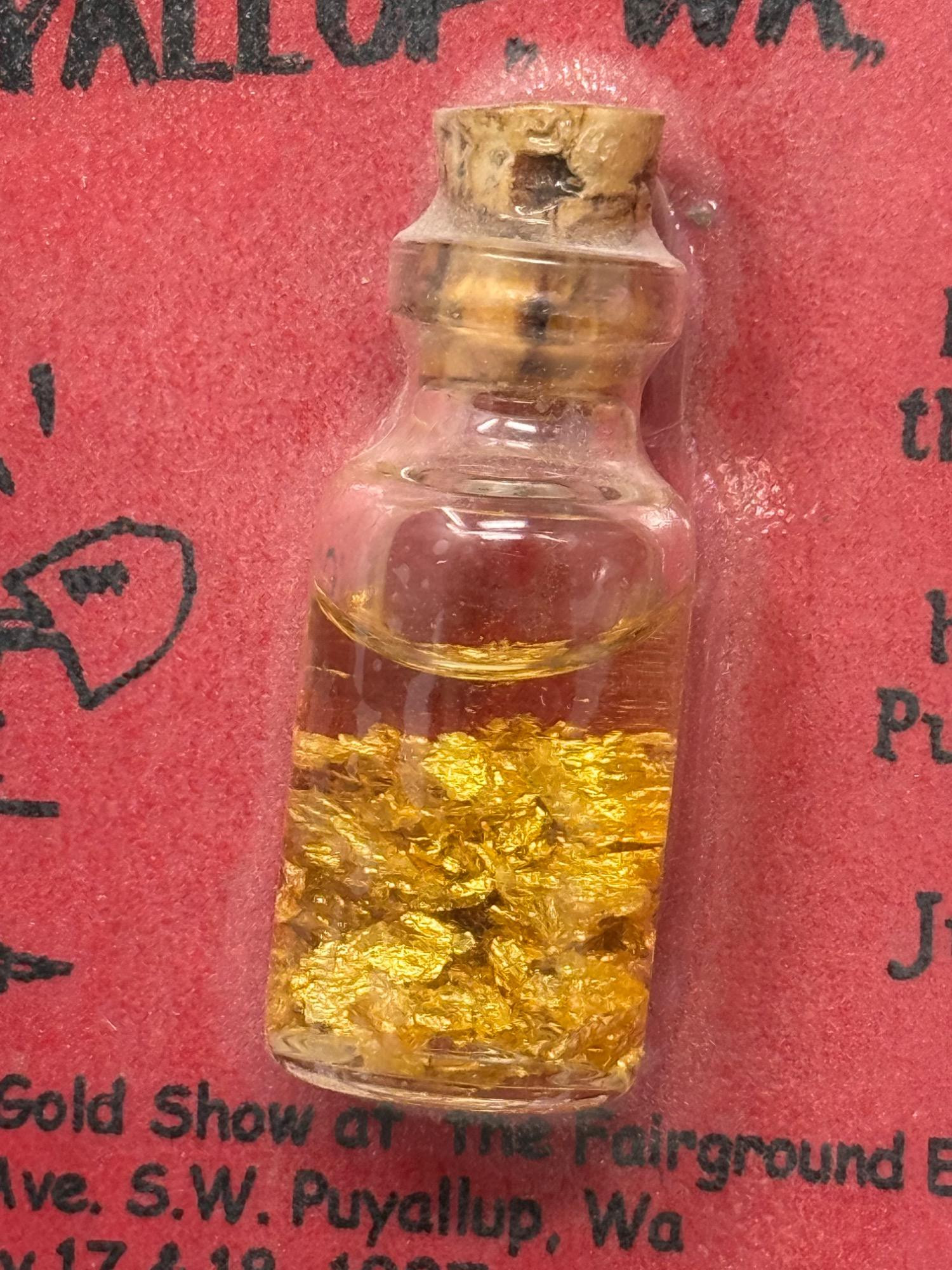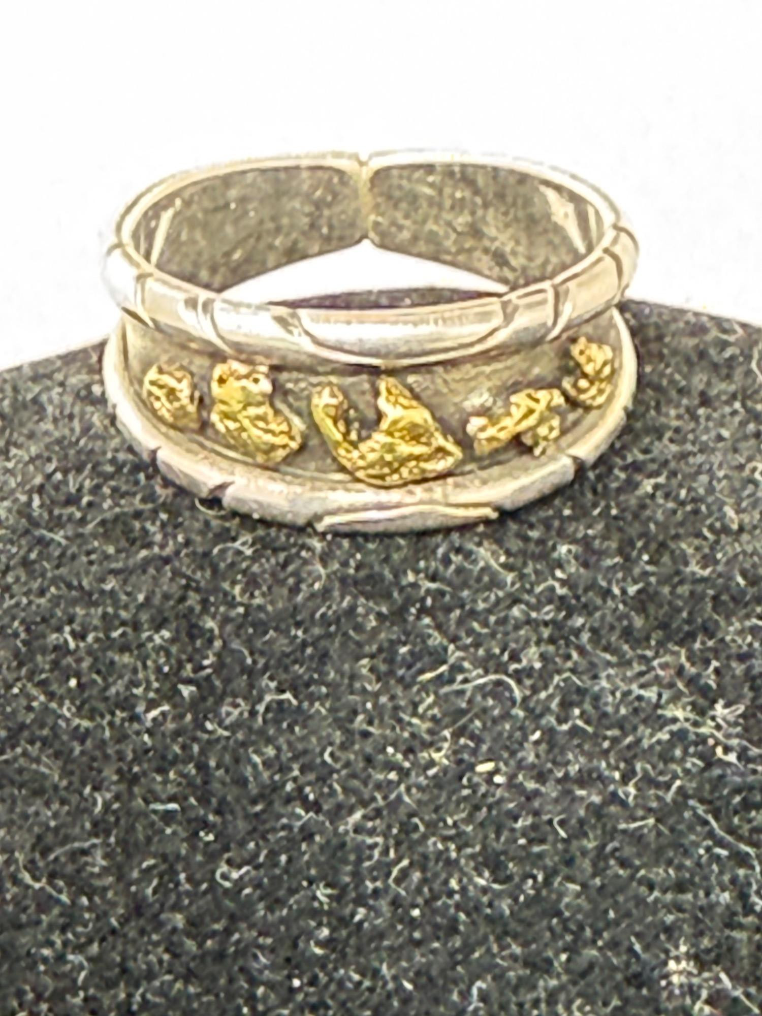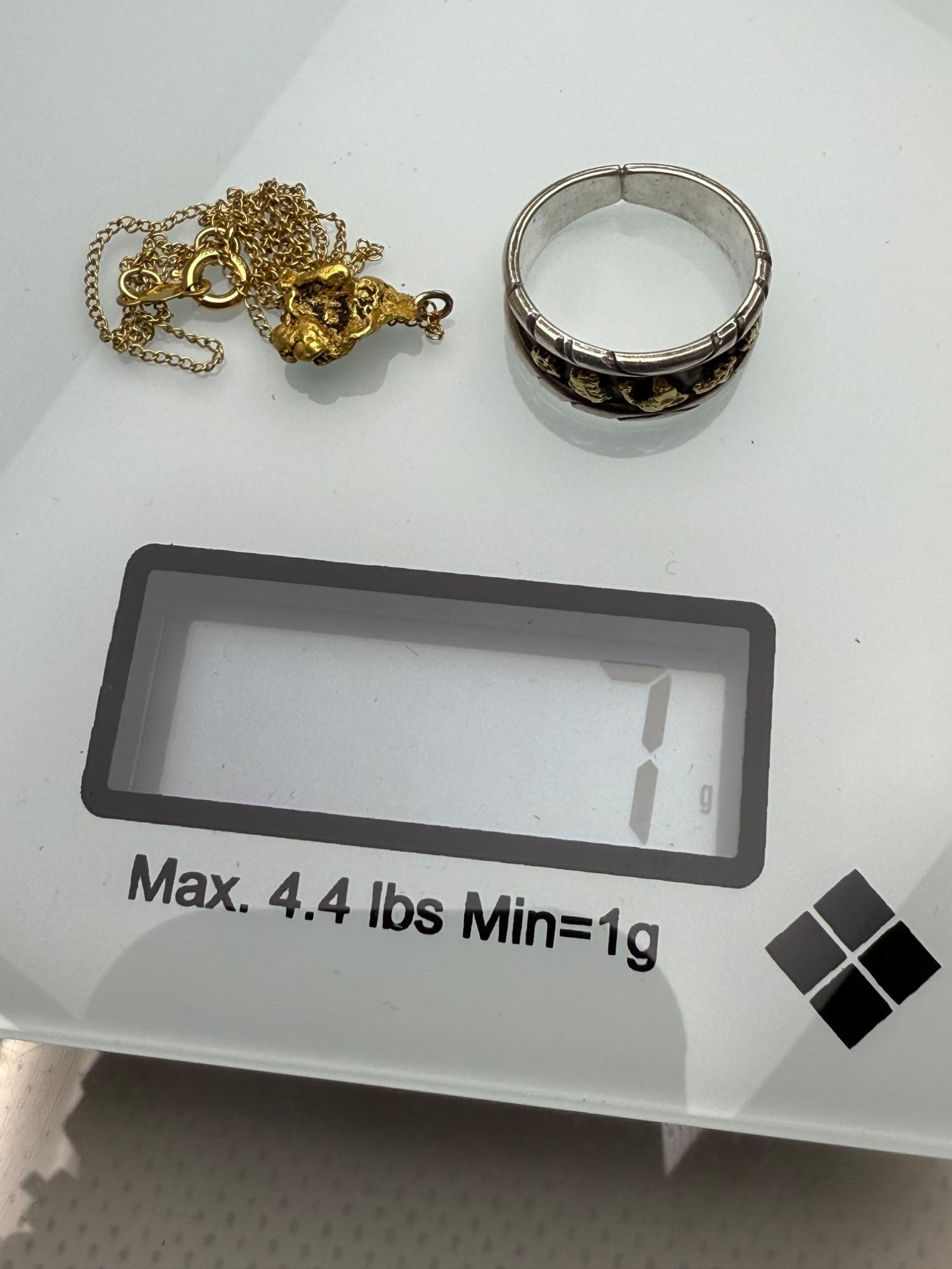 Mix of nugget and vintage styled jewelry. Vial of gold flakes, Small bead with floating flakes. Necklace with nugget pendant is 7ounces. Miners necklace and coin pendant necklace. "57" tie tack/pin Gold nugget on silver ring. Size 7
