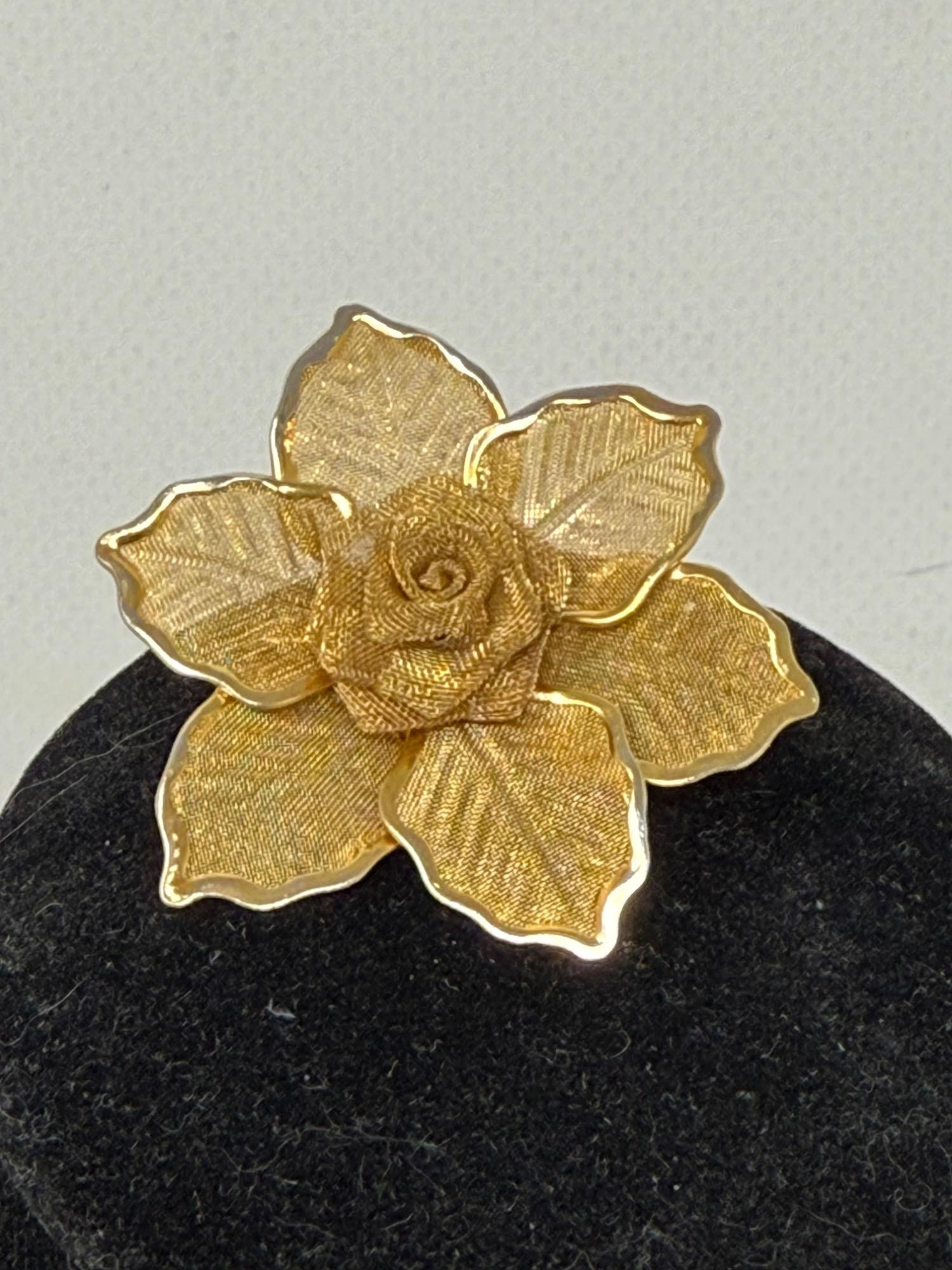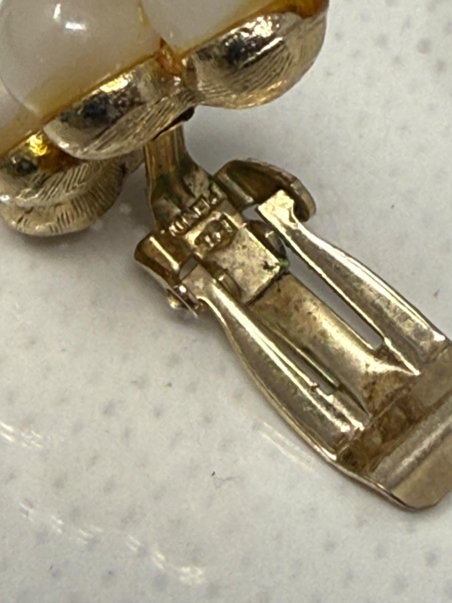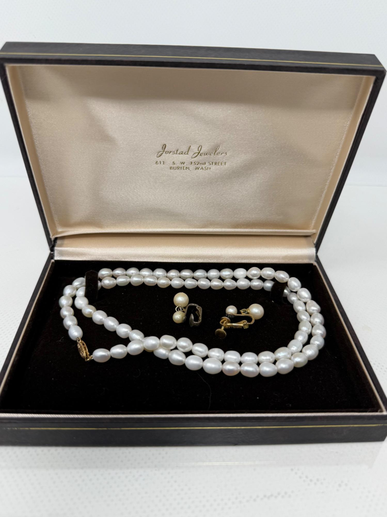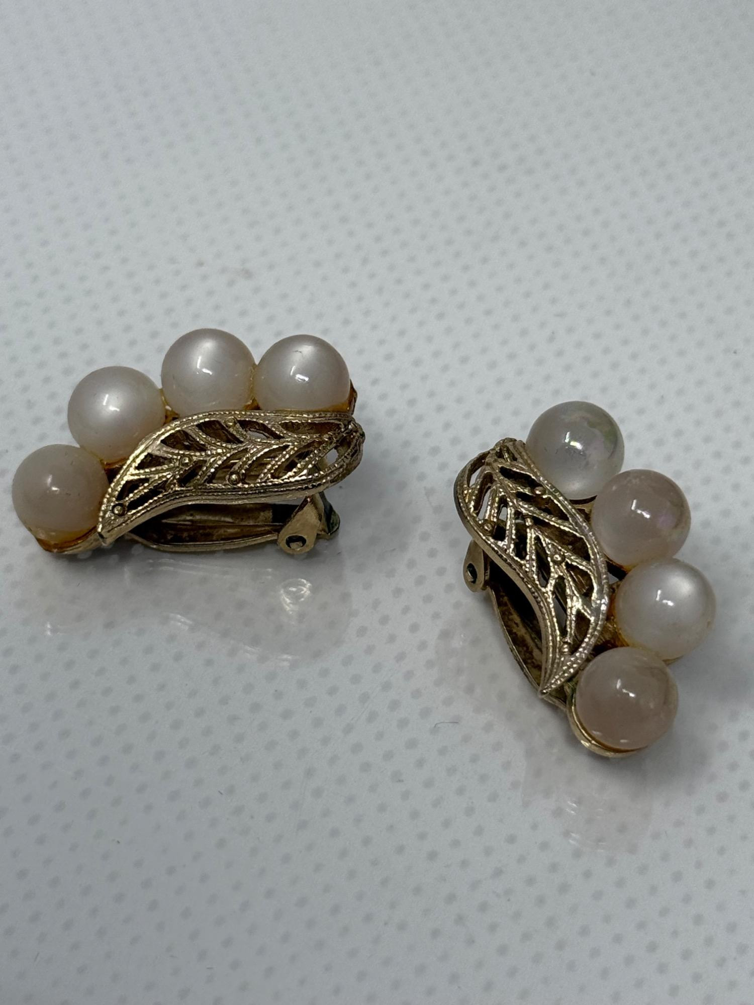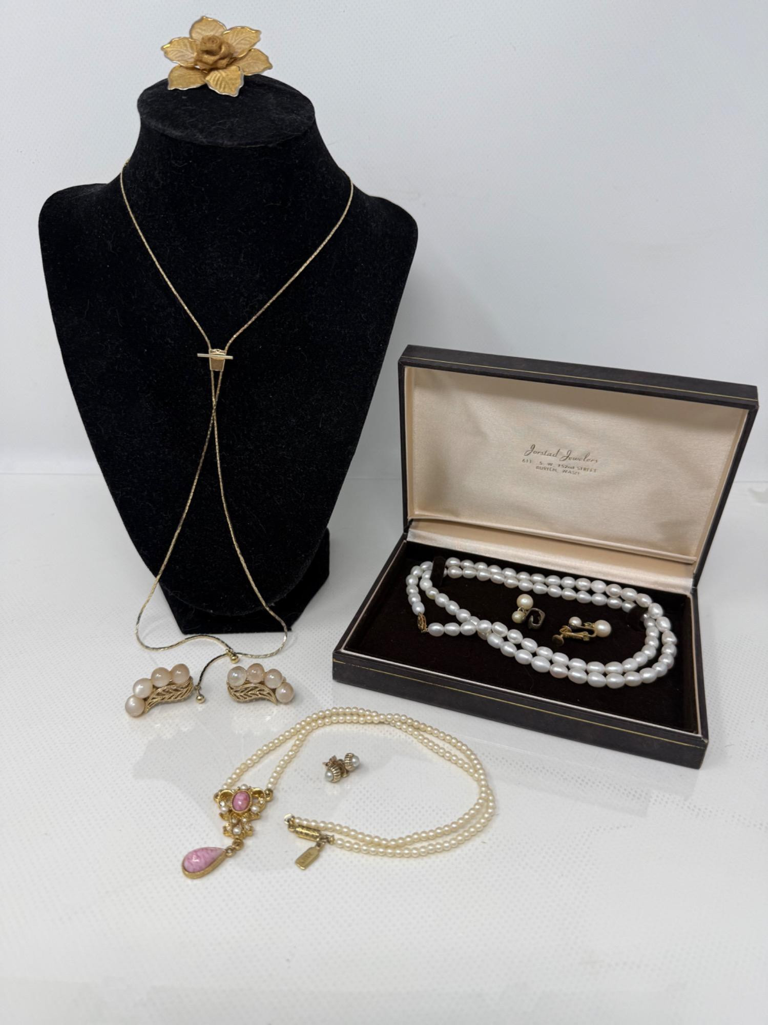 Variety of pearl and gold toned jewelry. Pearl necklace has 14K gold clasp. Clip on earrings, gold leaf pin.
