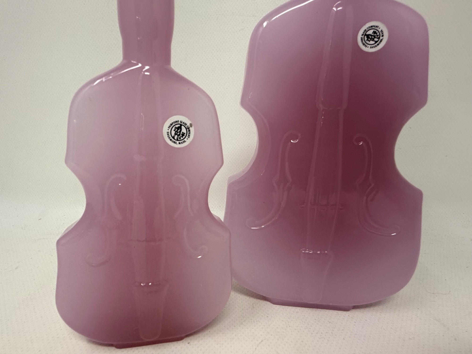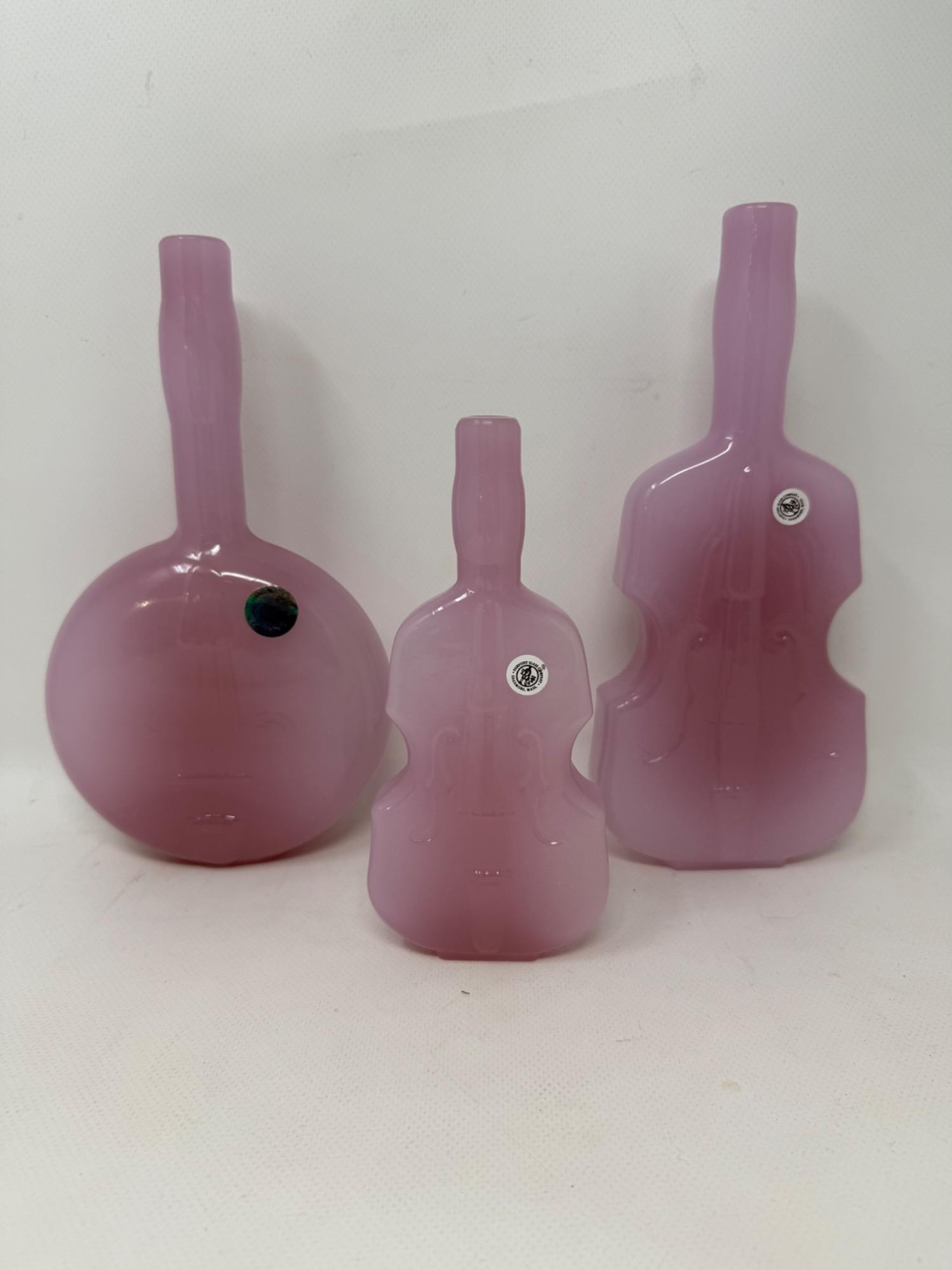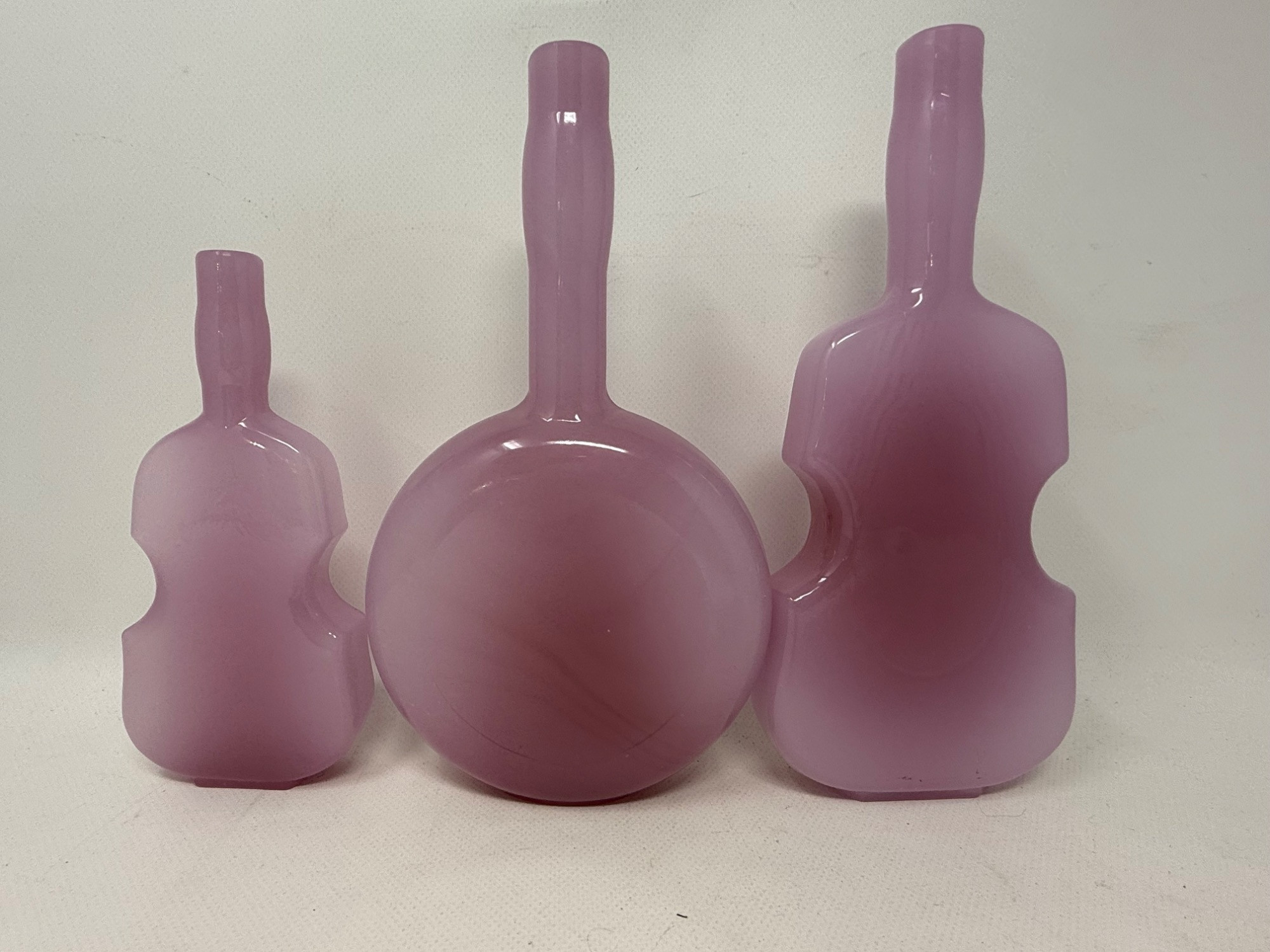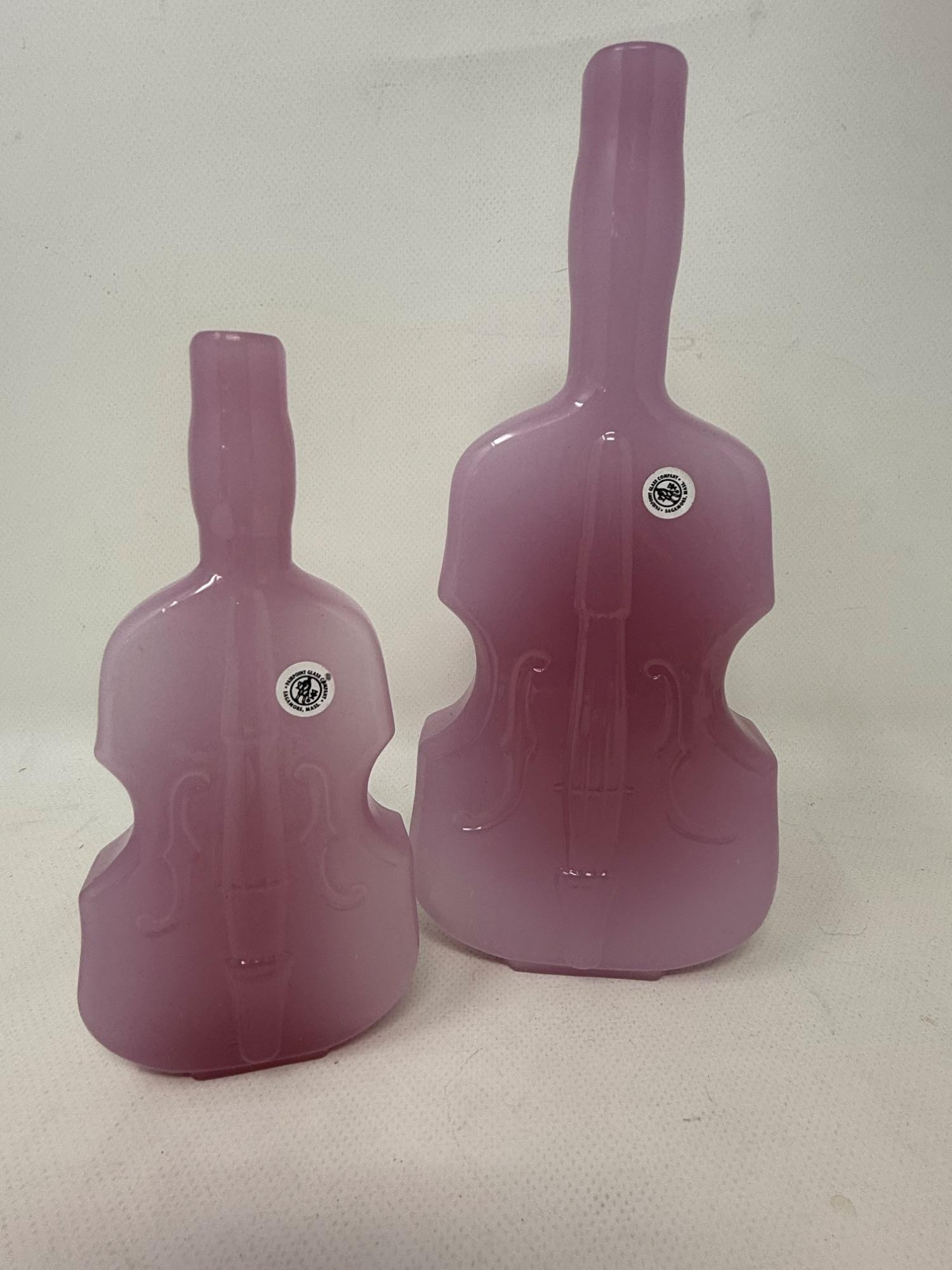 Pink Milk Glass Pairpoint Violin and Banjo Bottles. Bottles are 7, 9.2, 9.5 inches tall. In great condition. Makers mark on bottom.