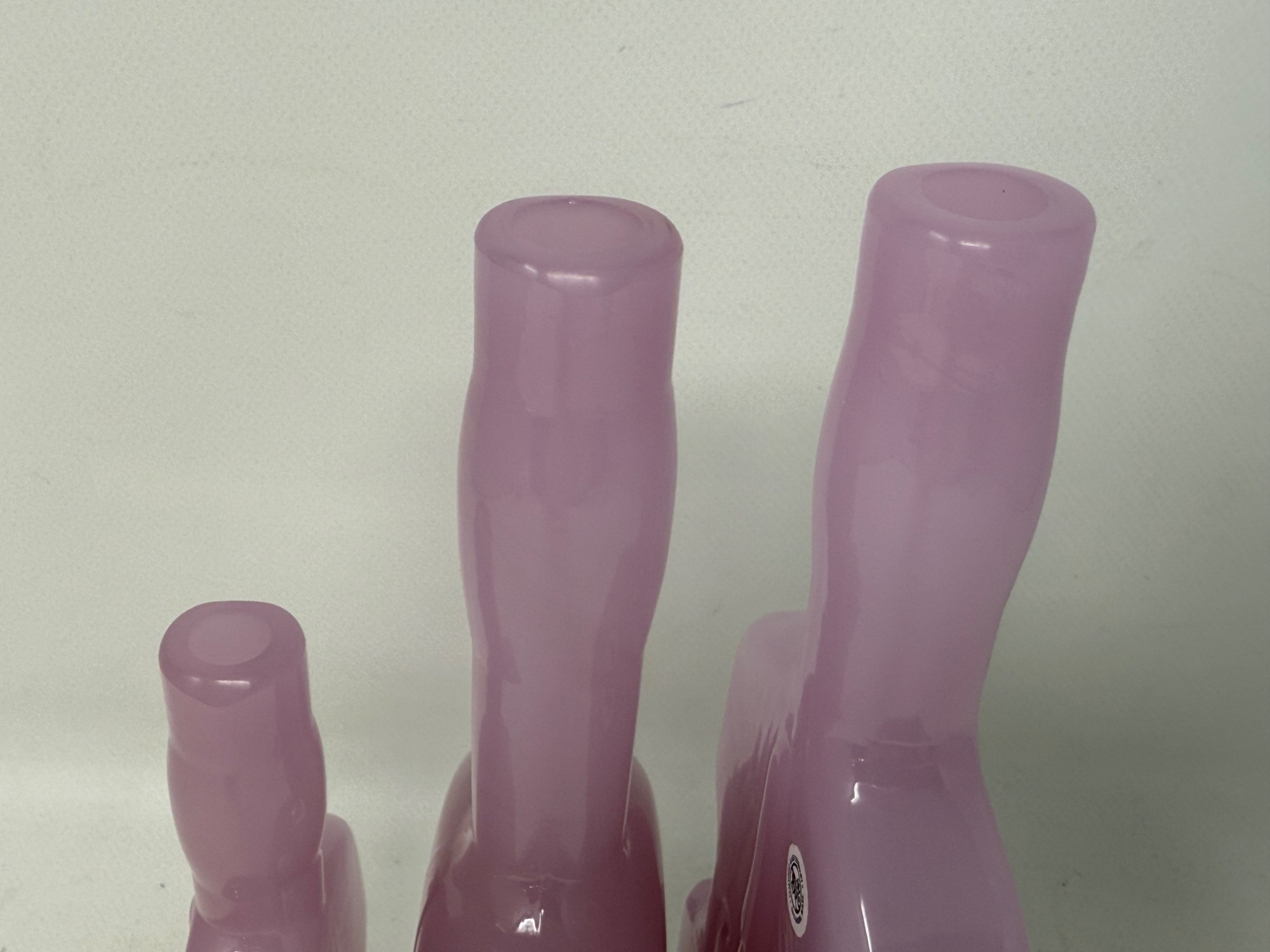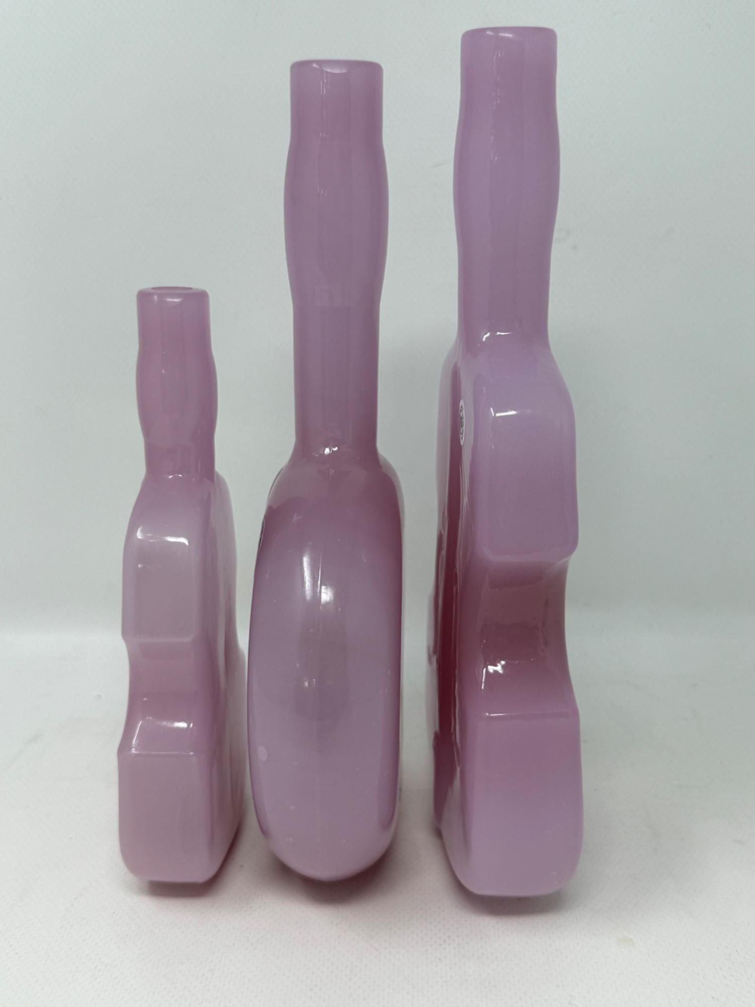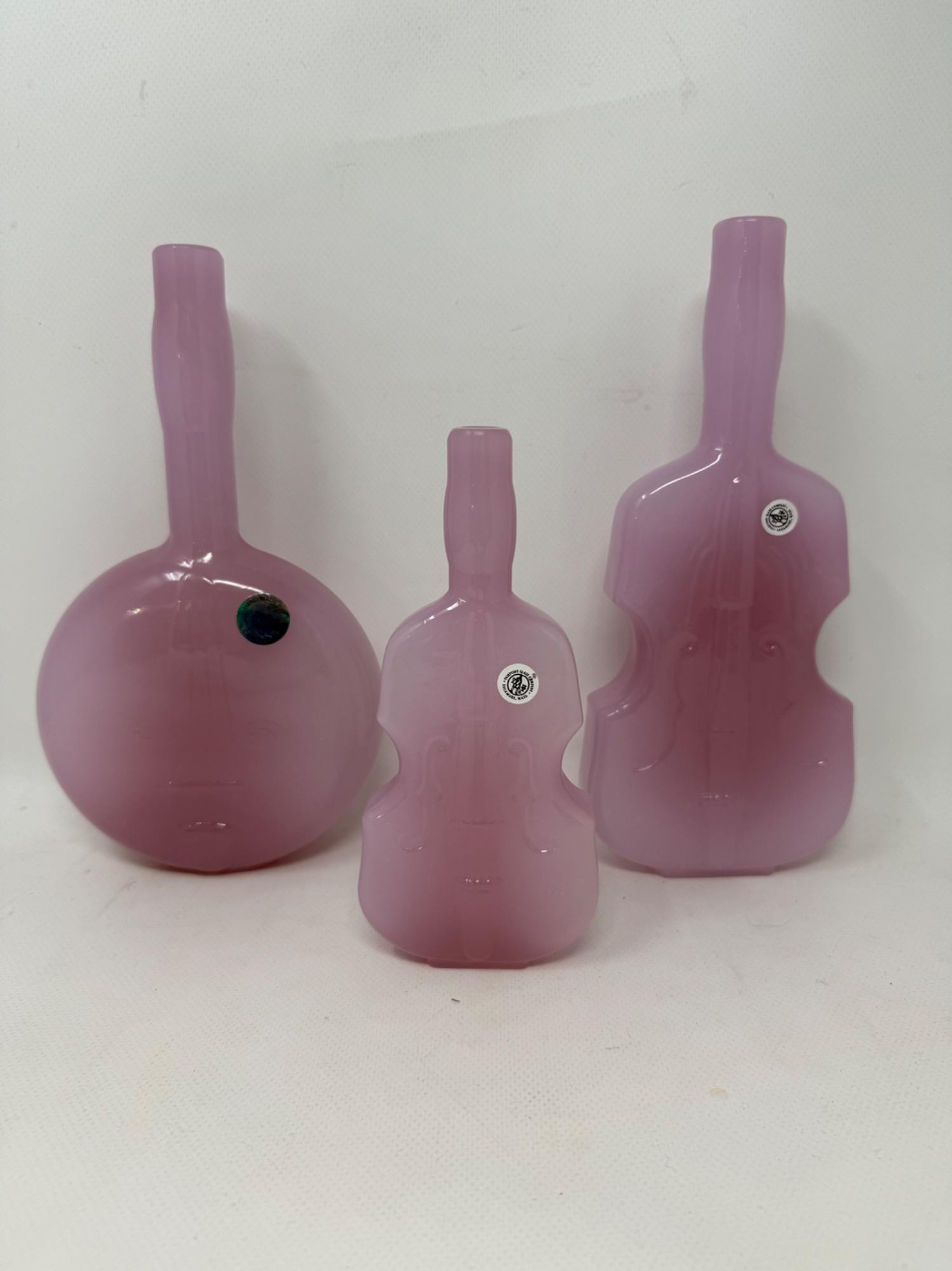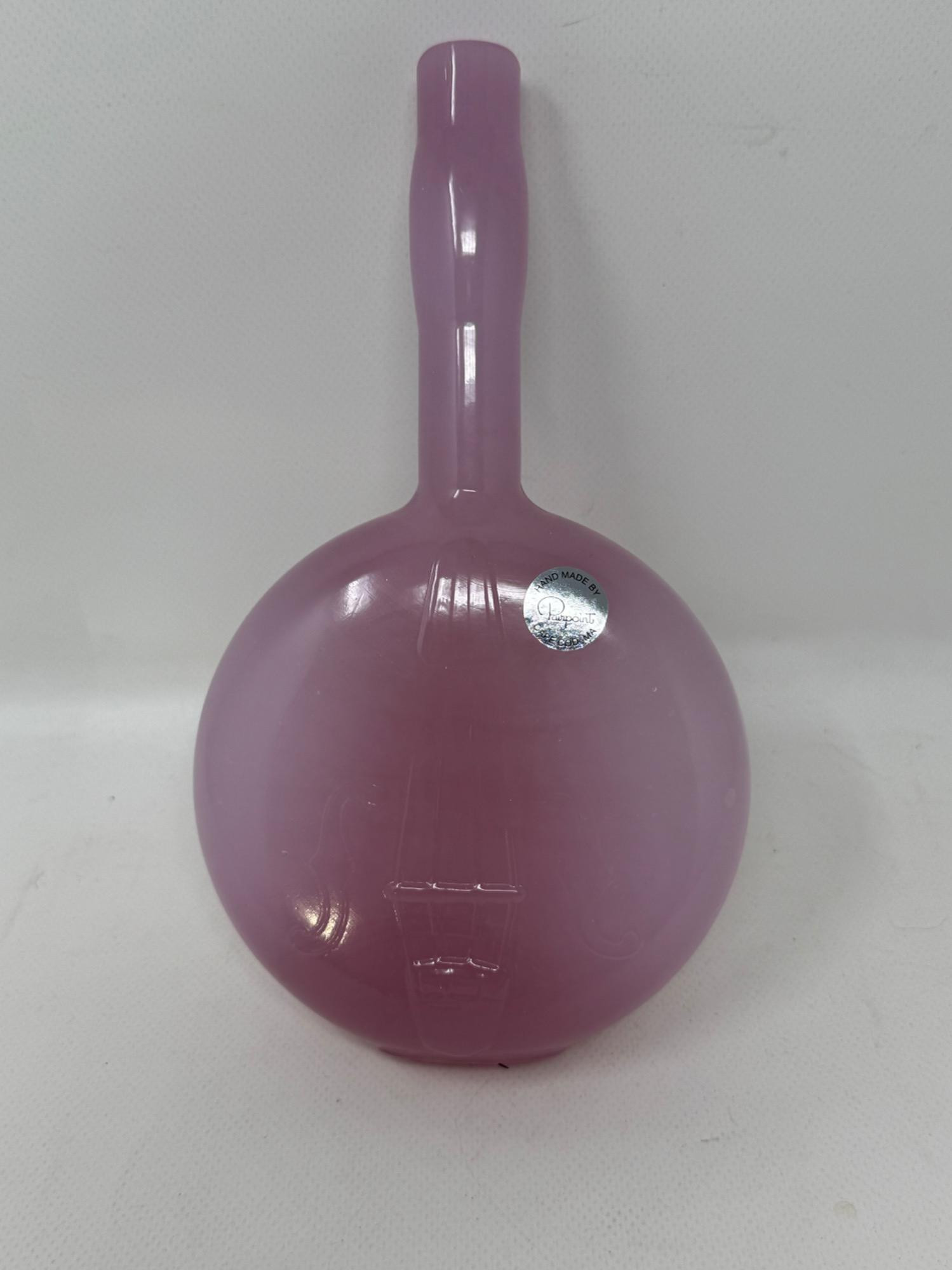 Pink Milk Glass Pairpoint Violin and Banjo Bottles. Bottles are 7, 9.2, 9.5 inches tall. In great condition. Makers mark on bottom.