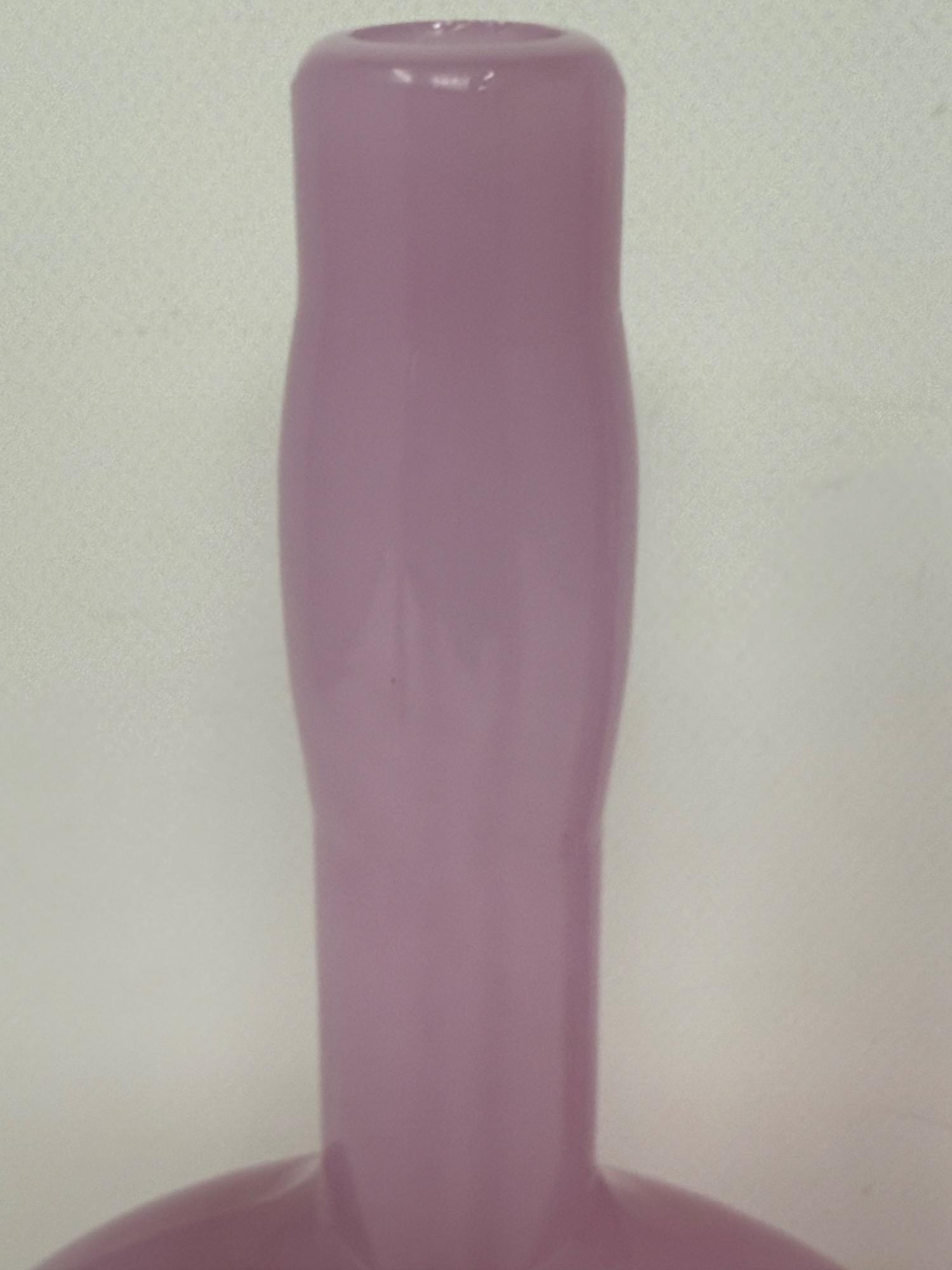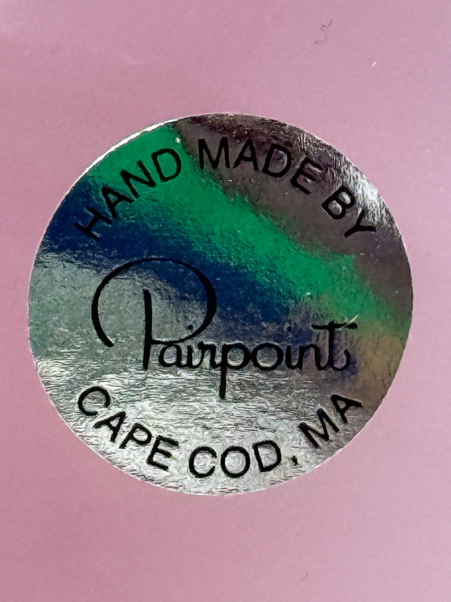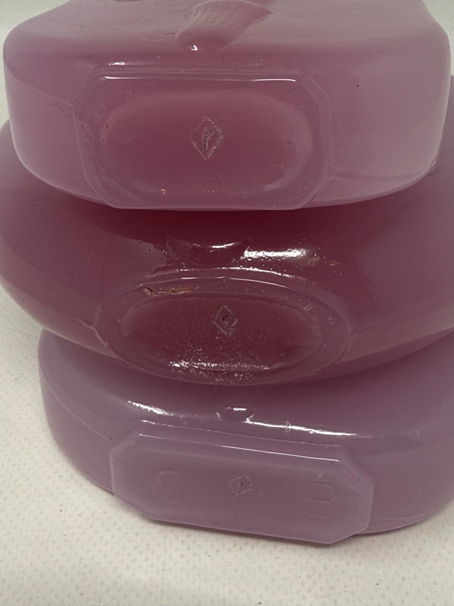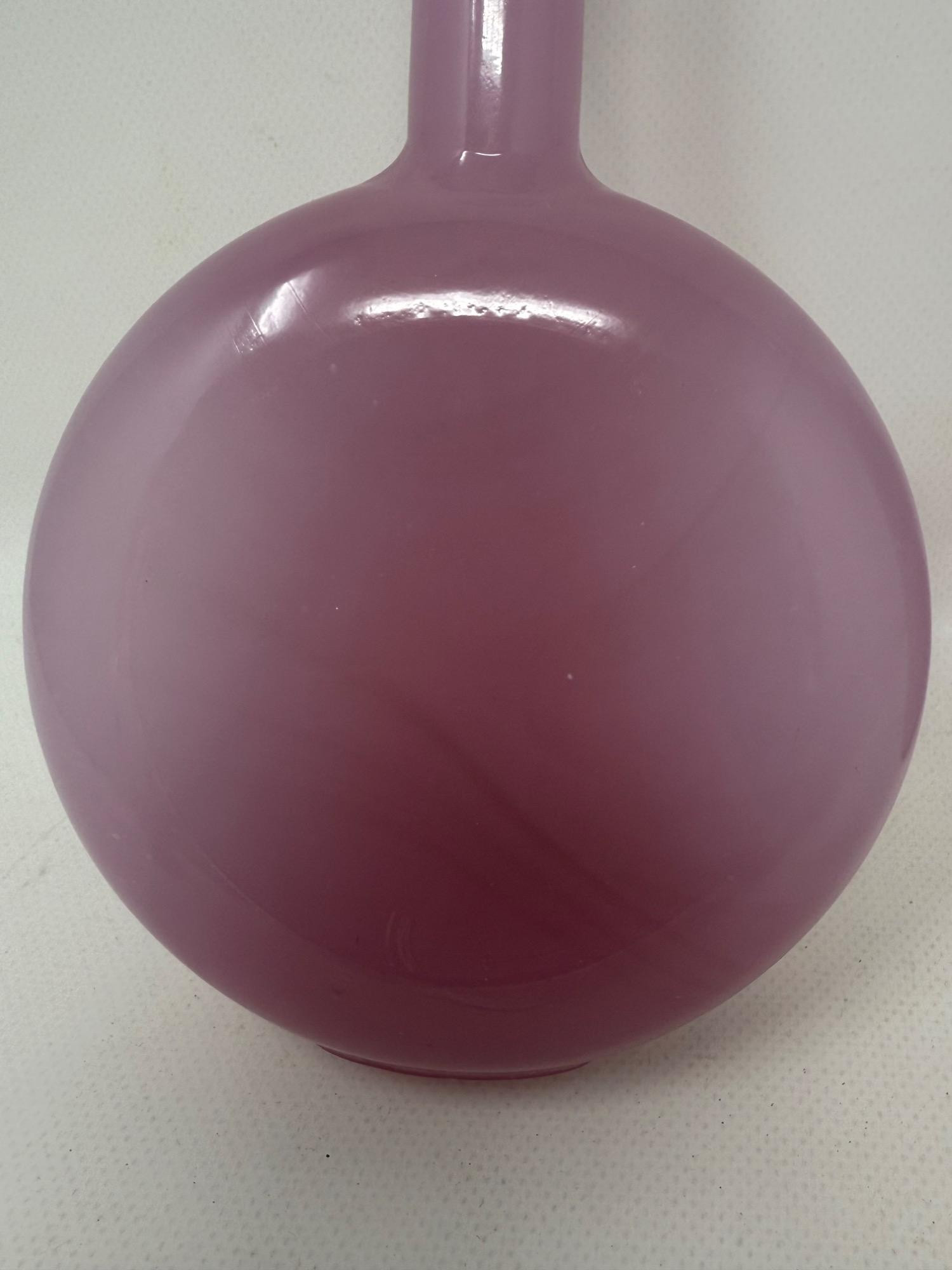 Pink Milk Glass Pairpoint Violin and Banjo Bottles. Bottles are 7, 9.2, 9.5 inches tall. In great condition. Makers mark on bottom.