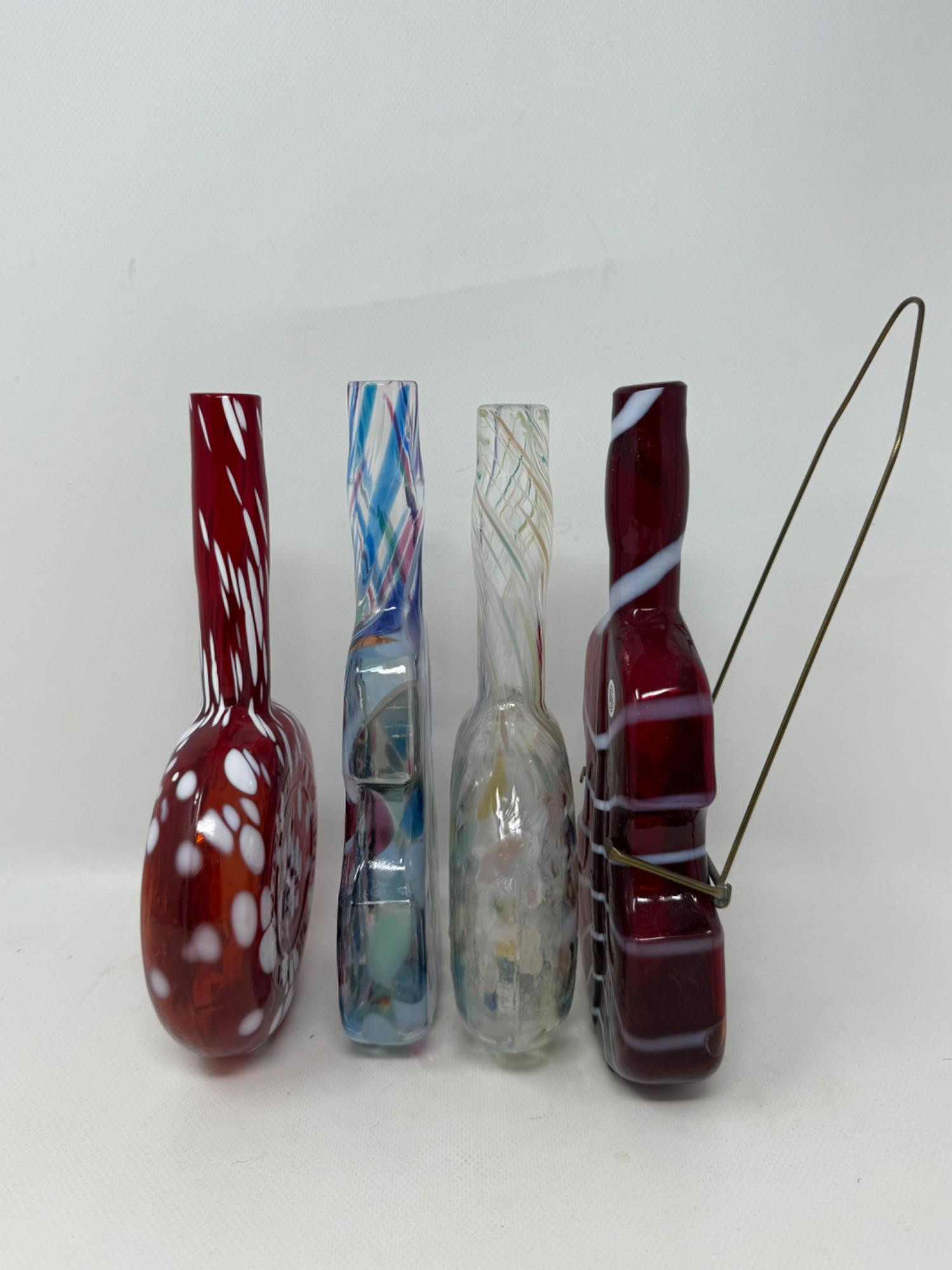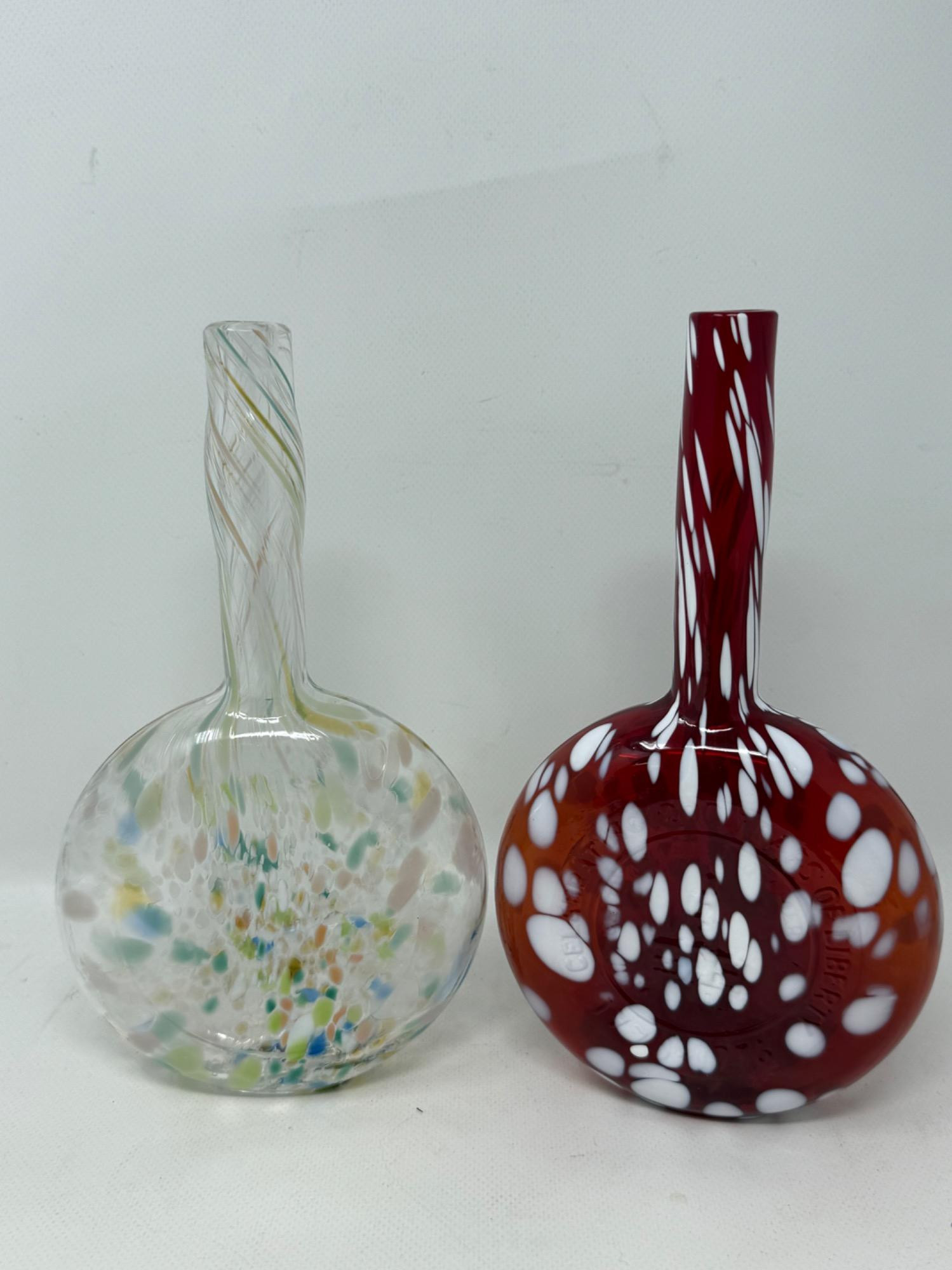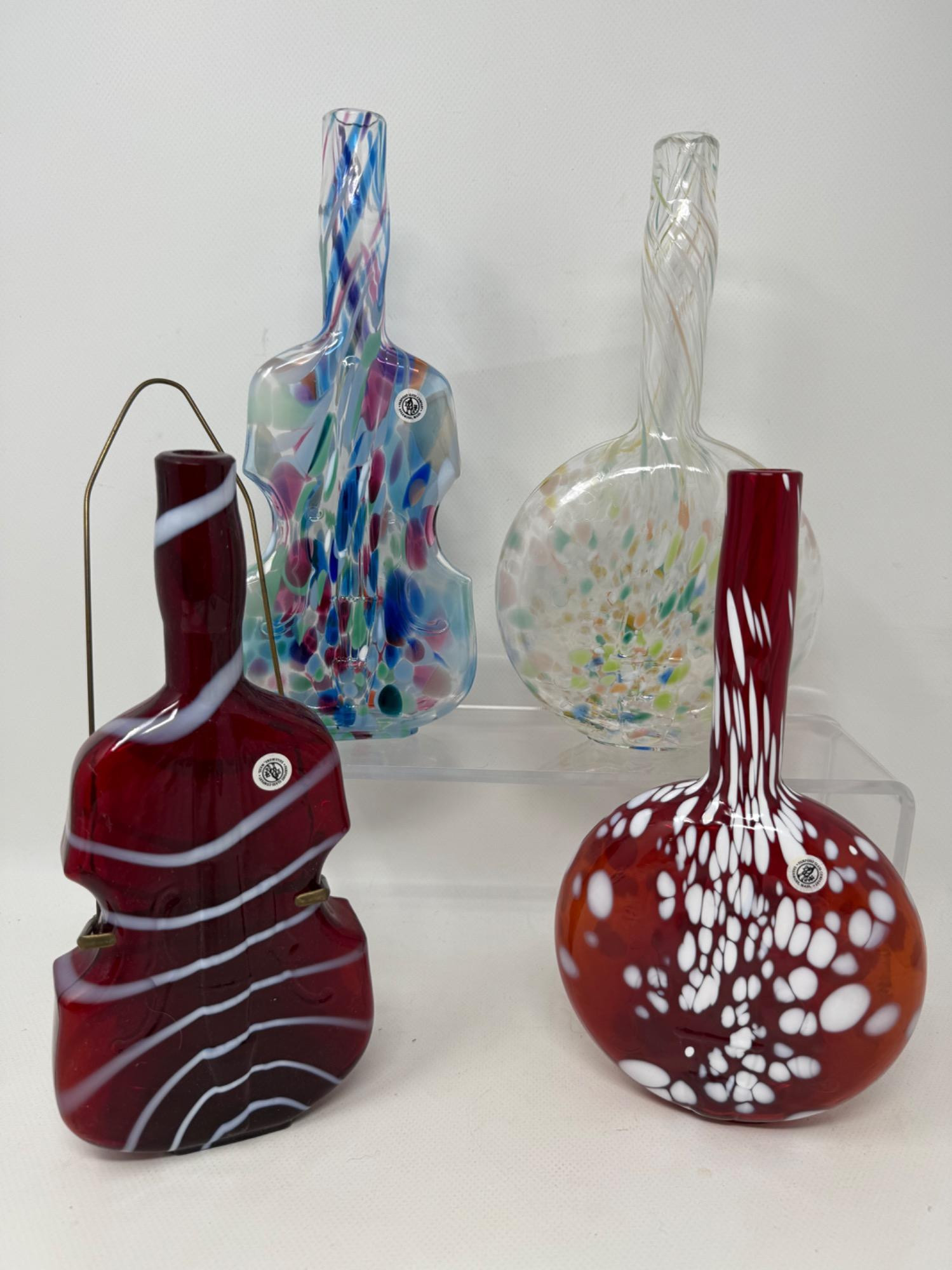 Vintage Pairpoint bottles. Violin and banjo styles. Anniversary embossed bottle. Multi-colored glass, trademark etched. One with mounting hook.