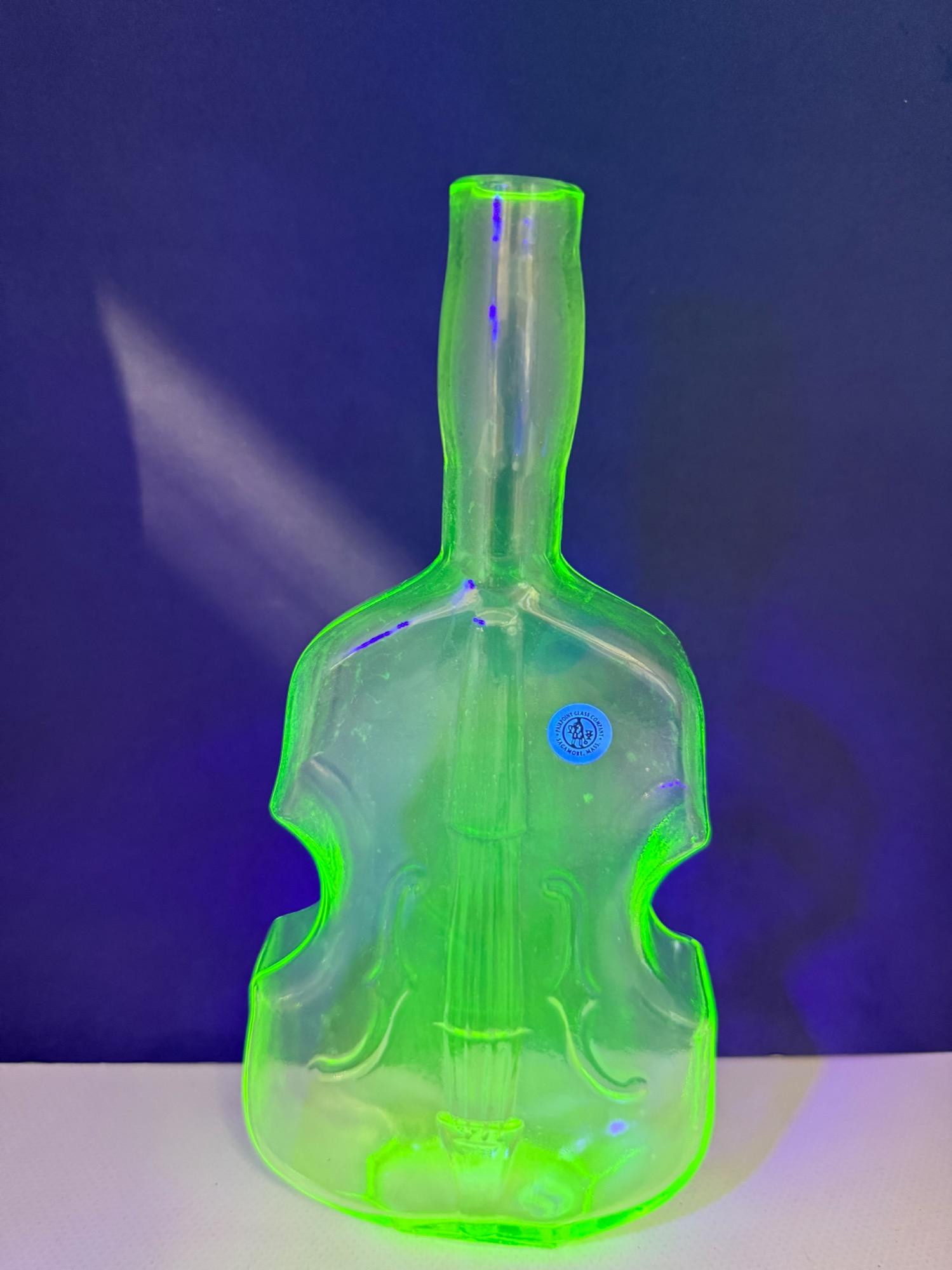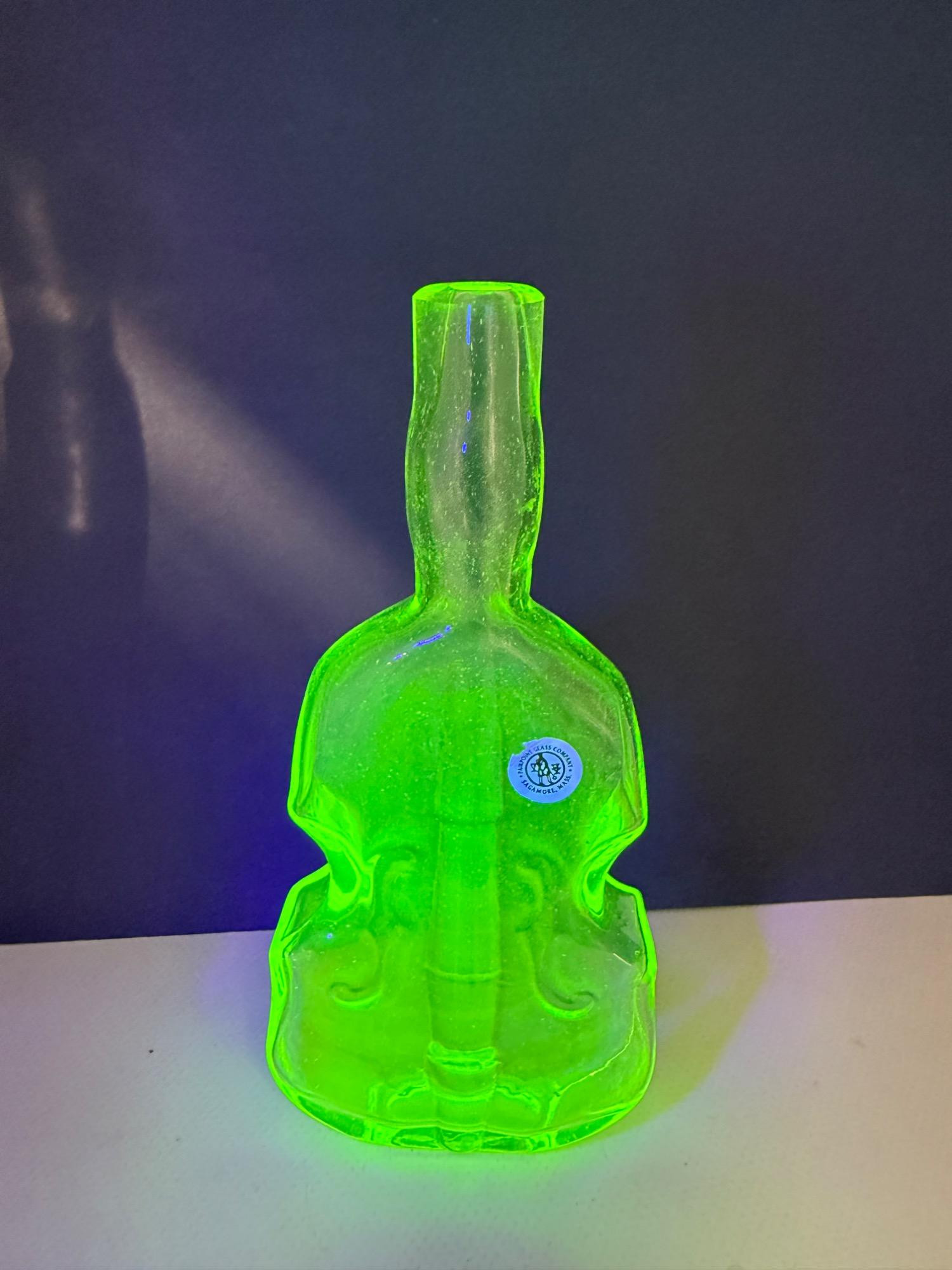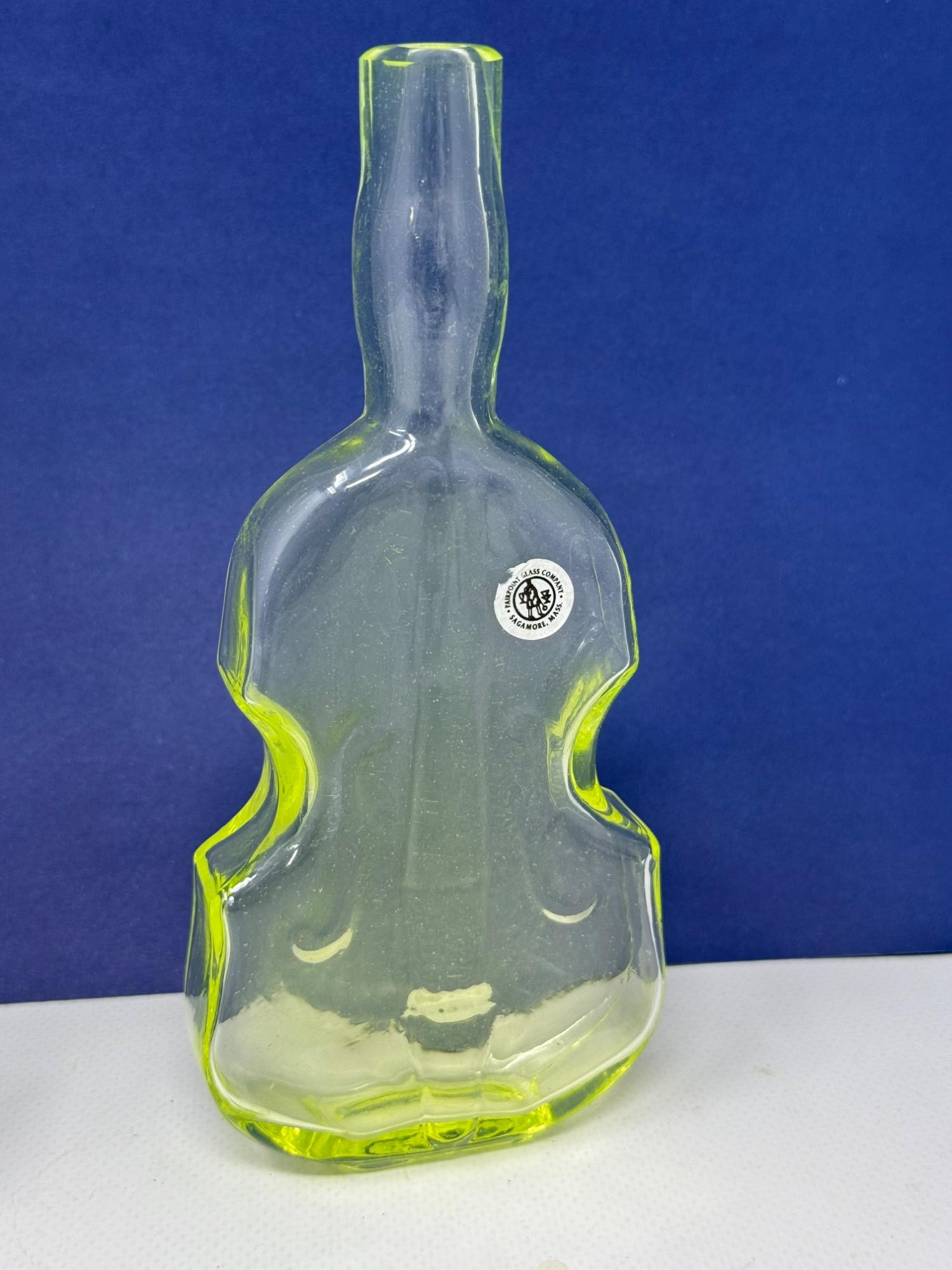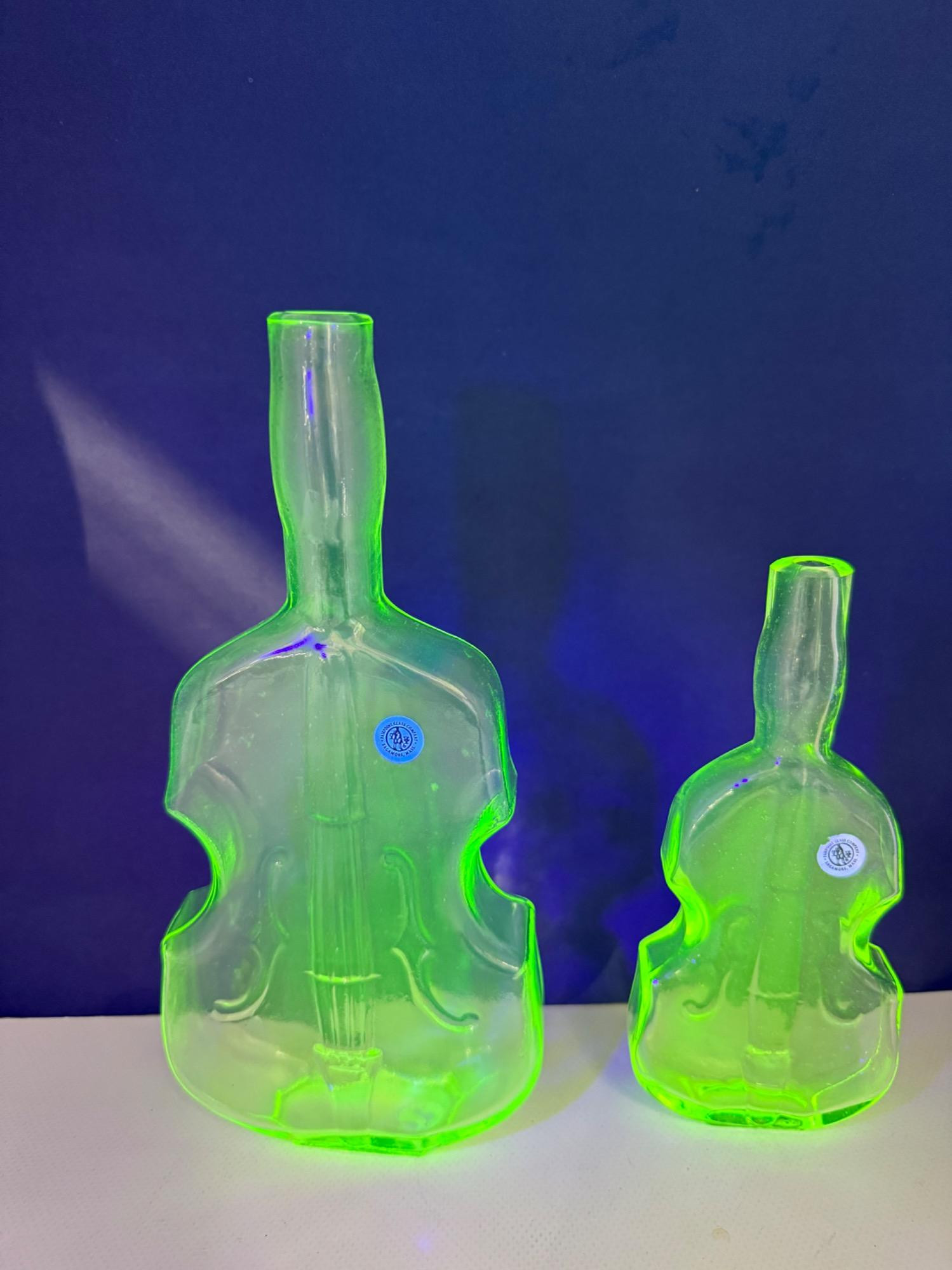 Vintage Vaseline glass violin bottles. Pairpoint glass company from Massachusetts. Bottles are 9.5 and 7in tall Etched makers mark. Glows under blacklight