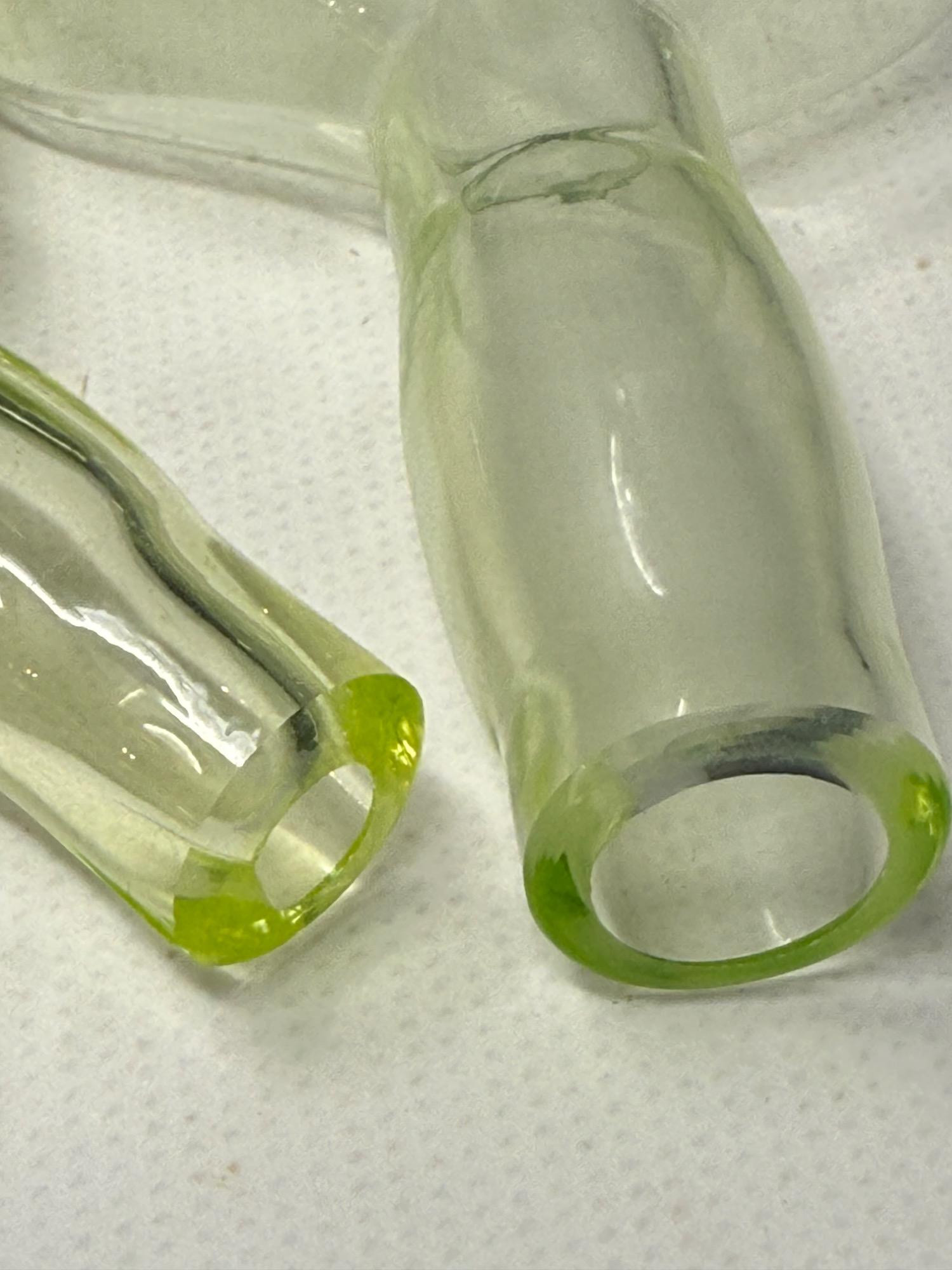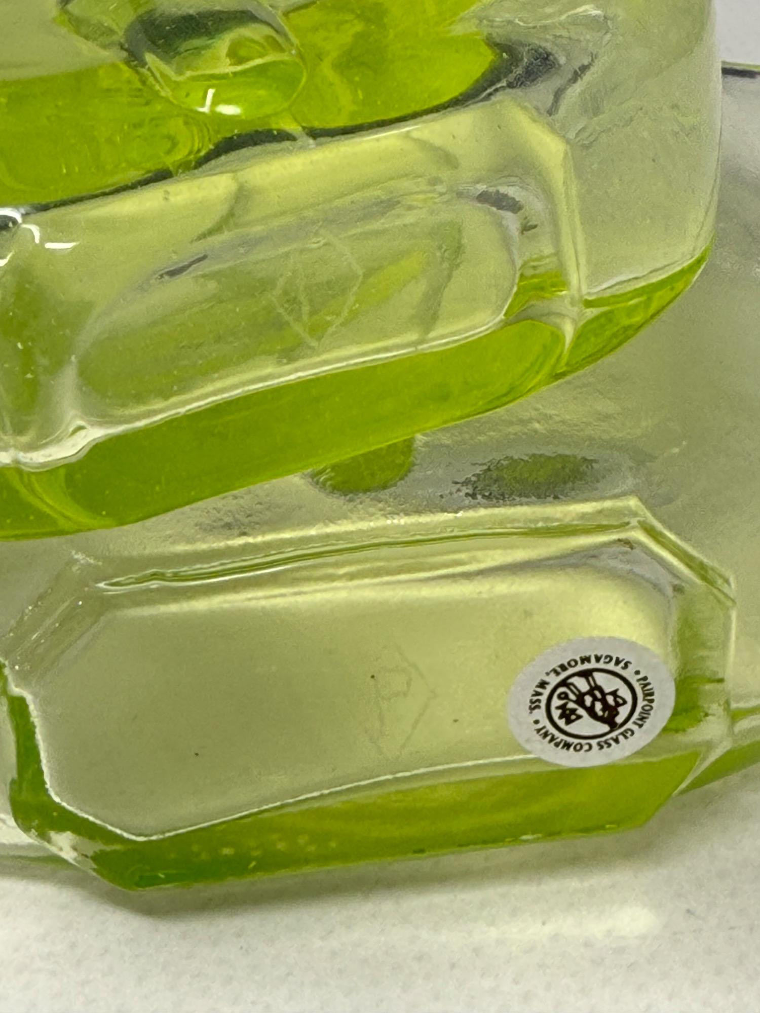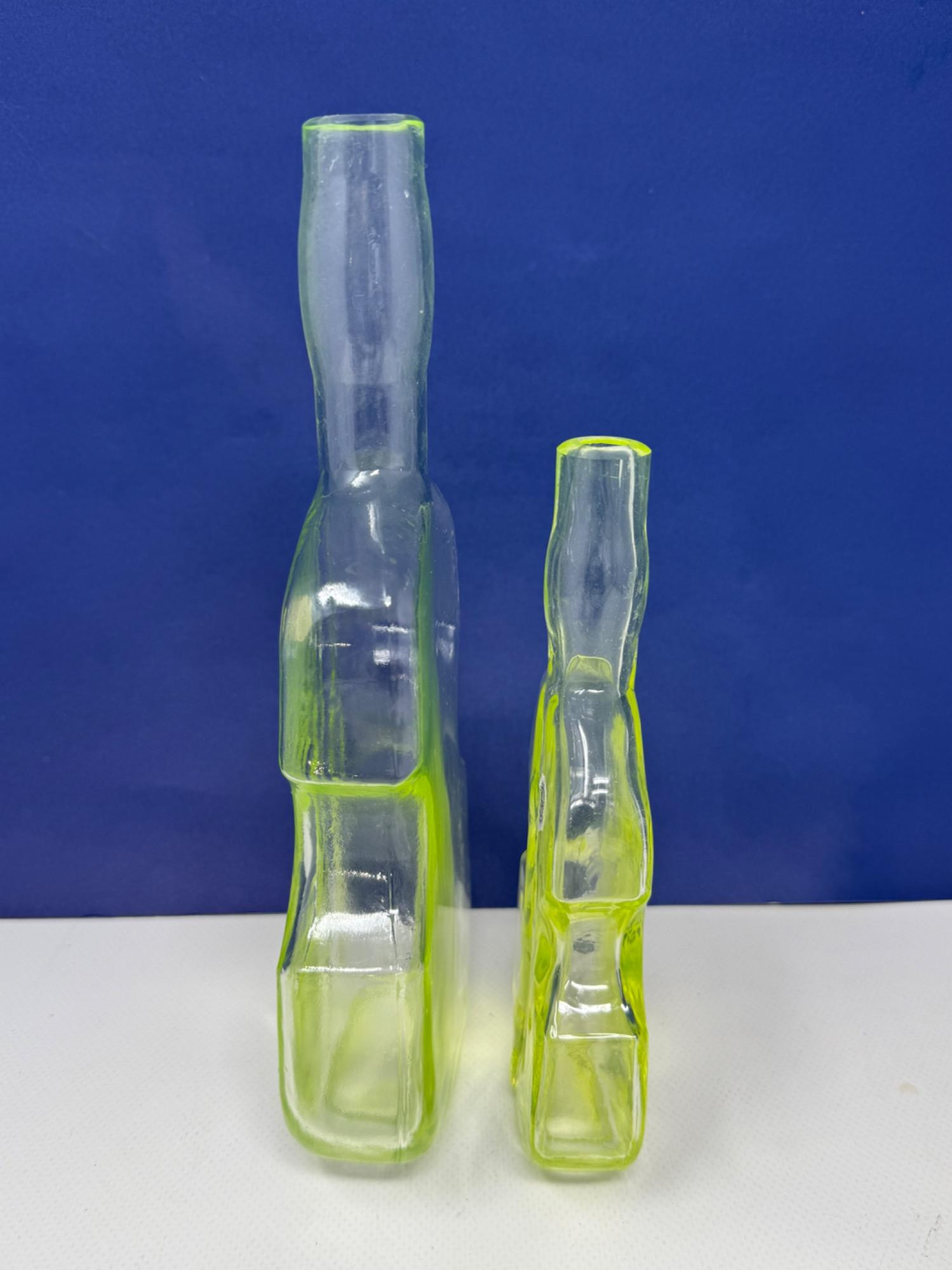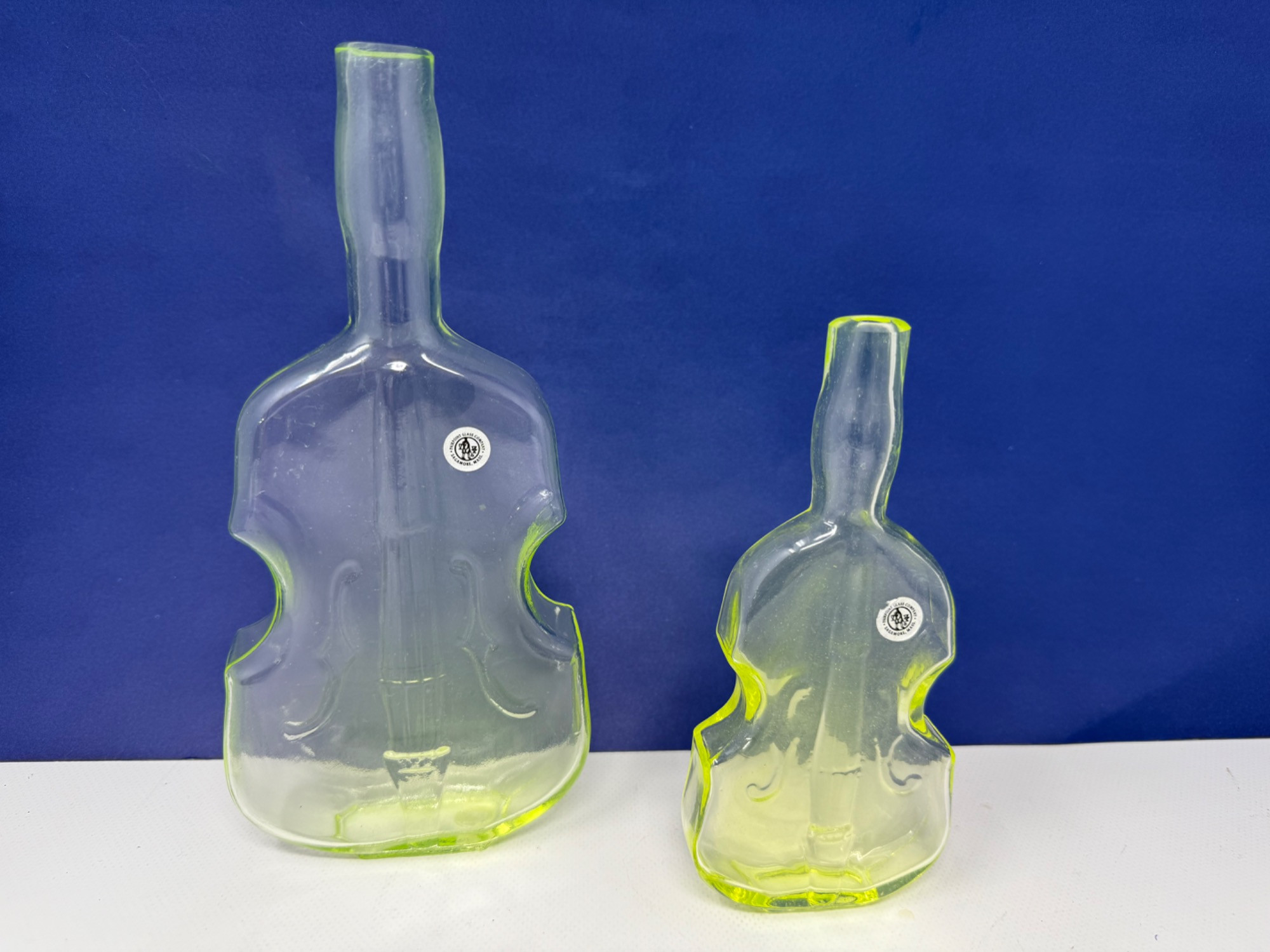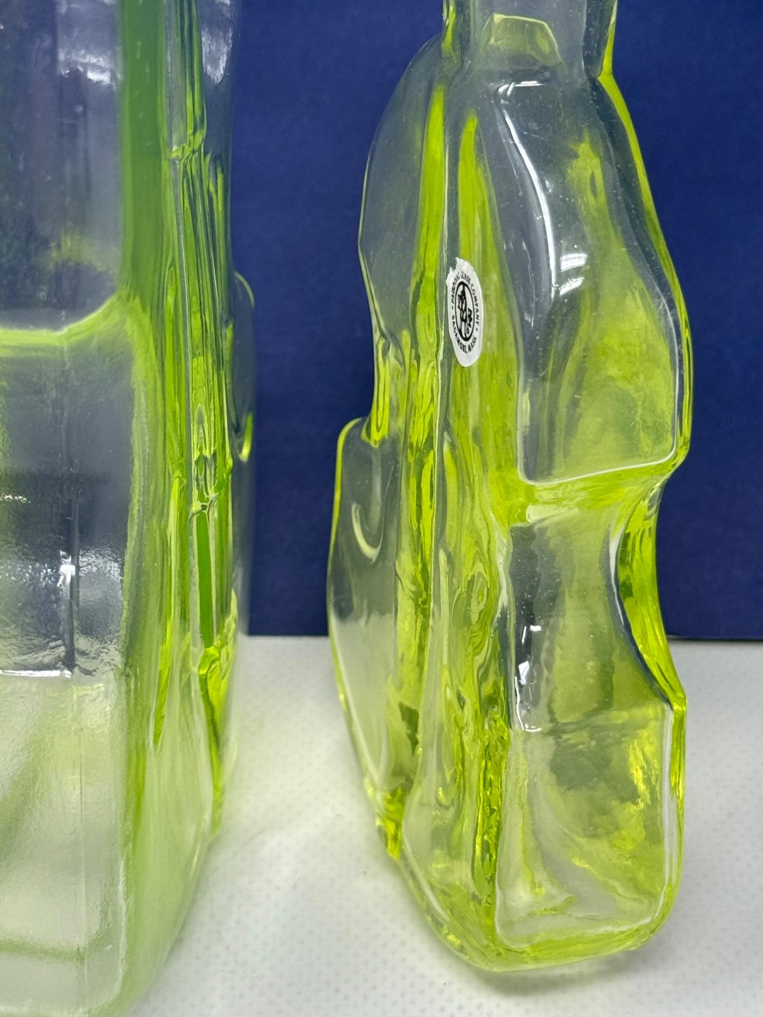 Vintage Vaseline glass violin bottles. Pairpoint glass company from Massachusetts. Bottles are 9.5 and 7in tall Etched makers mark. Glows under blacklight