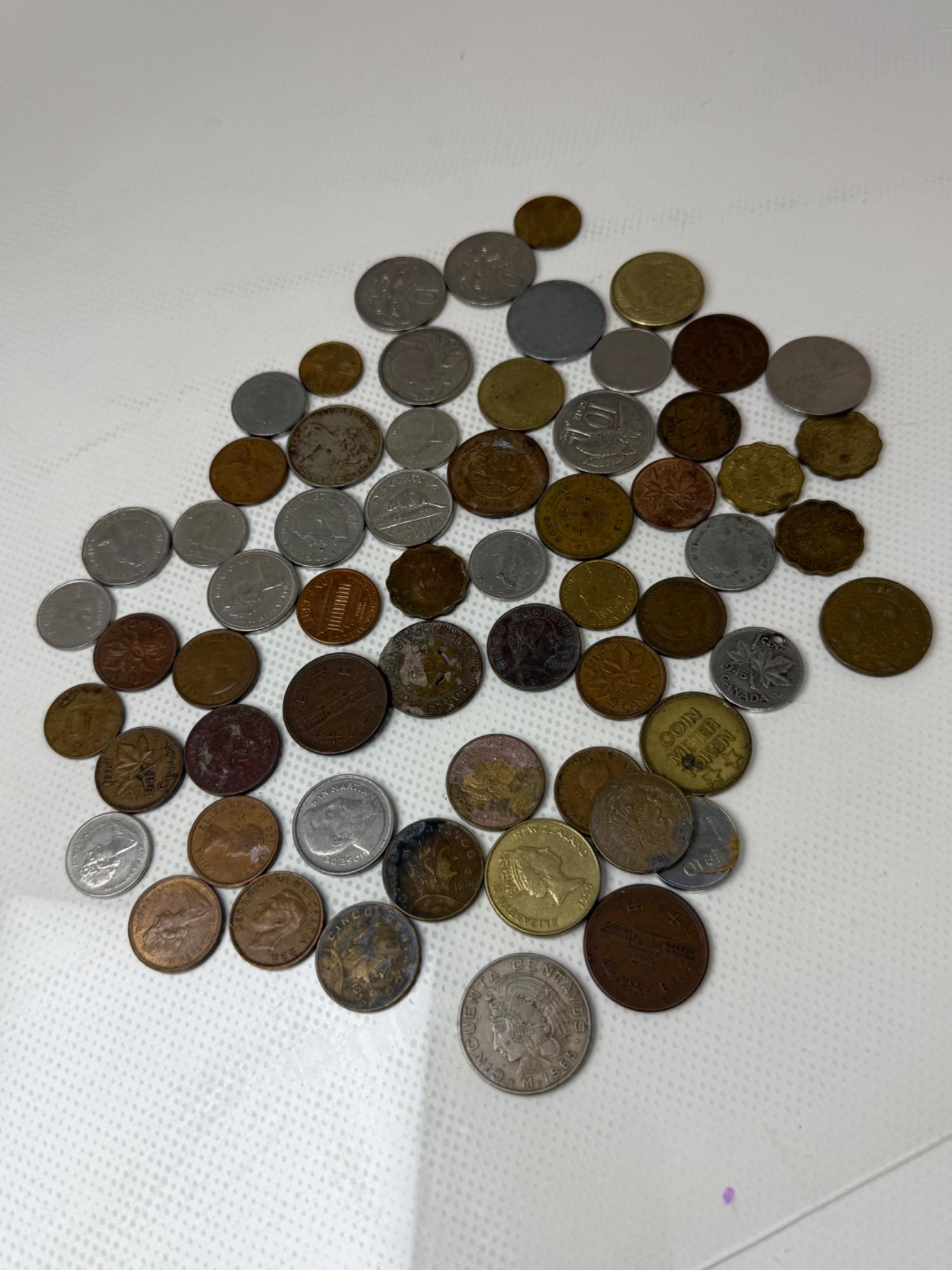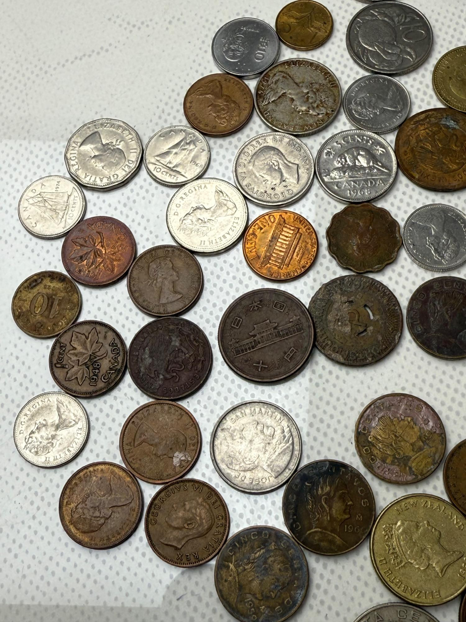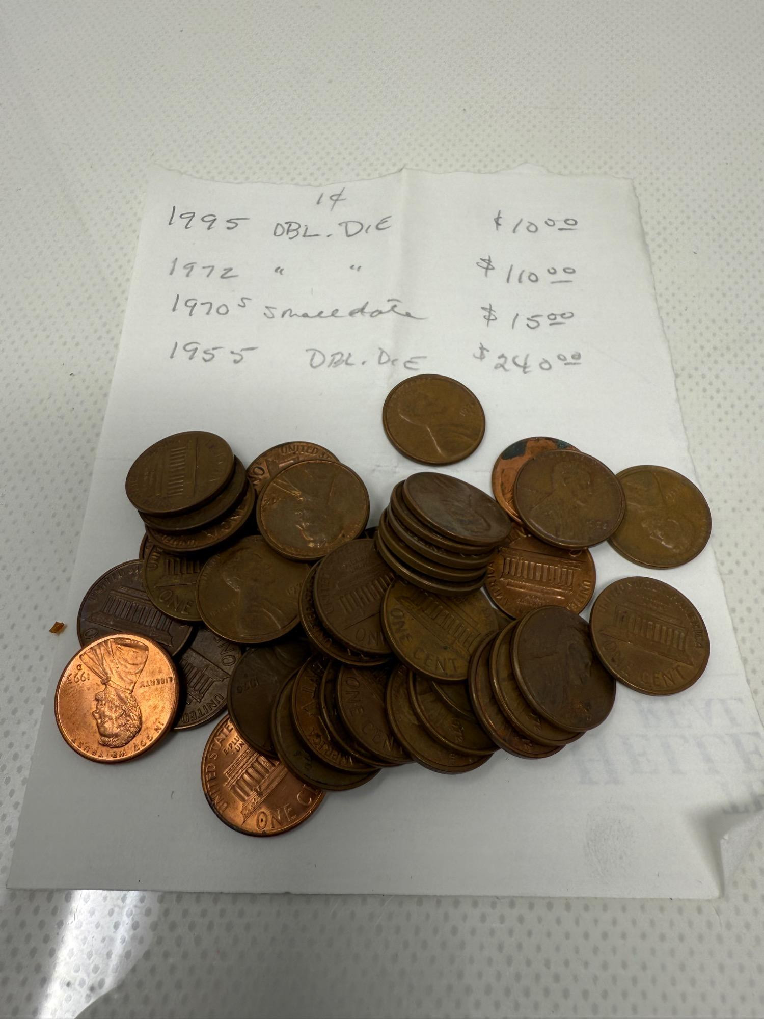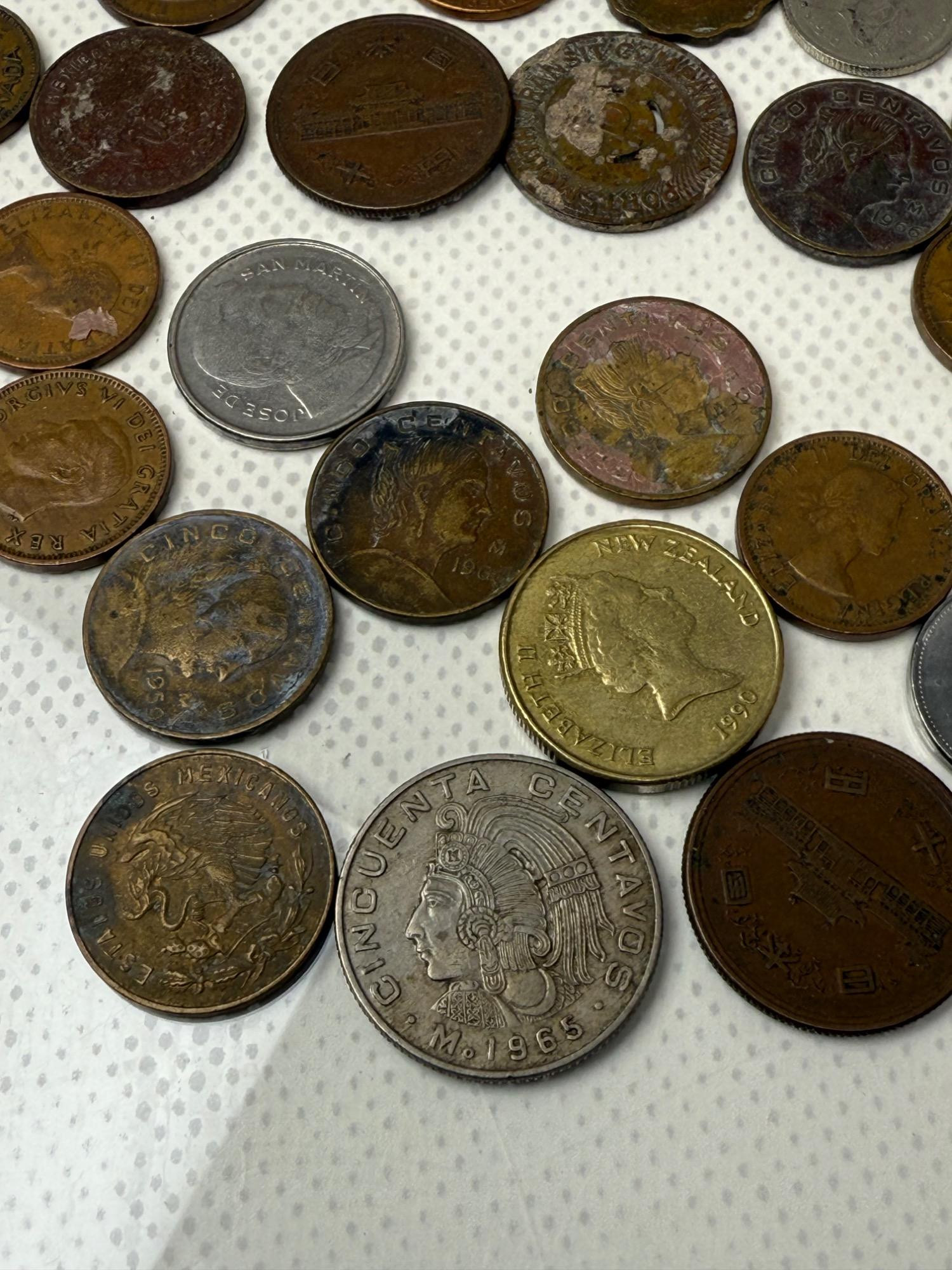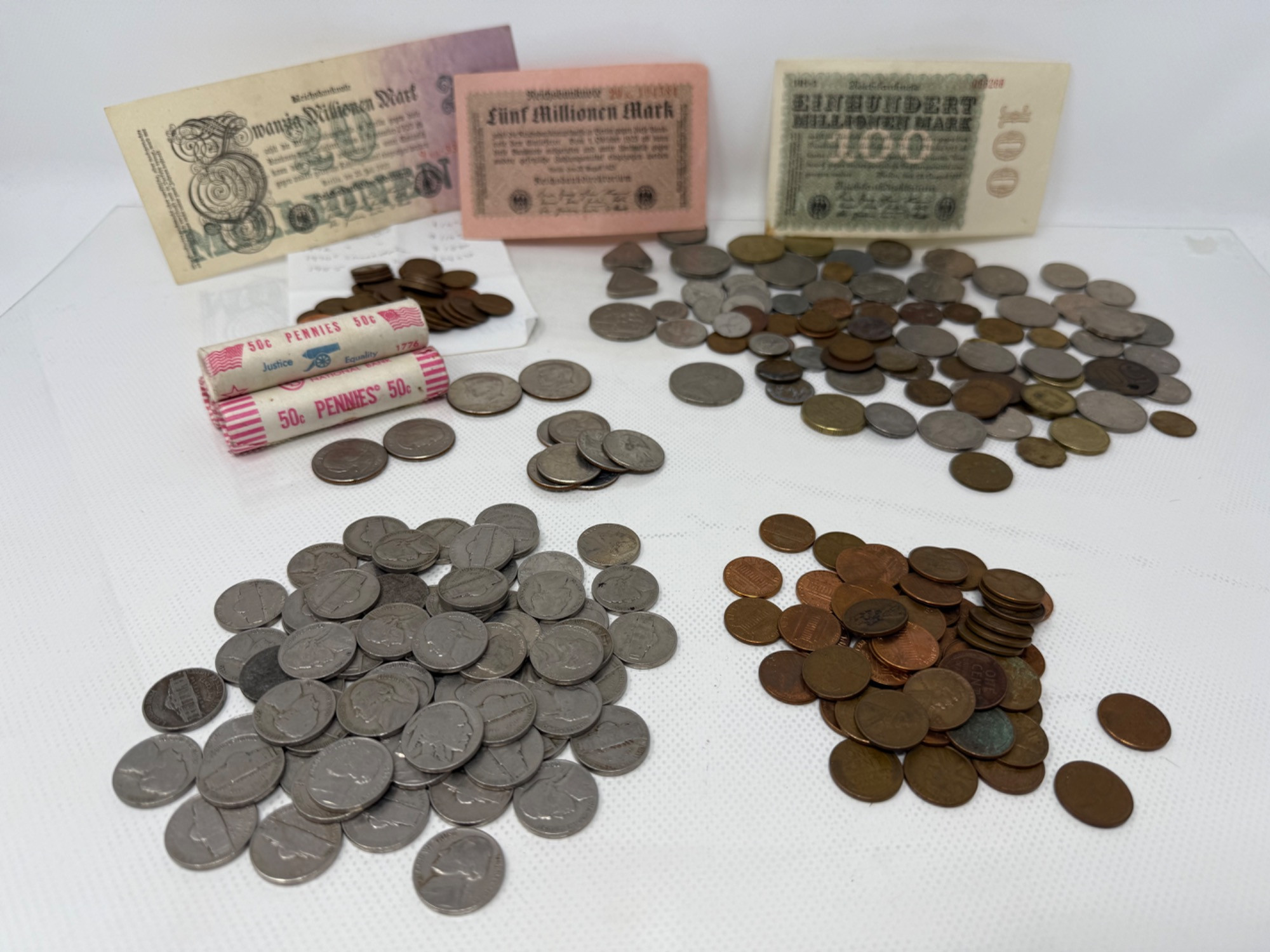 Mix of US and foreign currency. Bills are one sided. Appear to be German. Several Double die pennies. Pile of pennies, nickels, quarters, half dollars and Susan B. Anthony coins Canadian, Mexican, Chinese, Cook Islands and more countries represented.