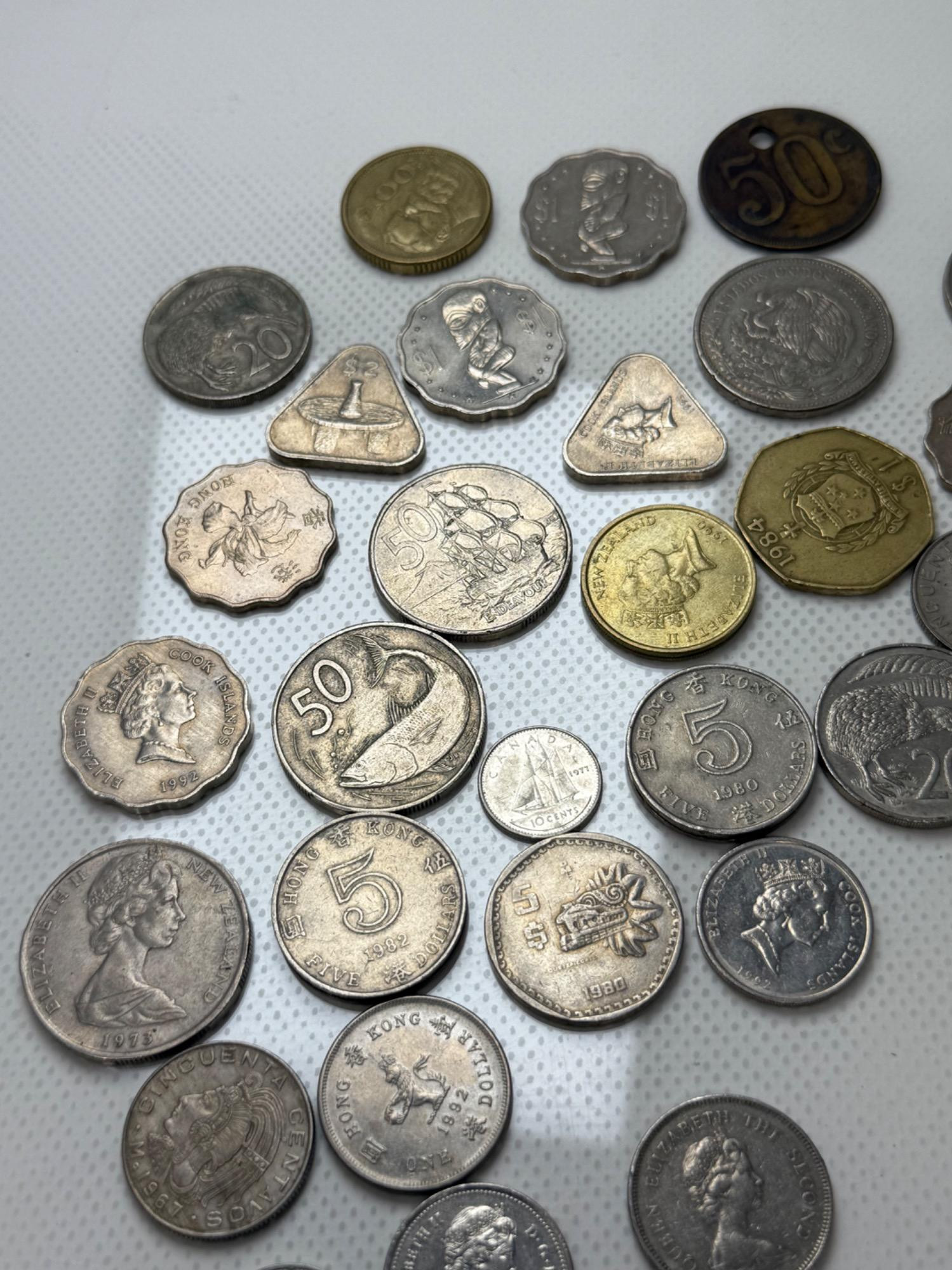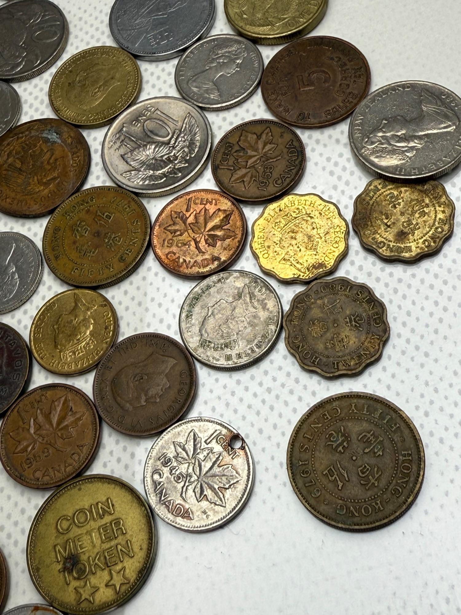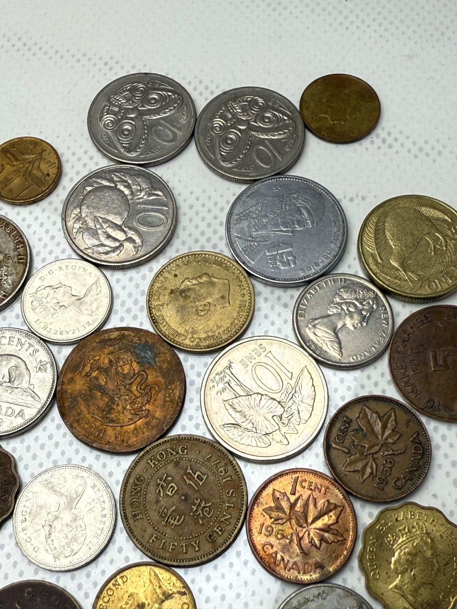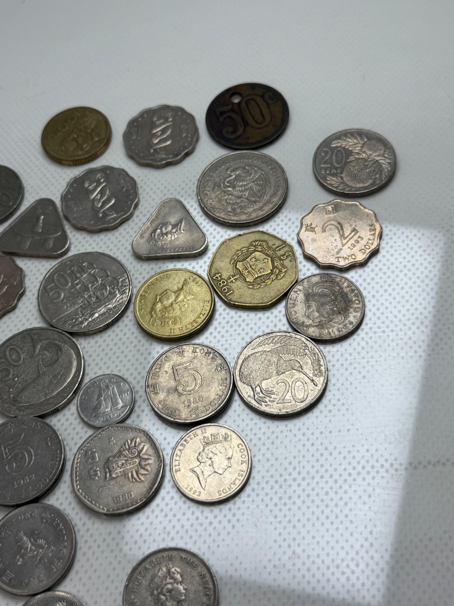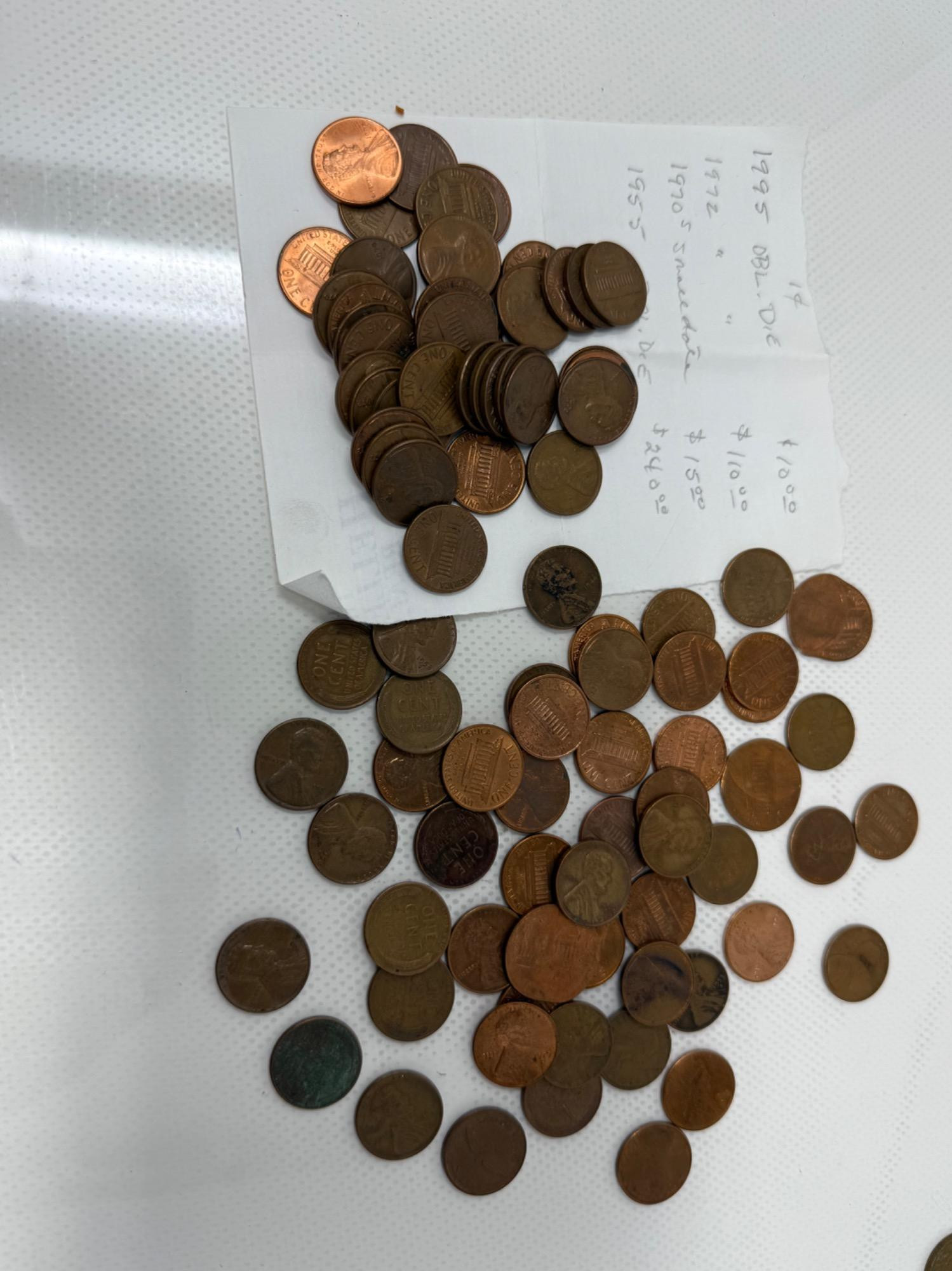 Mix of US and foreign currency. Bills are one sided. Appear to be German. Several Double die pennies. Pile of pennies, nickels, quarters, half dollars and Susan B. Anthony coins Canadian, Mexican, Chinese, Cook Islands and more countries represented.