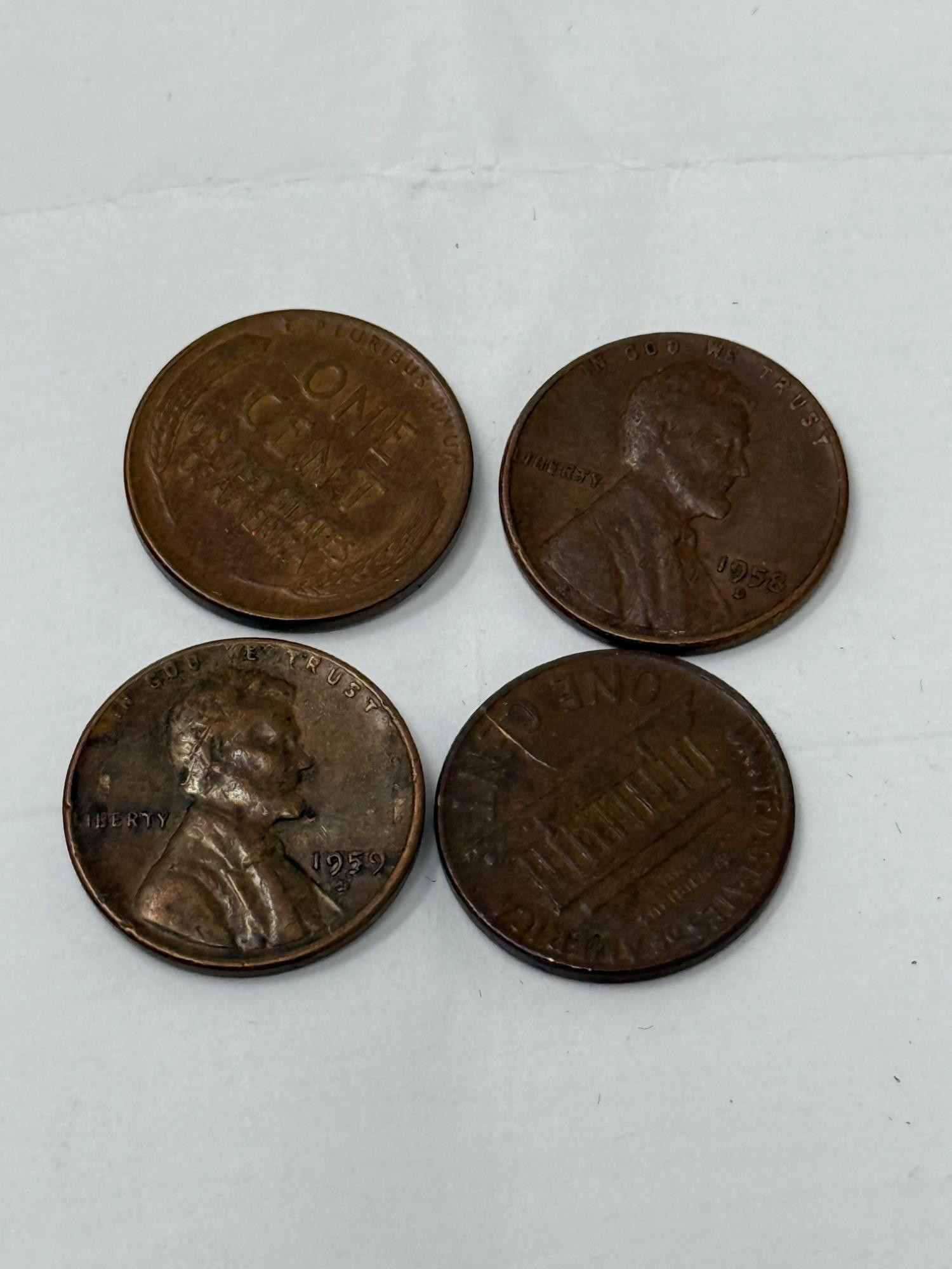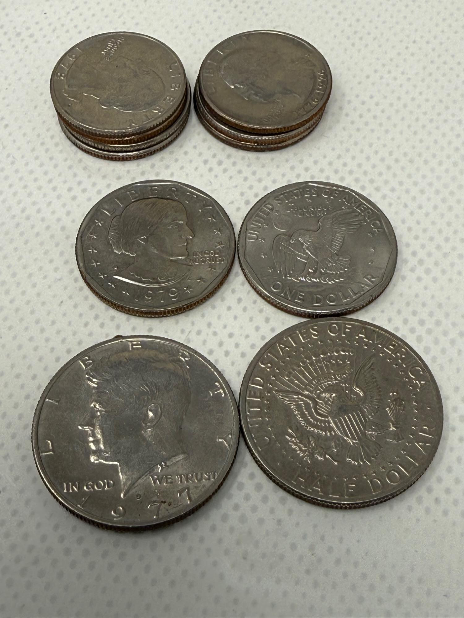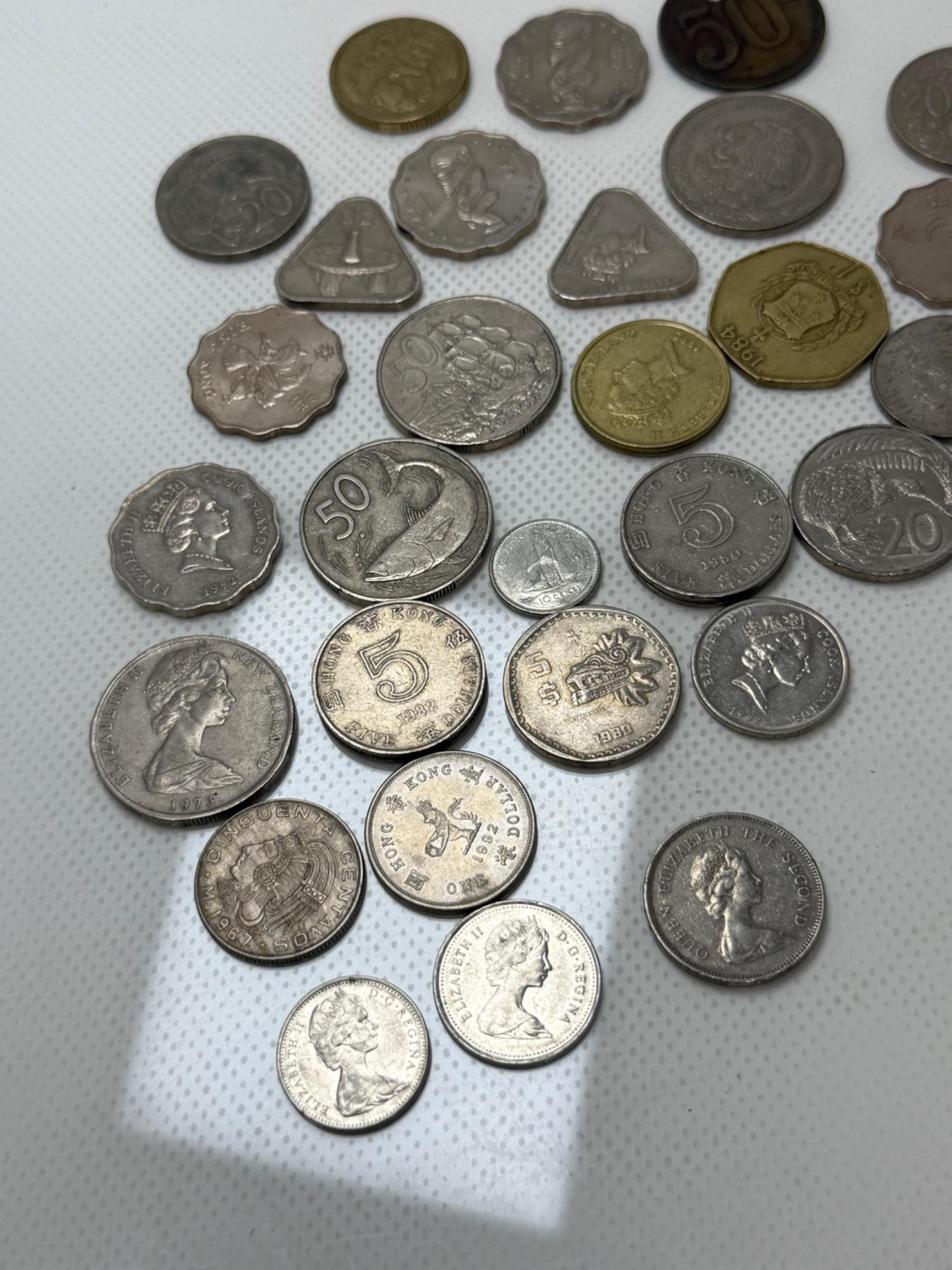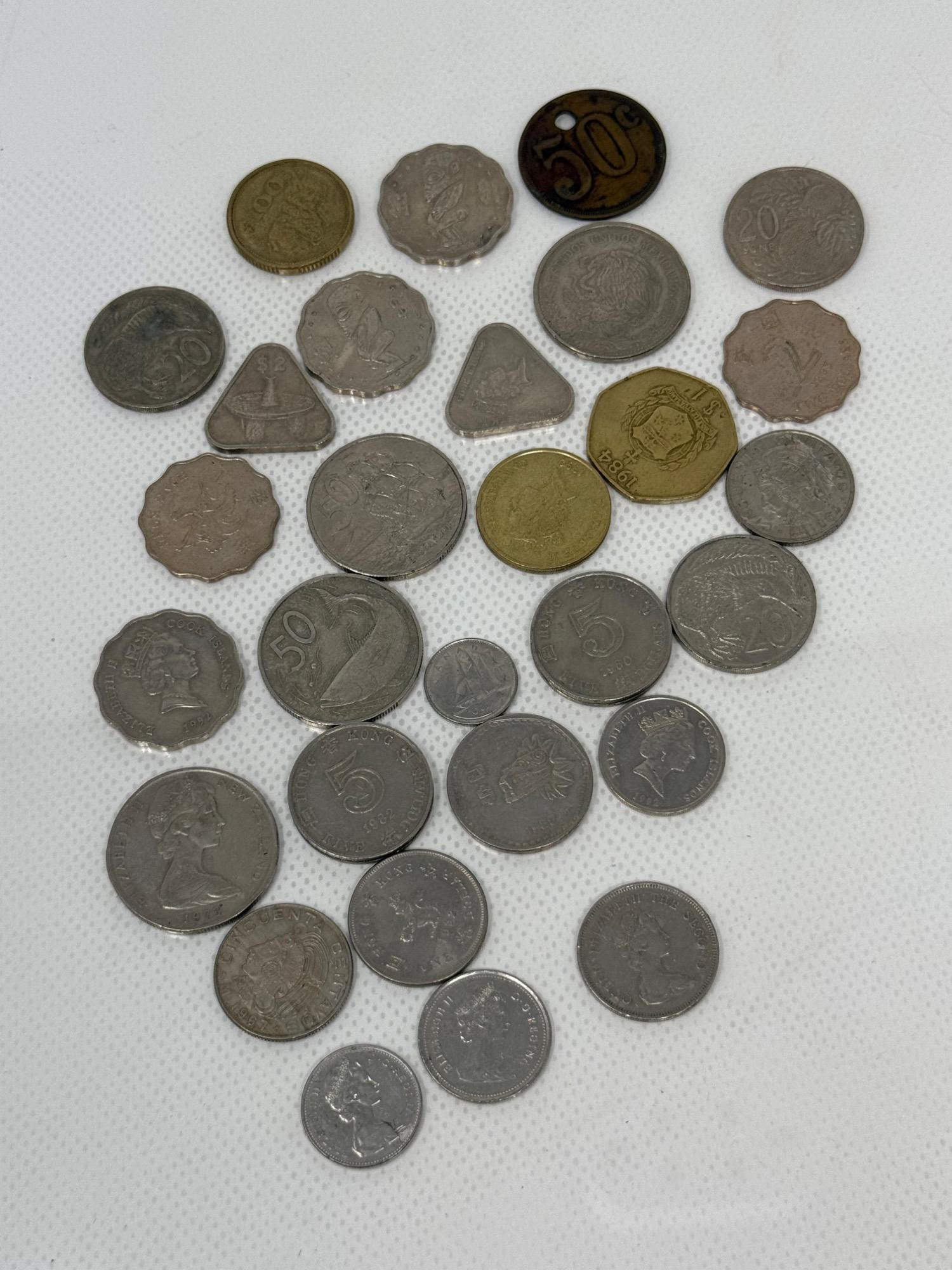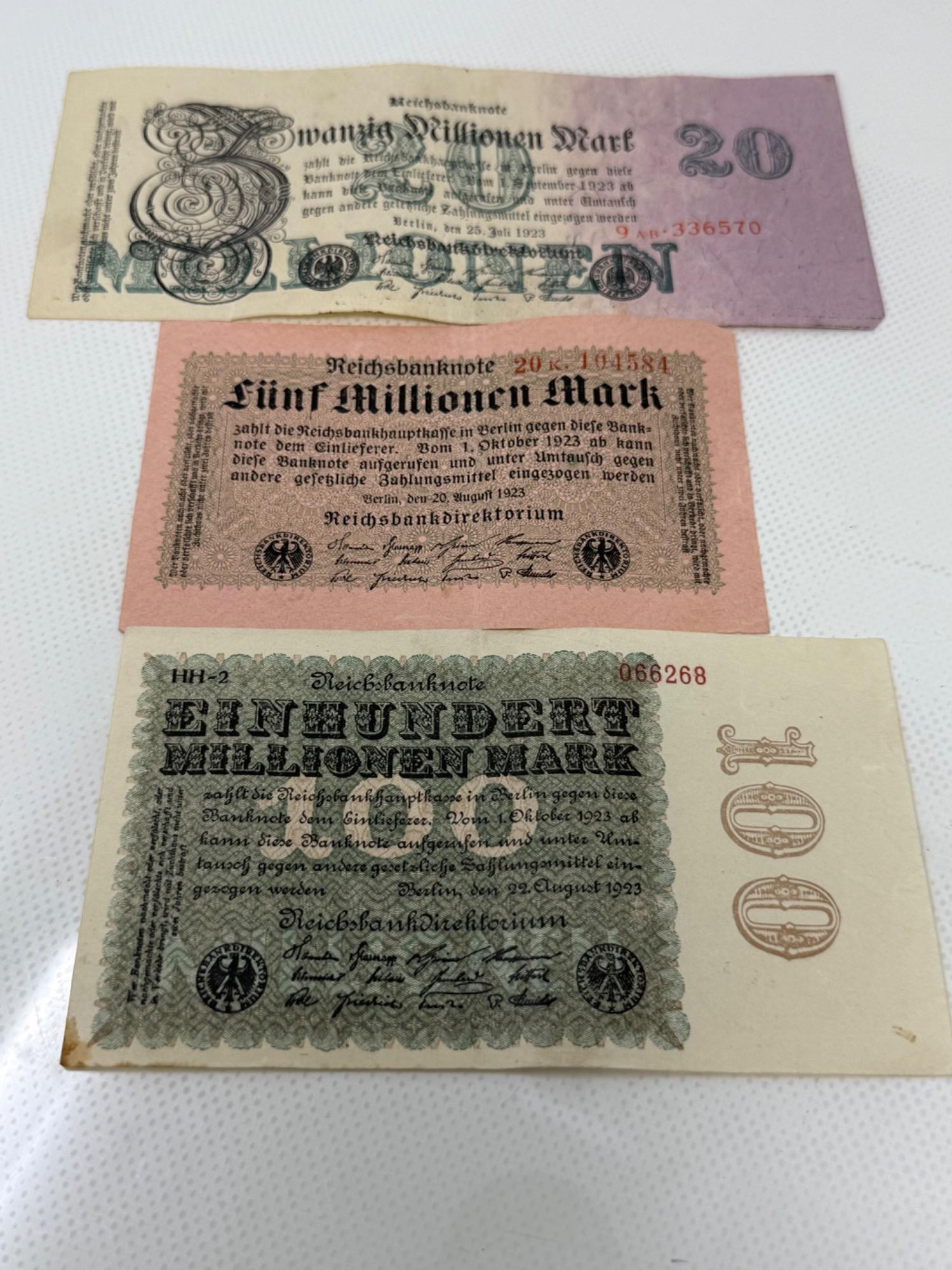 Mix of US and foreign currency. Bills are one sided. Appear to be German. Several Double die pennies. Pile of pennies, nickels, quarters, half dollars and Susan B. Anthony coins Canadian, Mexican, Chinese, Cook Islands and more countries represented.