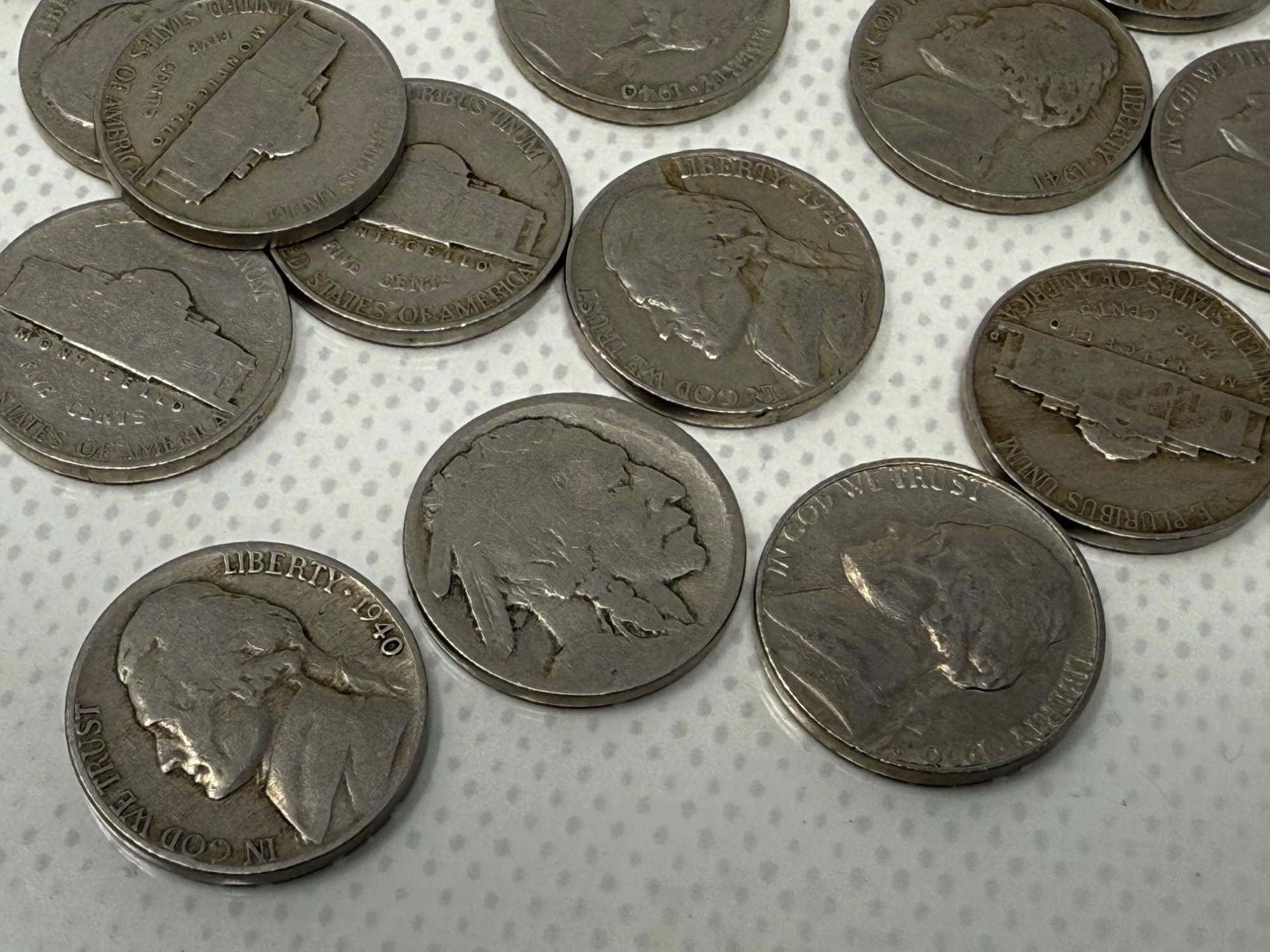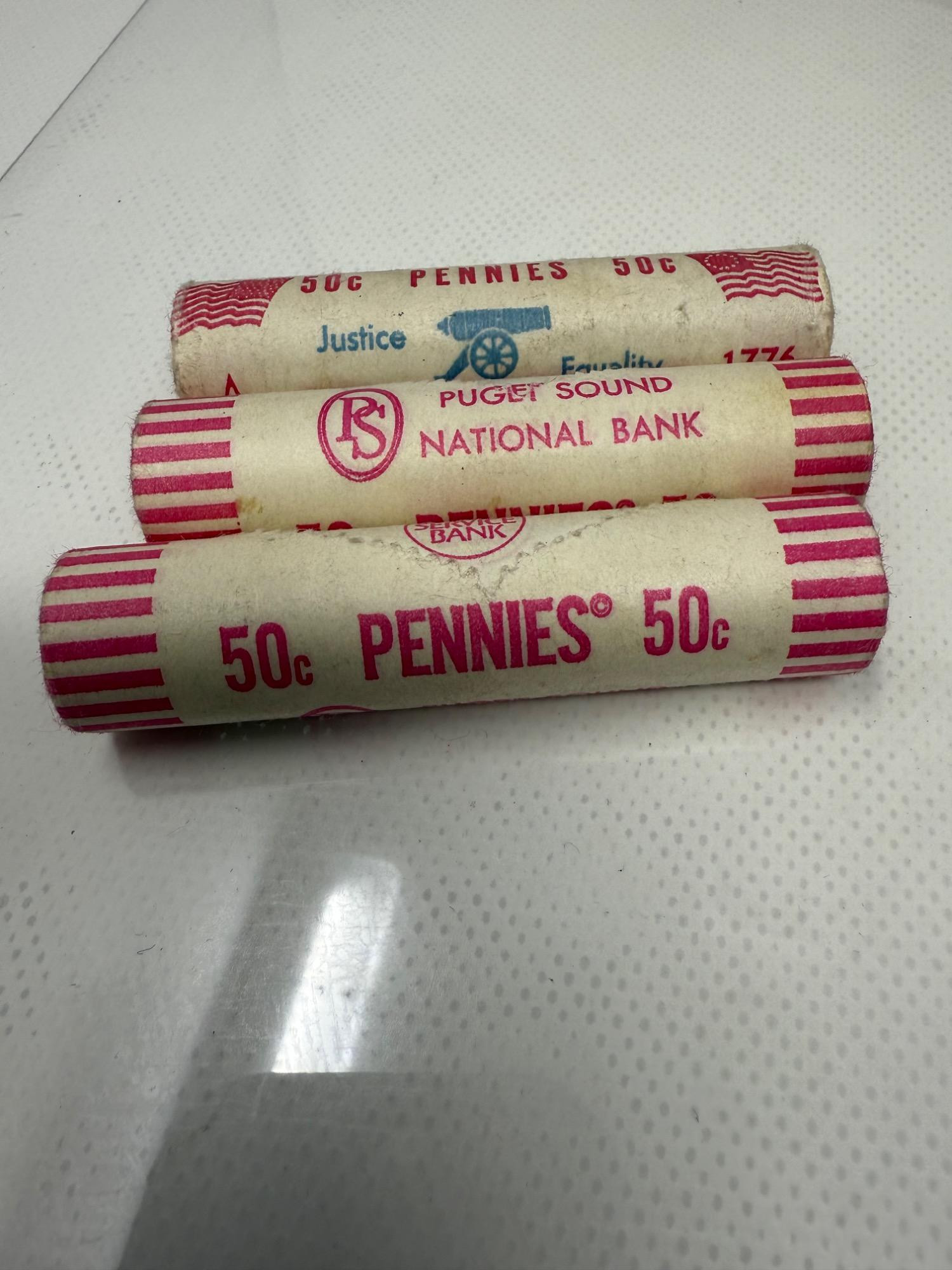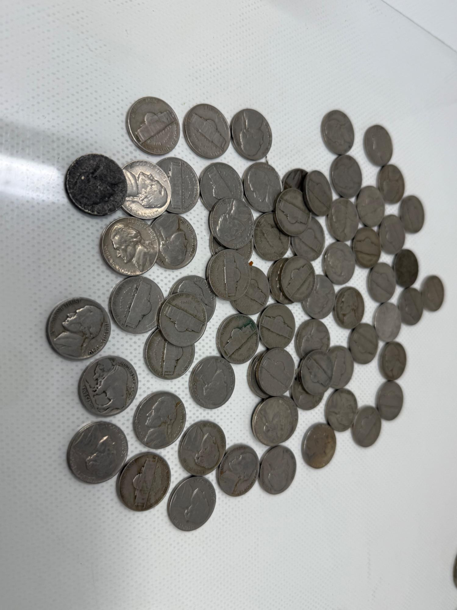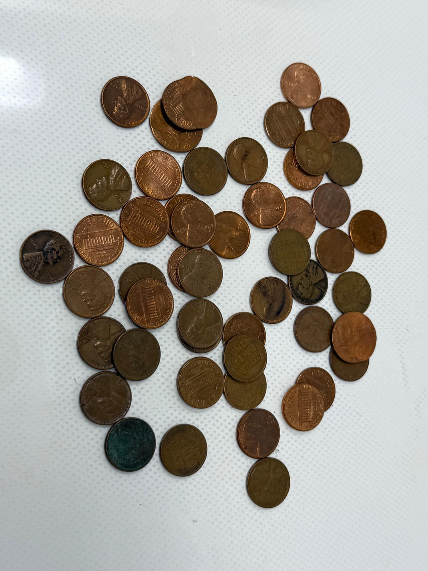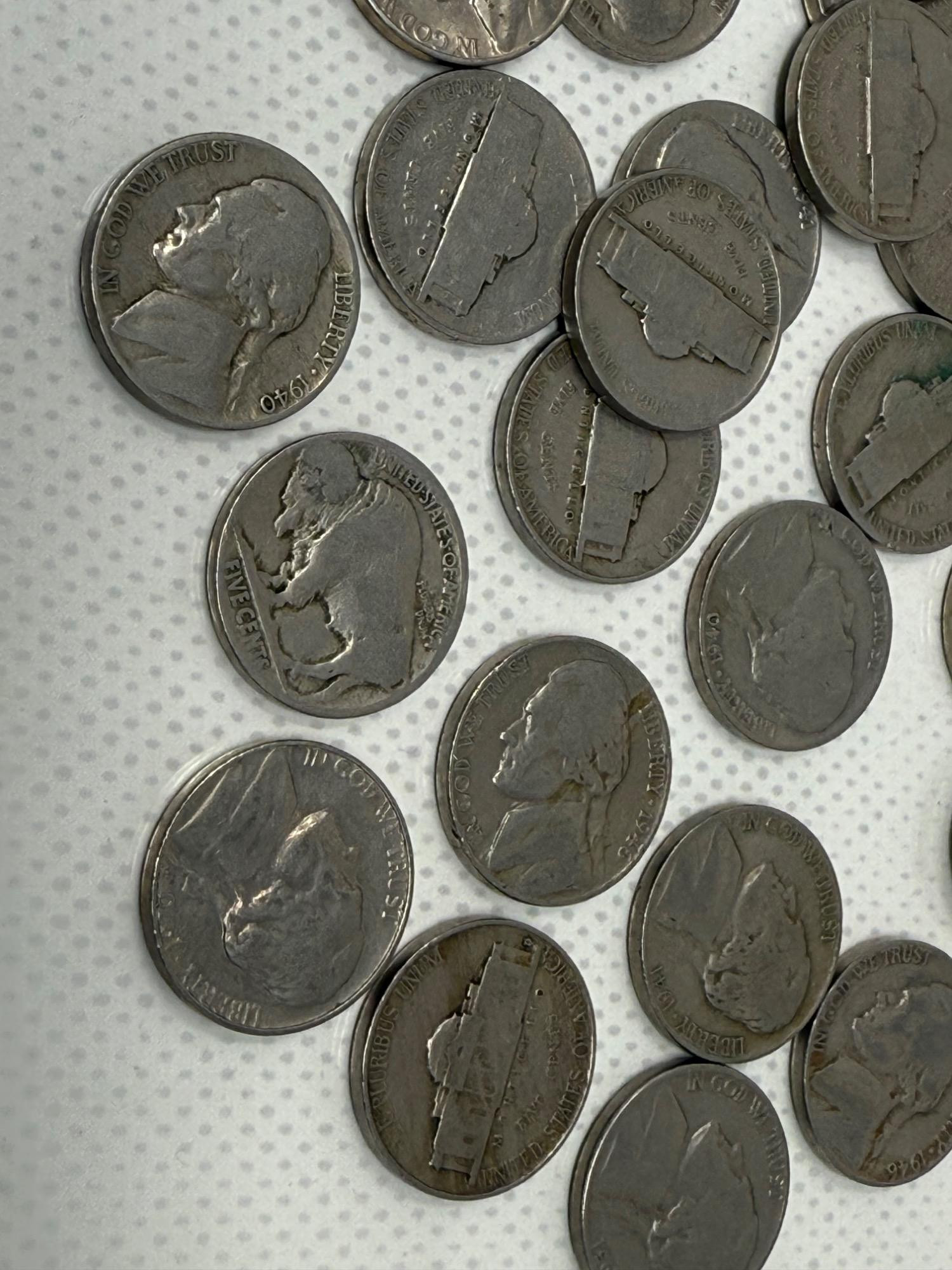 Mix of US and foreign currency. Bills are one sided. Appear to be German. Several Double die pennies. Pile of pennies, nickels, quarters, half dollars and Susan B. Anthony coins Canadian, Mexican, Chinese, Cook Islands and more countries represented.