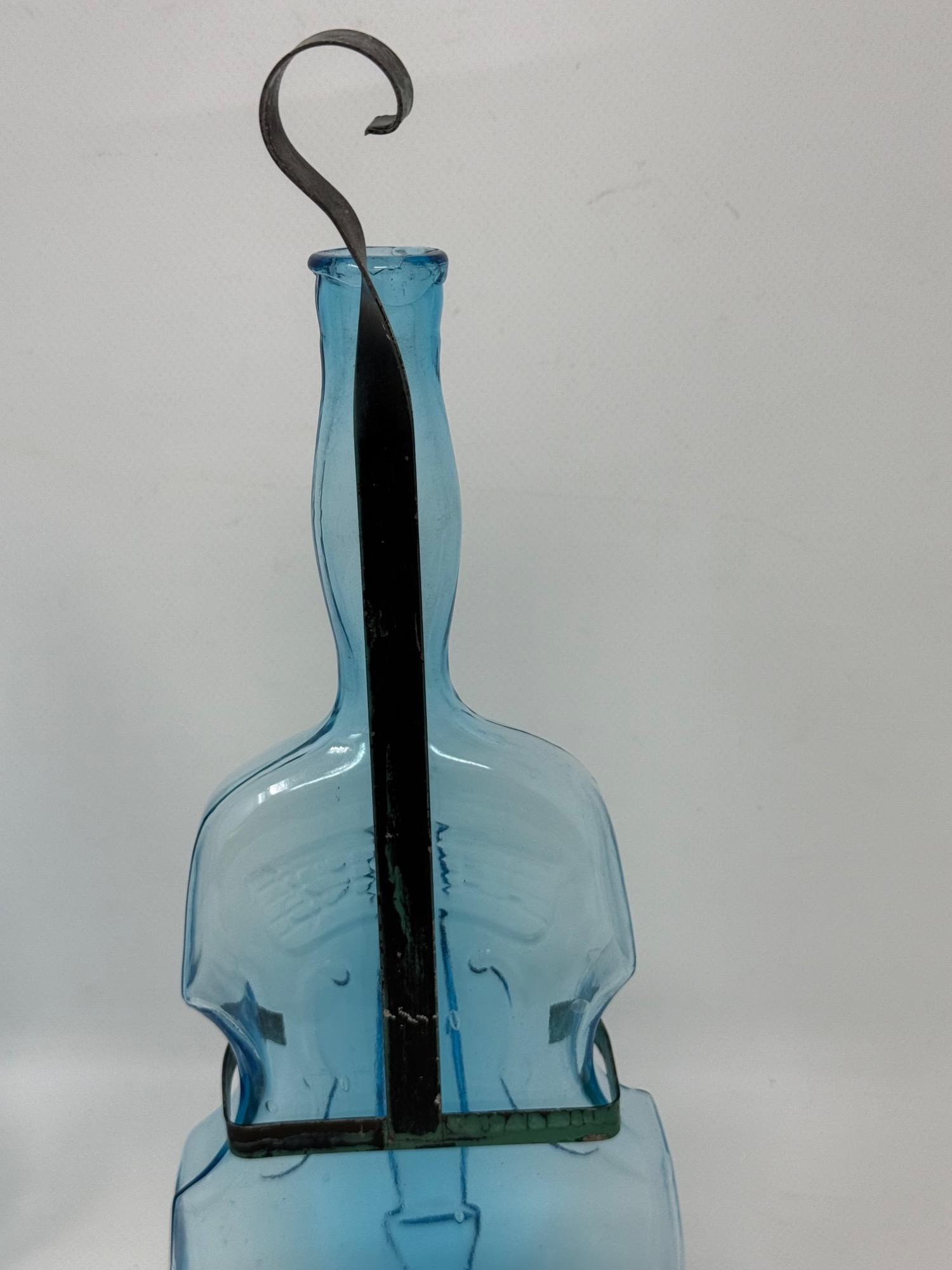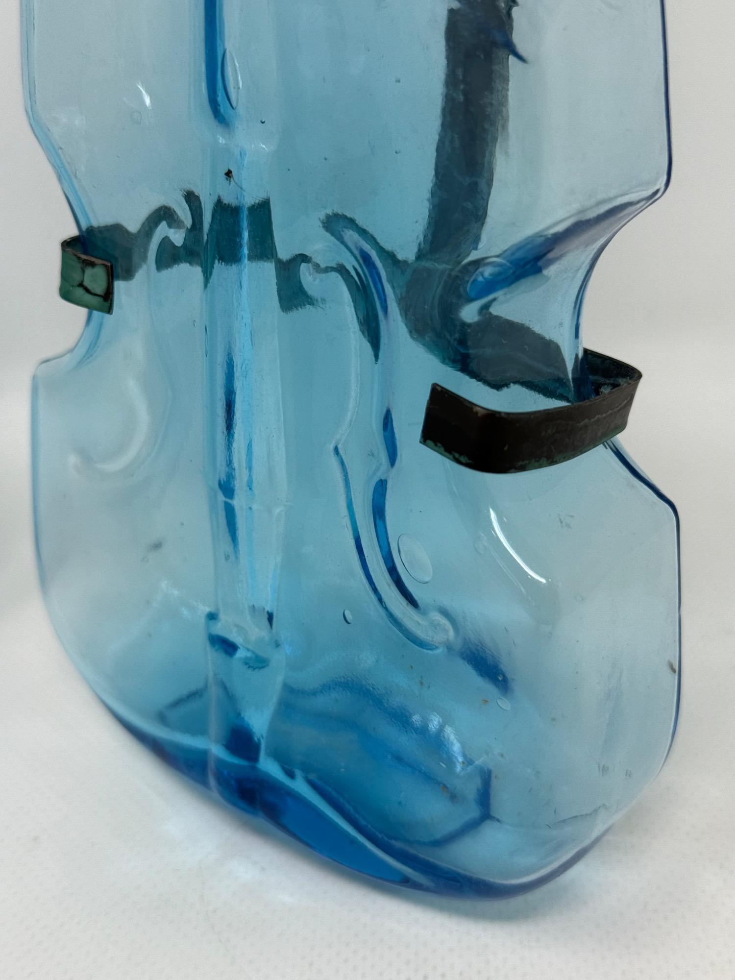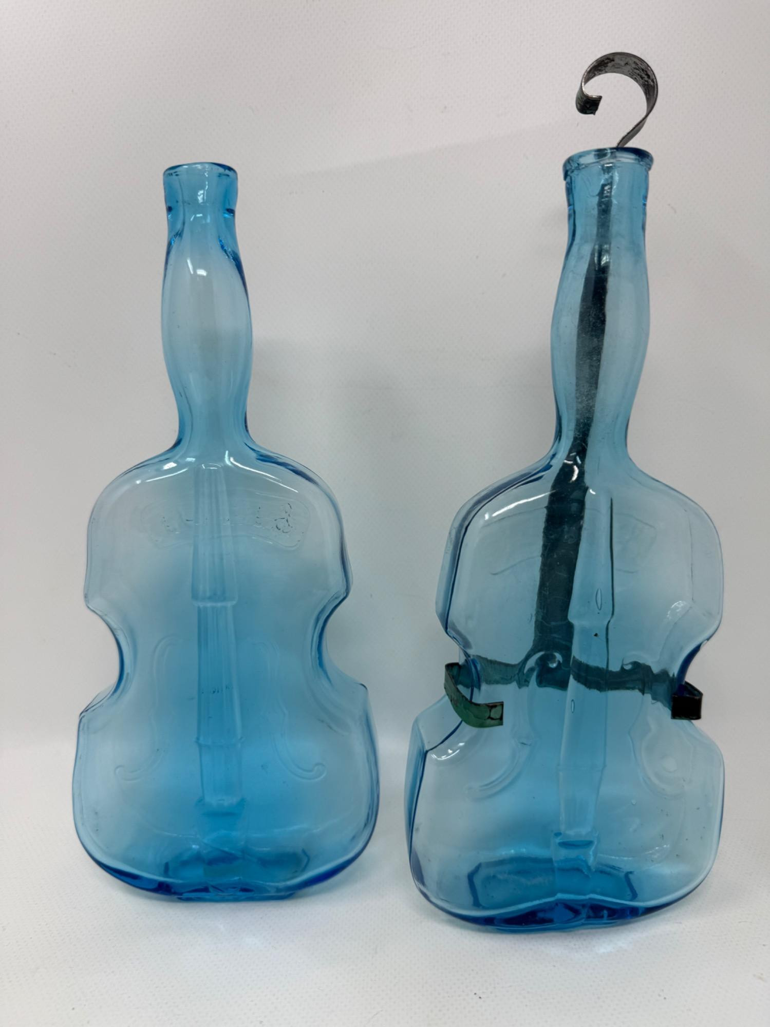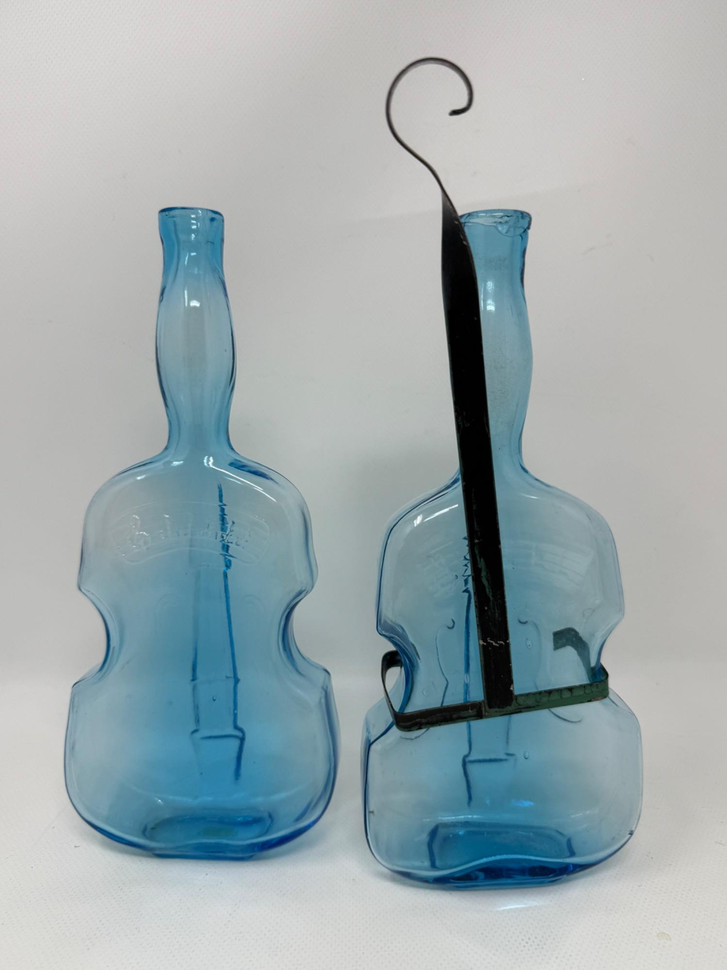 Vintage Light blue violin bottles. One with attached mounting hook. Maker unknown. Music sheet detail on back.