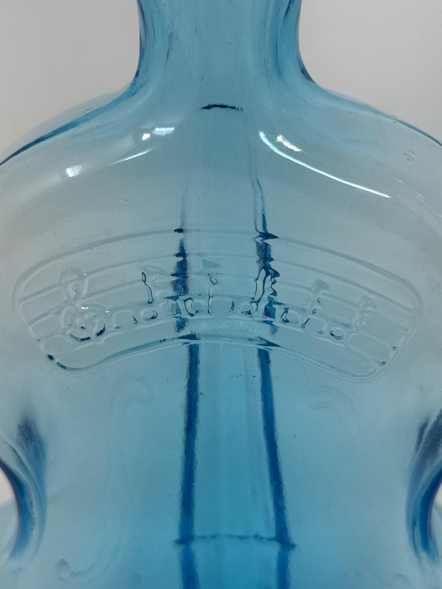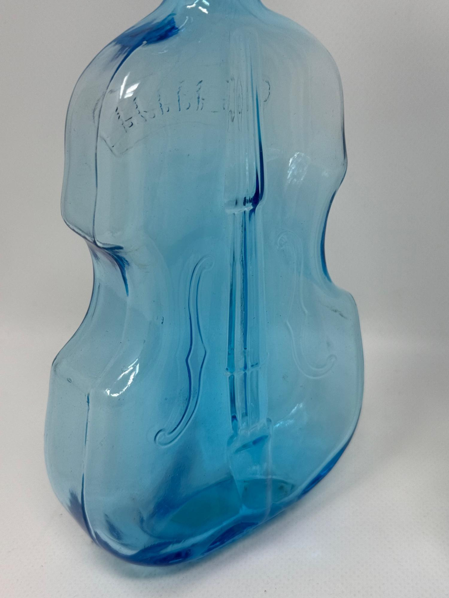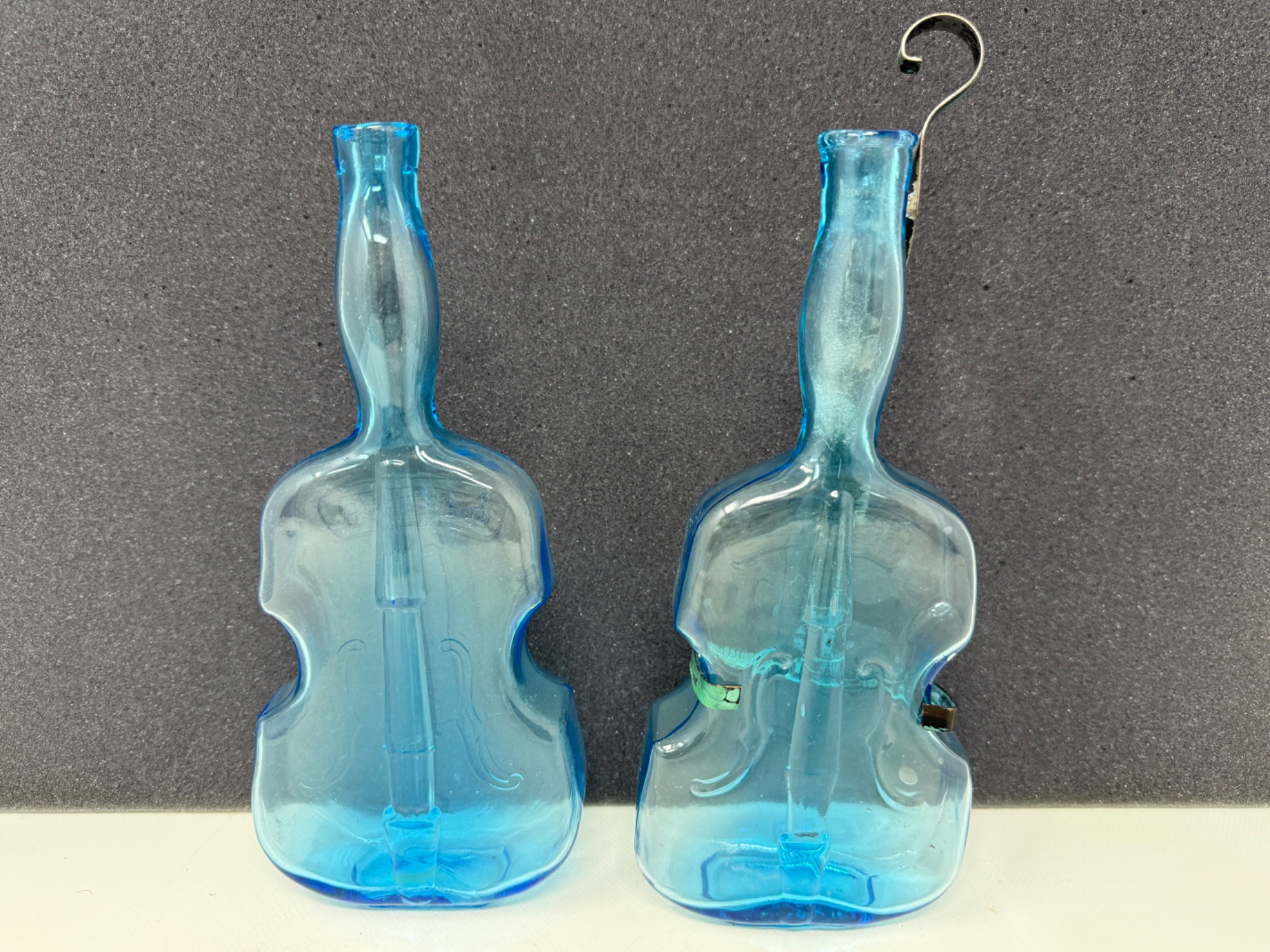 Vintage Light blue violin bottles. One with attached mounting hook. Maker unknown. Music sheet detail on back.
