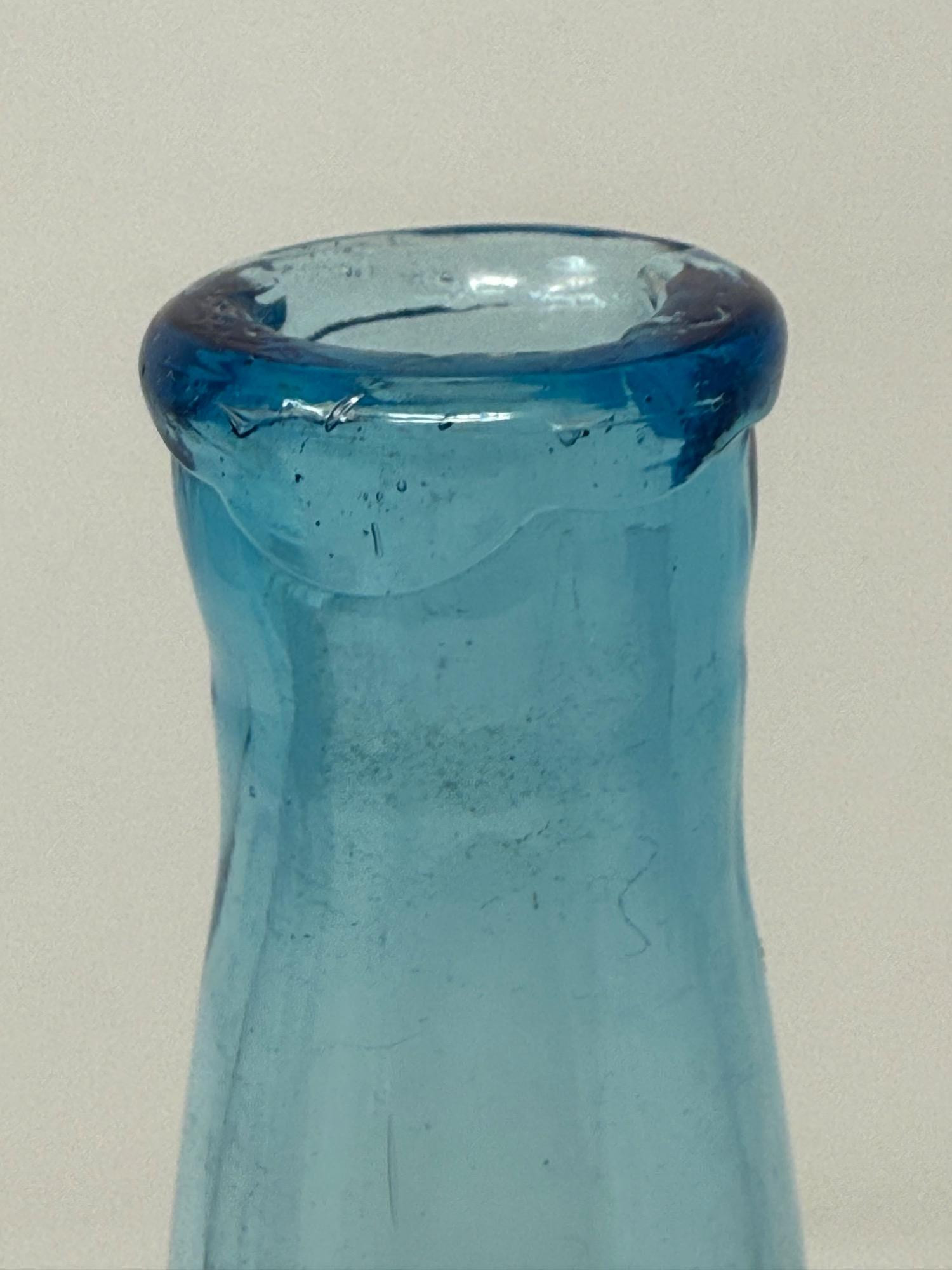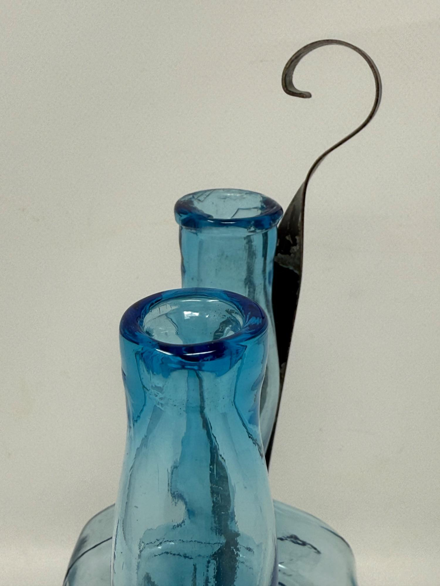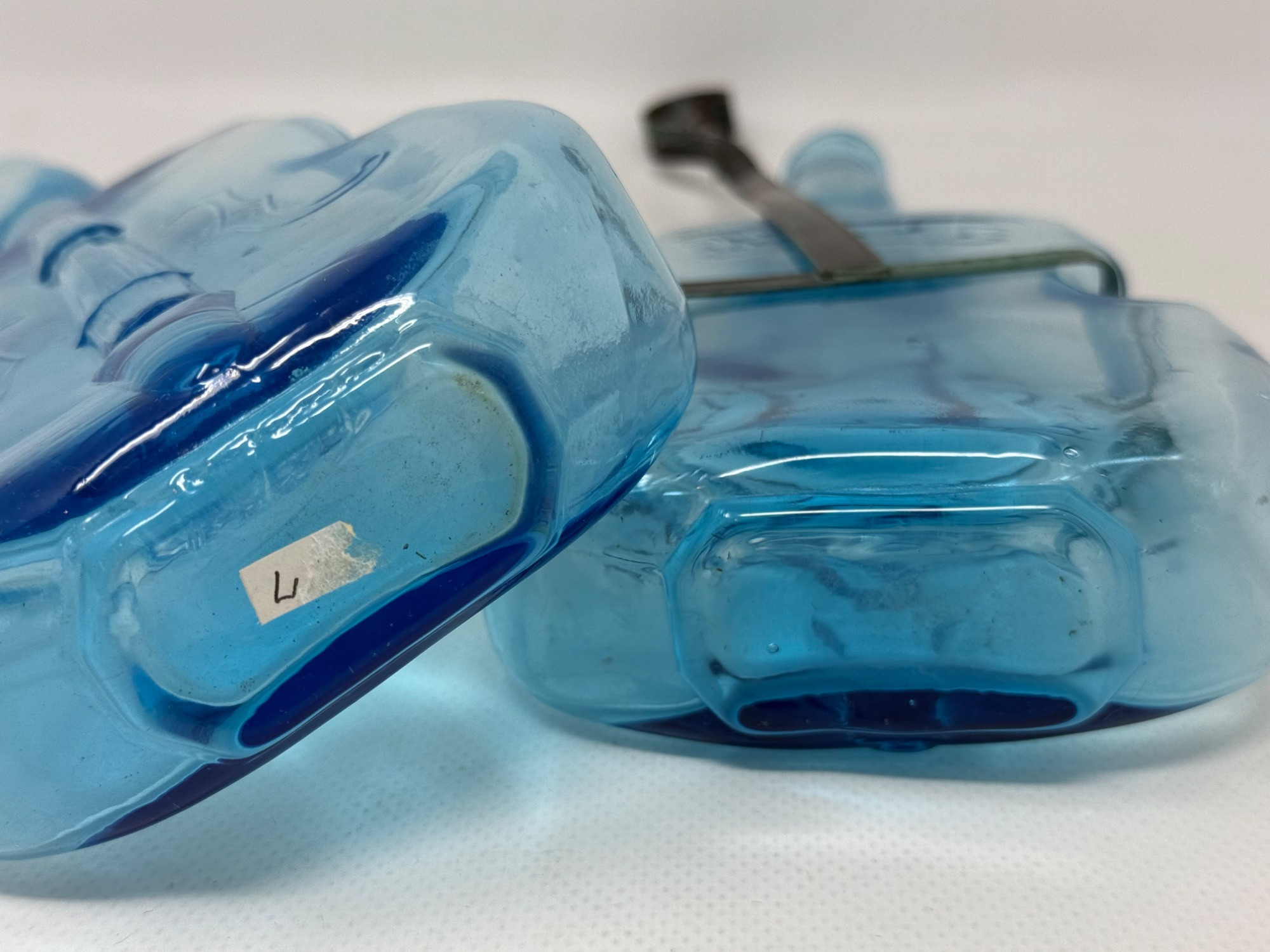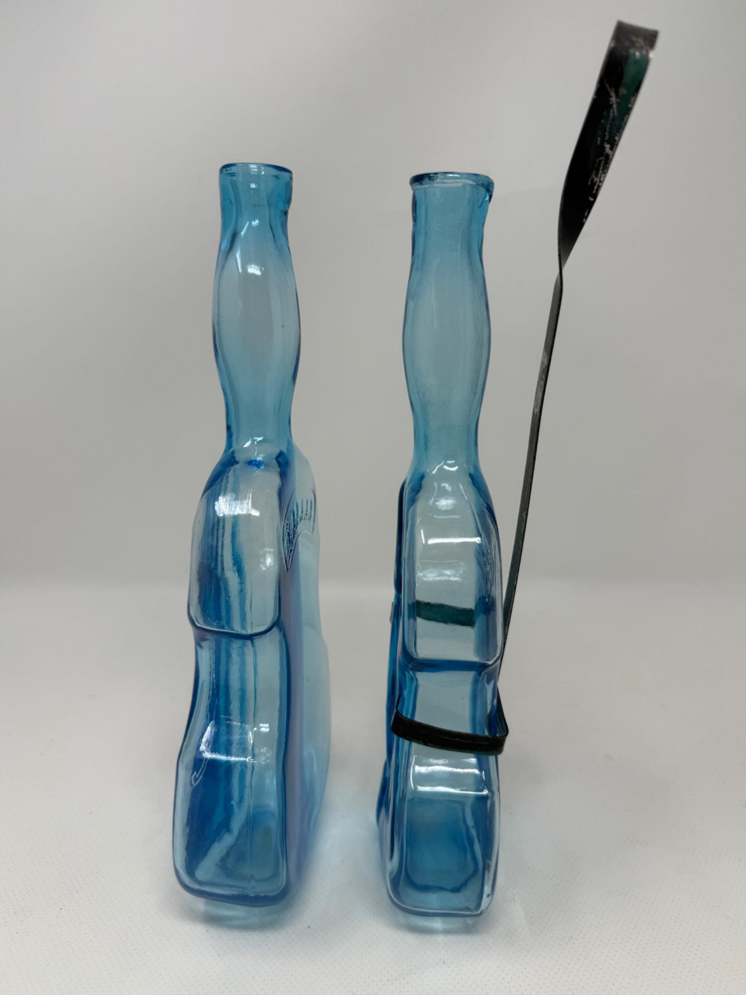 Vintage Light blue violin bottles. One with attached mounting hook. Maker unknown. Music sheet detail on back.