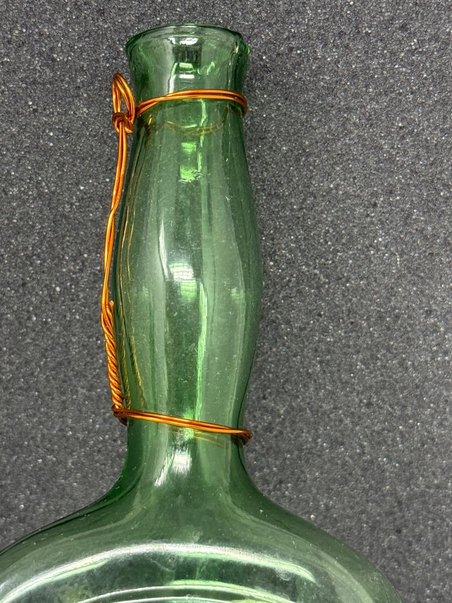Vintage green violin bottles. One with copper wire. Dell glass maker One made in Japan.