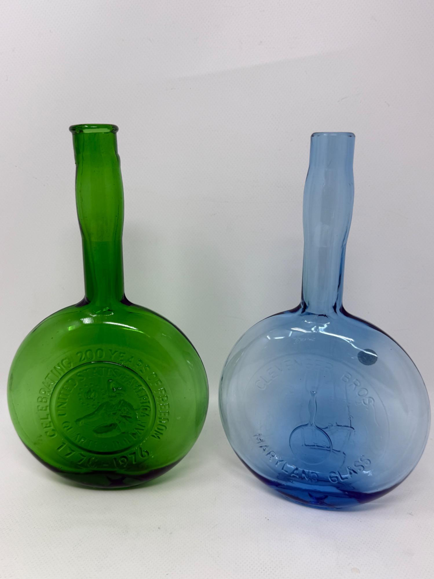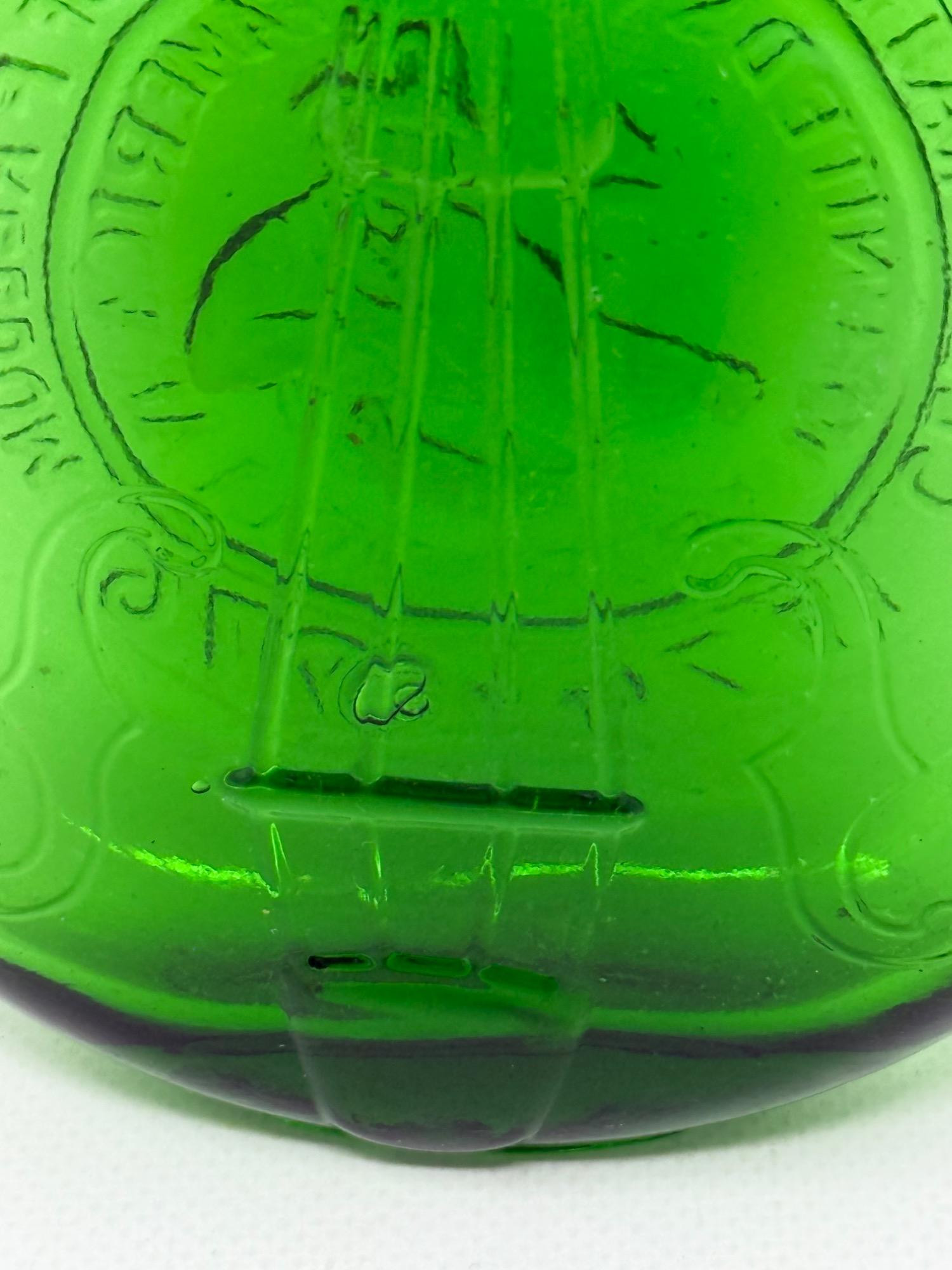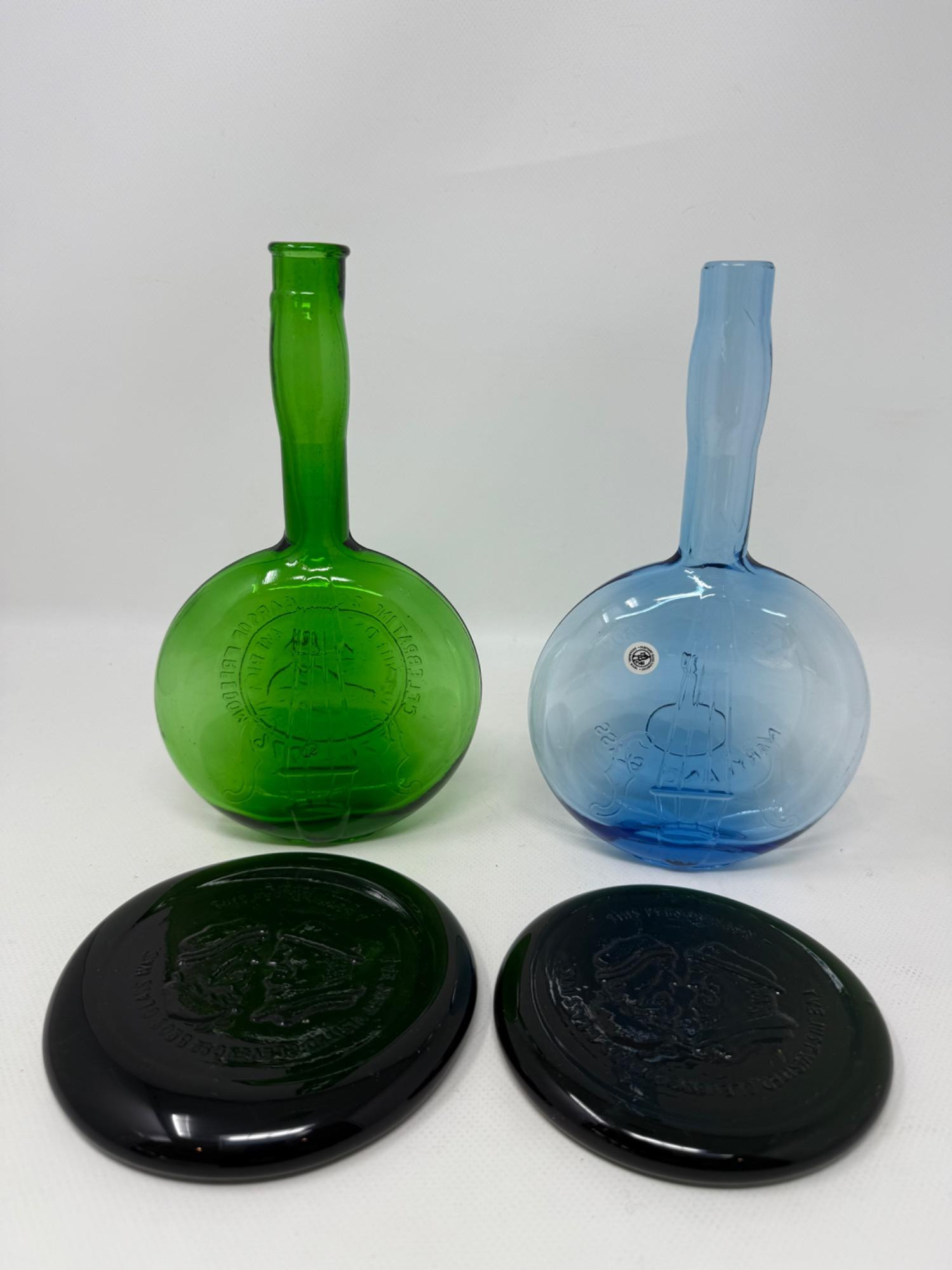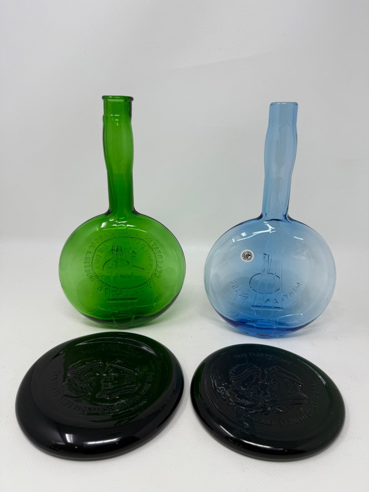 Vintage Cleavenger and Pairpoint glass banjo and violin bottles. Two glass discs with embossed faces. Souvenir discs. 5.5in wide Embossed bottle with USA Centennial