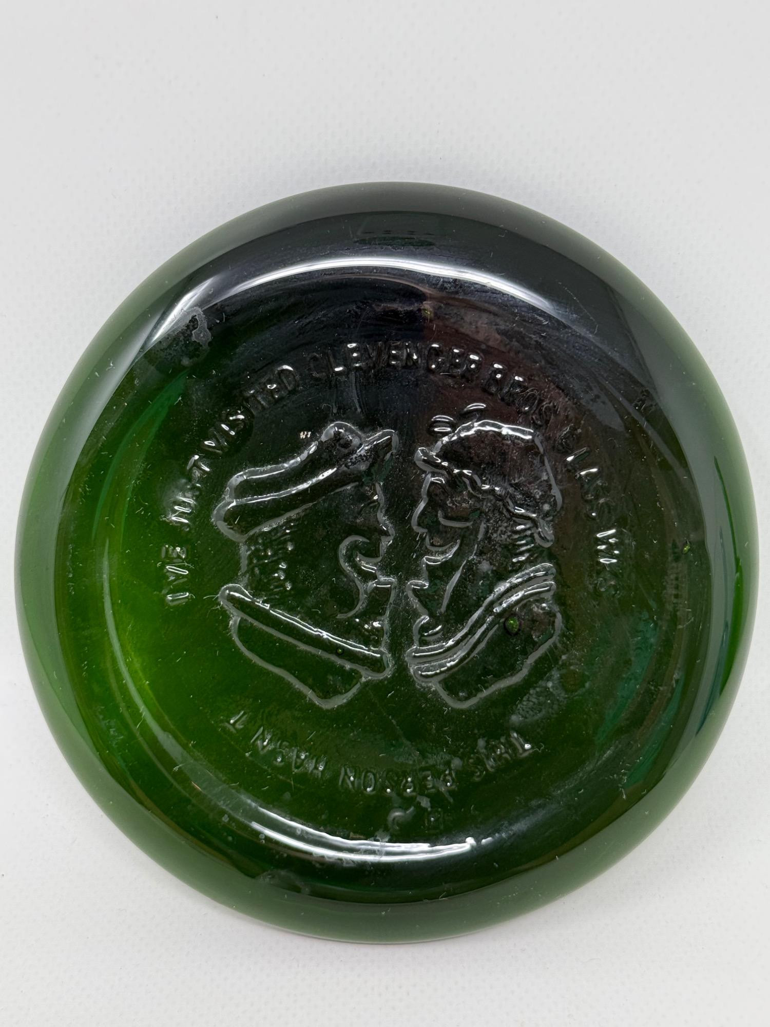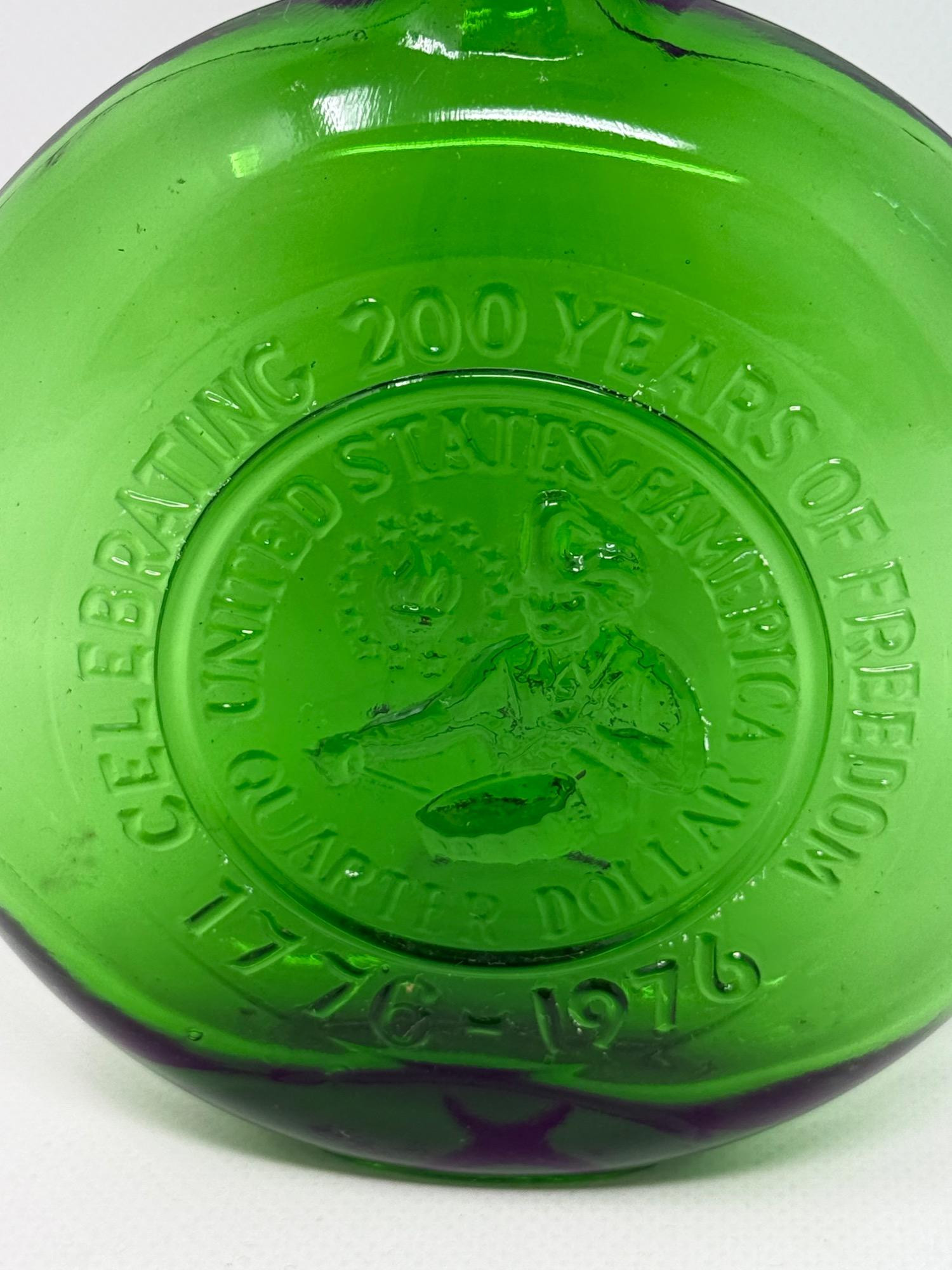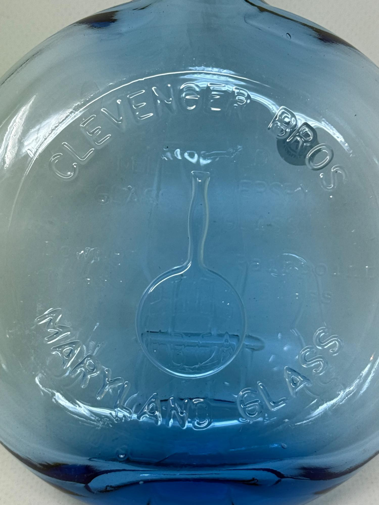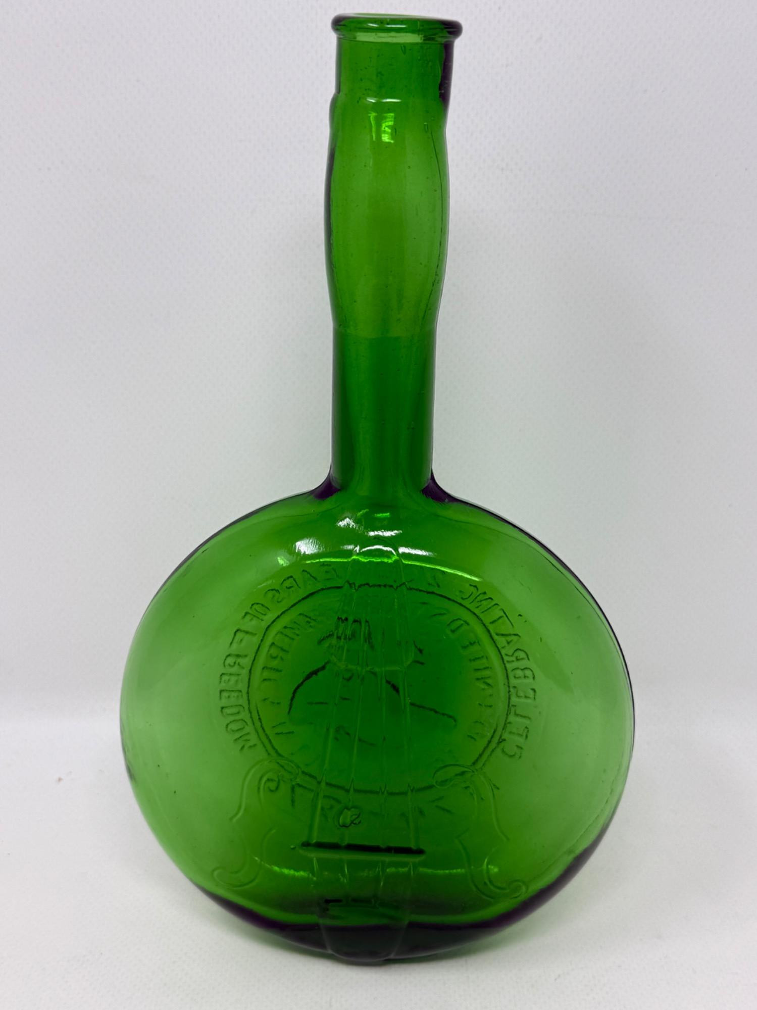 Vintage Cleavenger and Pairpoint glass banjo and violin bottles. Two glass discs with embossed faces. Souvenir discs. 5.5in wide Embossed bottle with USA Centennial
