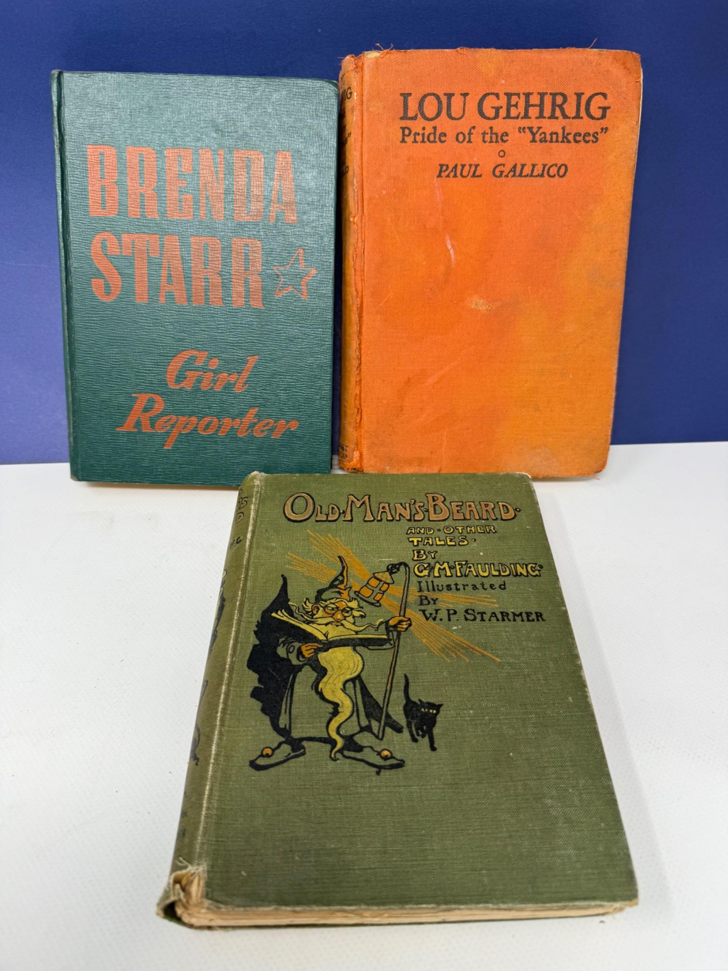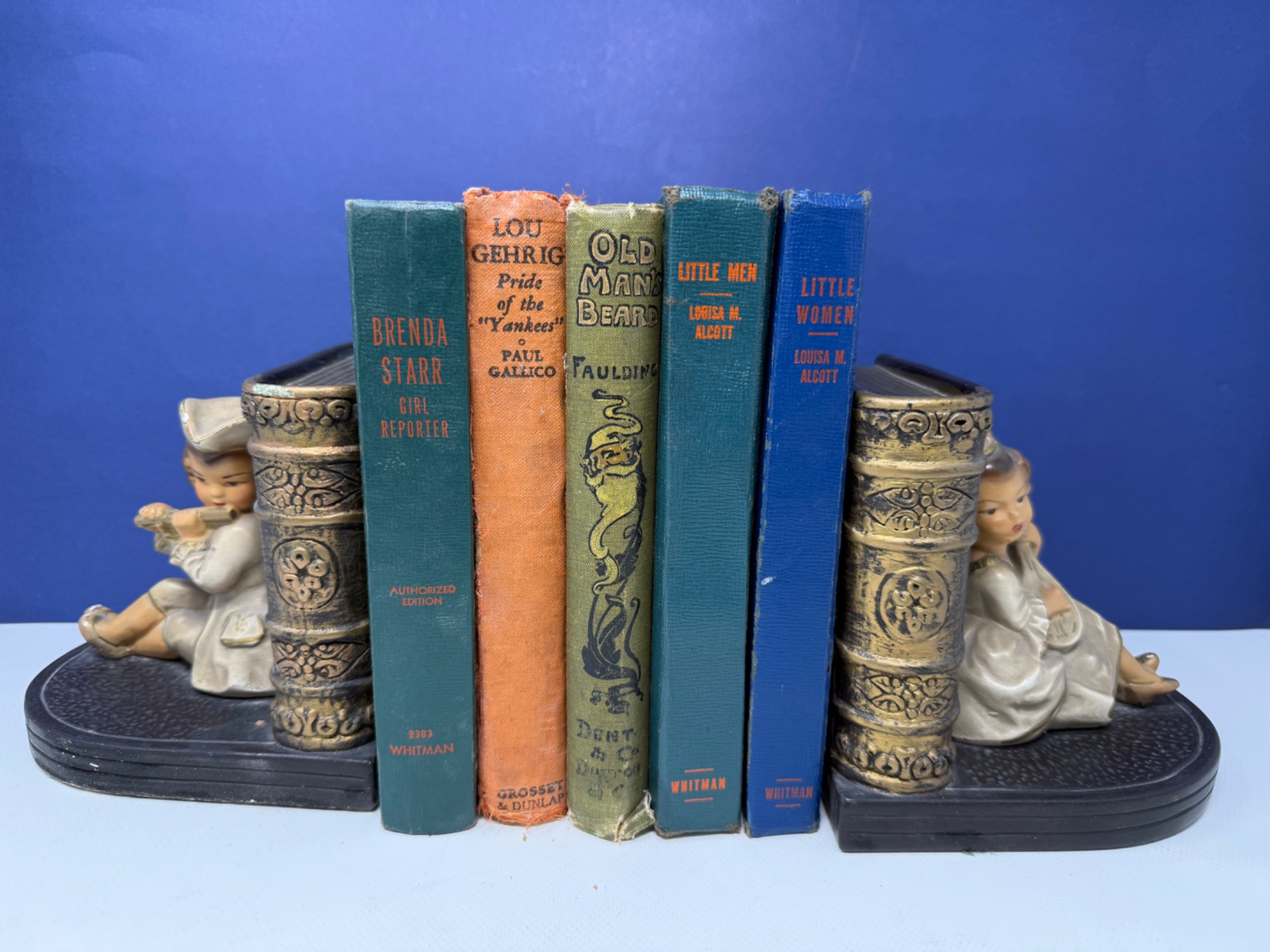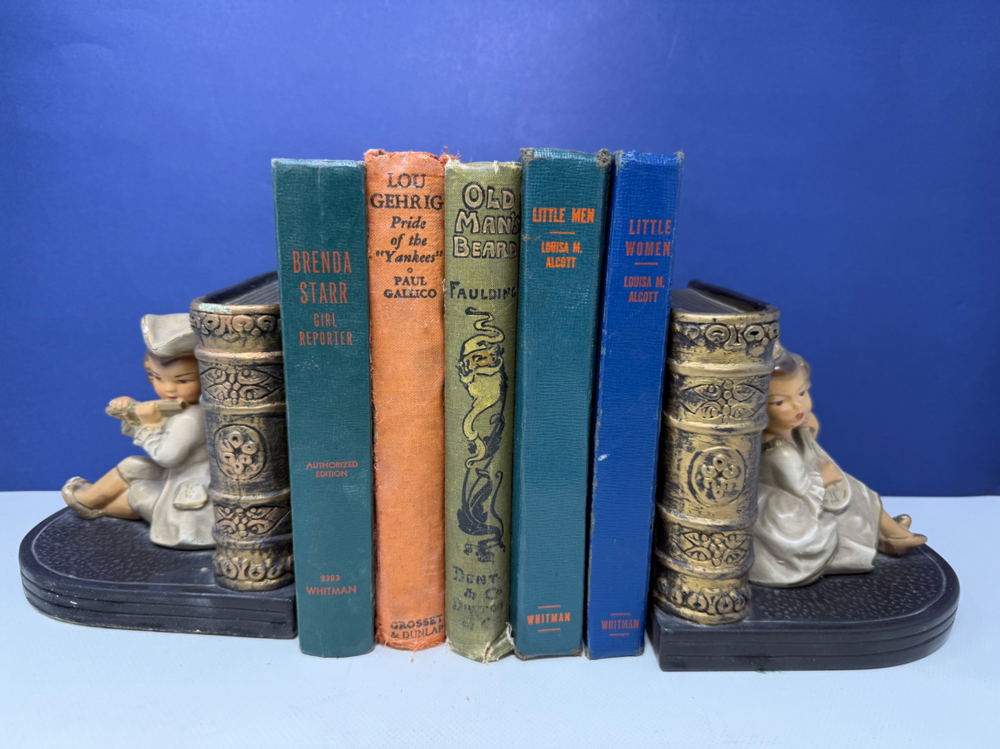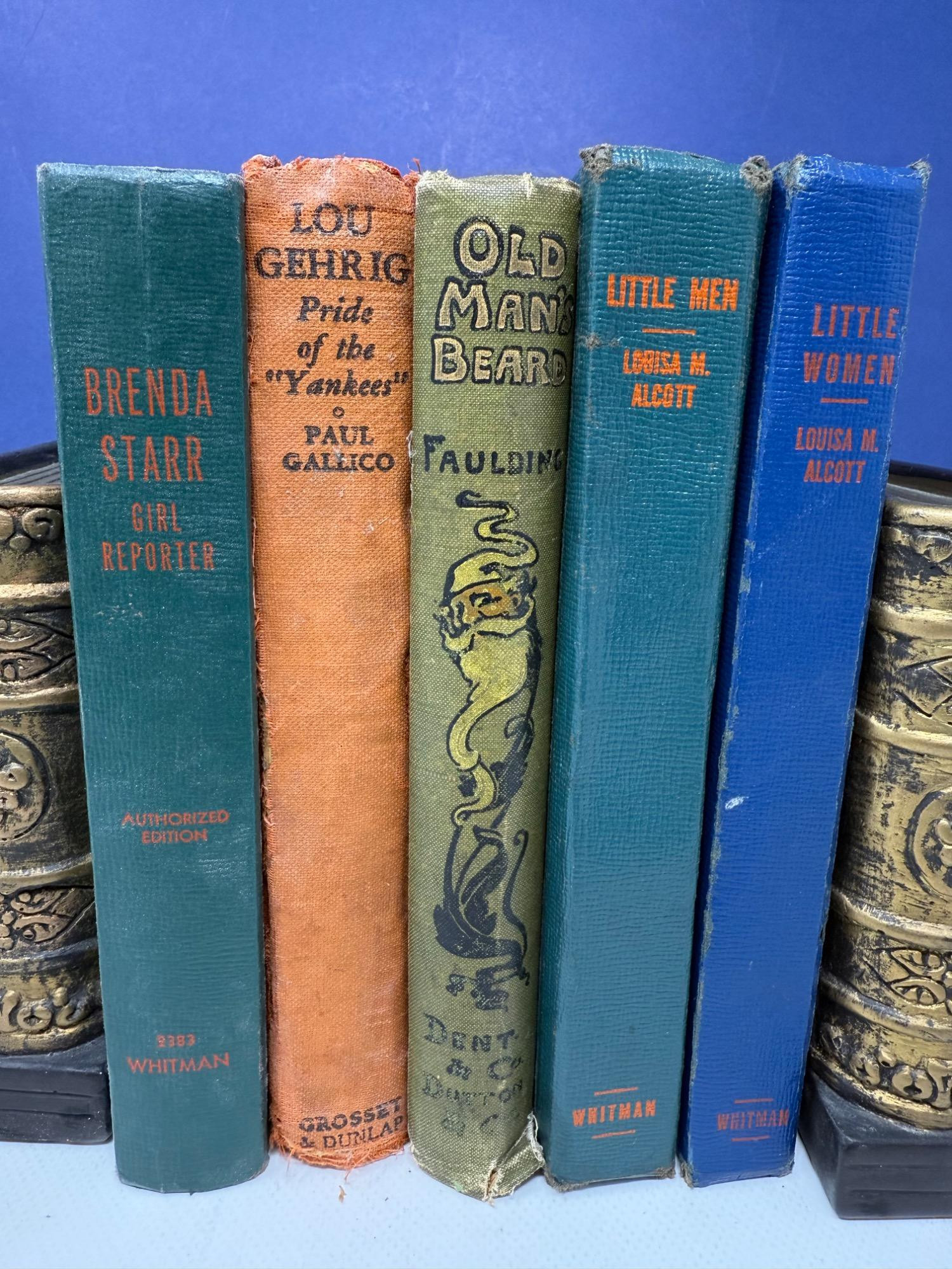Vintage Bookends and Vintage Books, Old Man Beard, Little Women, Pride of the Yankees, Brenda Star (Girl Reporter)