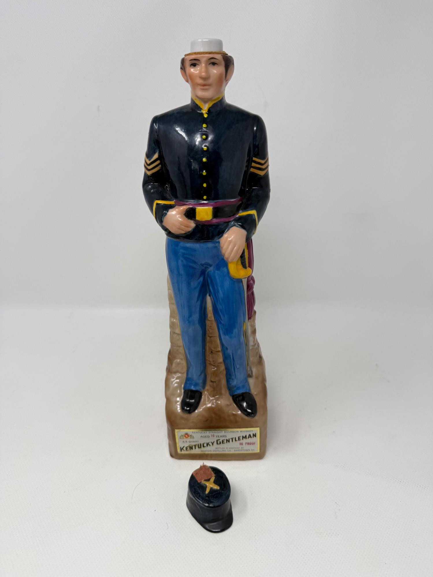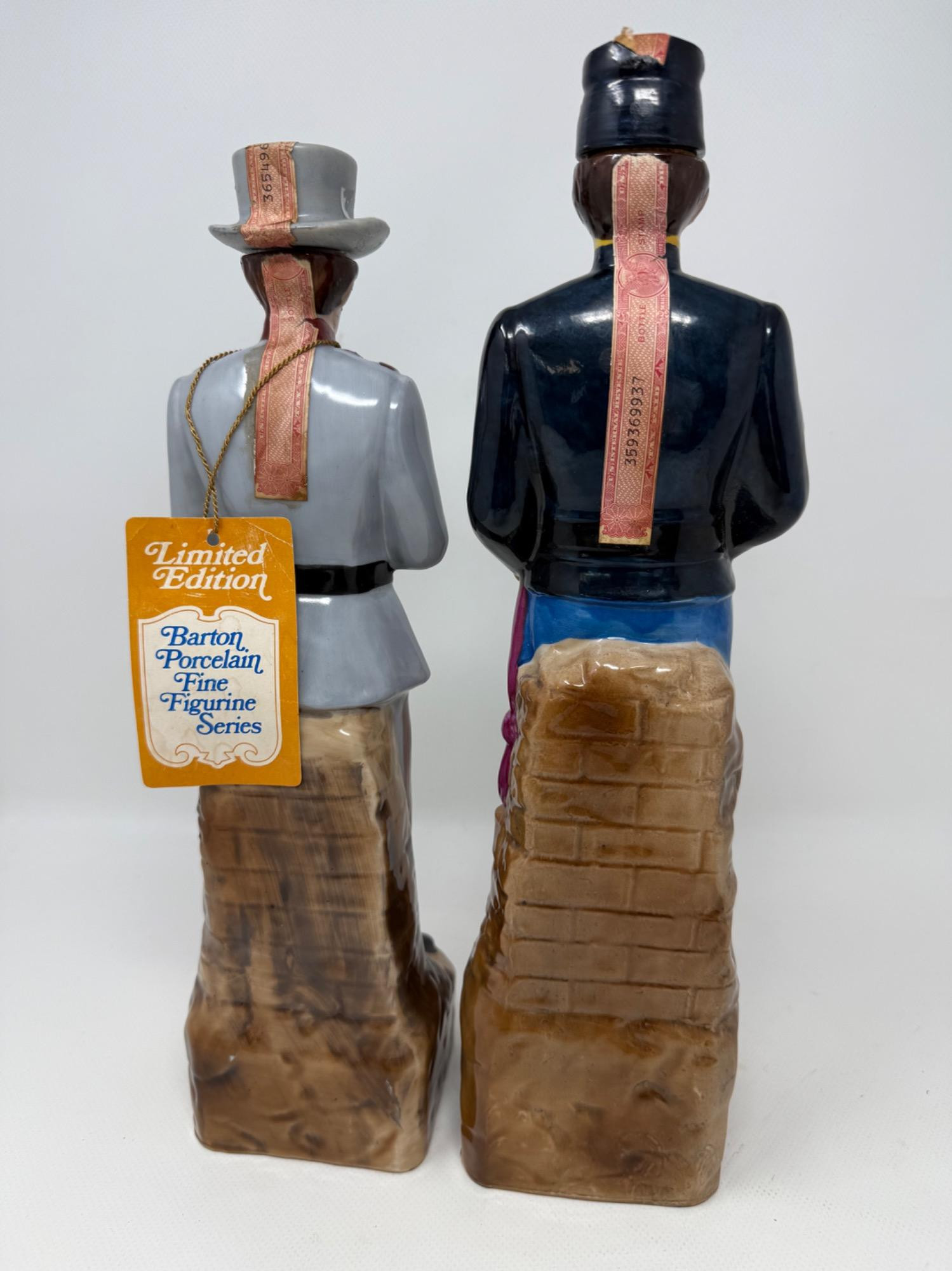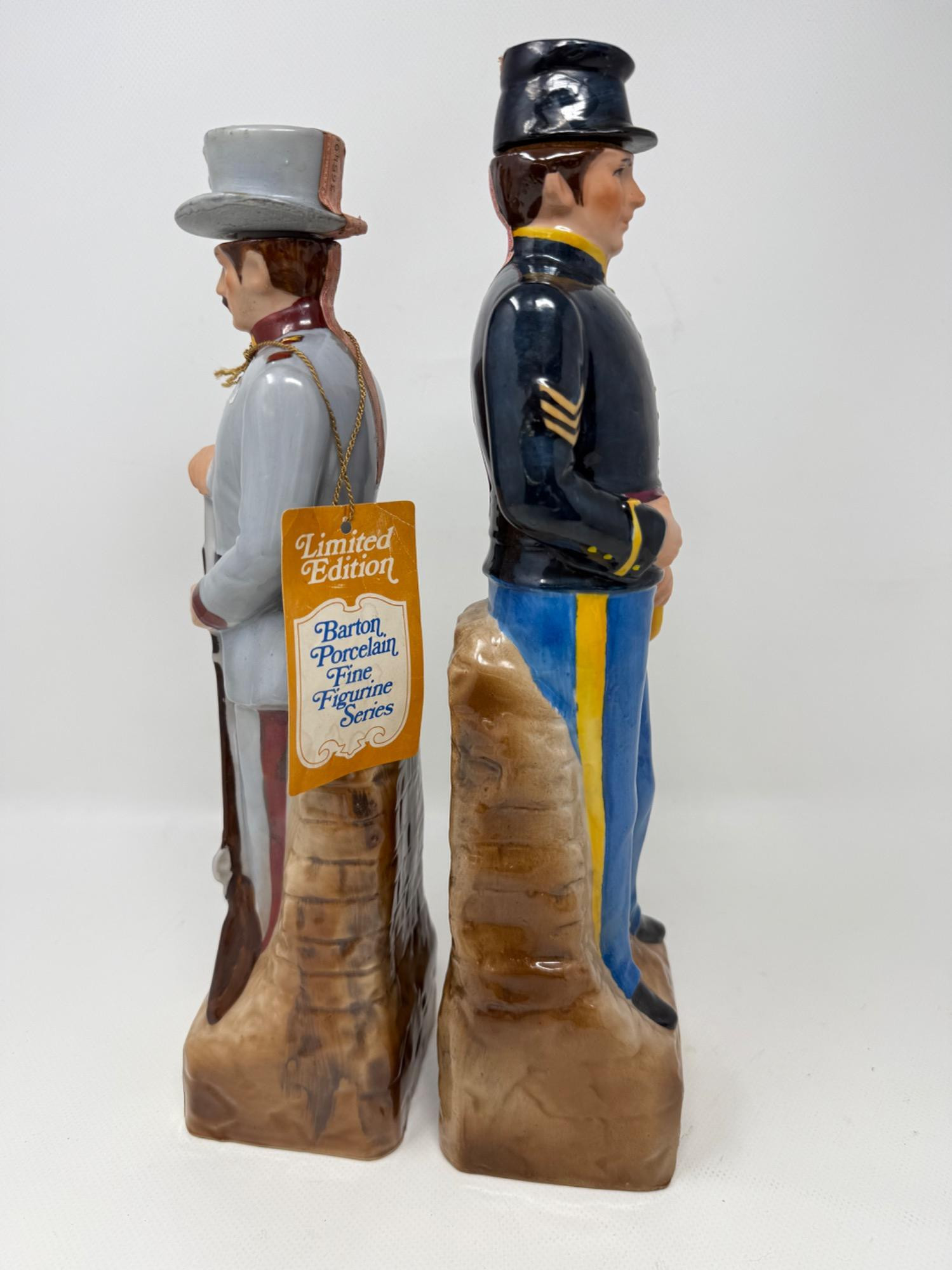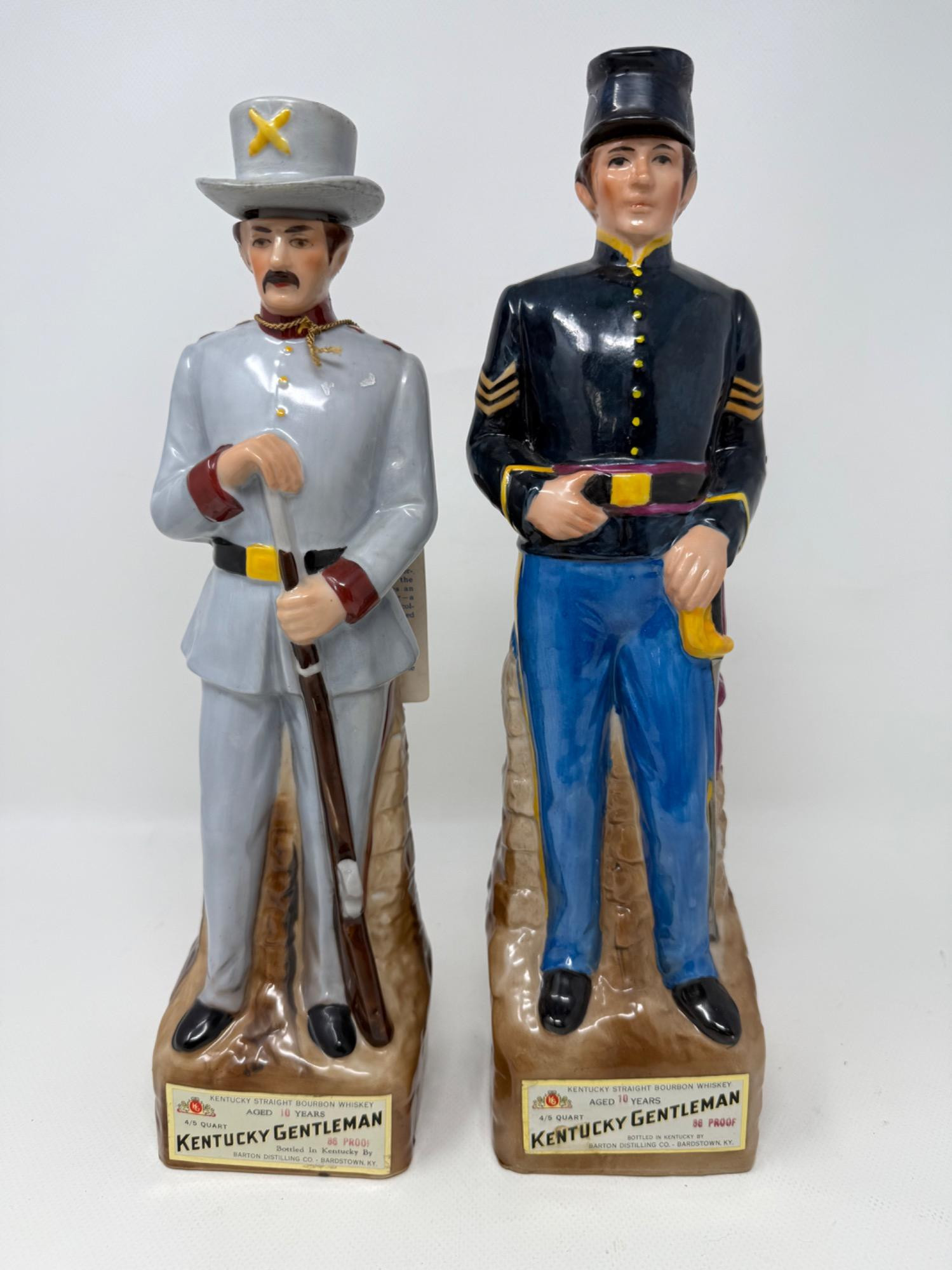 Jim Beam Decanters with Civil War Soldiers. Barton Ceramic bottles for Kentucky Gentleman Bourbon 13.5 and 14.25in tall